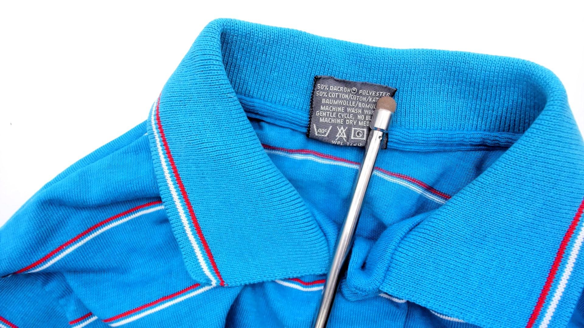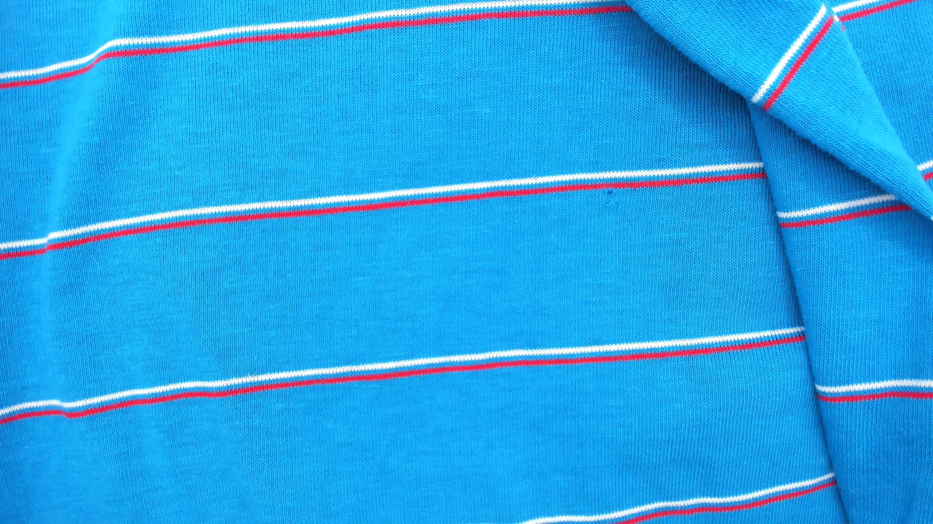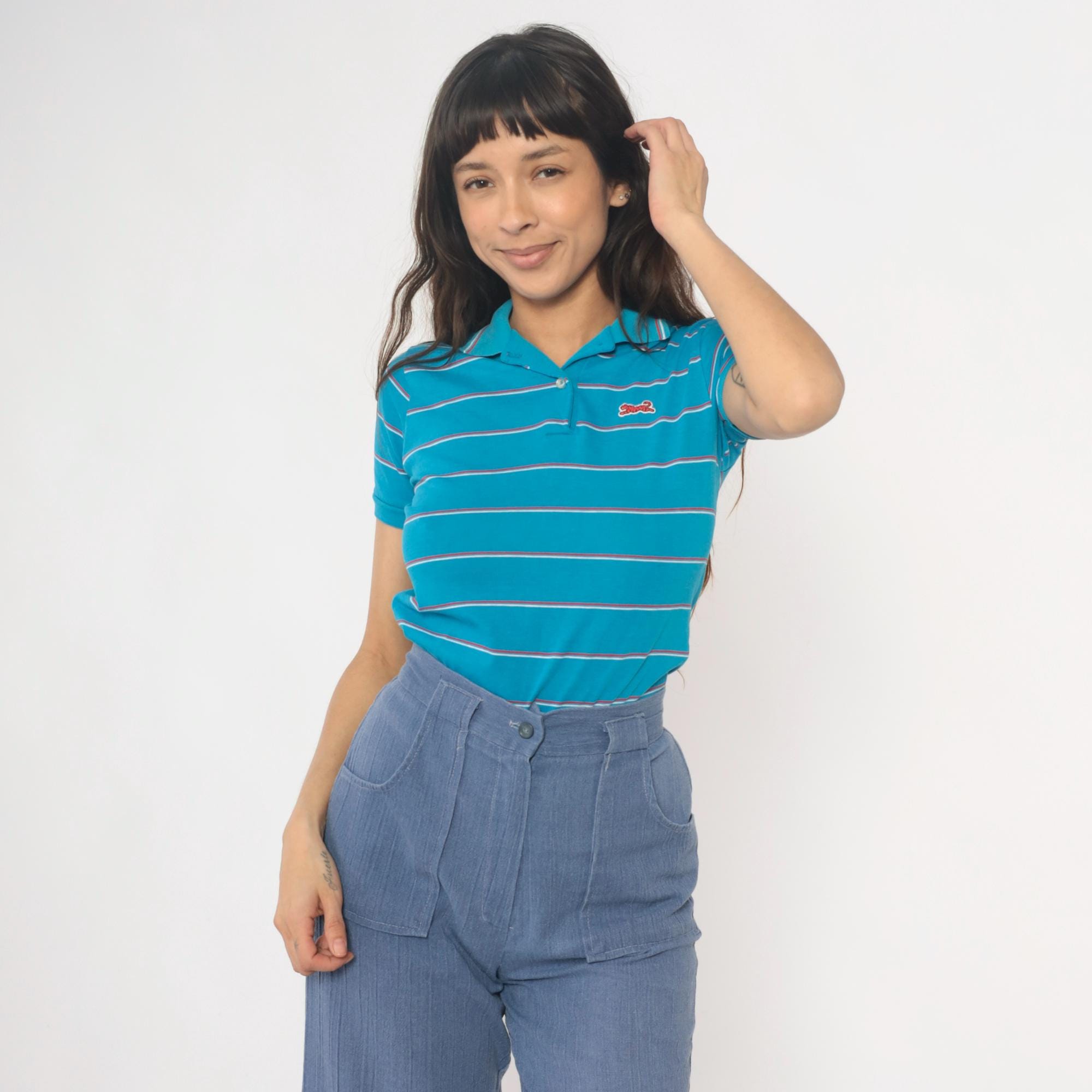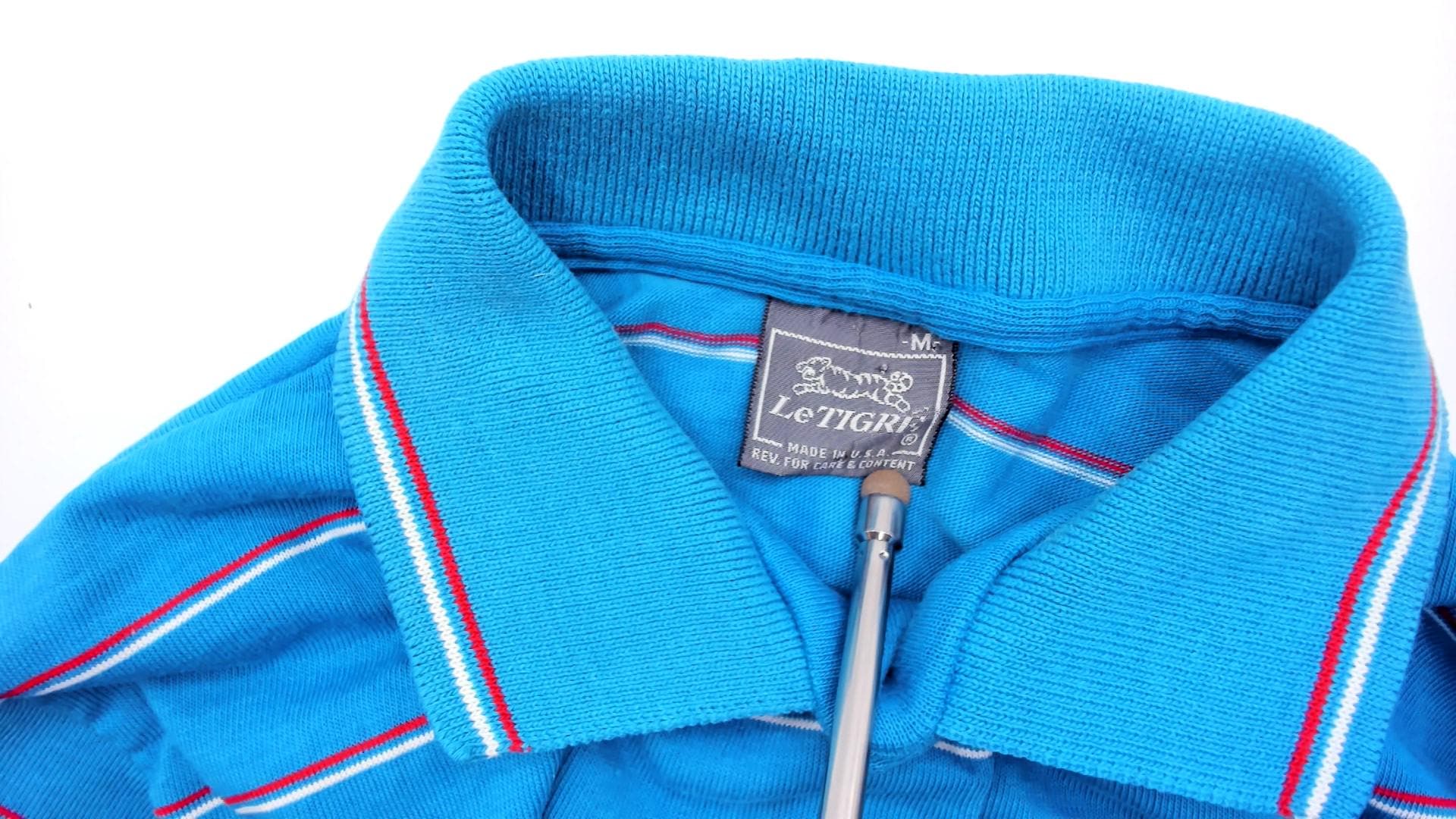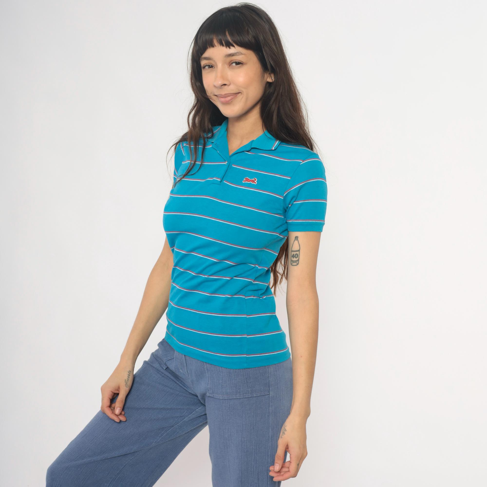 90s blue striped polo shirt from Le Tigre with red and white horizontal stripes across the fabric. Collared neckline with two-button placket, short sleeves with ribbed cuffs, small embroidered brand logo on left chest.