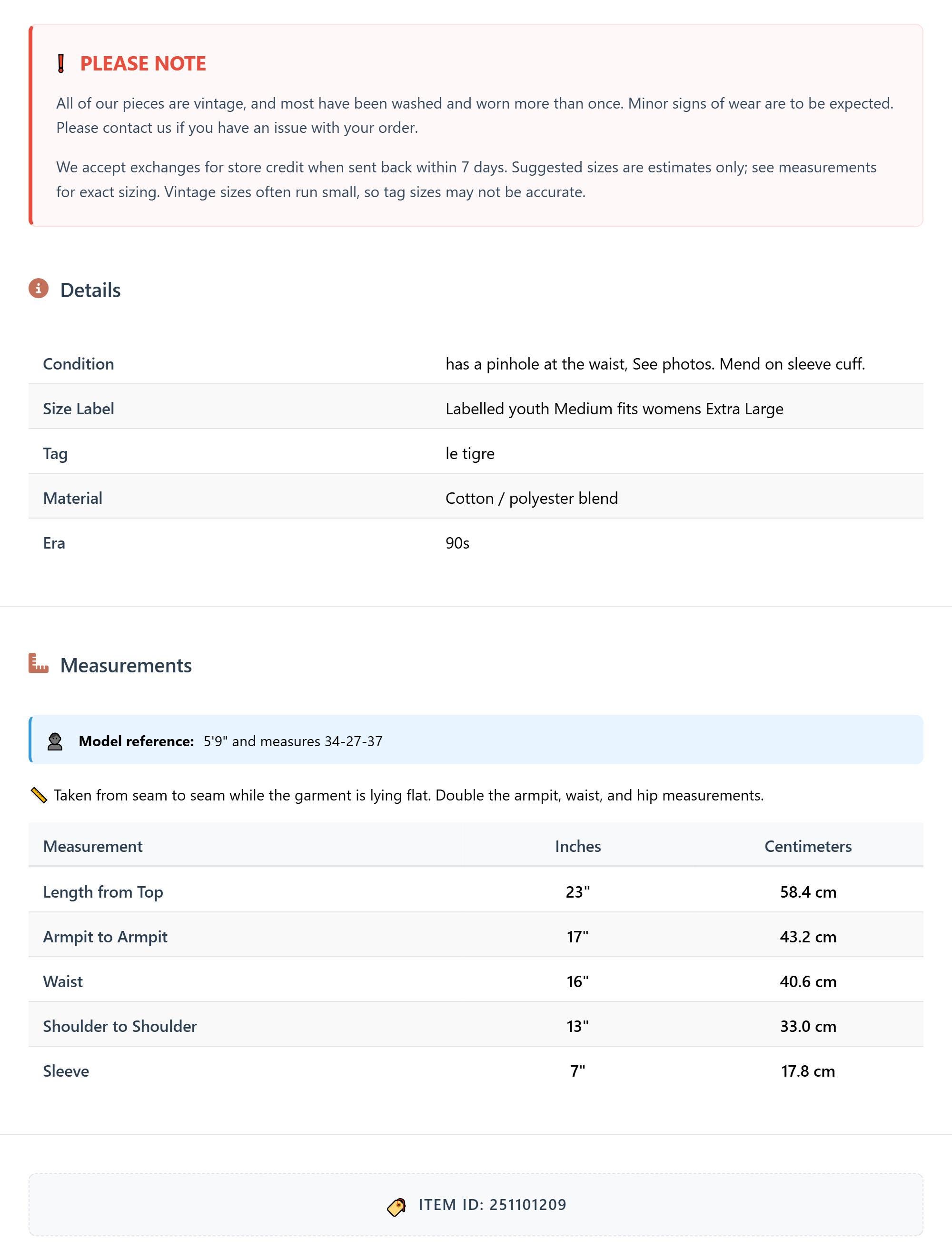All of our pieces are vintage, and most have been washed and worn more than once. Minor signs of wear are to be expected. Please contact us if you have an issue with your order. We accept exchanges for store credit when sent back within 7 days.