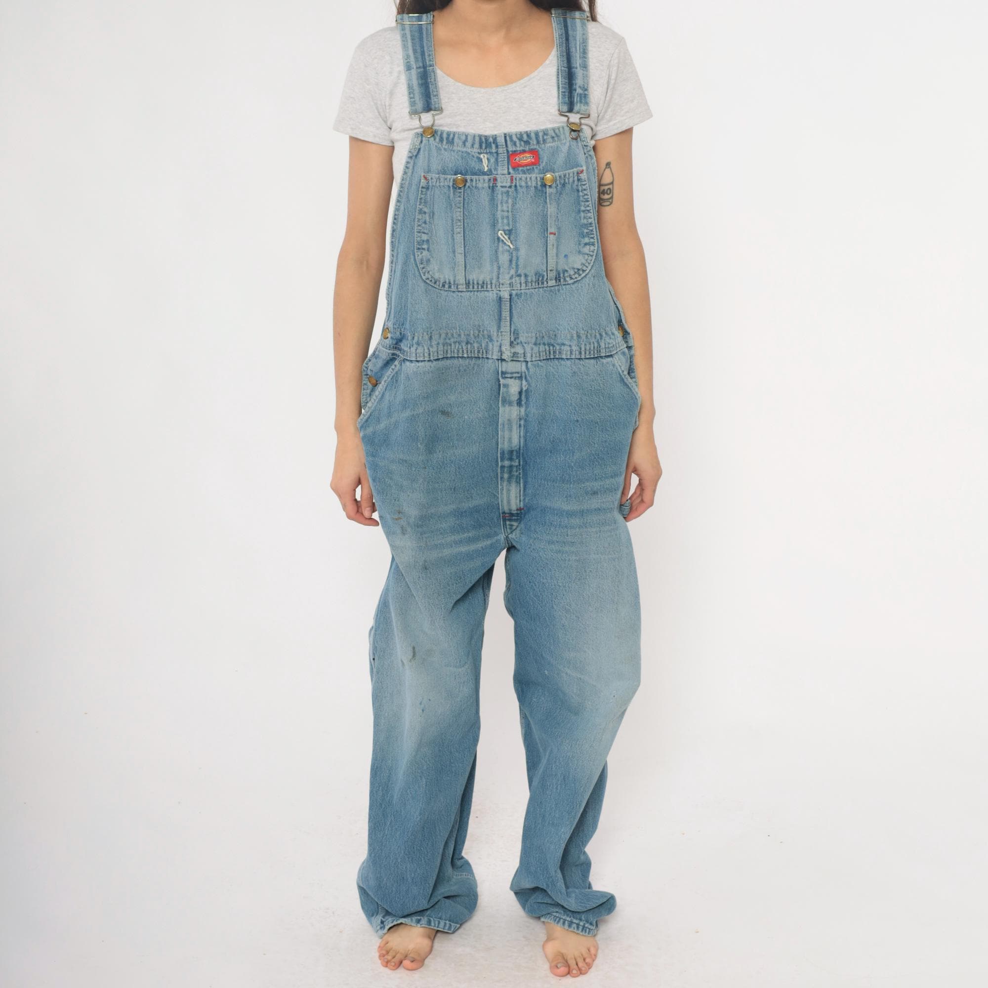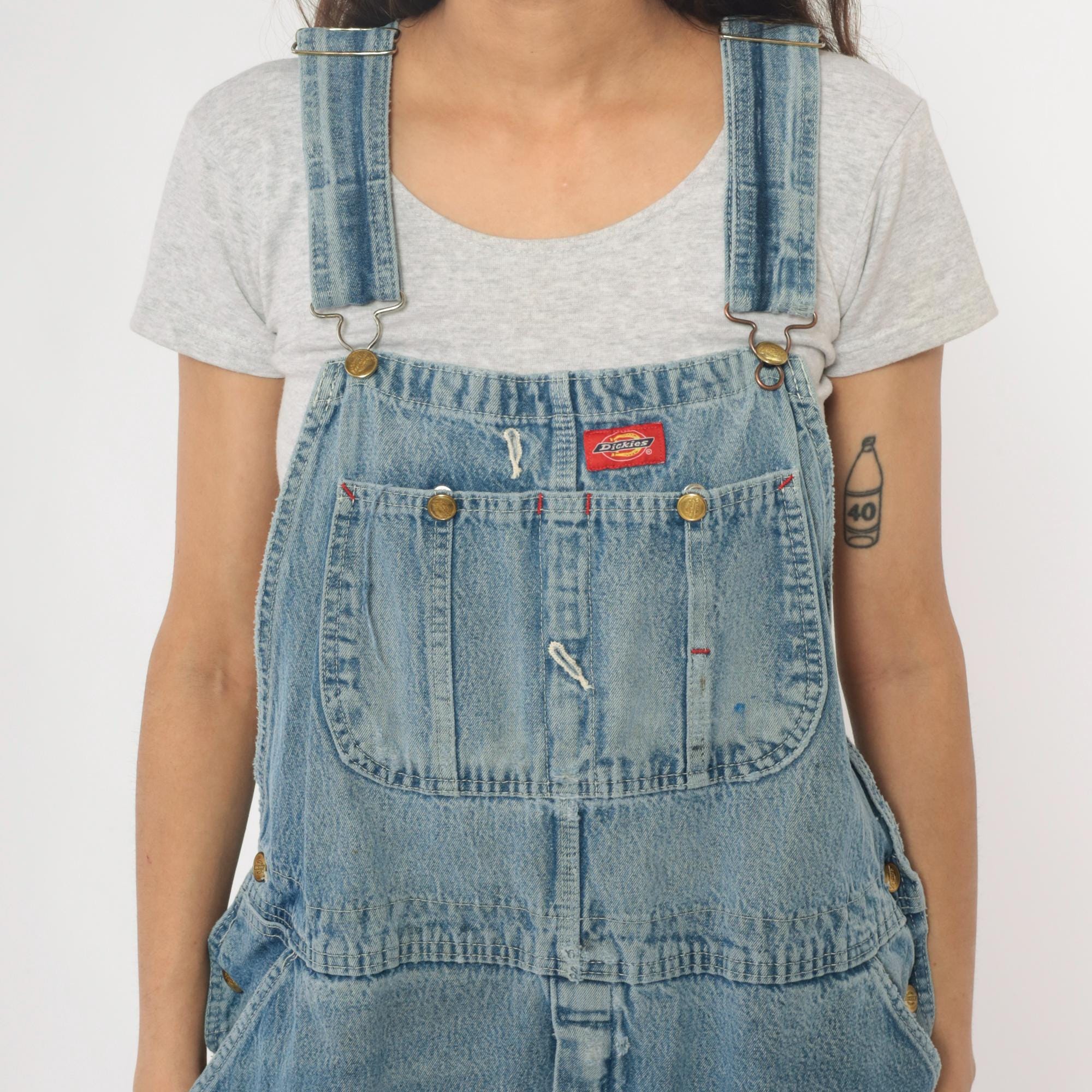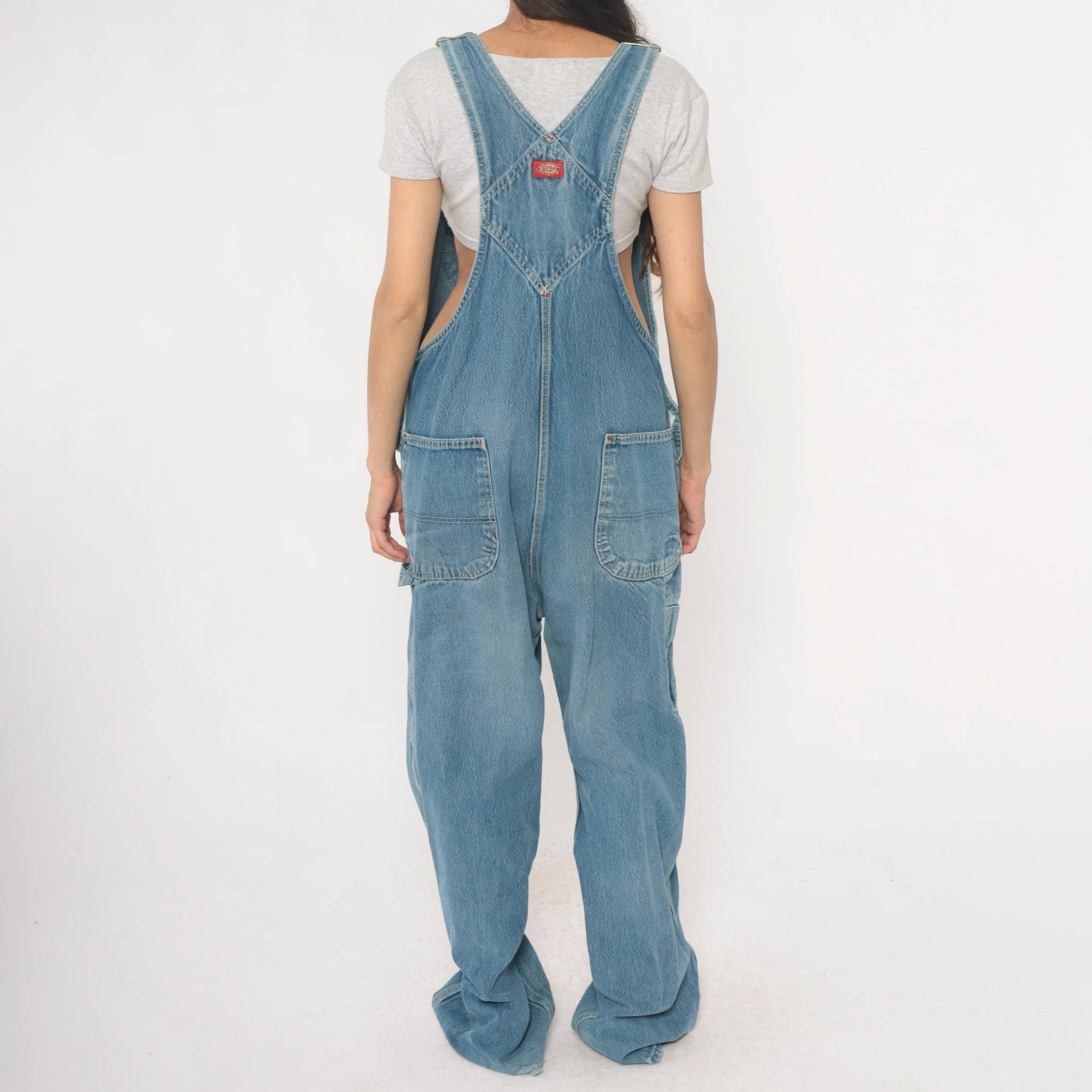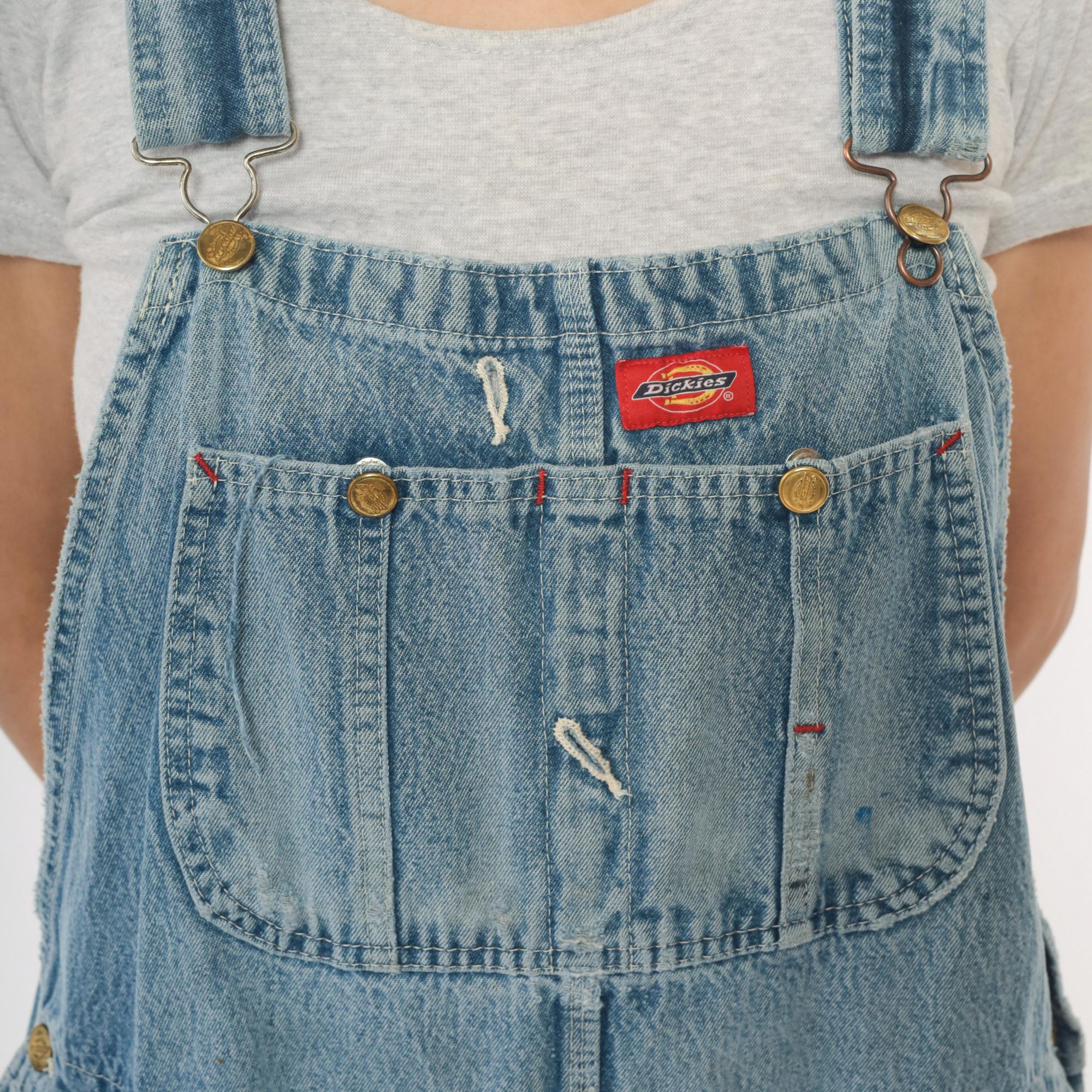 Y2K light blue denim overalls from Dickies with adjustable metal clip straps and front bib pocket with red Dickies logo patch. Distressed wash with fading throughout, brass-tone button closures on bib, side pockets, straight leg.