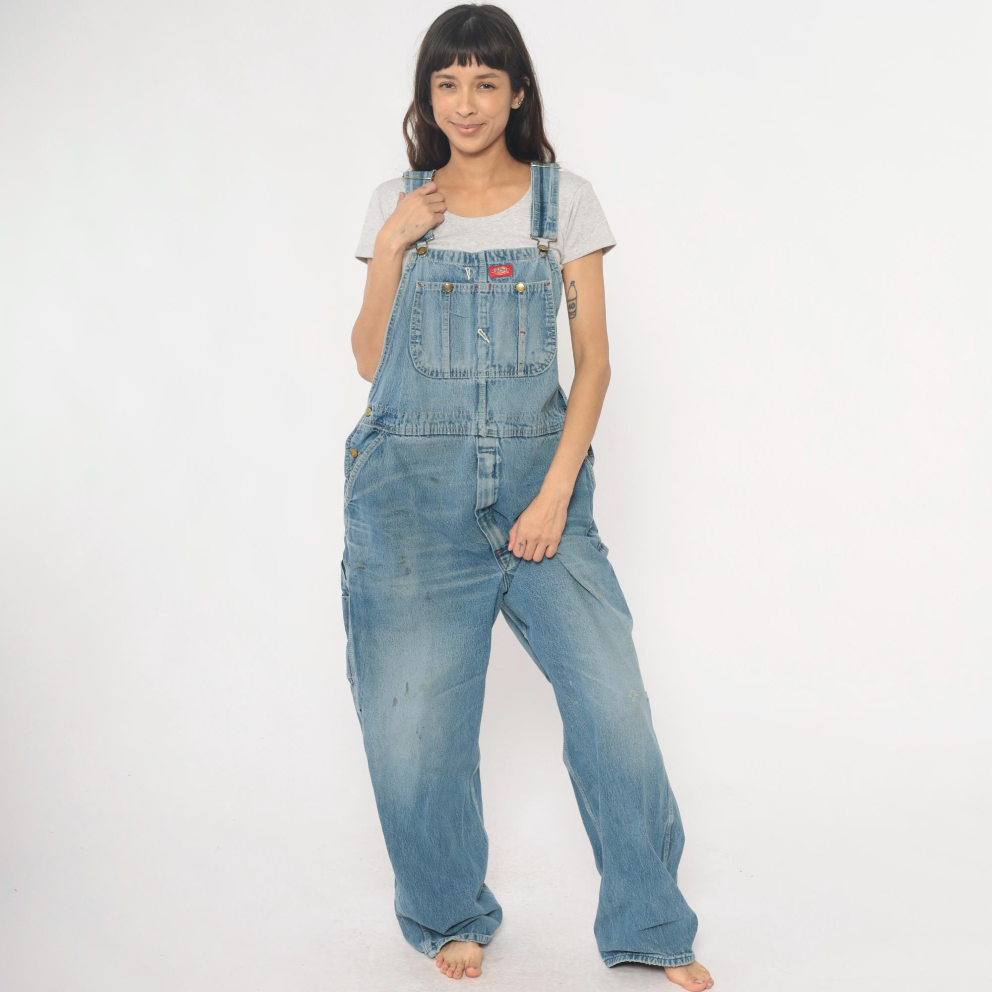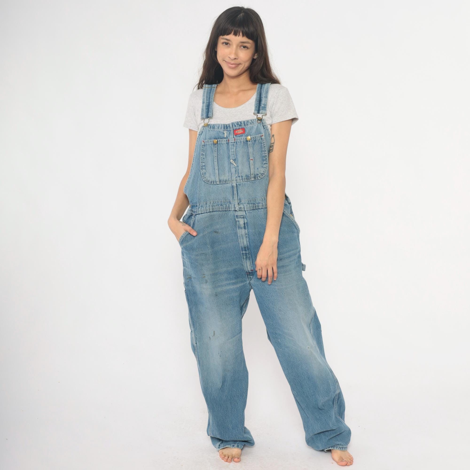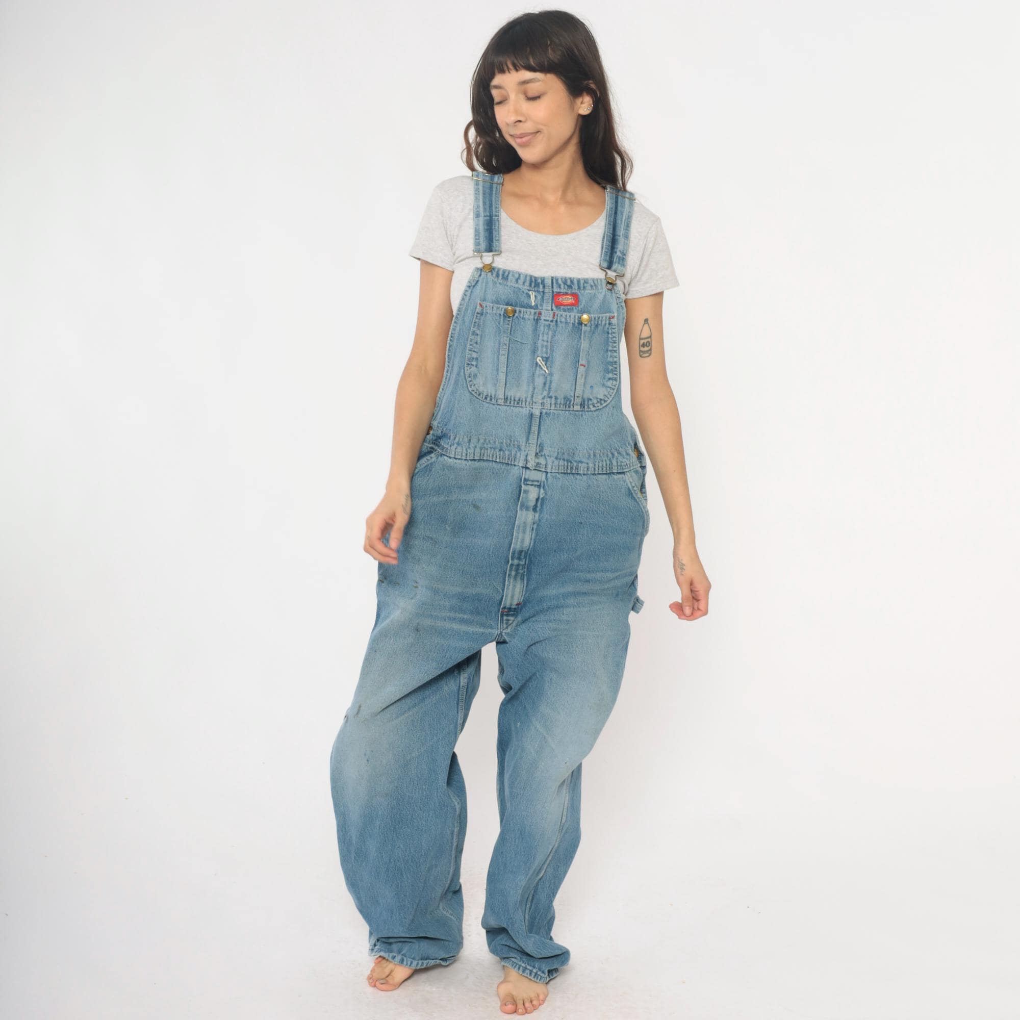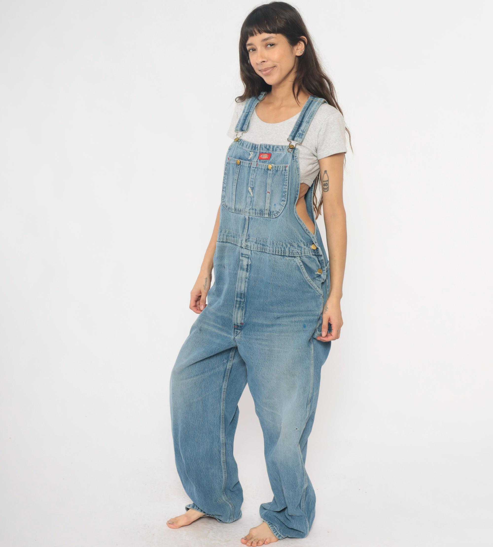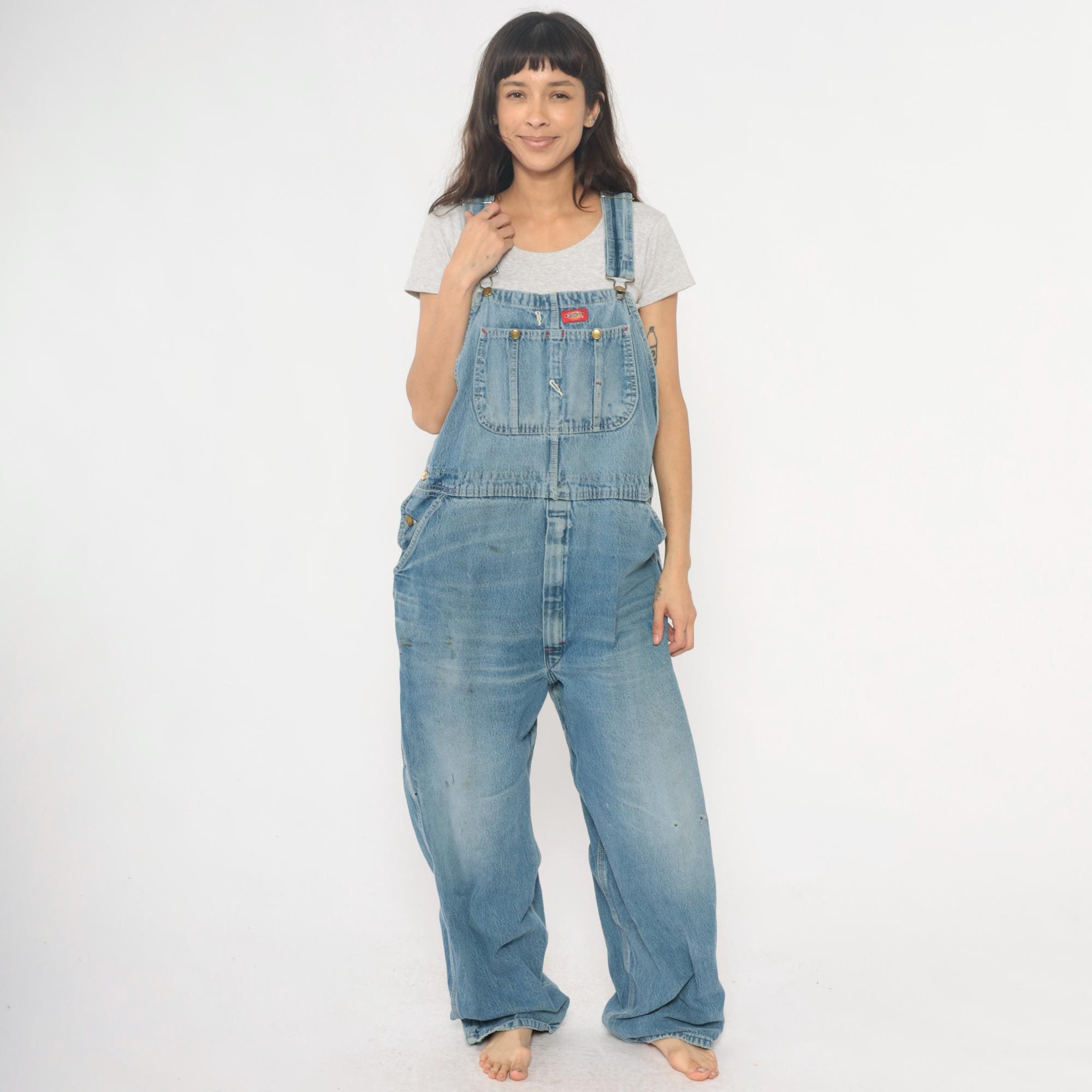 Y2K light blue denim overalls from Dickies with adjustable metal clip straps and front bib pocket with red Dickies logo patch. Distressed wash with fading throughout, brass-tone button closures on bib, side pockets, straight leg.