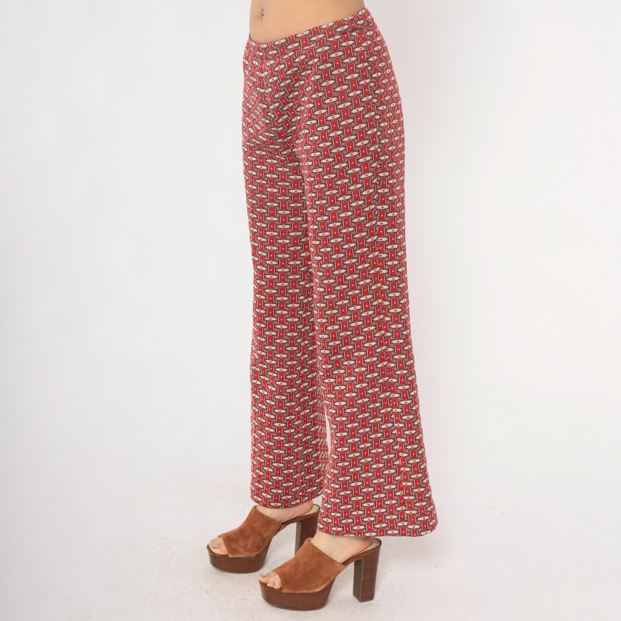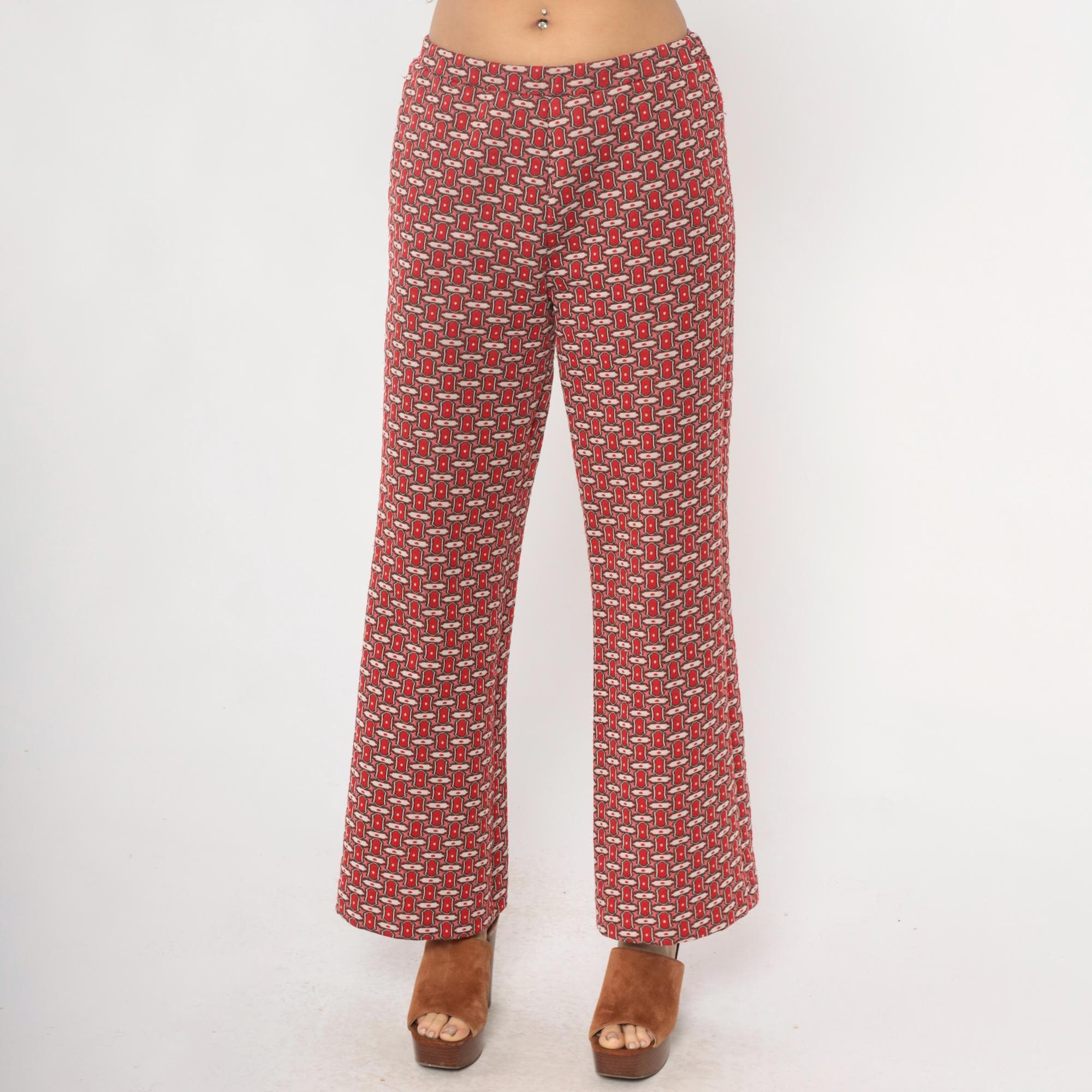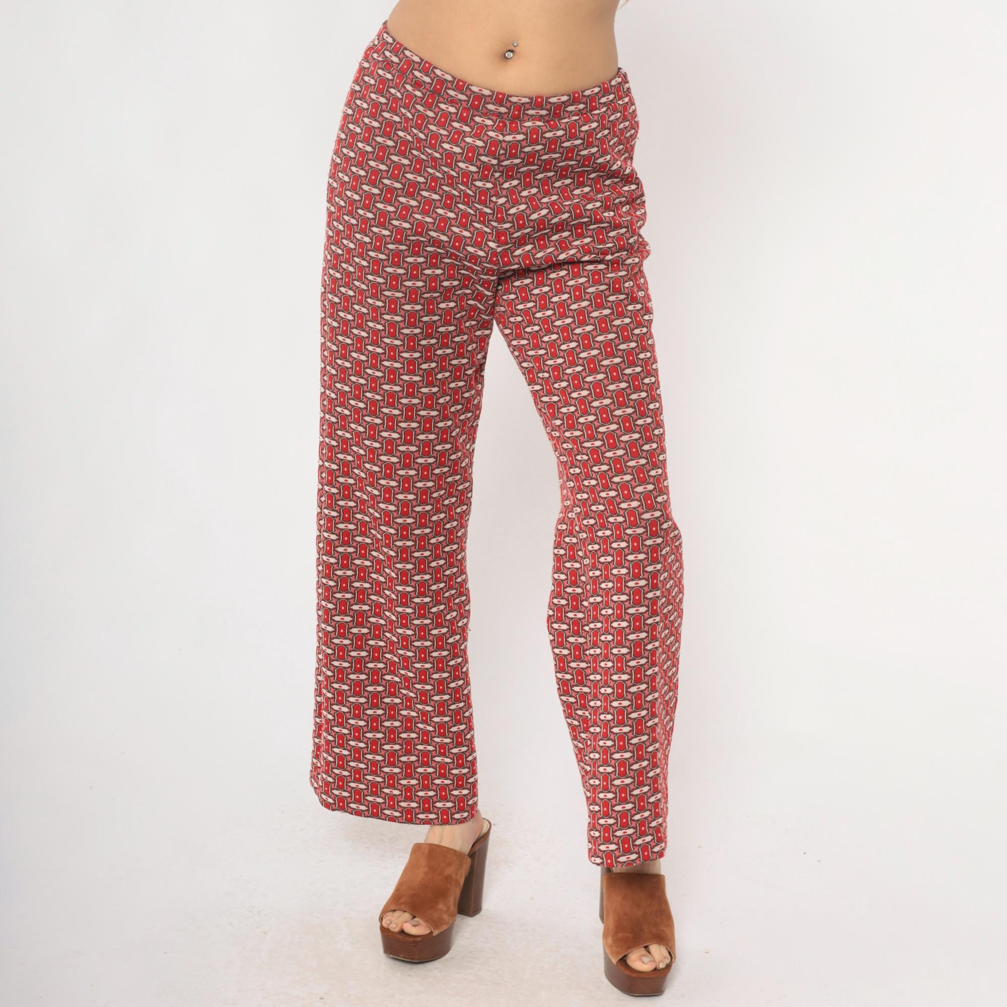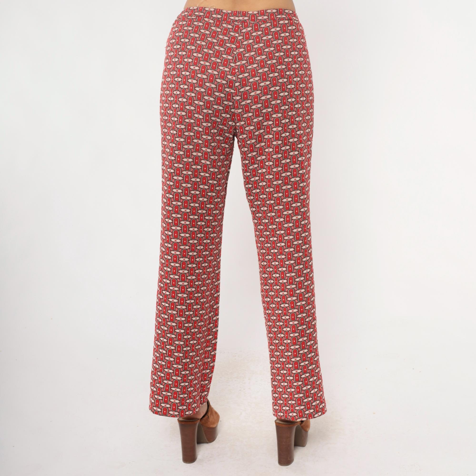 70s burgundy straight leg pants from Red Lion with all-over geometric chain-link pattern in cream, black, and red. High waisted with straight leg cut through the hem.