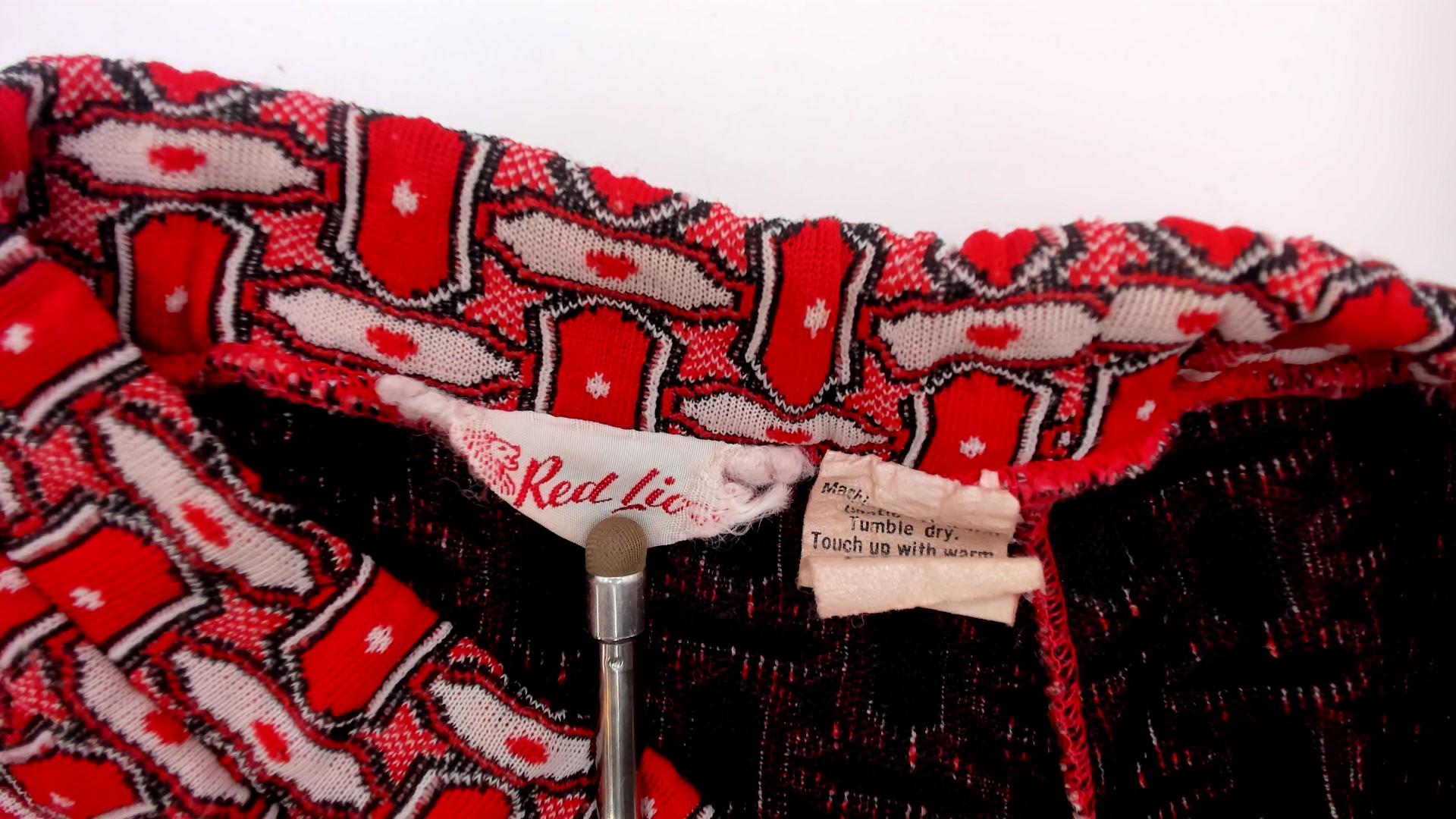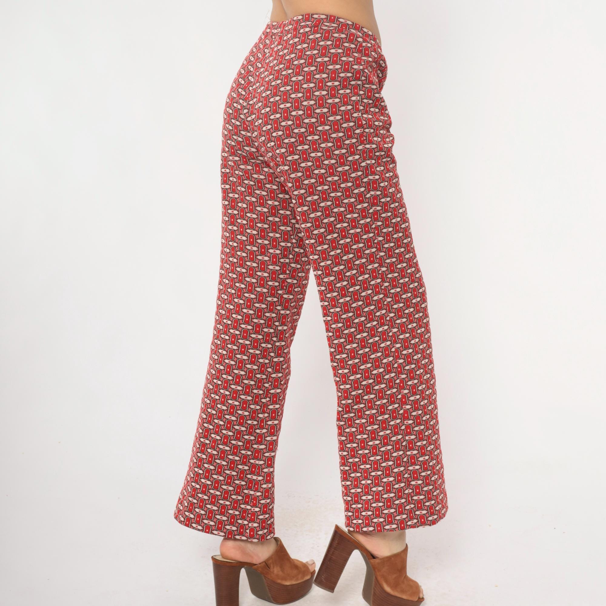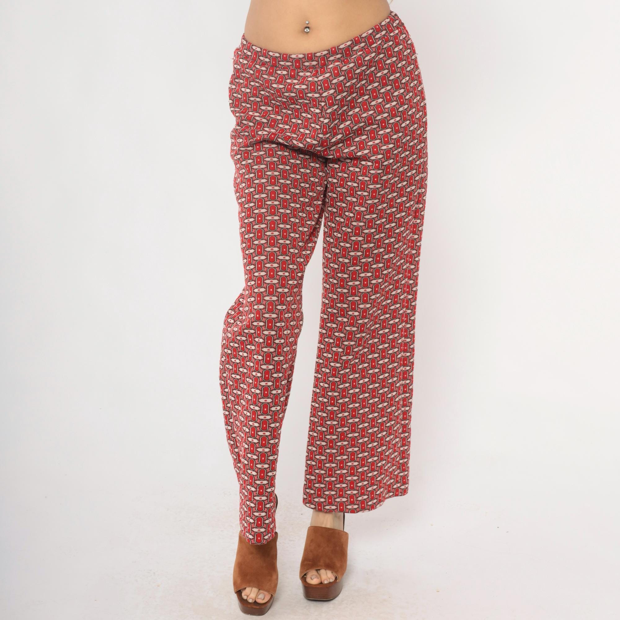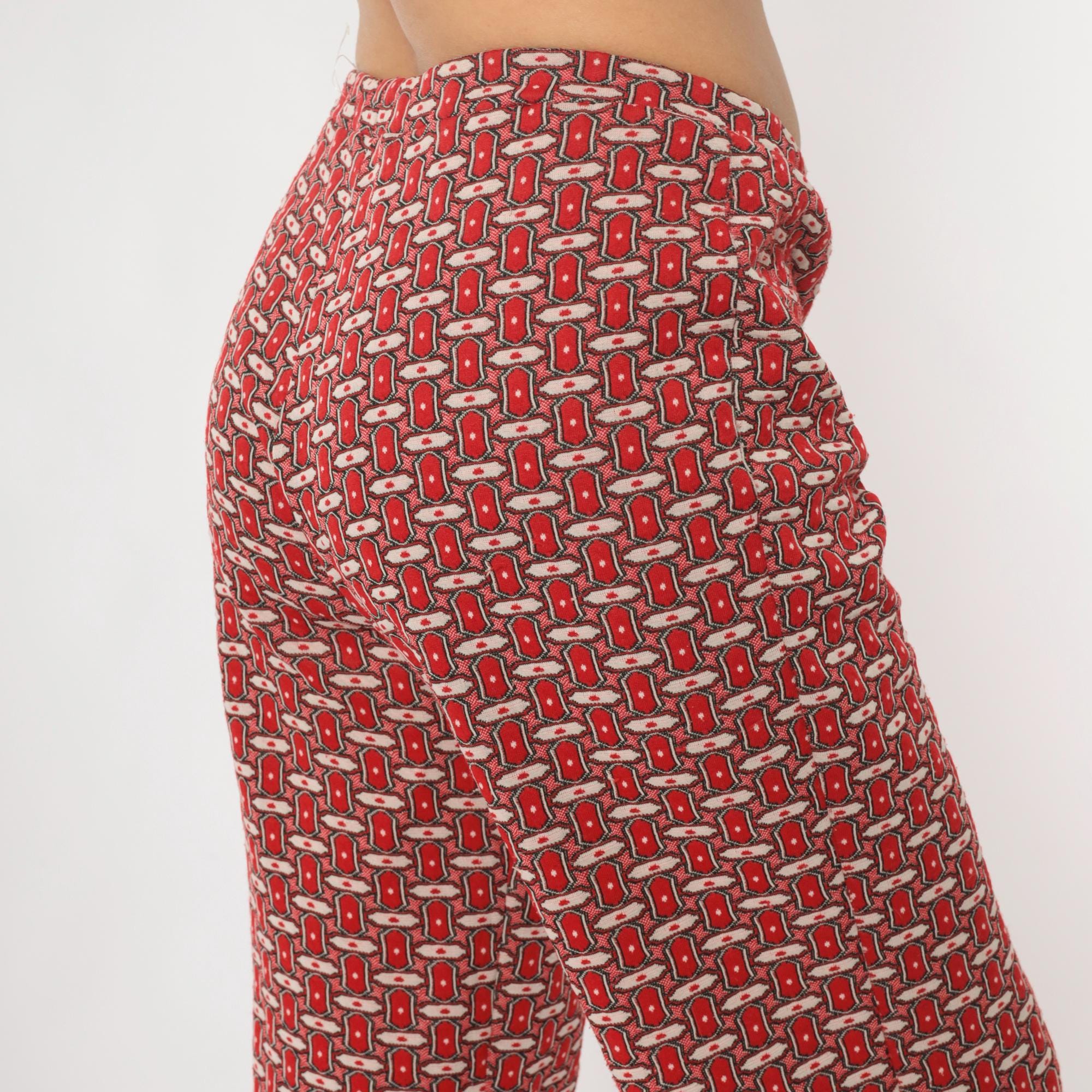 70s burgundy straight leg pants from Red Lion with all-over geometric chain-link pattern in cream, black, and red. High waisted with straight leg cut through the hem.
