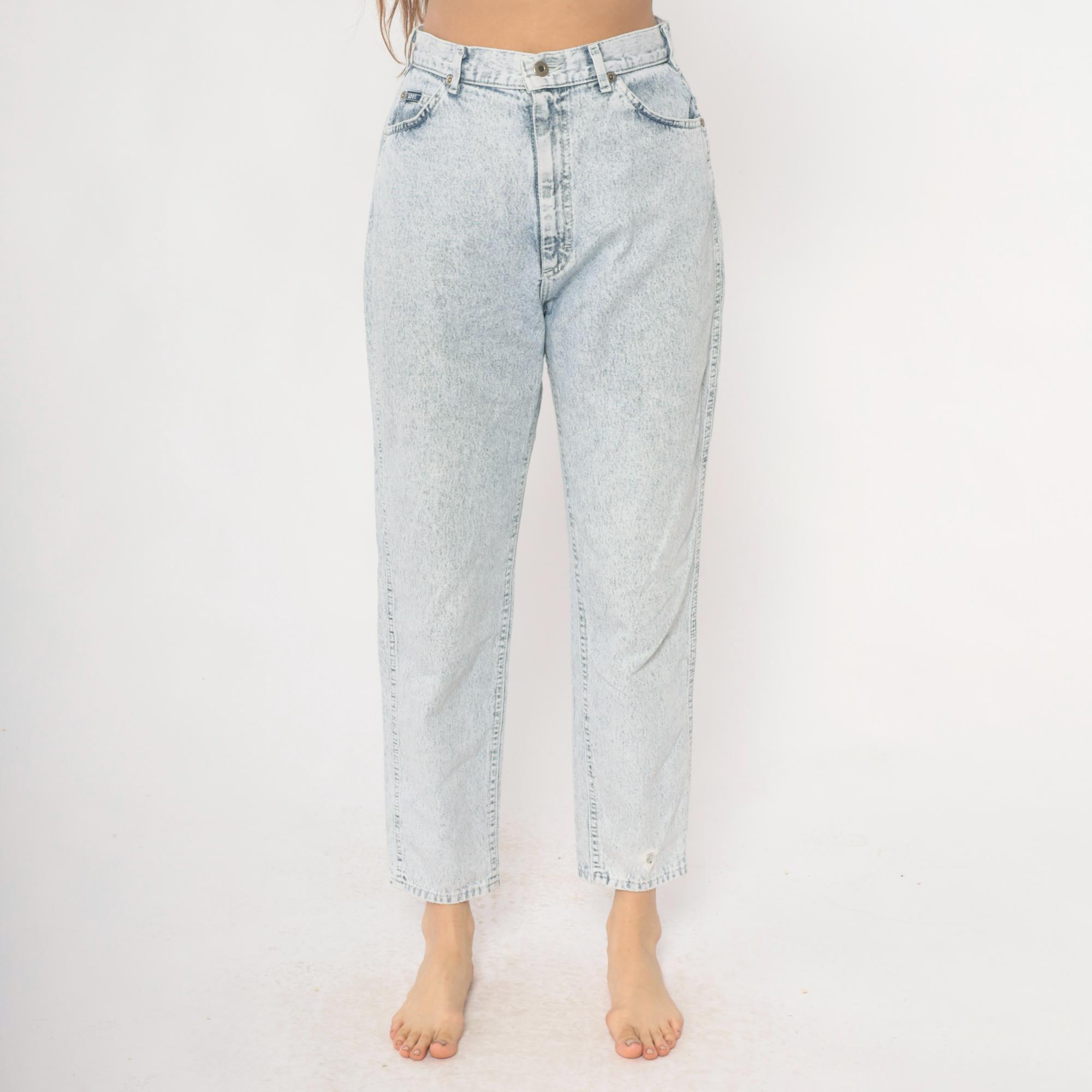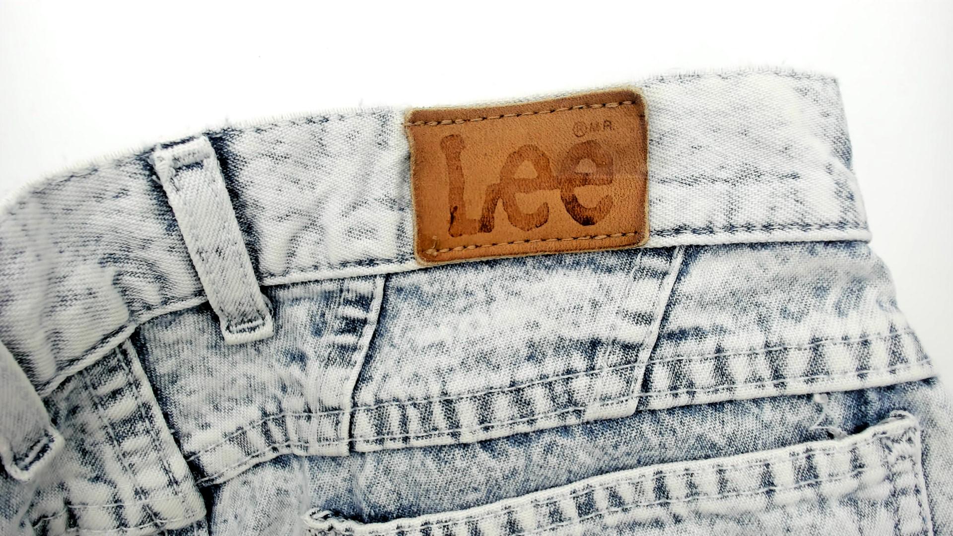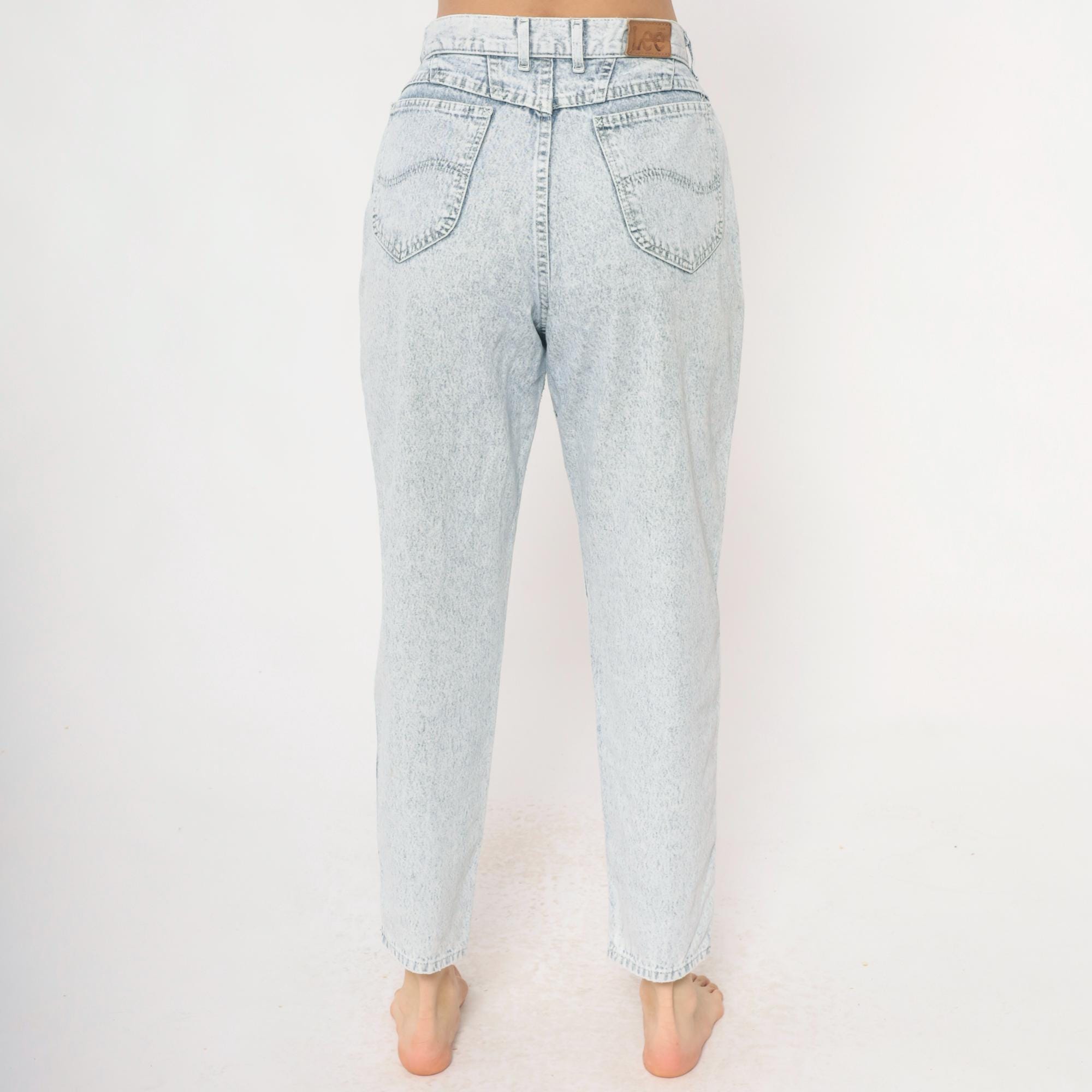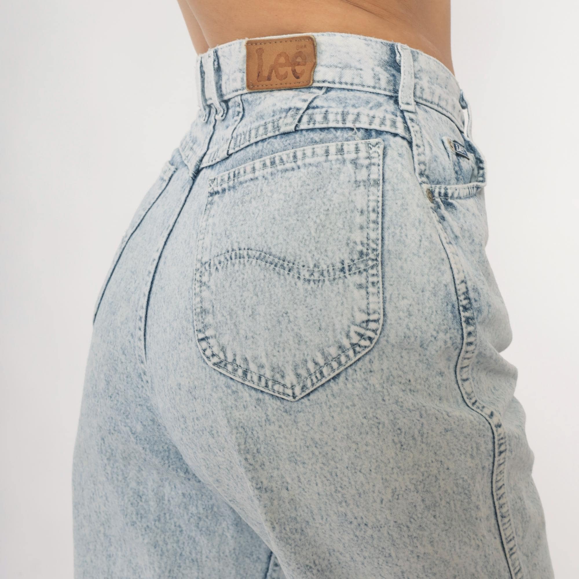 90s high-waisted straight leg jeans from Lee in light acid wash blue denim. Button fly closure, classic five-pocket construction with signature Lee back pocket stitching. Tapered straight leg with ankle-length inseam.