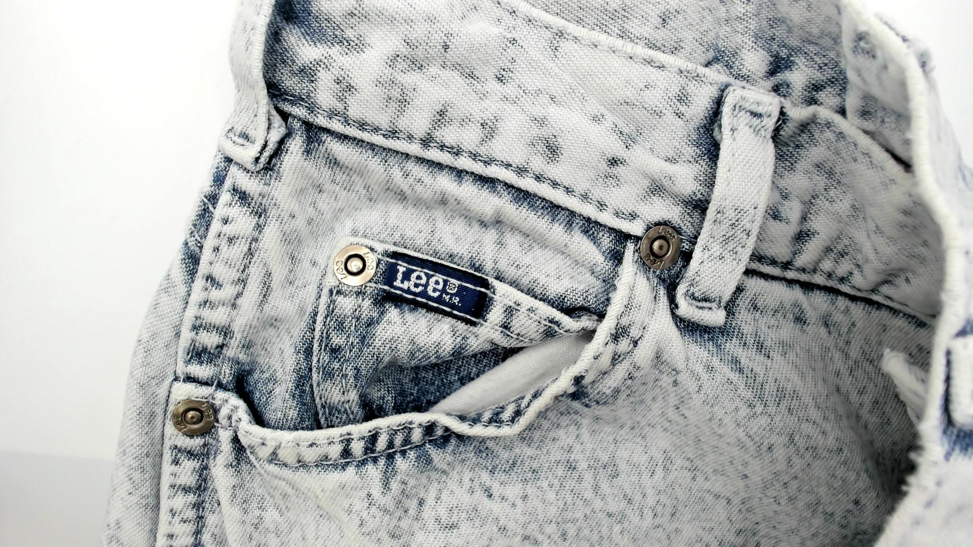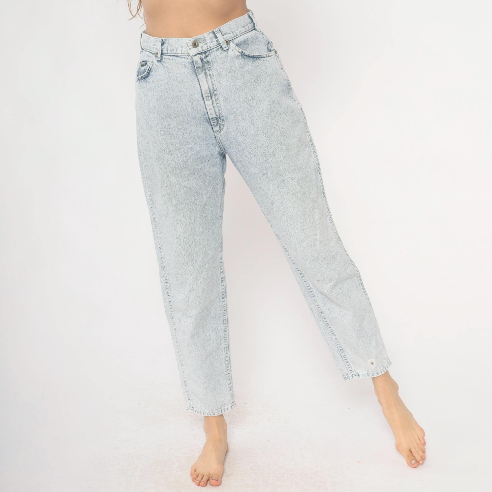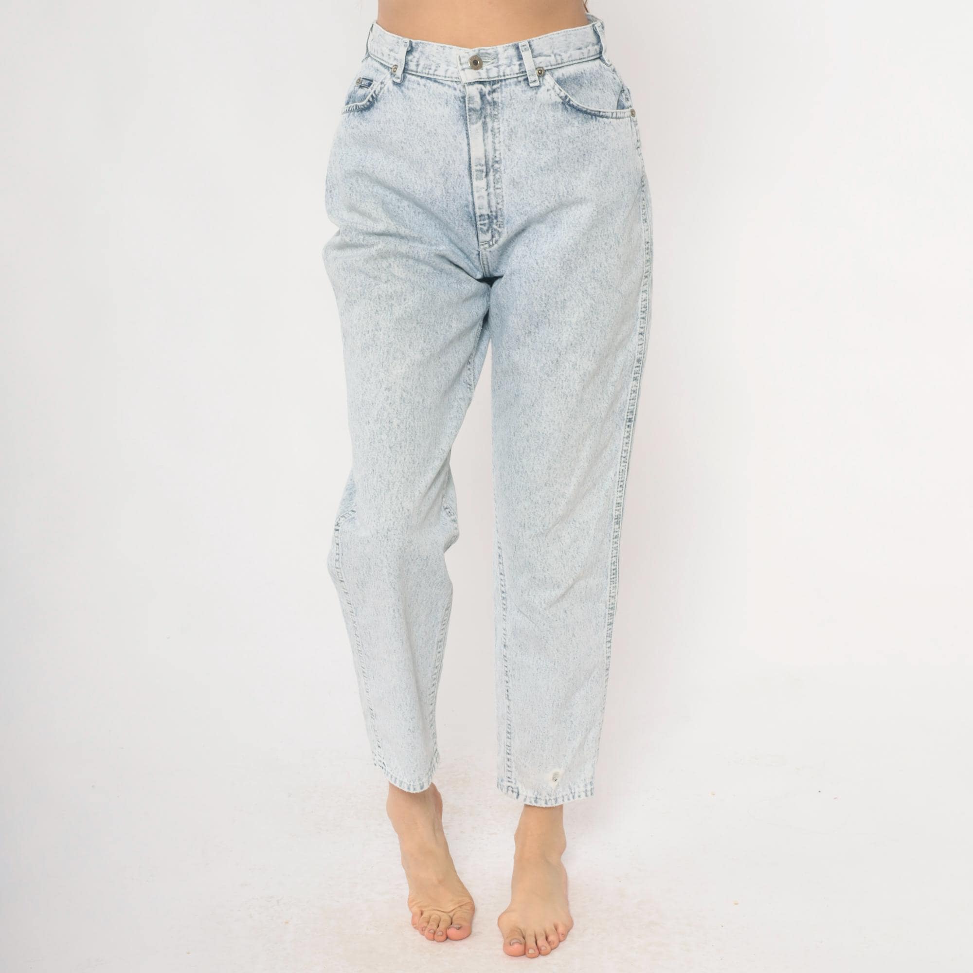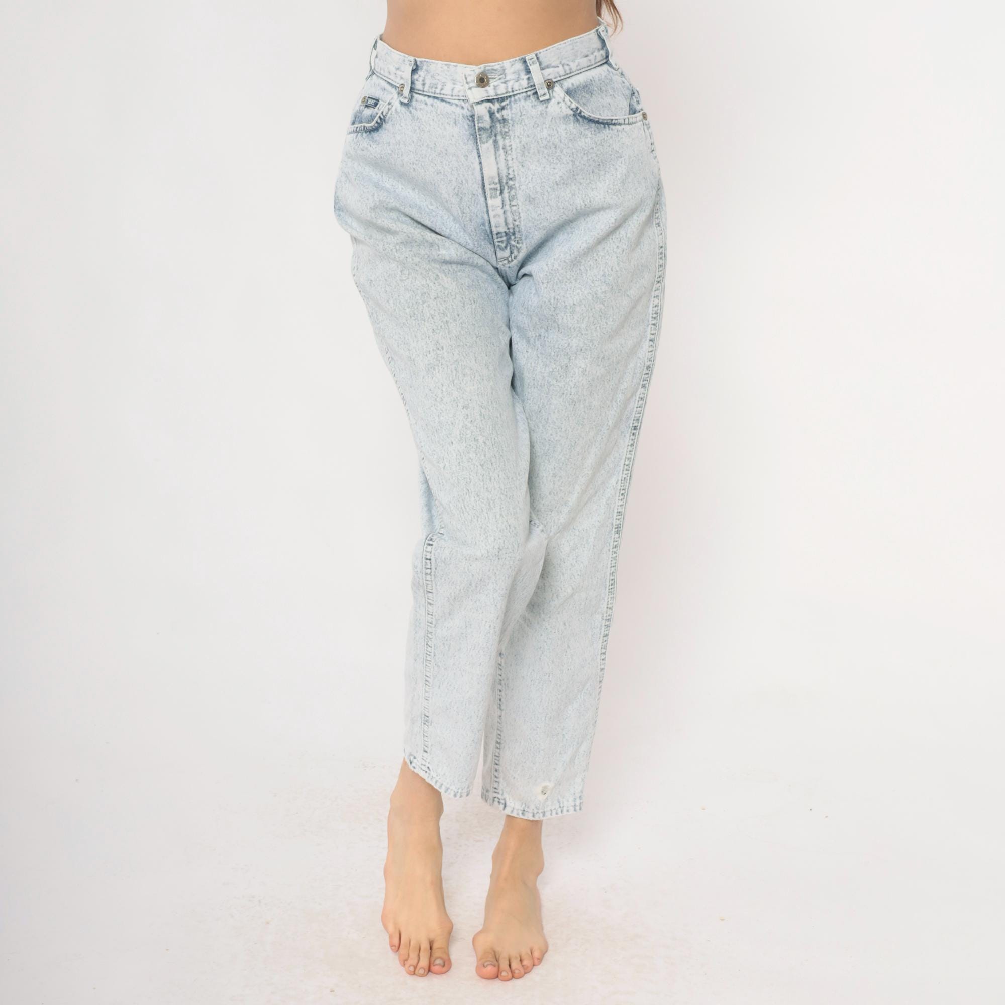90s high-waisted straight leg jeans from Lee in light acid wash blue denim. Button fly closure, classic five-pocket construction with signature Lee back pocket stitching. Tapered straight leg with ankle-length inseam.