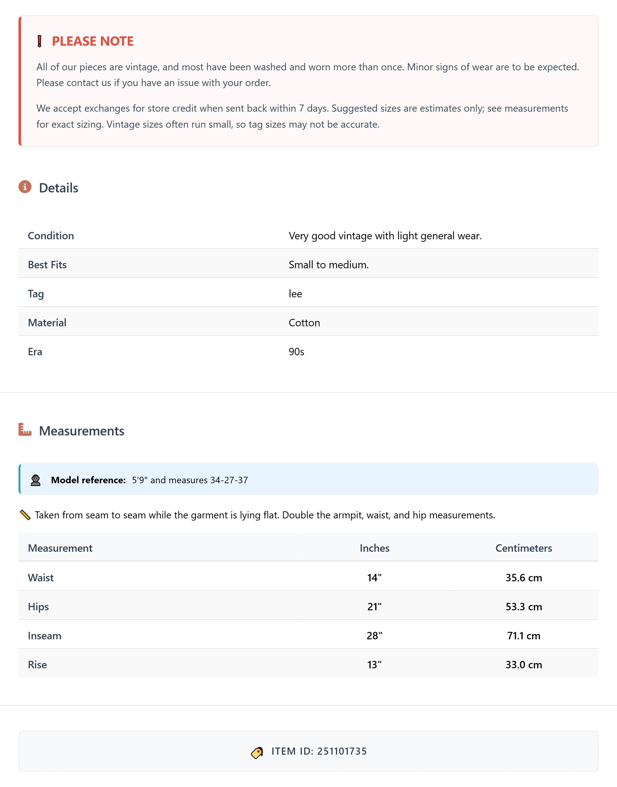 Vintage denim was usually made without any stretch, unlike modern jeans. Check the measurements to ensure proper fit, and remember to give yourself a little wiggle room in the waist and hips, depending on your preferred fit.