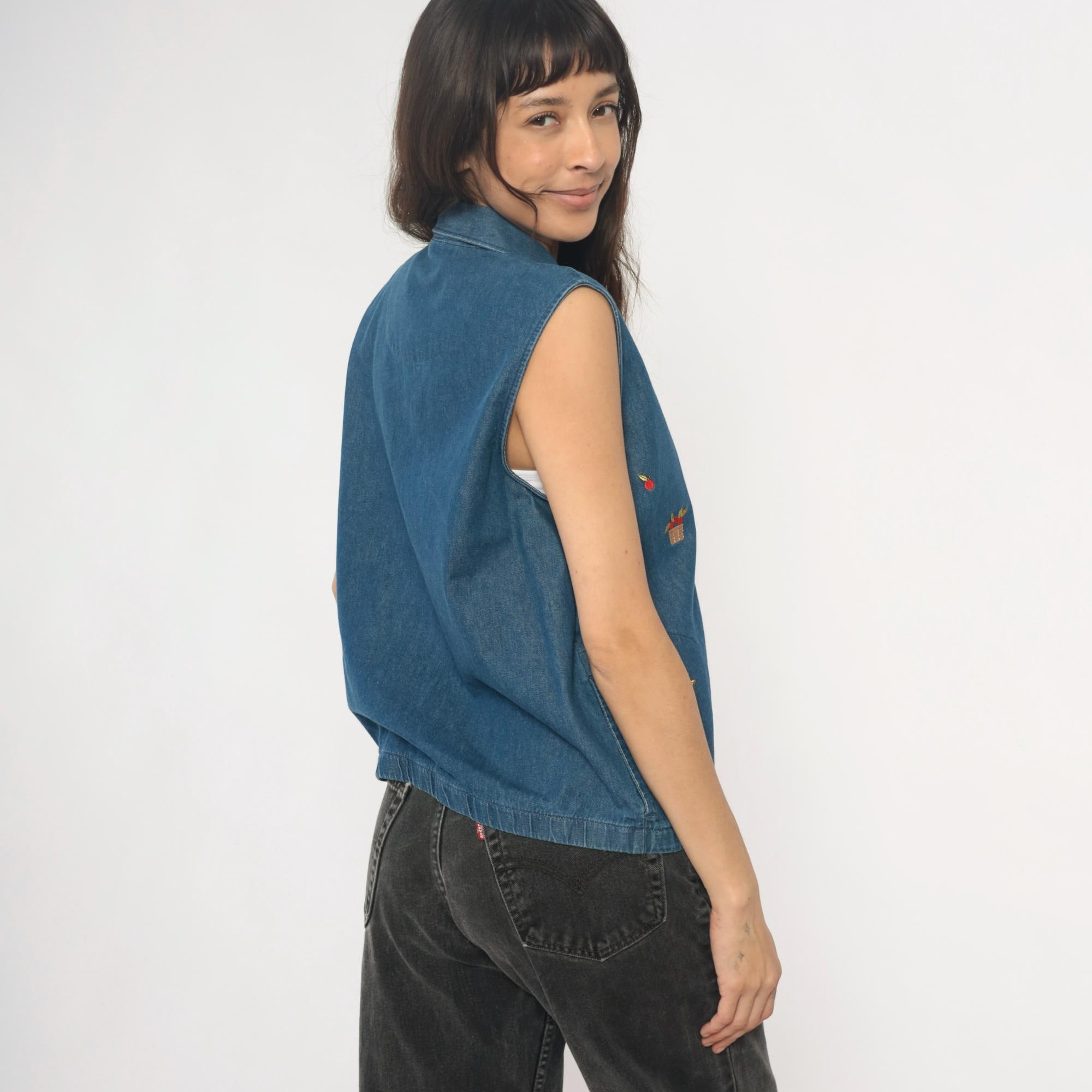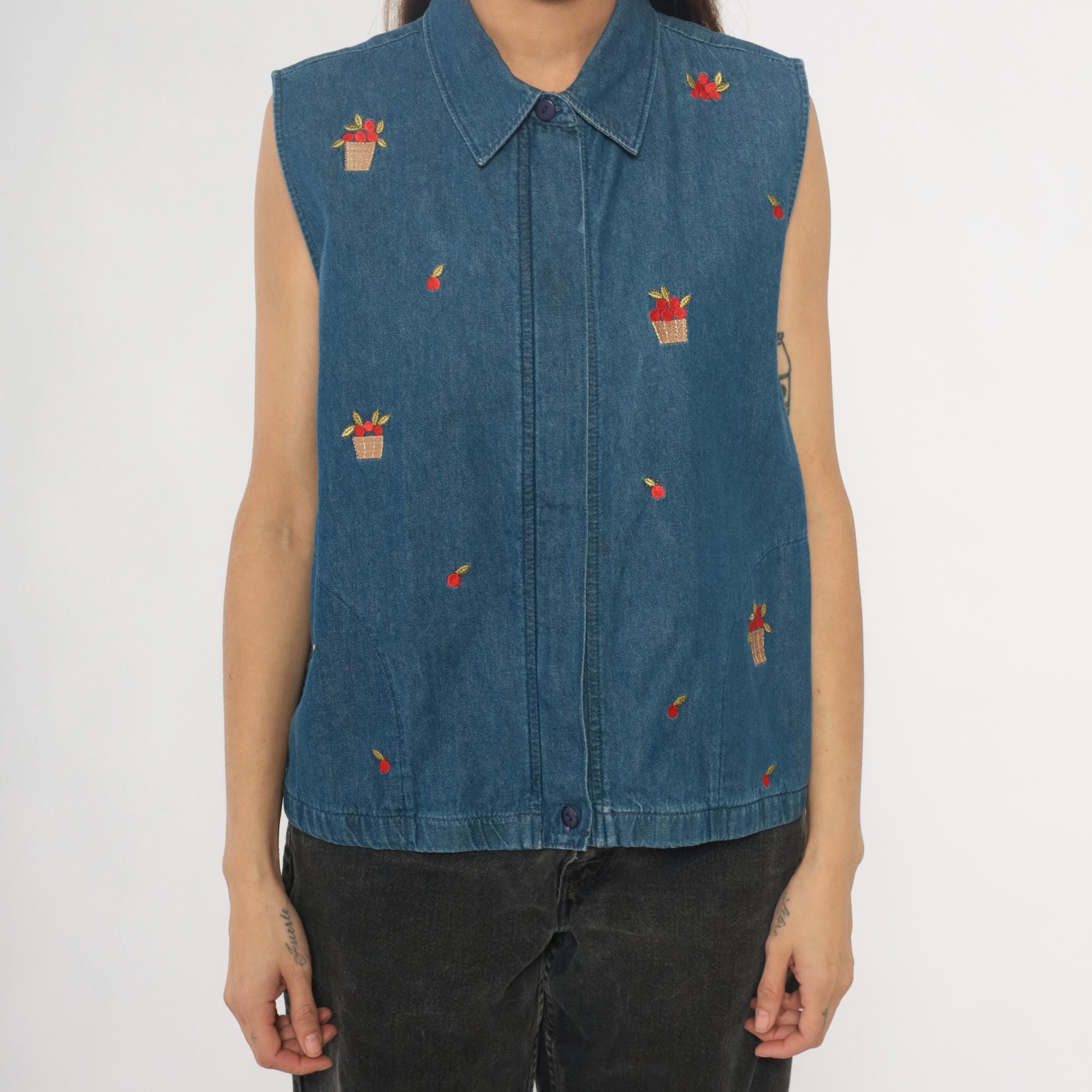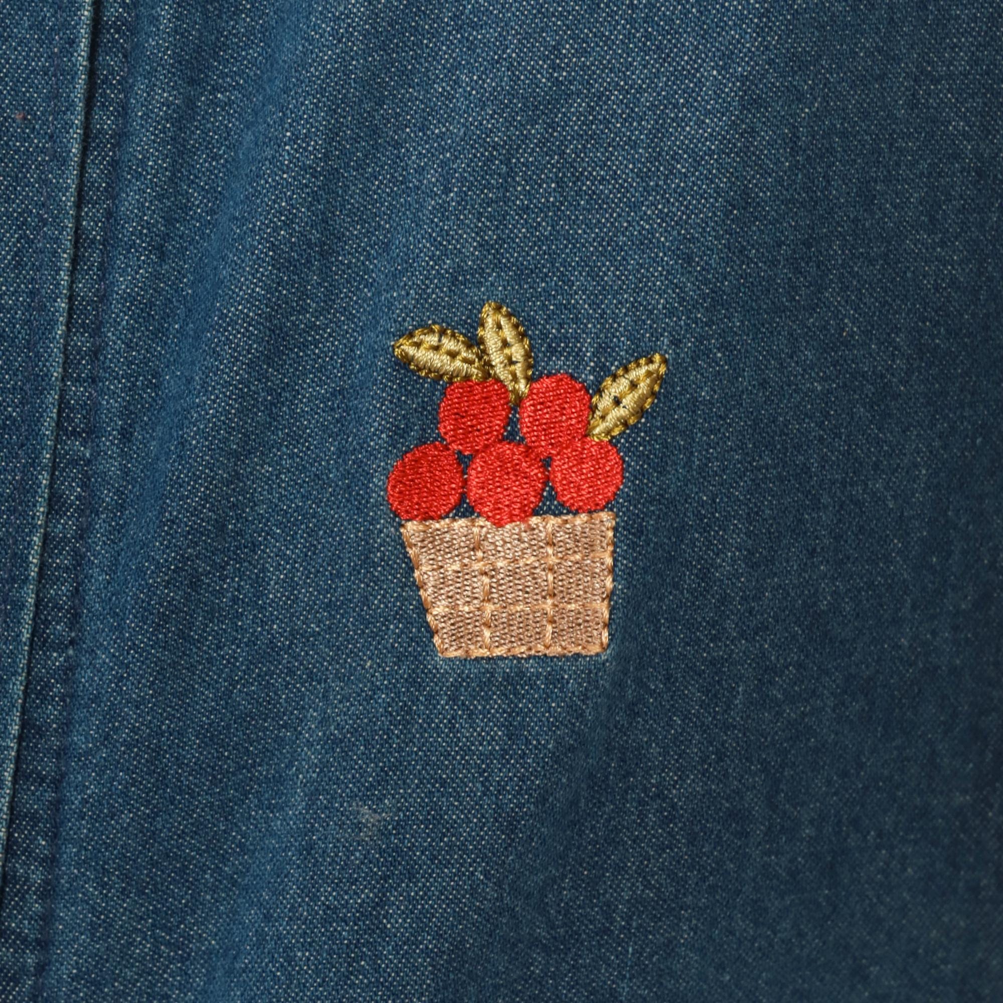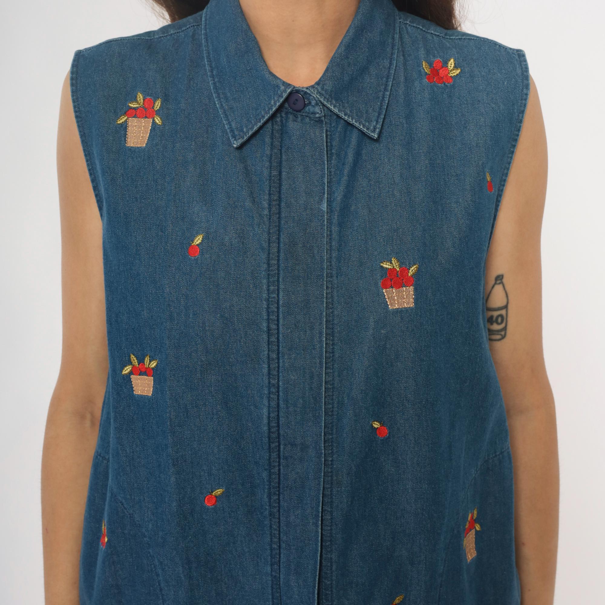 90s denim vest from Allison Daley with embroidered basket and fruit motifs scattered across the front. Button front closure with collared neckline and sleeveless silhouette in medium wash blue denim. Small red flower baskets and individual cherries embroidered in red, tan, and yellow thread throughout.