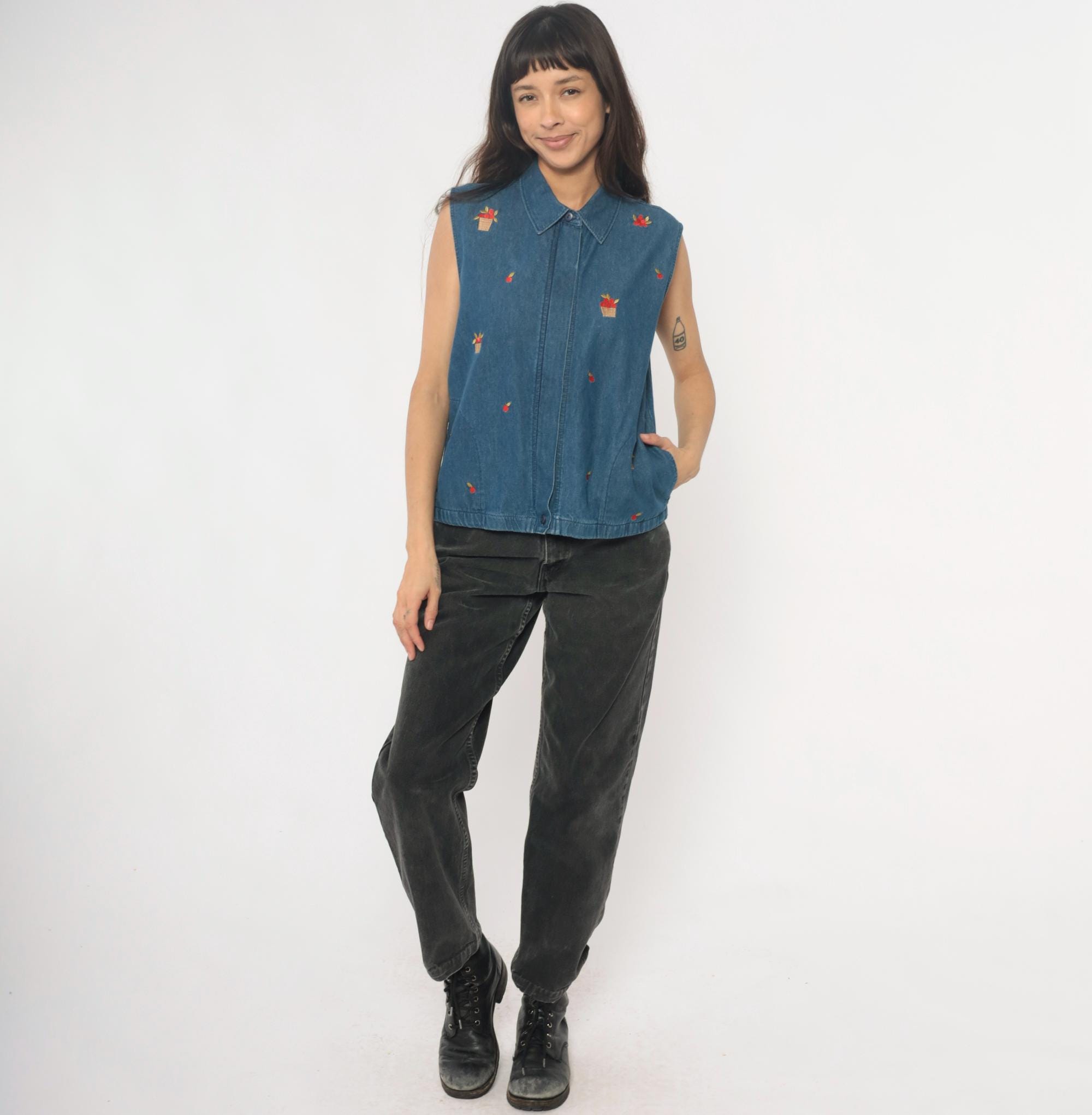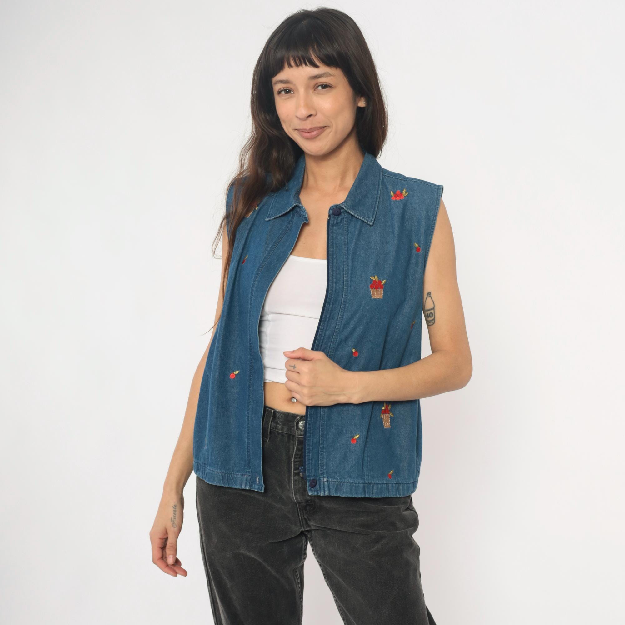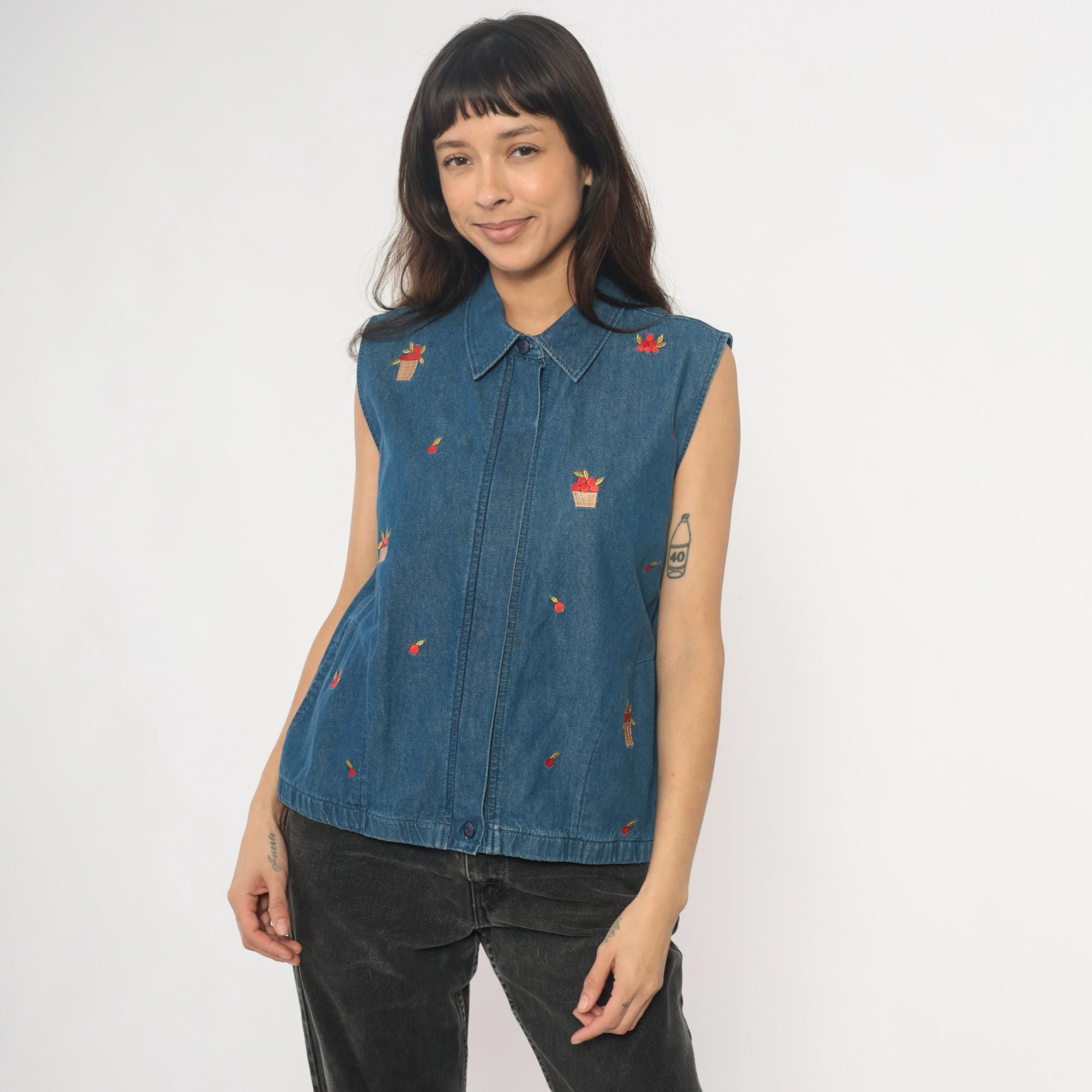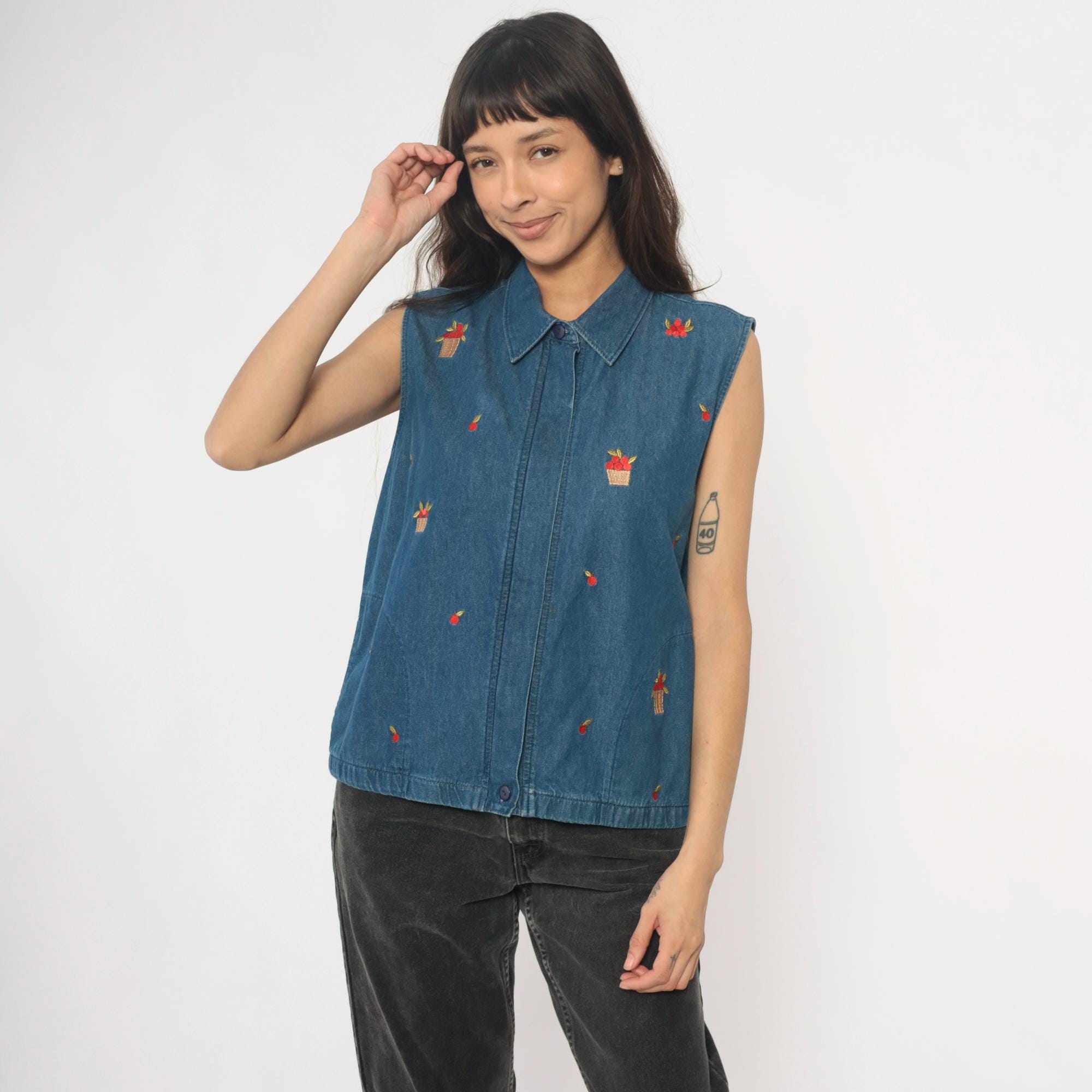 90s denim vest from Allison Daley with embroidered basket and fruit motifs scattered across the front. Button front closure with collared neckline and sleeveless silhouette in medium wash blue denim. Small red flower baskets and individual cherries embroidered in red, tan, and yellow thread throughout.