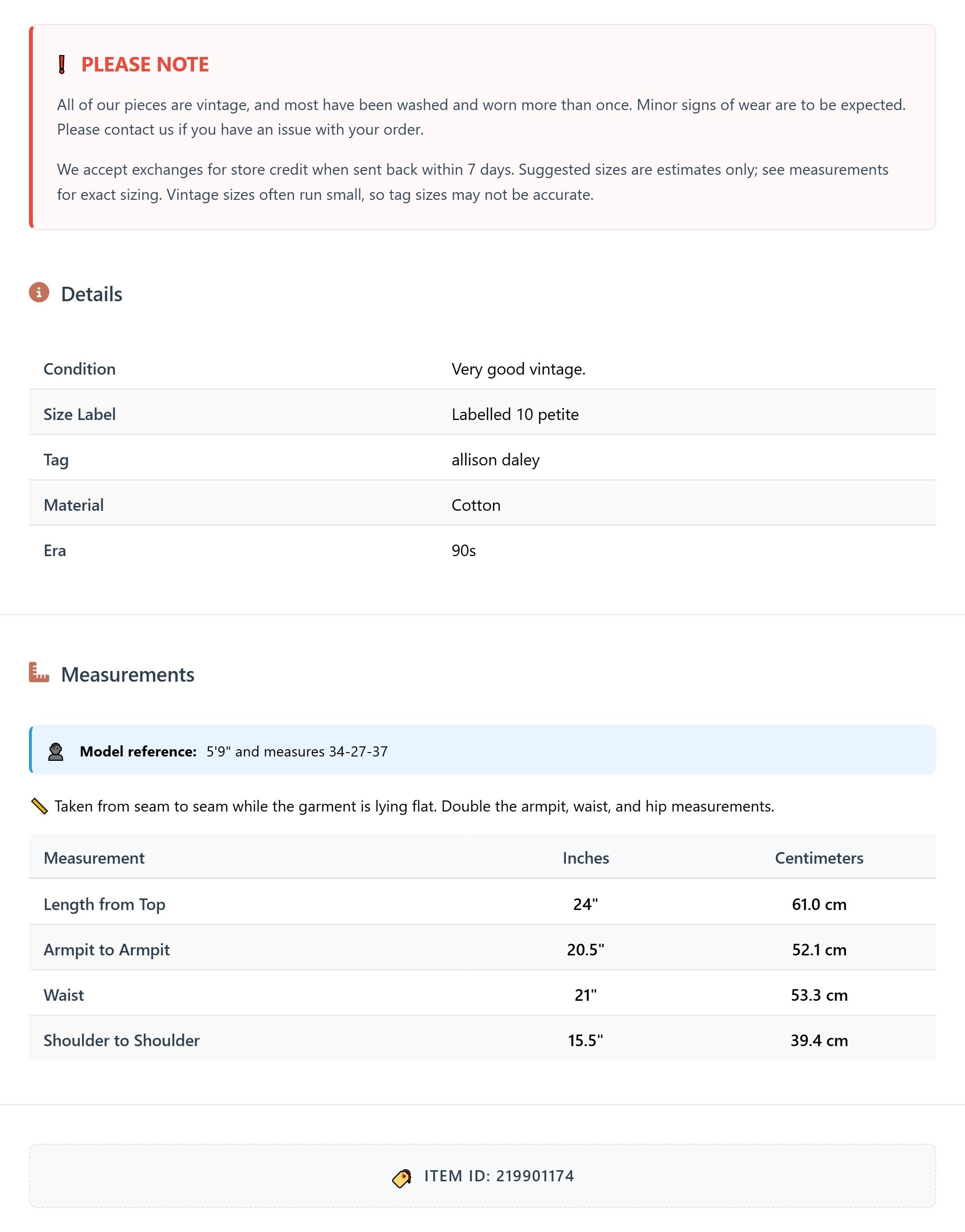 All of our pieces are vintage, and most have been washed and worn more than once. Minor signs of wear are to be expected. Please contact us if you have an issue with your order. We accept exchanges for store credit when sent back within 7 days.