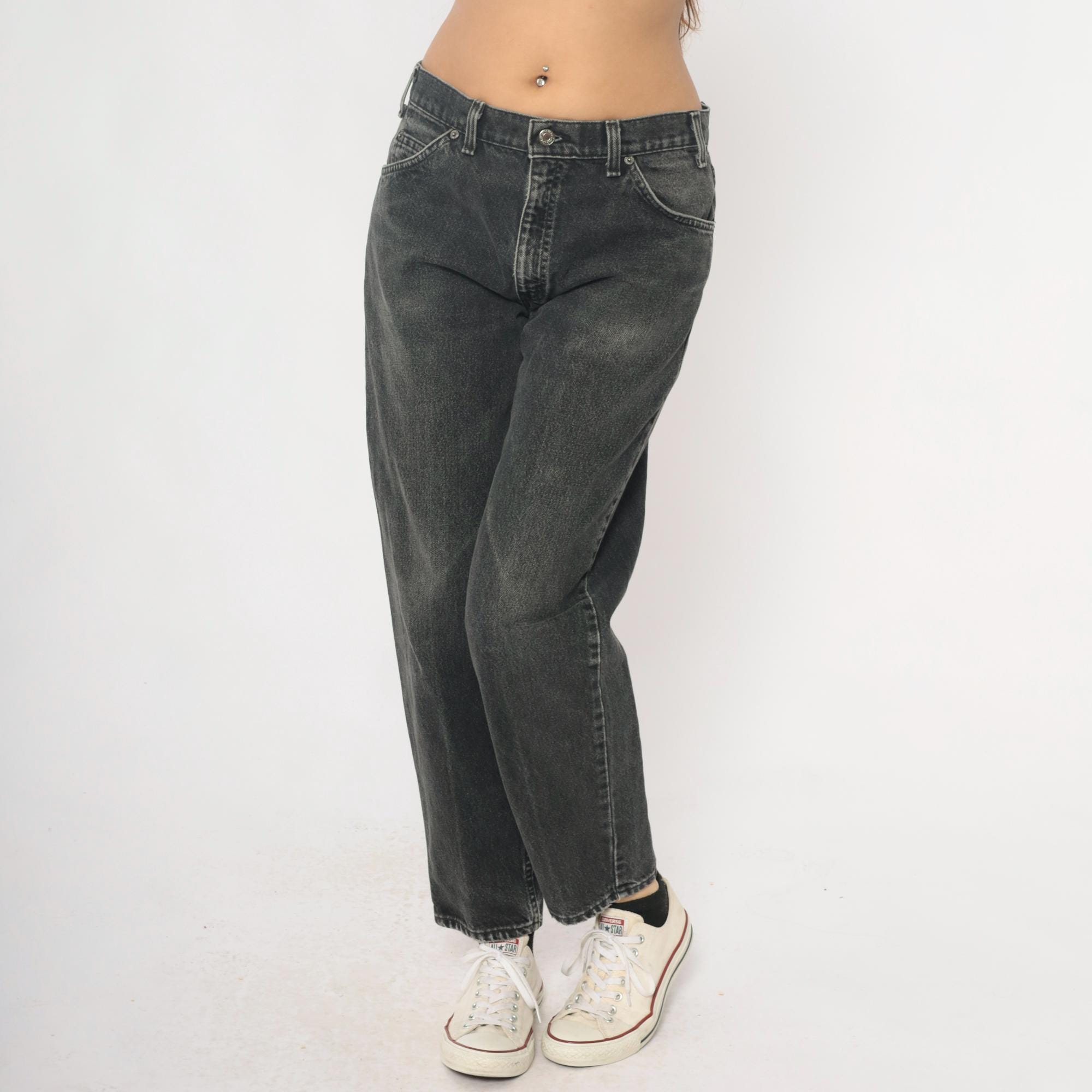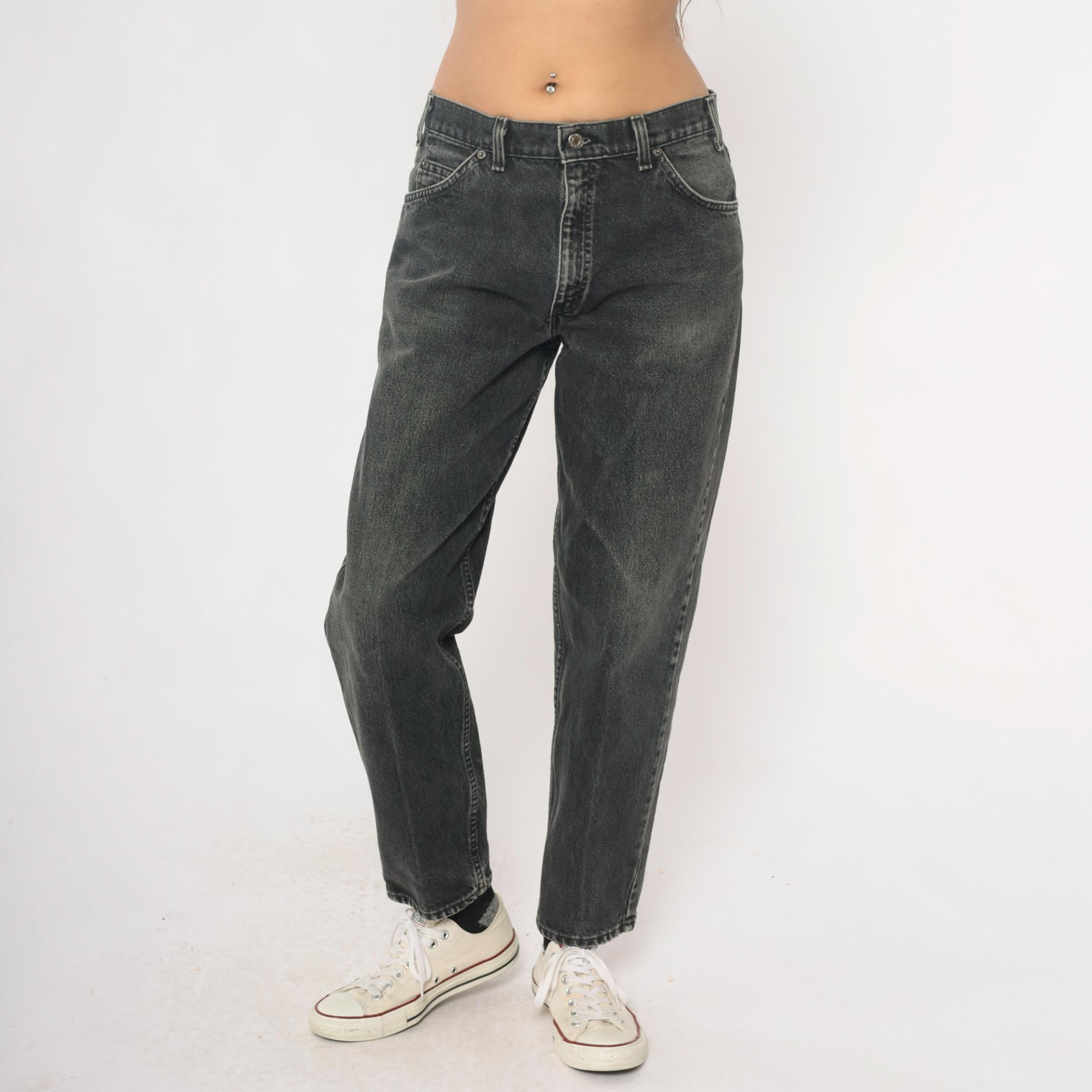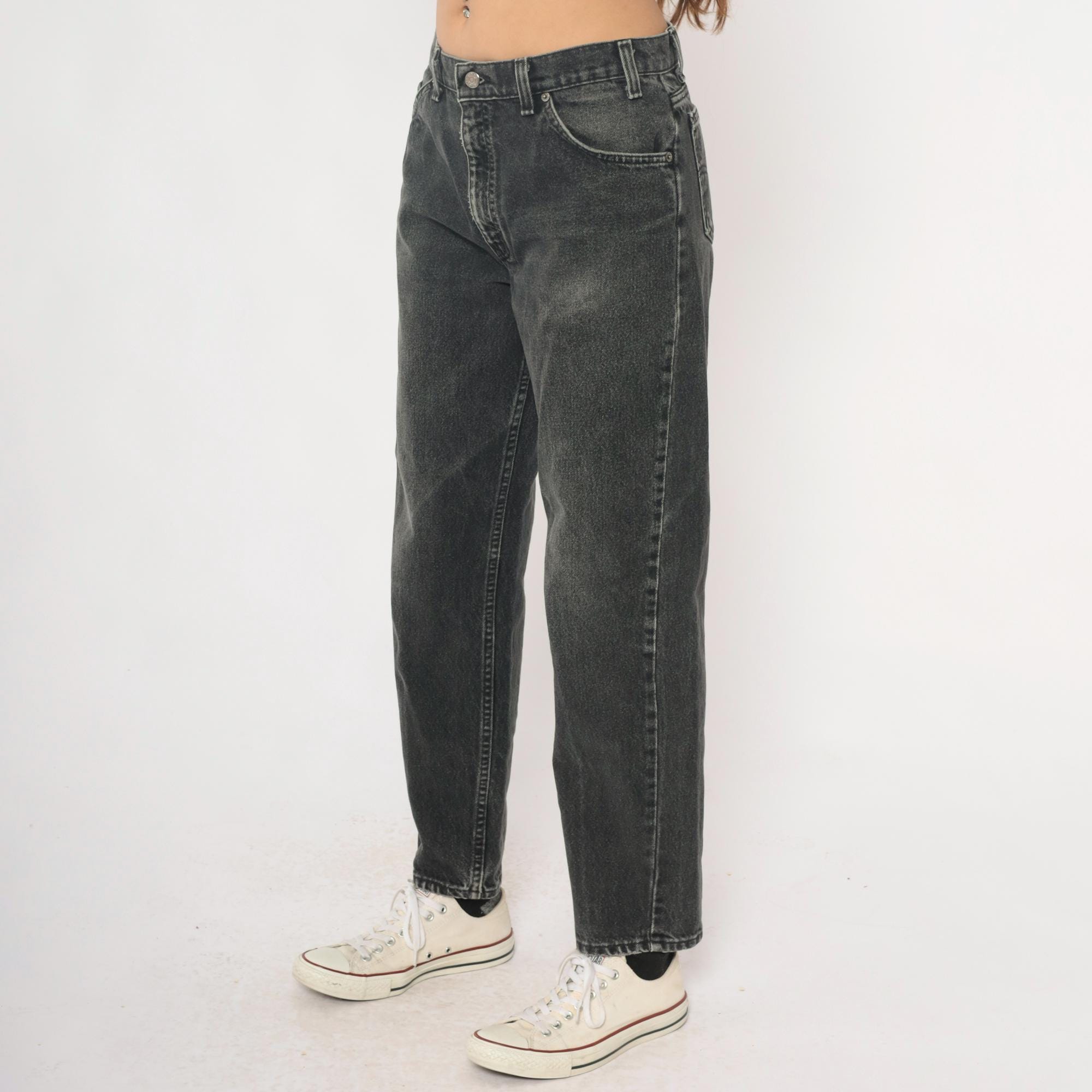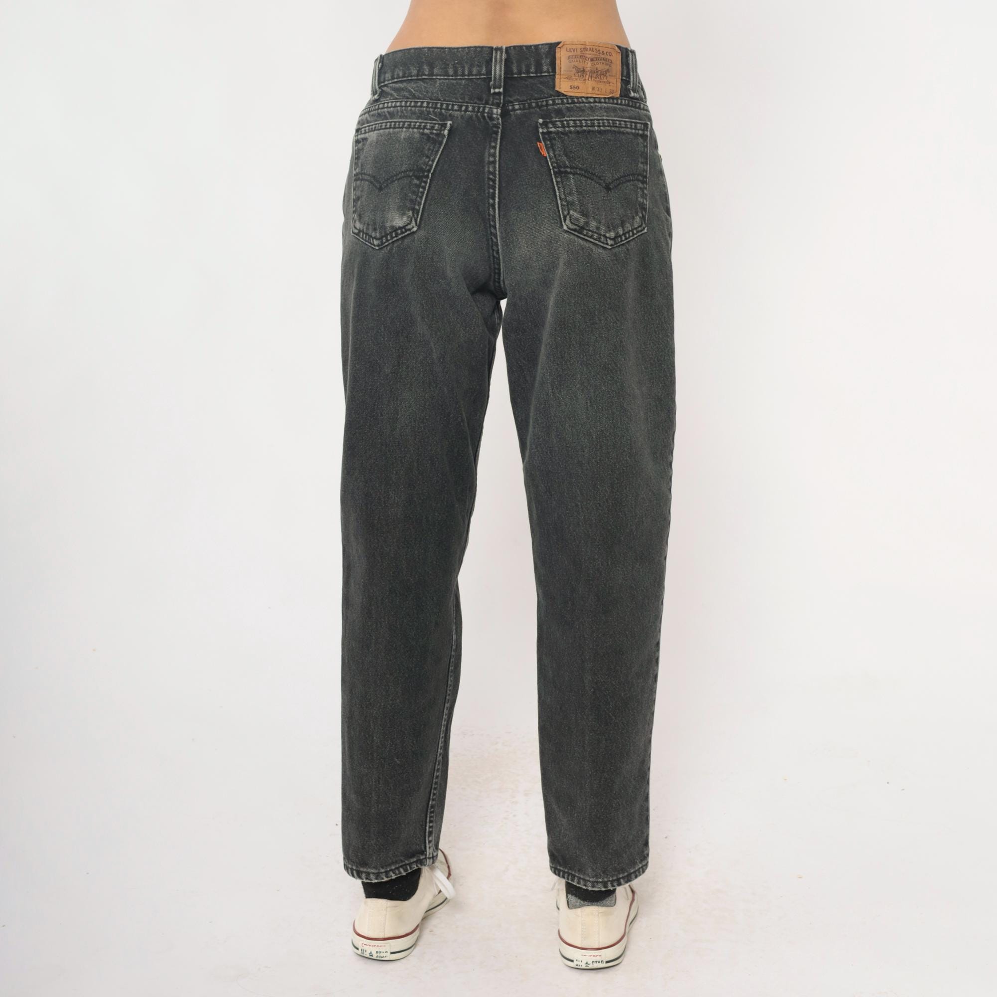 90s Levi's 550 jeans in faded black and charcoal gray denim with relaxed fit through hips and thighs, tapered leg from knee to hem. Five-pocket styling with button fly closure, signature leather logo patch at back waistband. Distressed finish with natural fading throughout fabric.