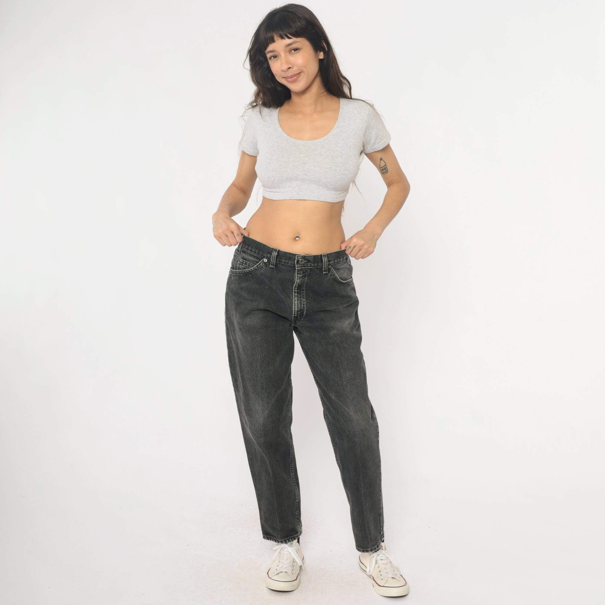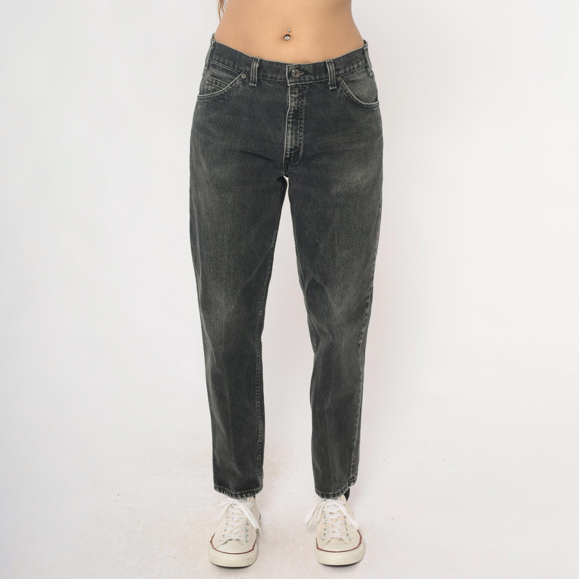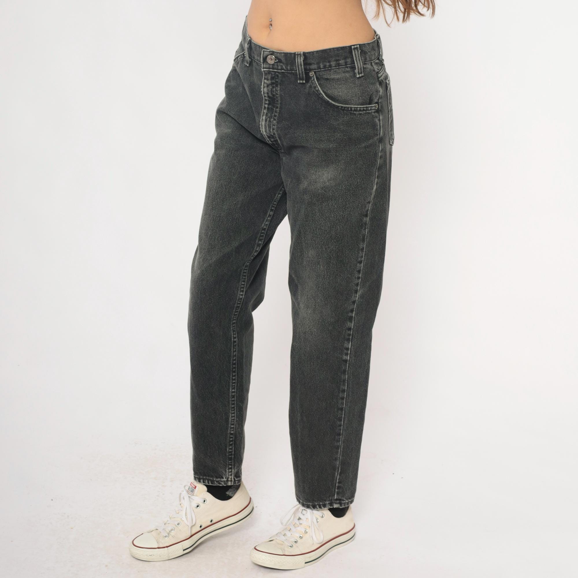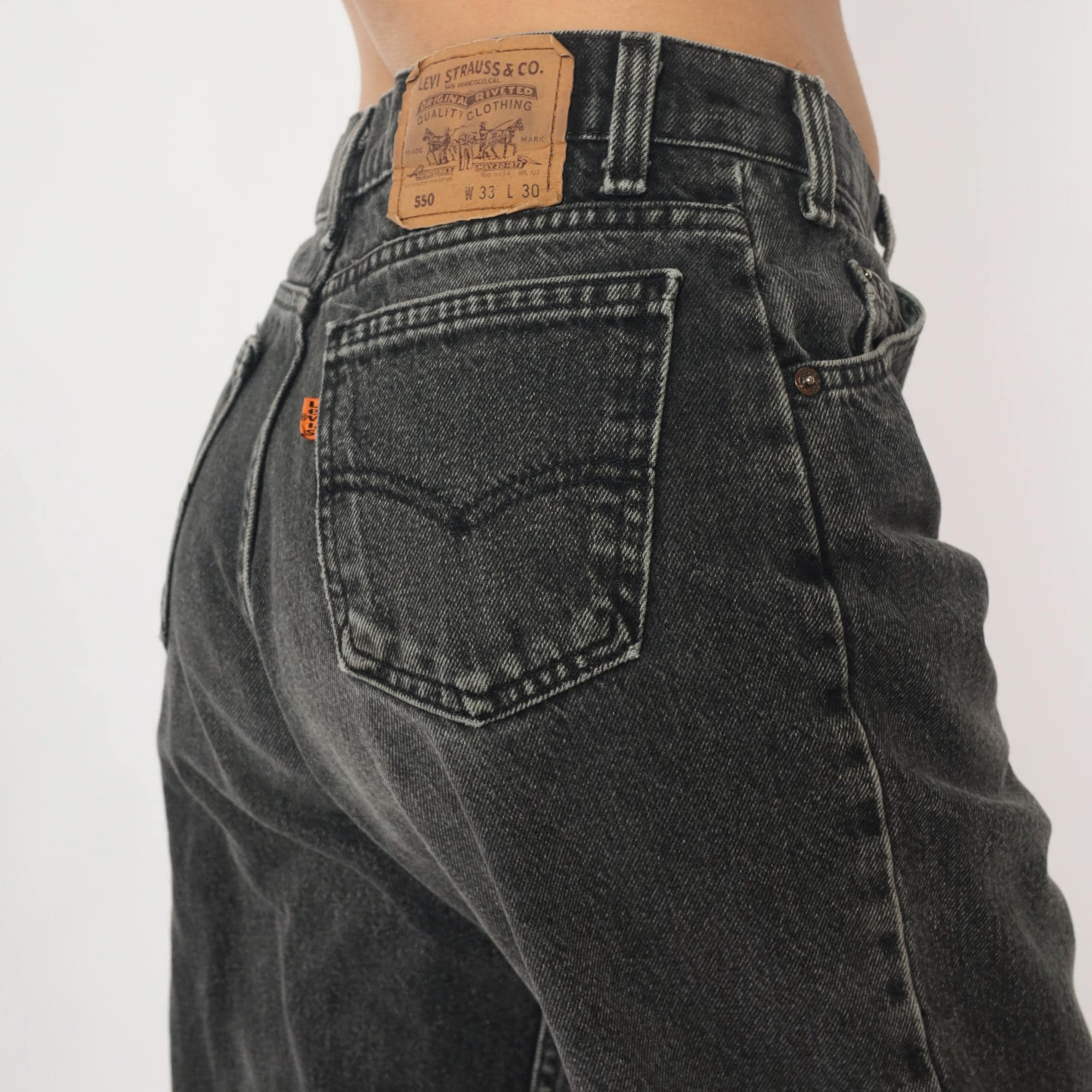 90s Levi's 550 jeans in faded black and charcoal gray denim with relaxed fit through hips and thighs, tapered leg from knee to hem. Five-pocket styling with button fly closure, signature leather logo patch at back waistband. Distressed finish with natural fading throughout fabric.