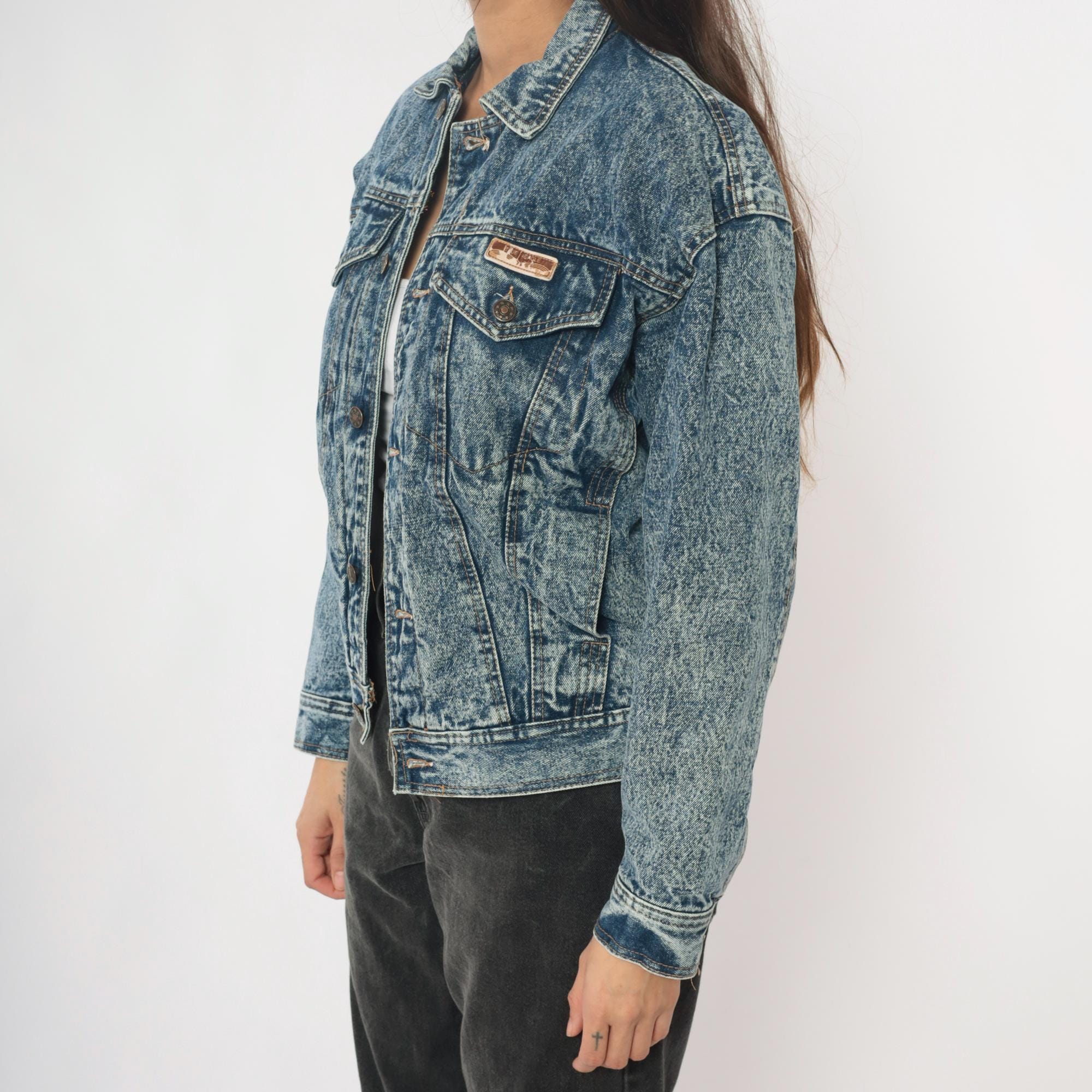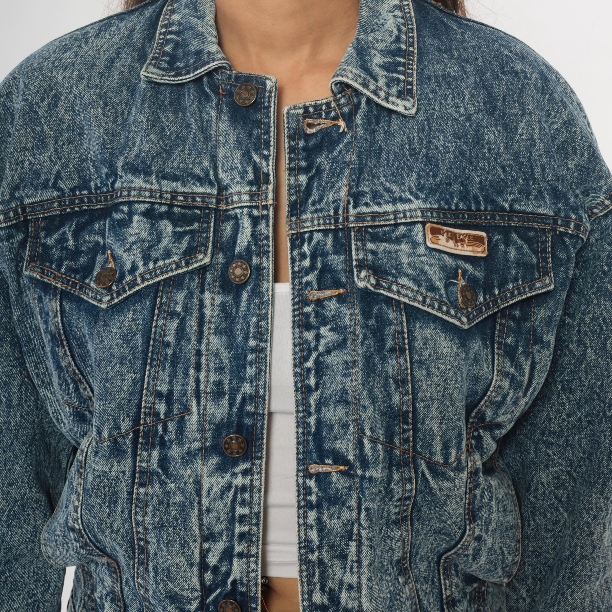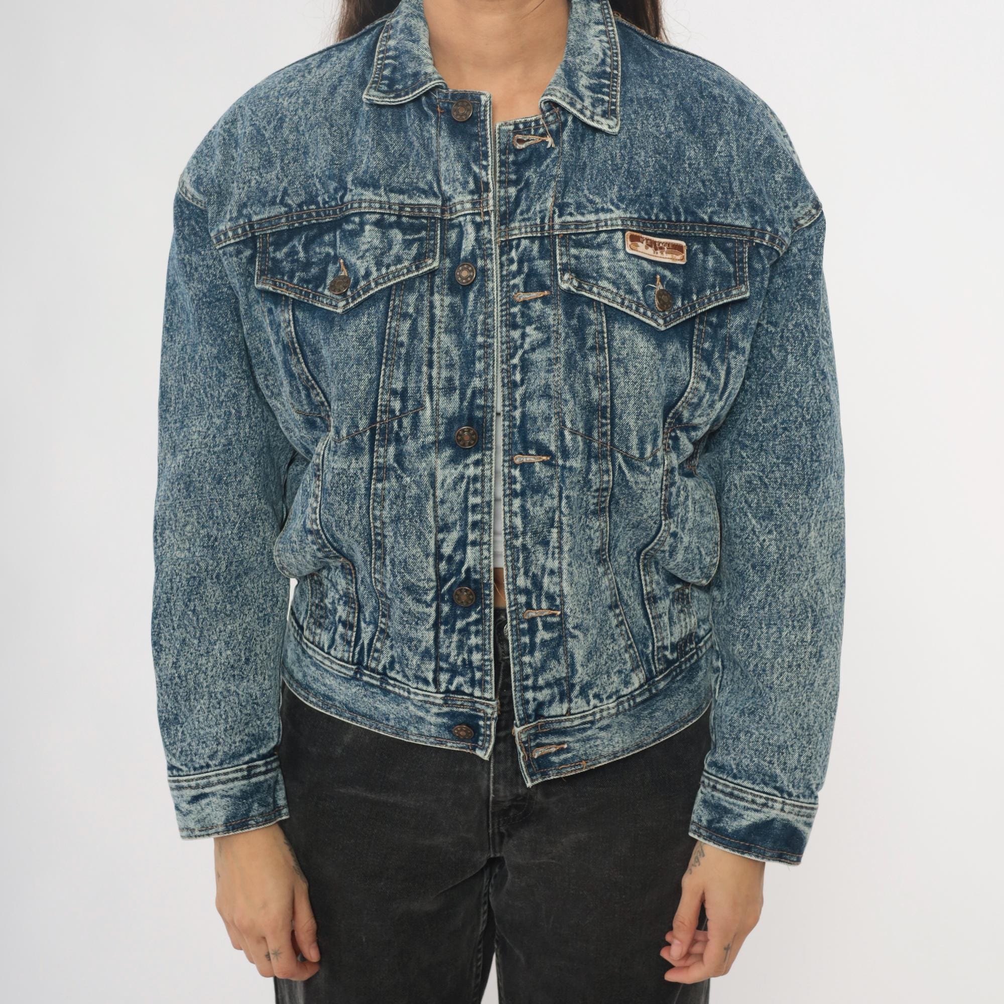 90s acid wash denim jacket from Blue Eagle with medium blue stone wash finish throughout. Classic trucker style with two chest pockets with button flap closures, button front, and pointed collar.