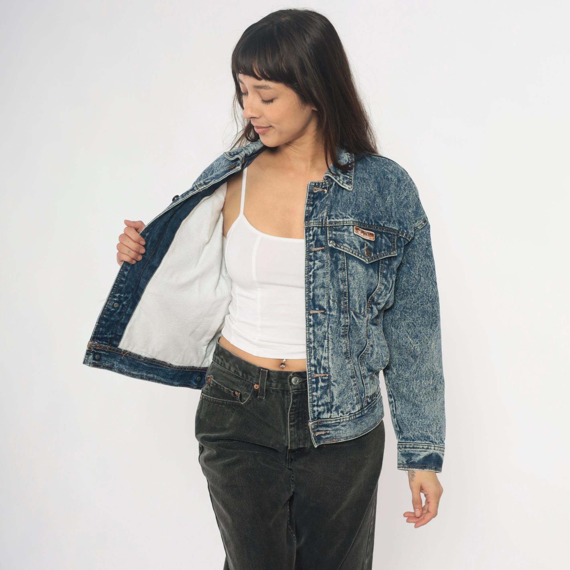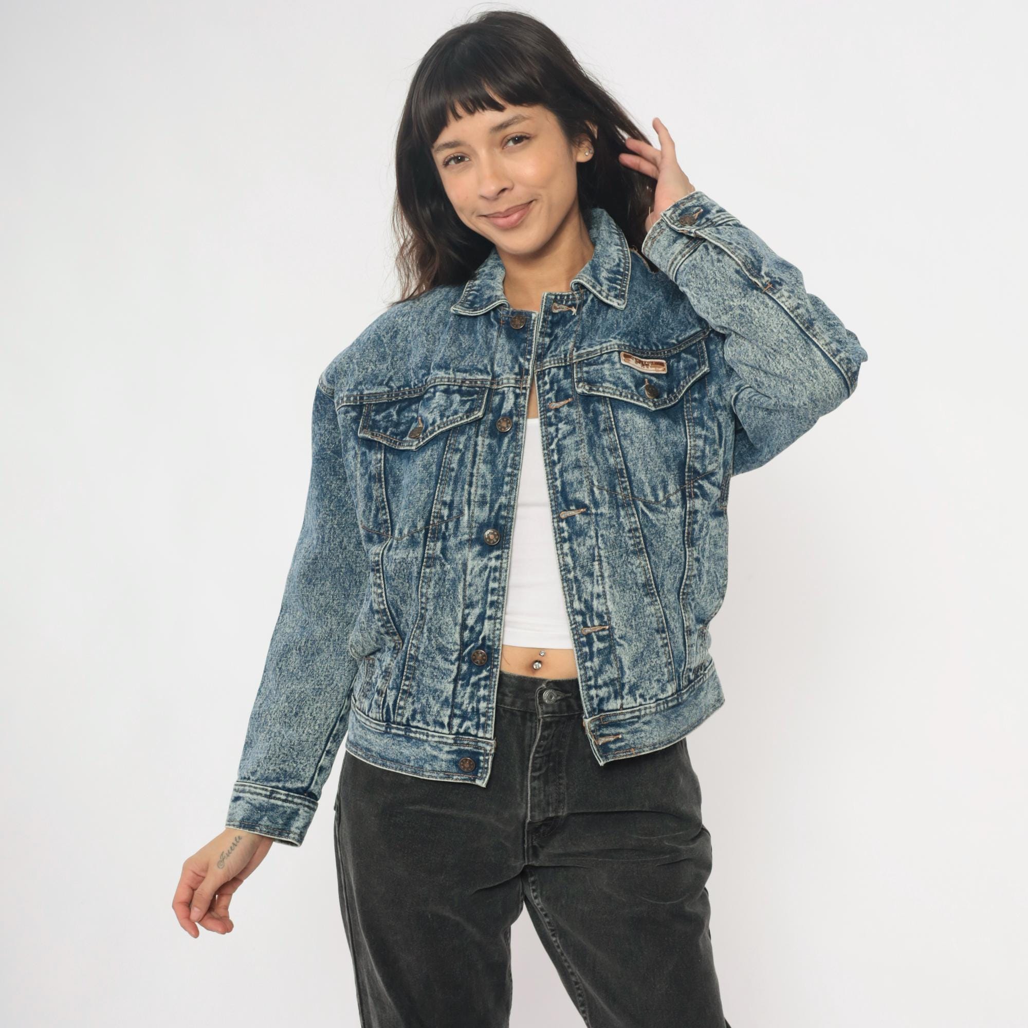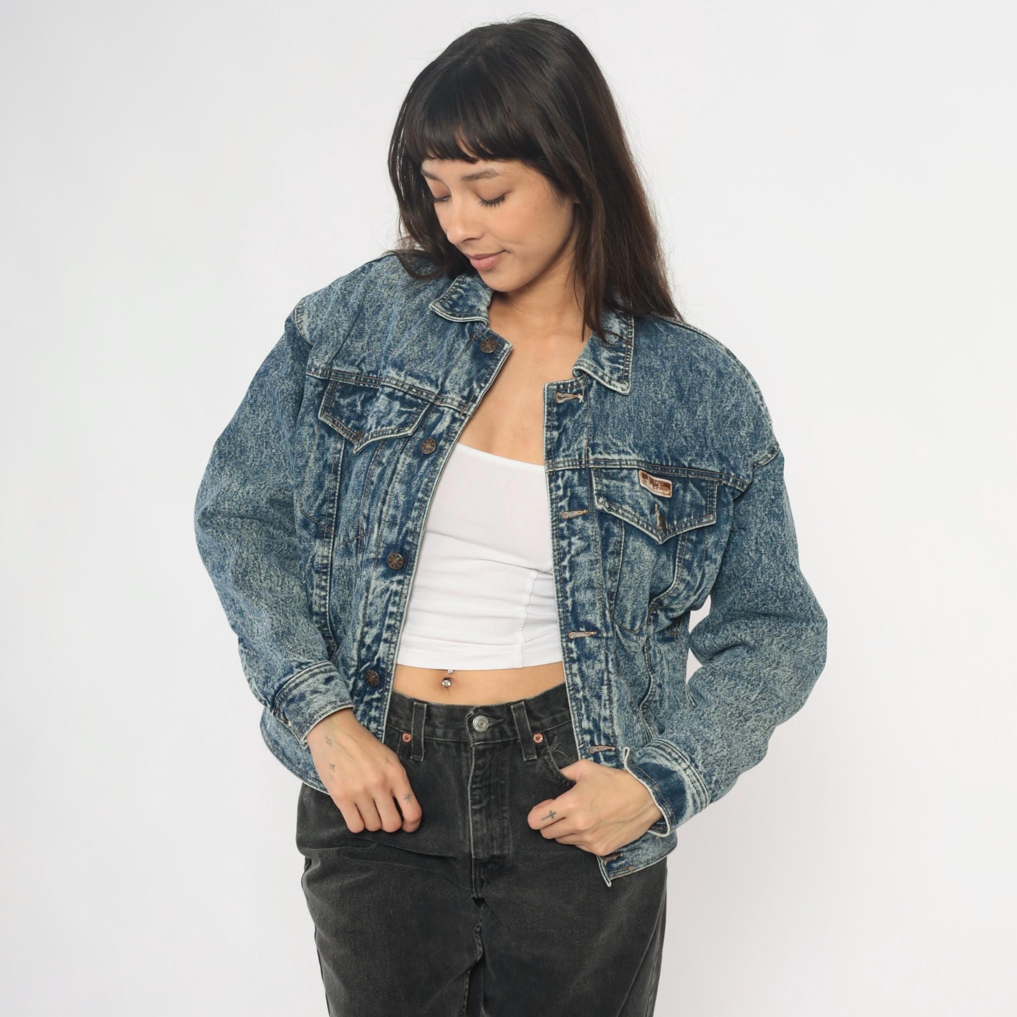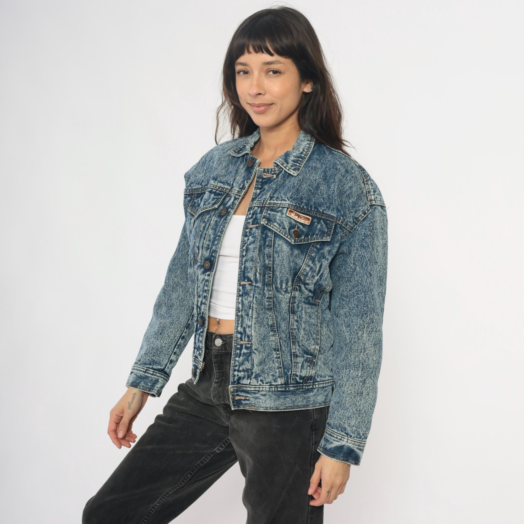 90s acid wash denim jacket from Blue Eagle with medium blue stone wash finish throughout. Classic trucker style with two chest pockets with button flap closures, button front, and pointed collar.