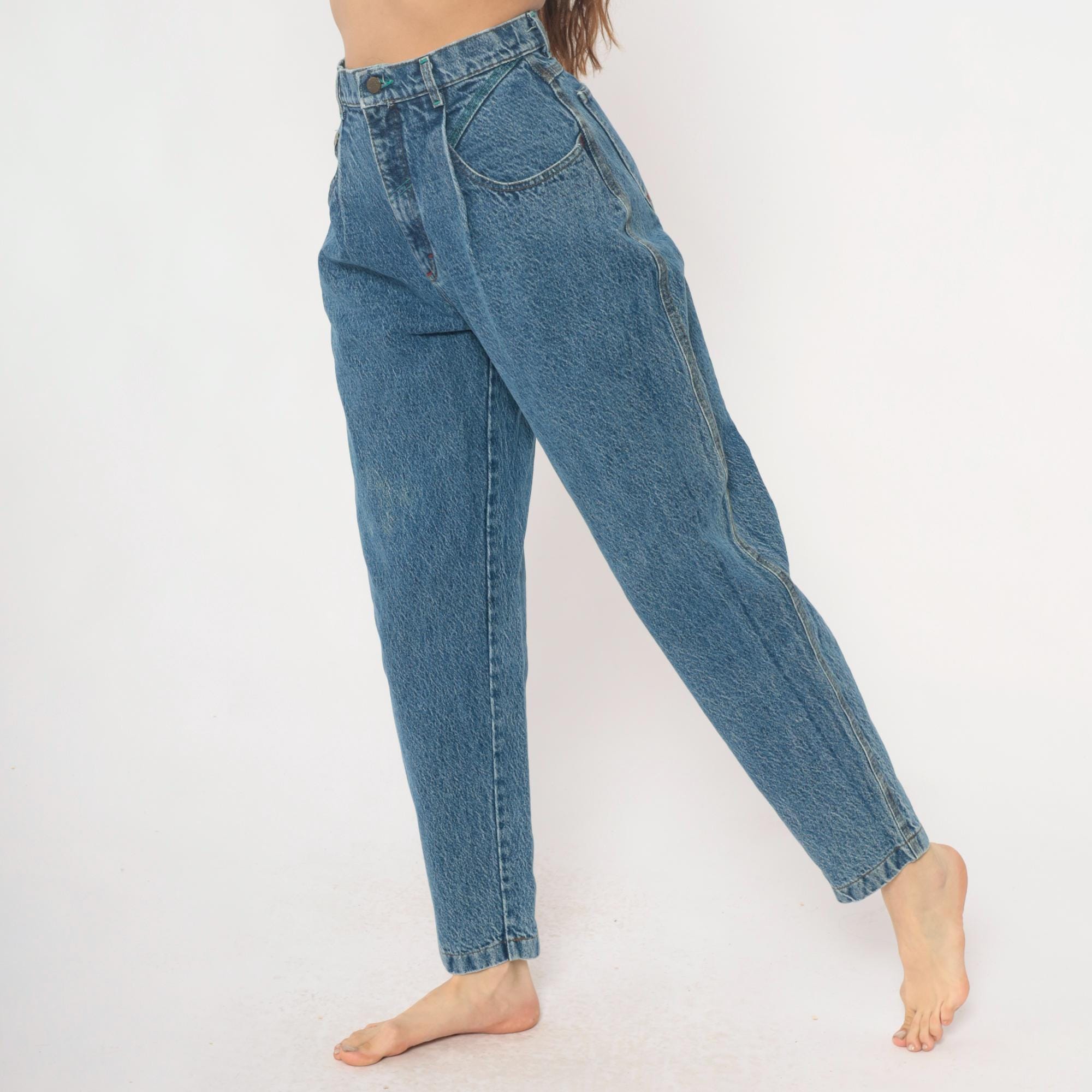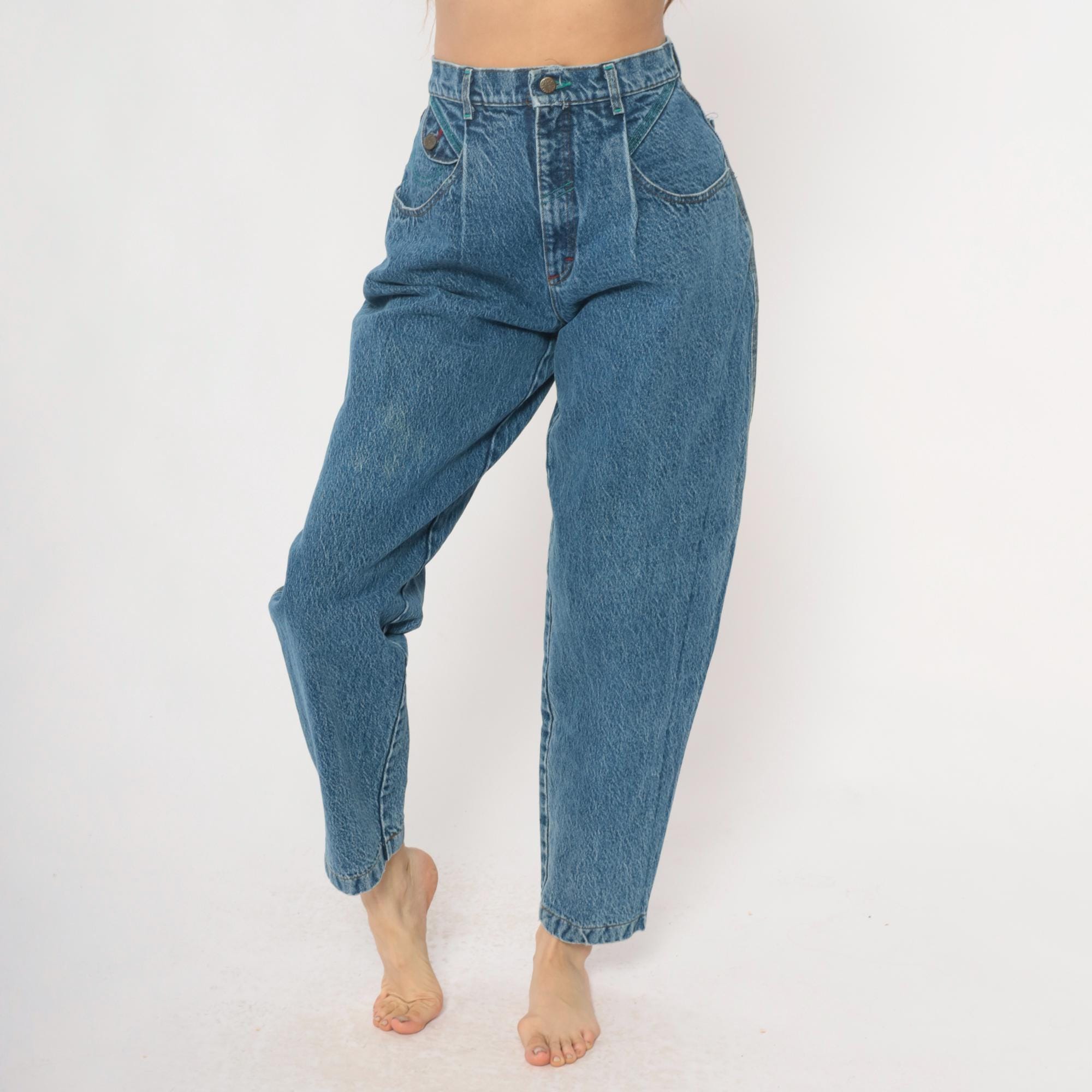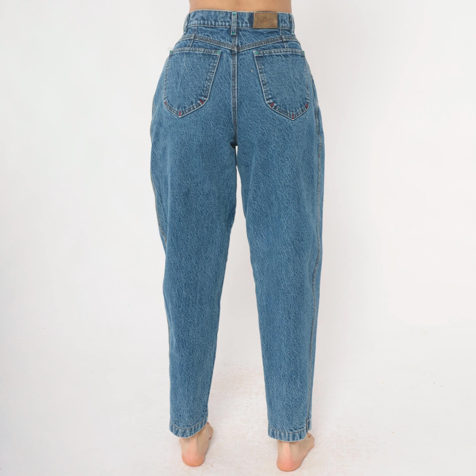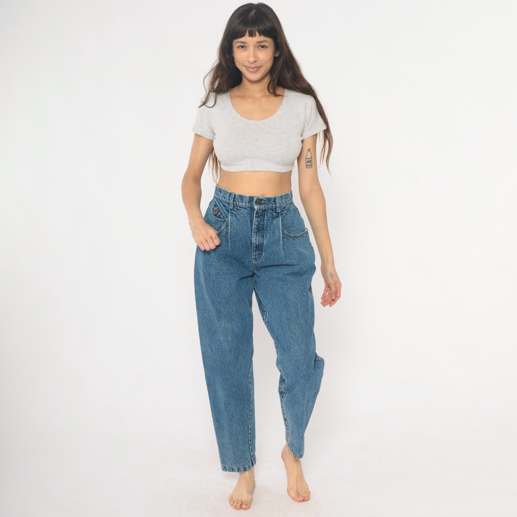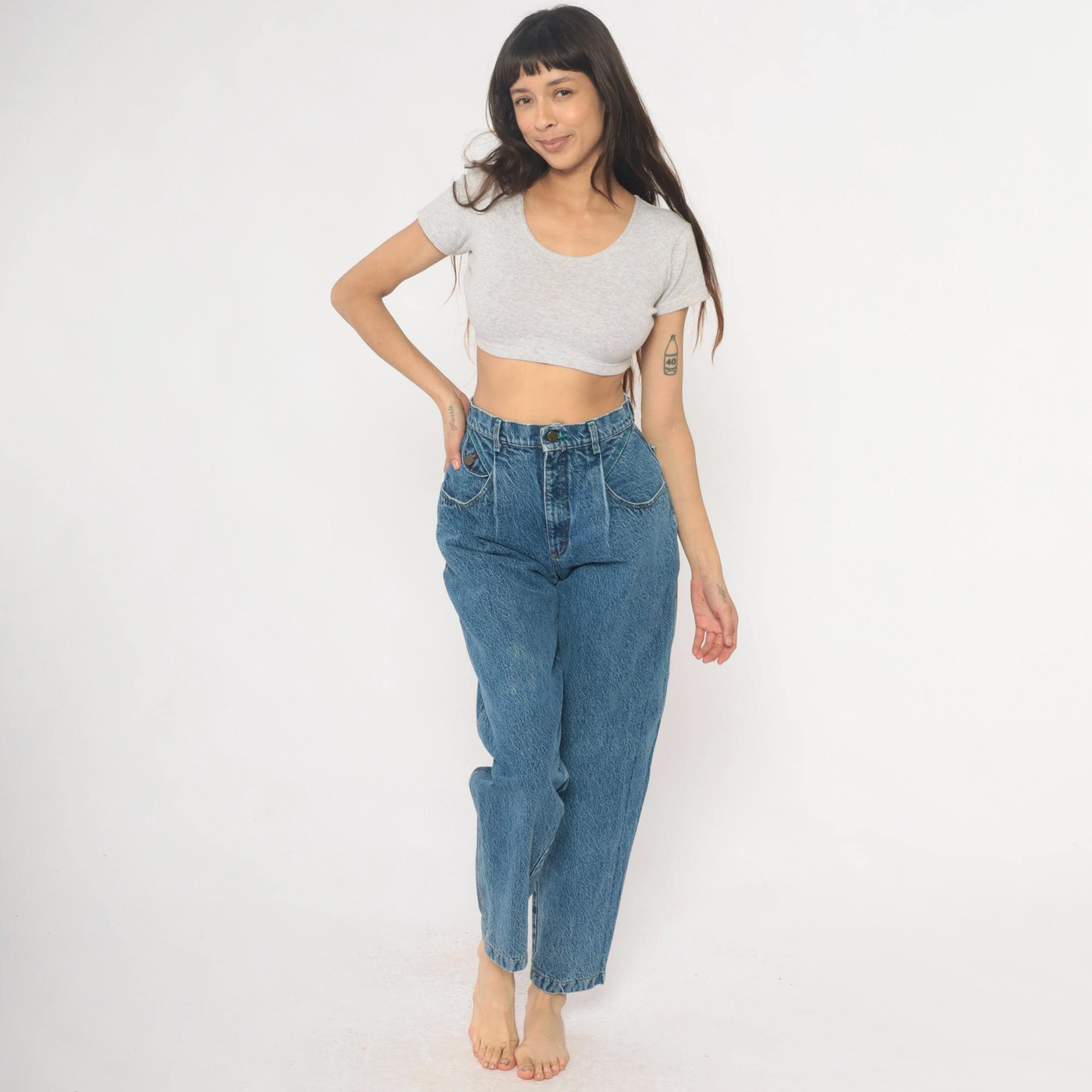 90s high waisted jeans from Lee in medium blue denim with tapered leg. Button fly closure, belt loops, classic five pocket styling, leather Lee brand patch at back waistband.