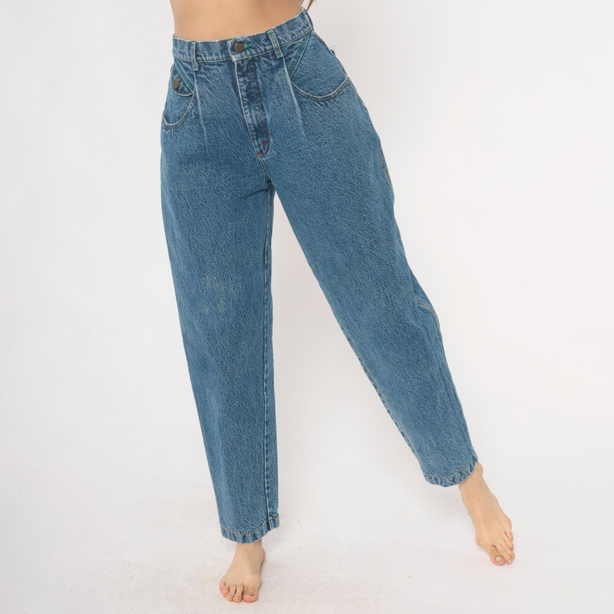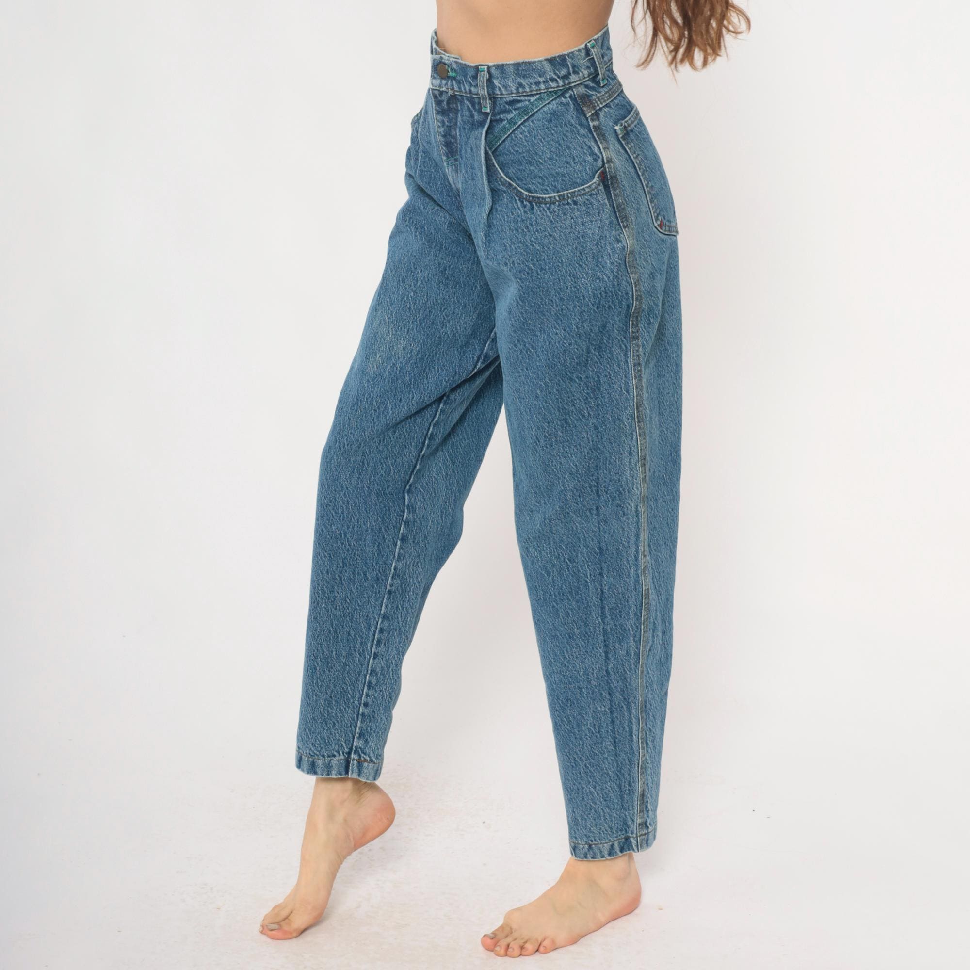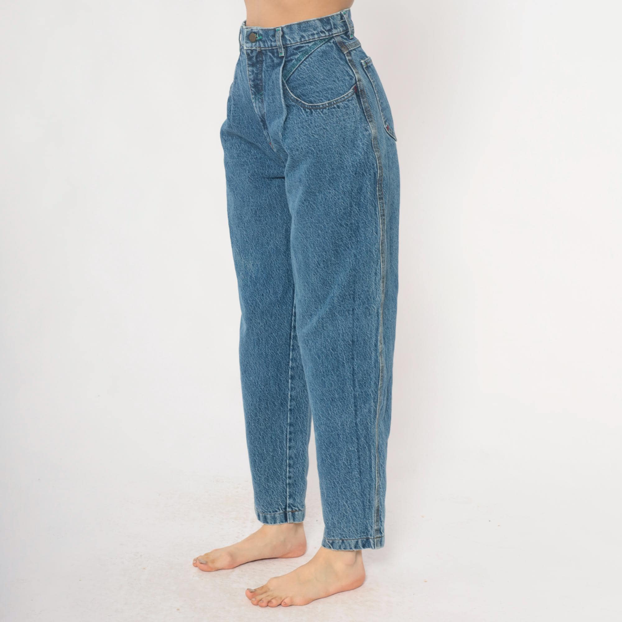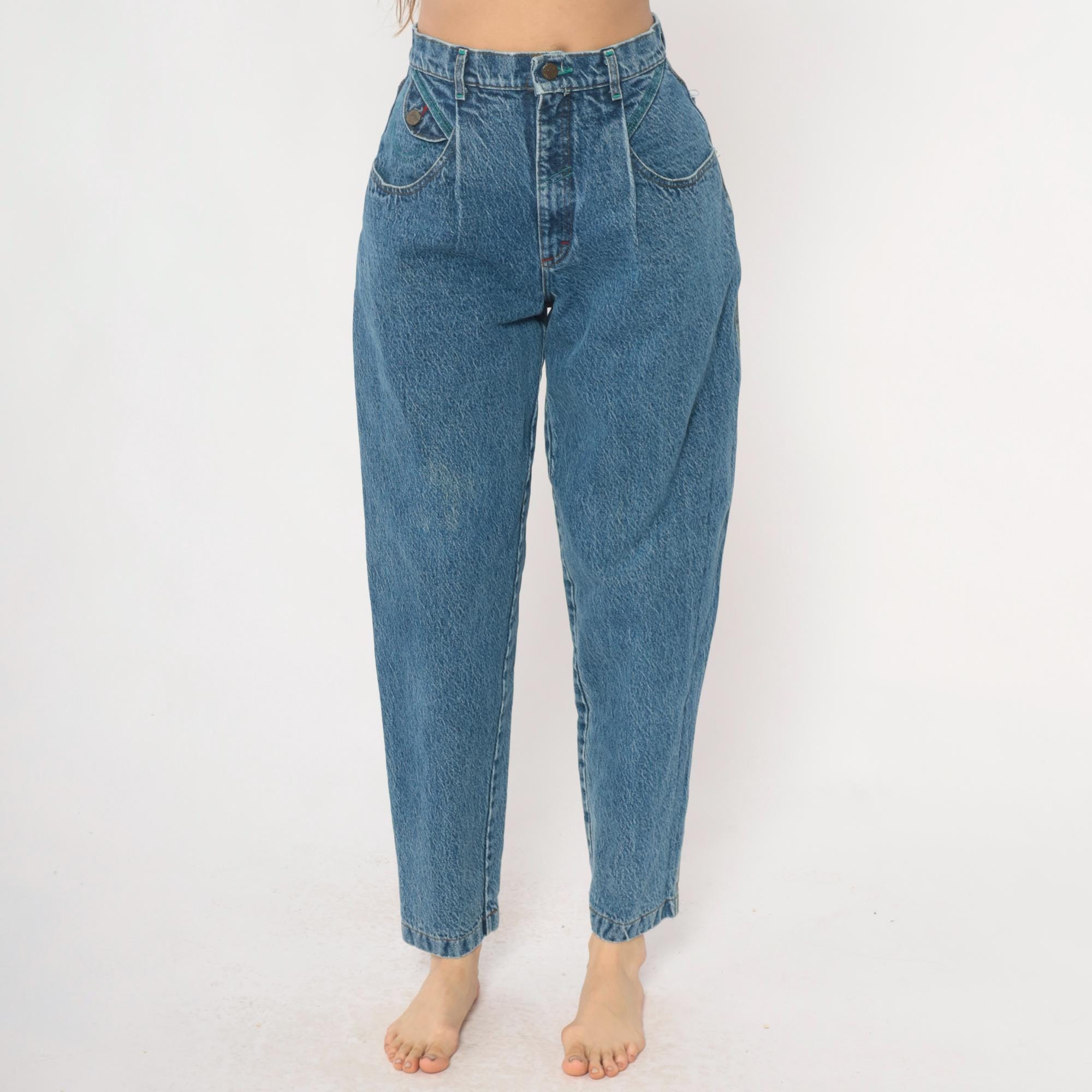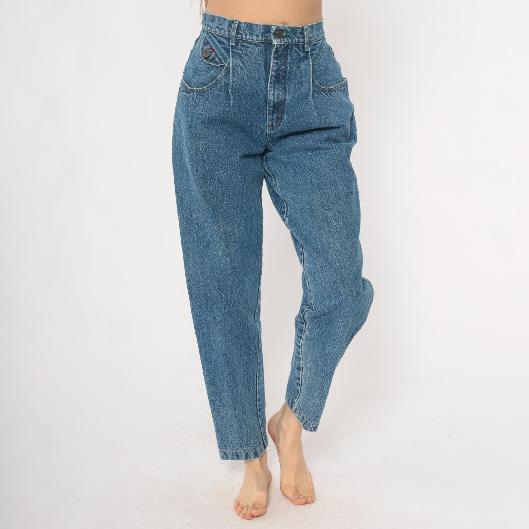 90s high waisted jeans from Lee in medium blue denim with tapered leg. Button fly closure, belt loops, classic five pocket styling, leather Lee brand patch at back waistband.