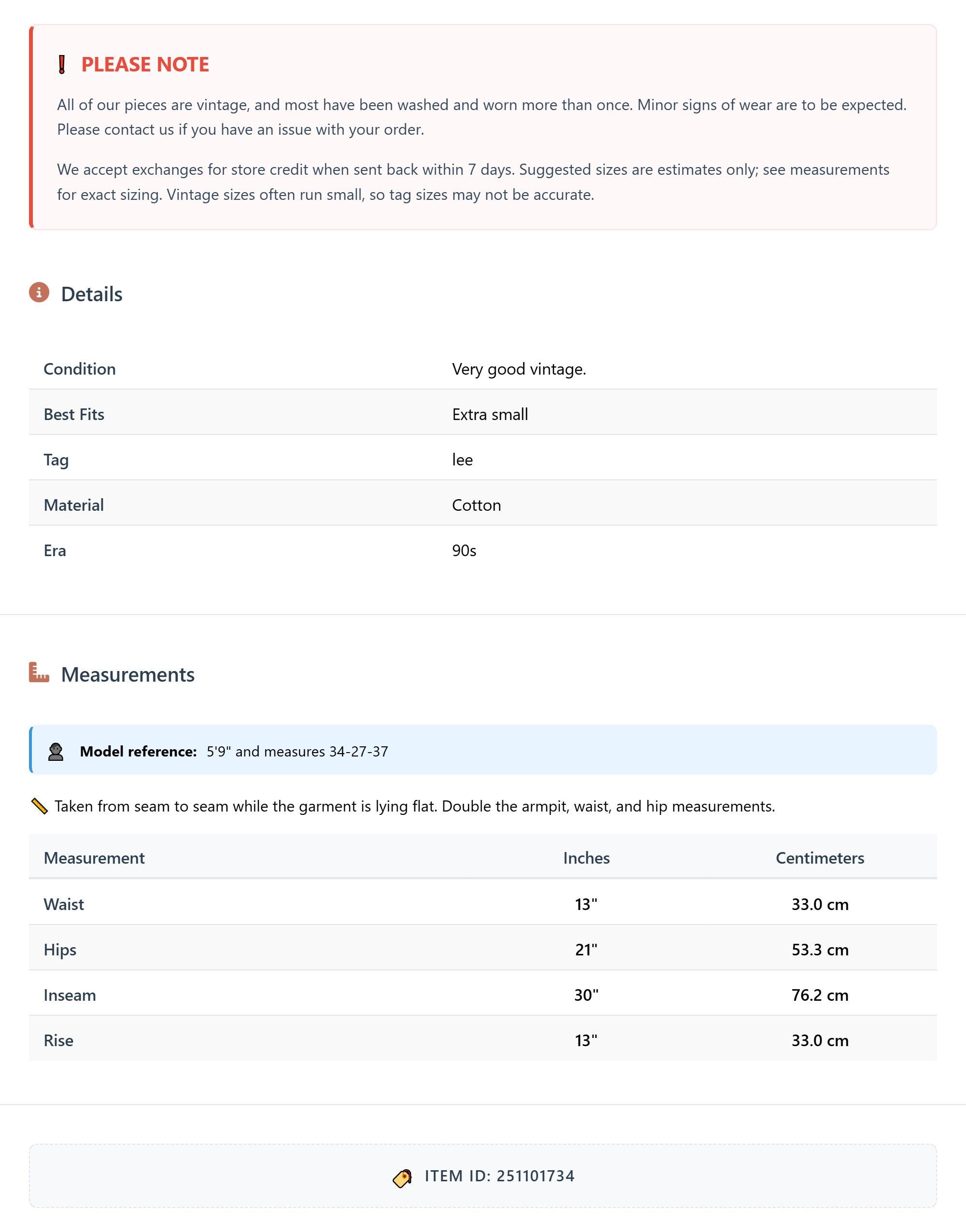 Vintage denim was usually made without any stretch, unlike modern jeans. Check the measurements to ensure proper fit, and remember to give yourself a little wiggle room in the waist and hips, depending on your preferred fit.