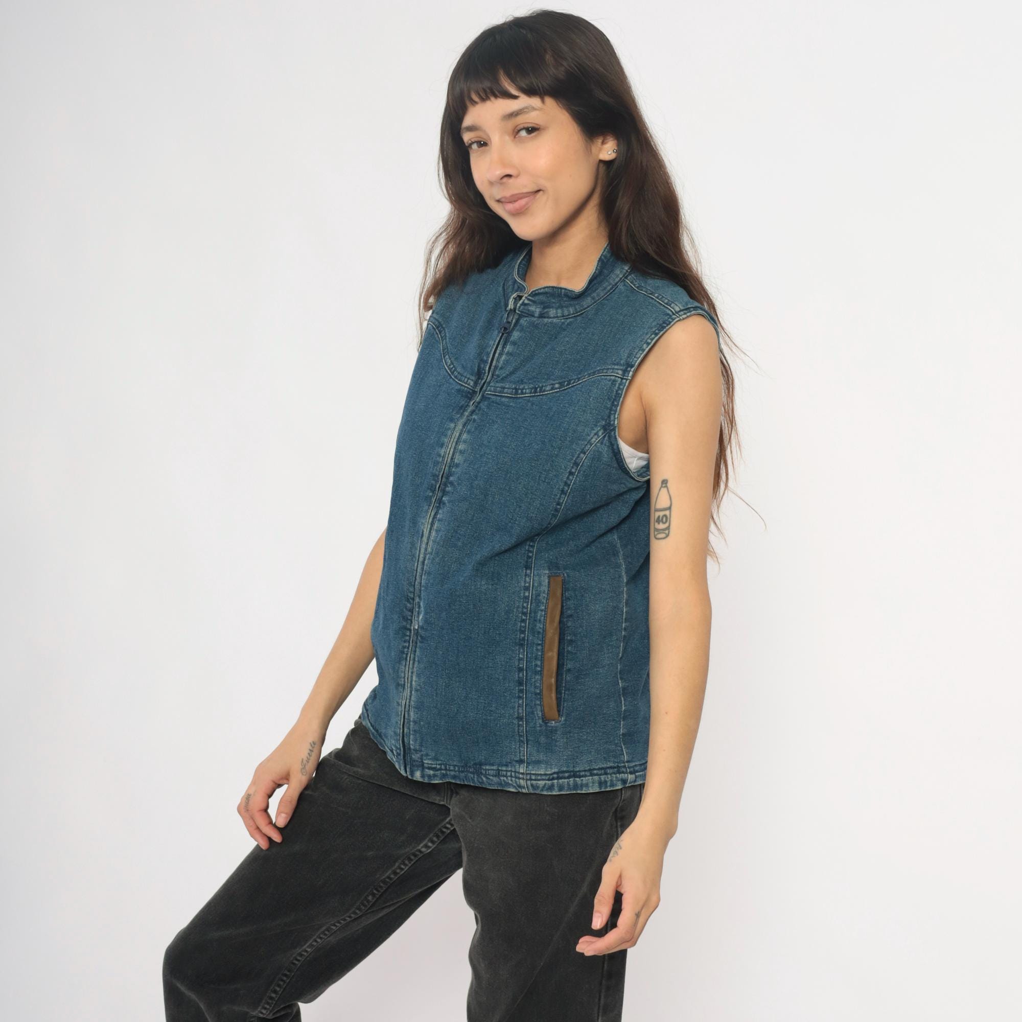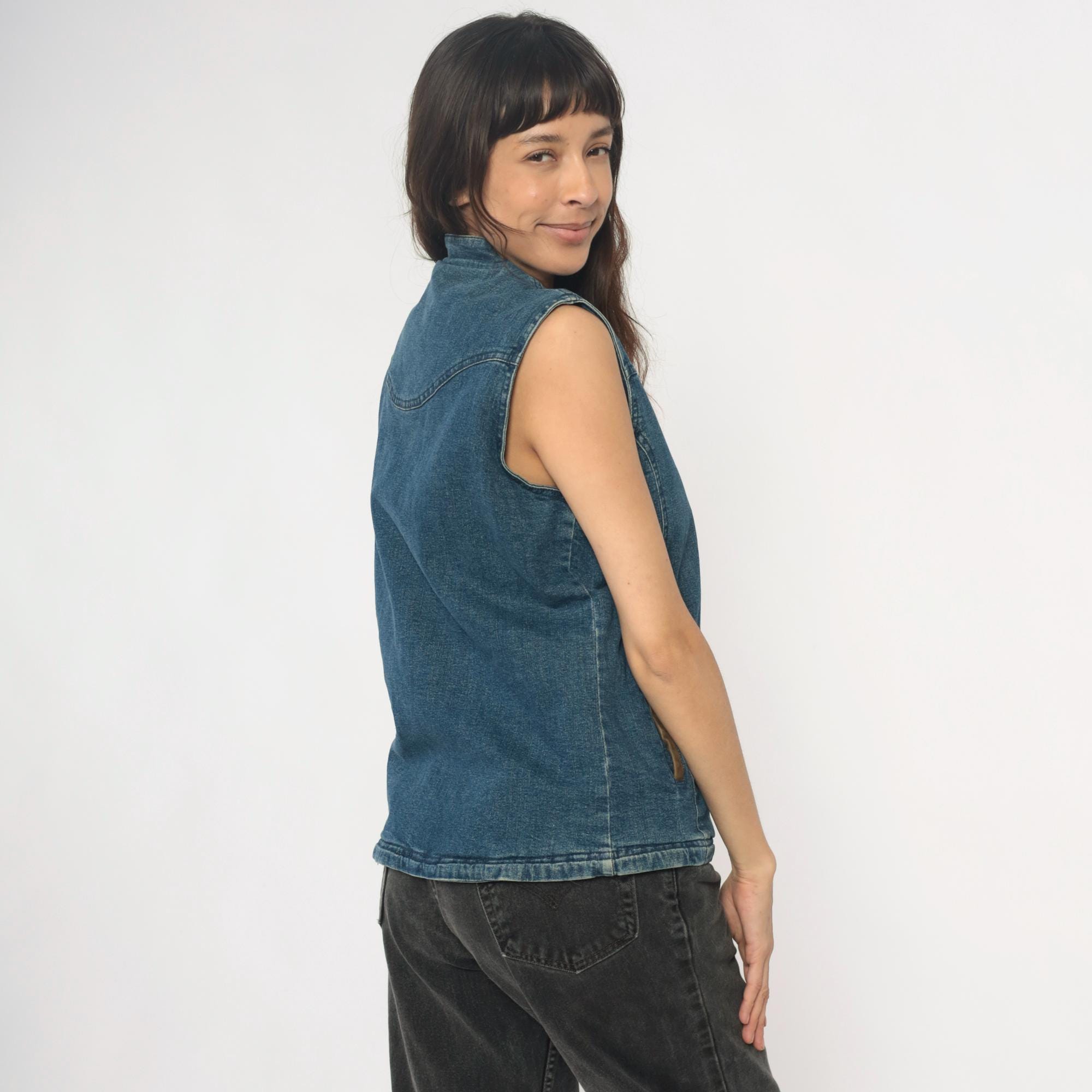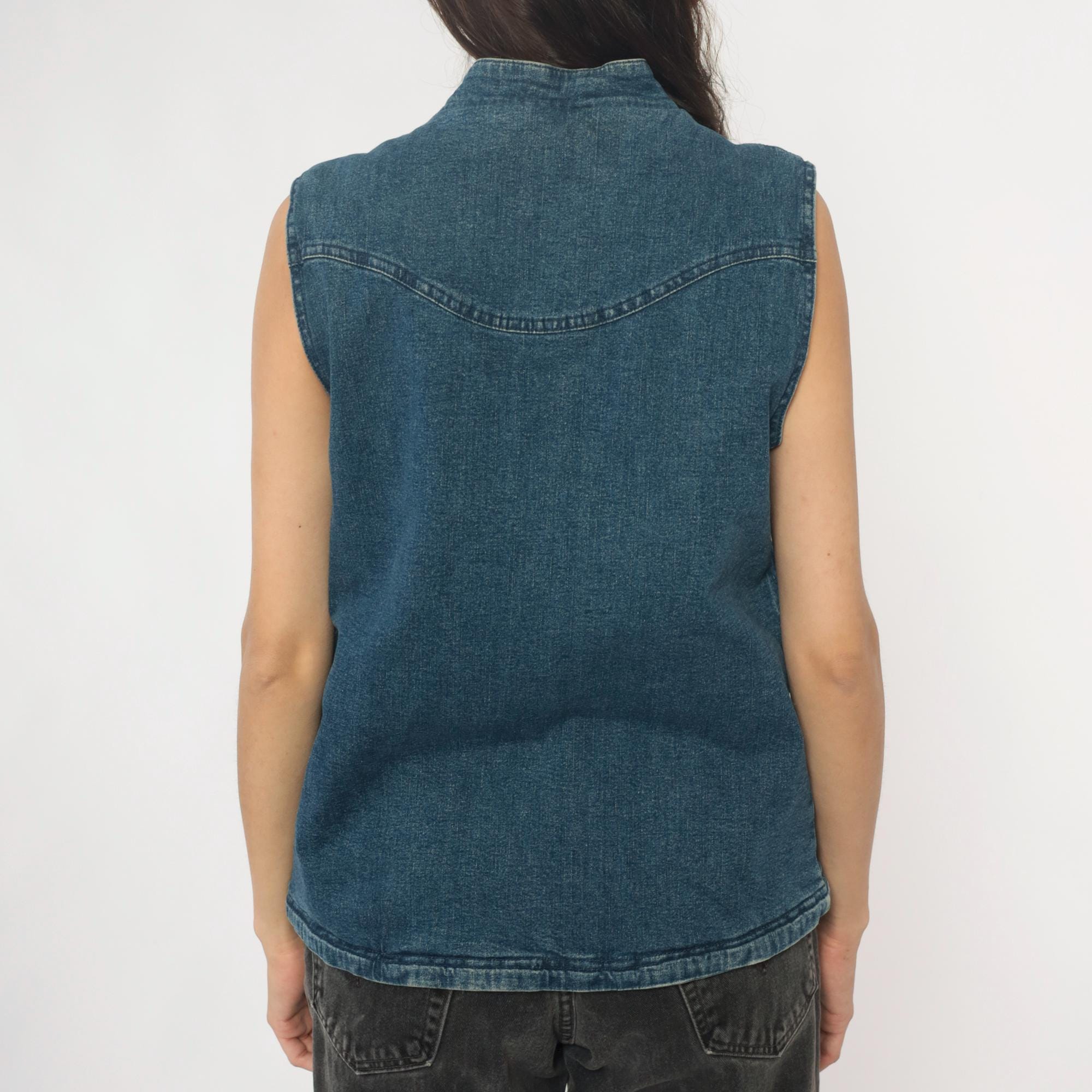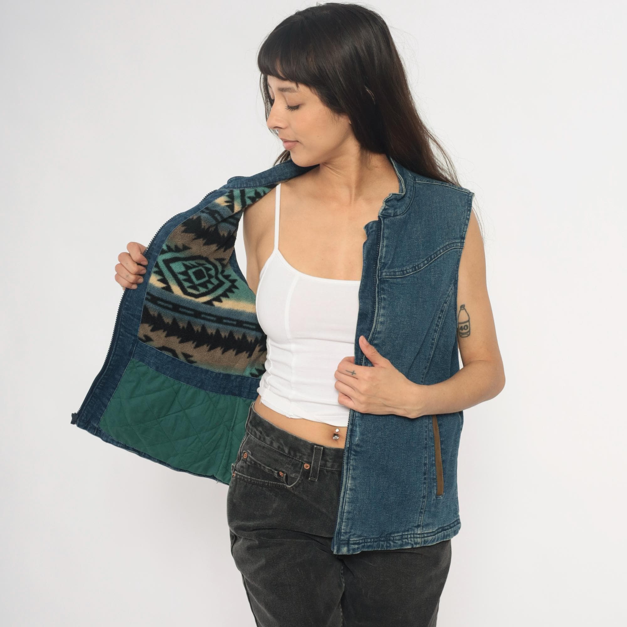 Y2K medium wash denim vest from Cabelas with full front zipper closure and western yoke detail across the back. Interior lined with fleece in southwestern geometric pattern and green quilted side panels.