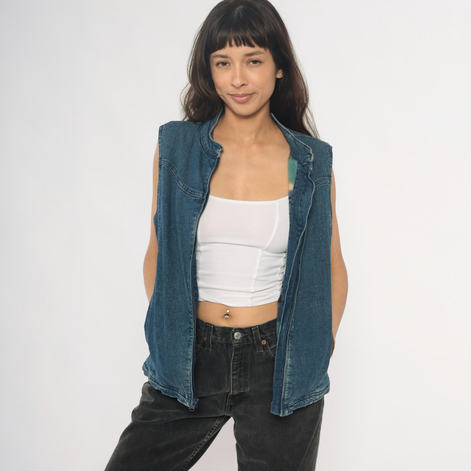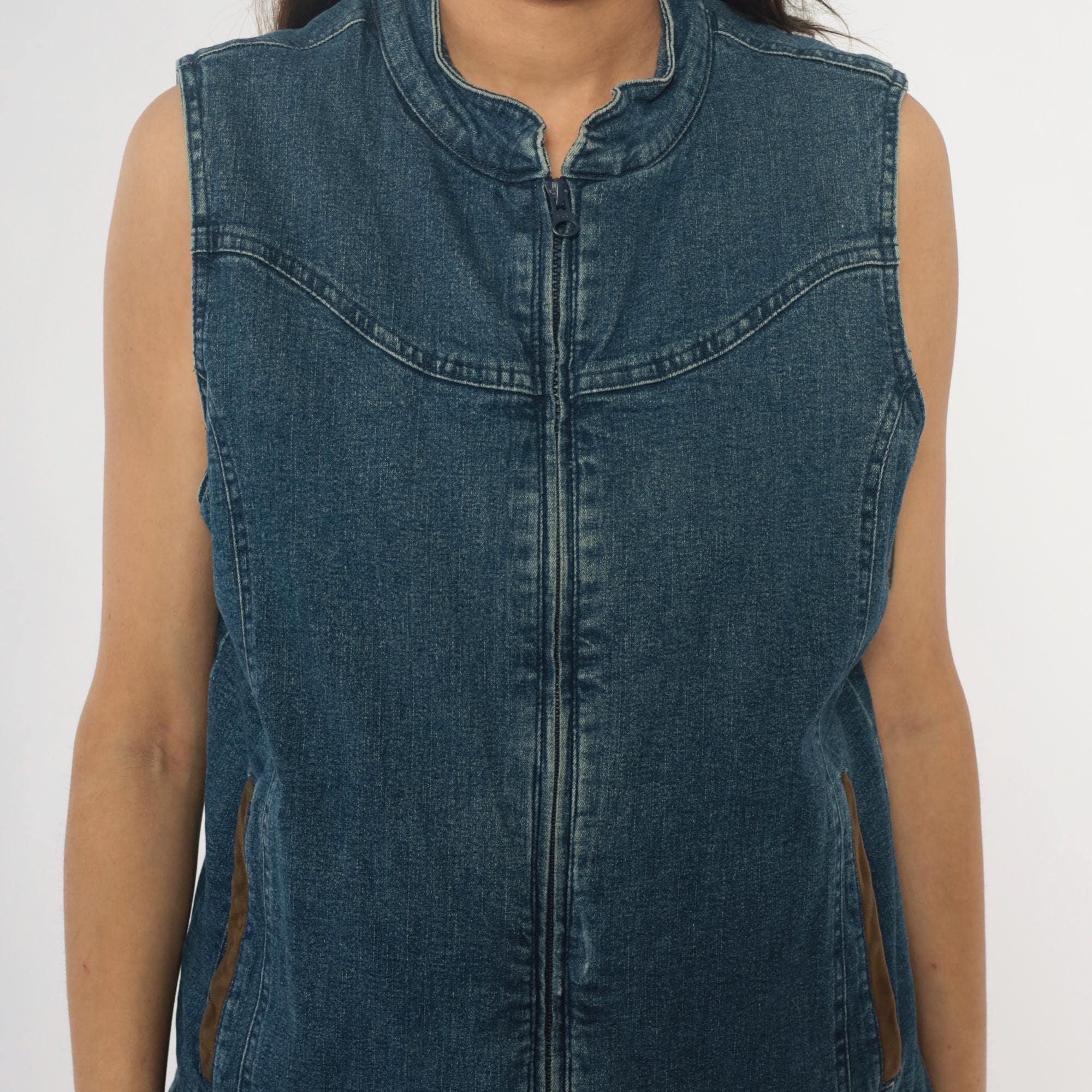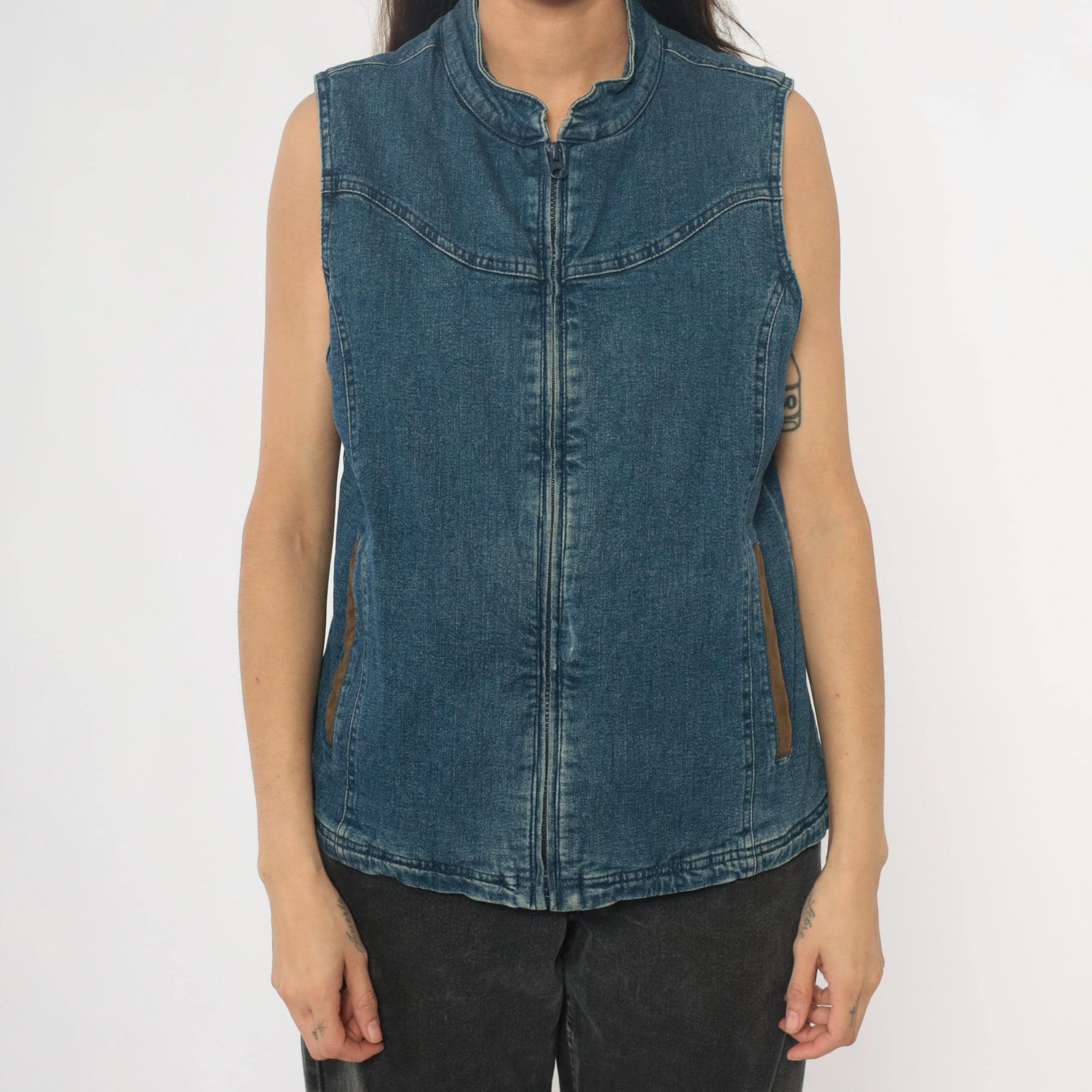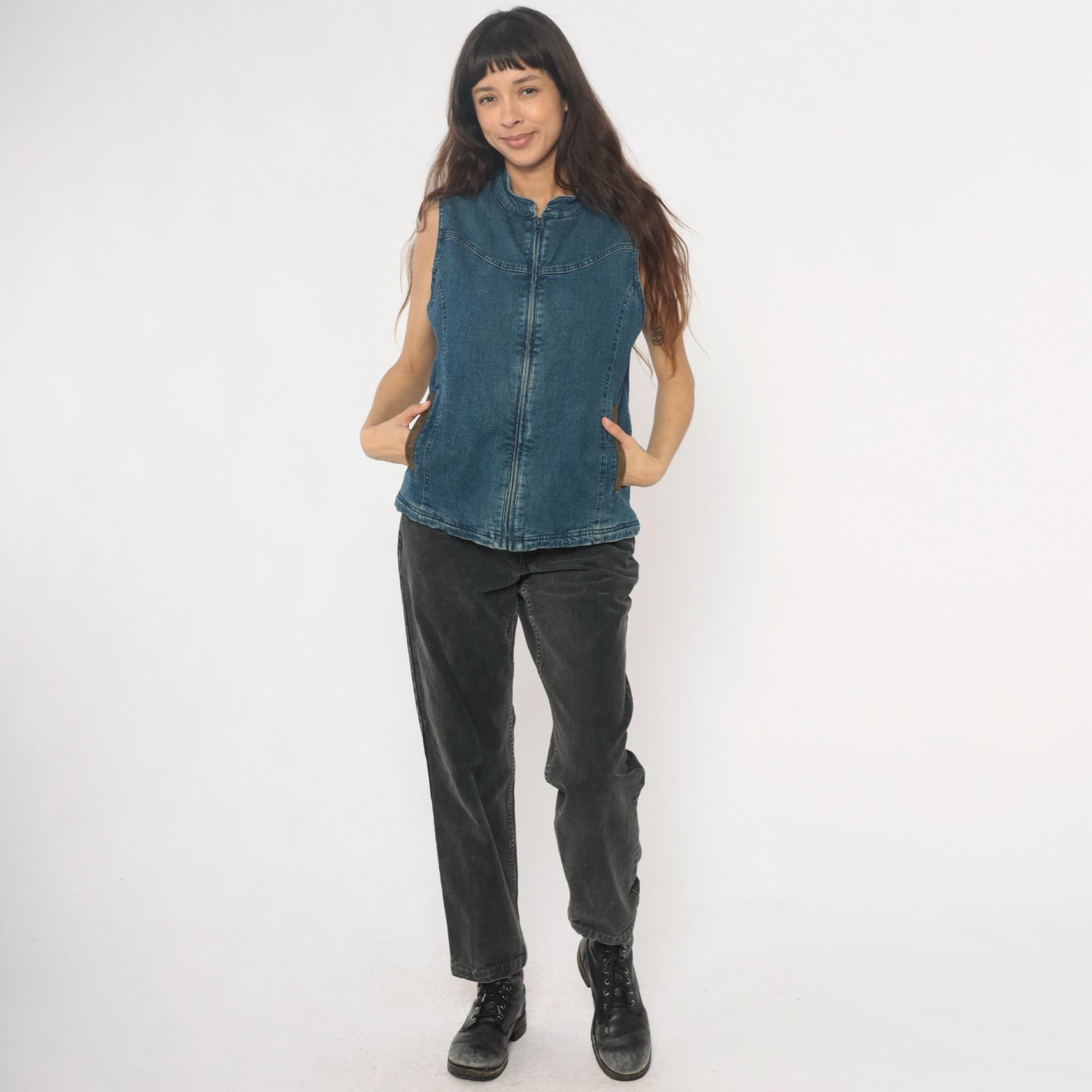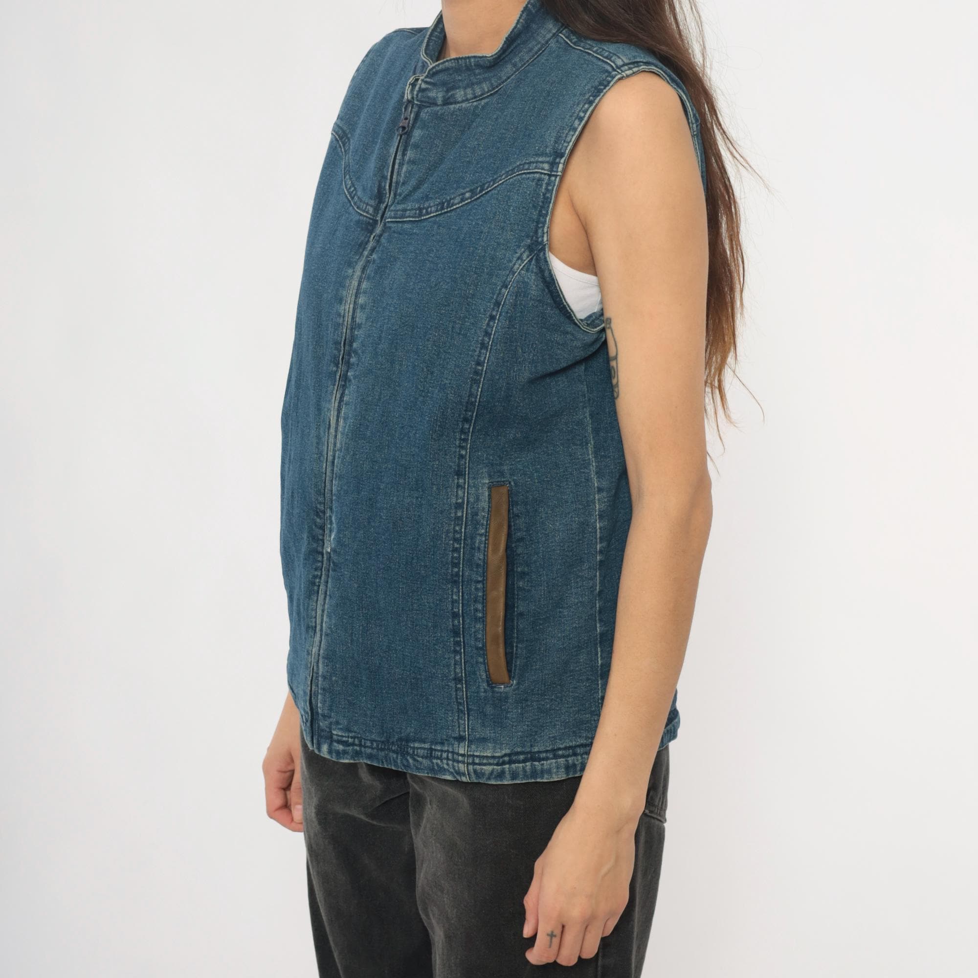 Y2K medium wash denim vest from Cabelas with full front zipper closure and western yoke detail across the back. Interior lined with fleece in southwestern geometric pattern and green quilted side panels.