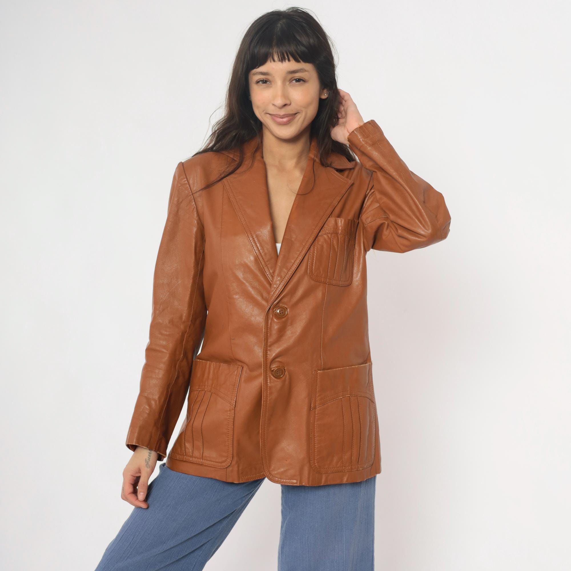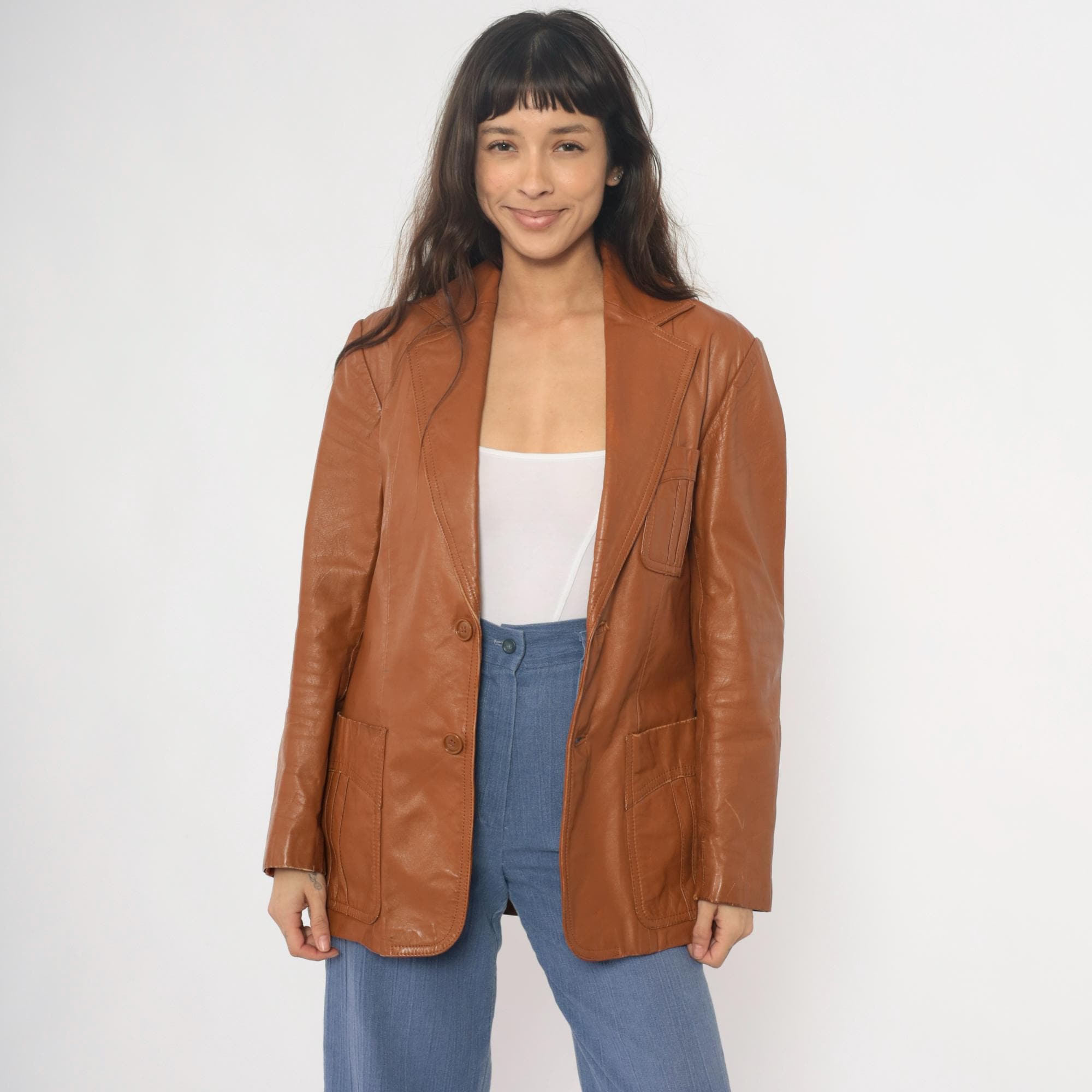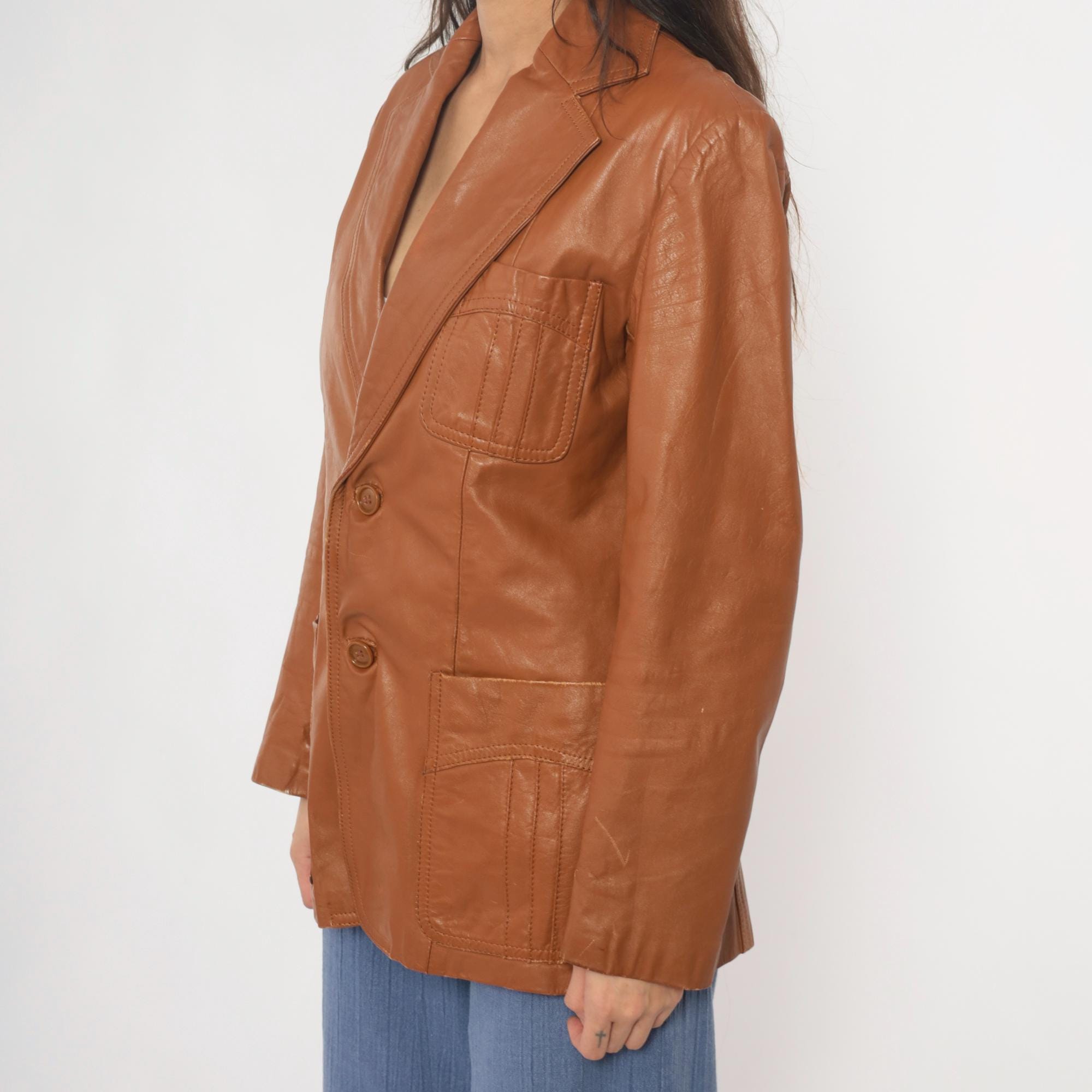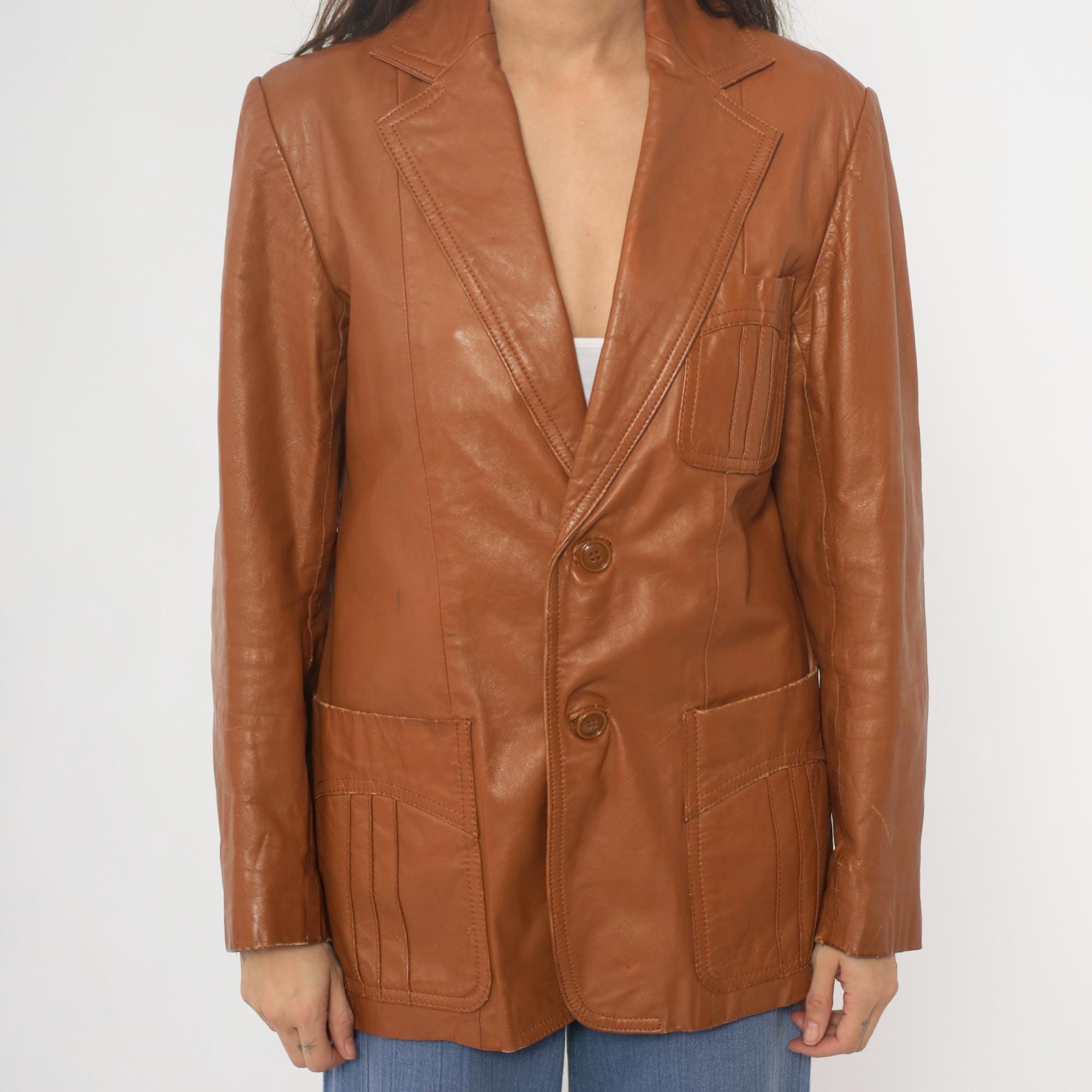 70s tan leather blazer from Leather of Distinction with notched collar, two-button front closure, and four patch pockets with topstitched detailing. Long sleeves with visible topstitching throughout seams and edges.