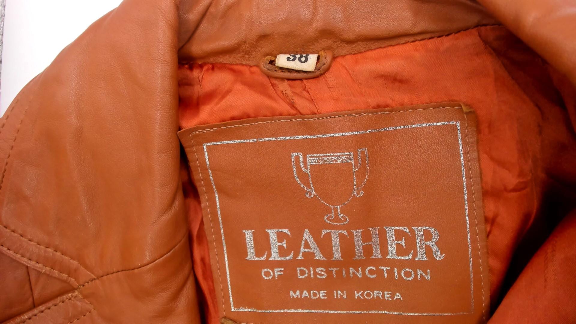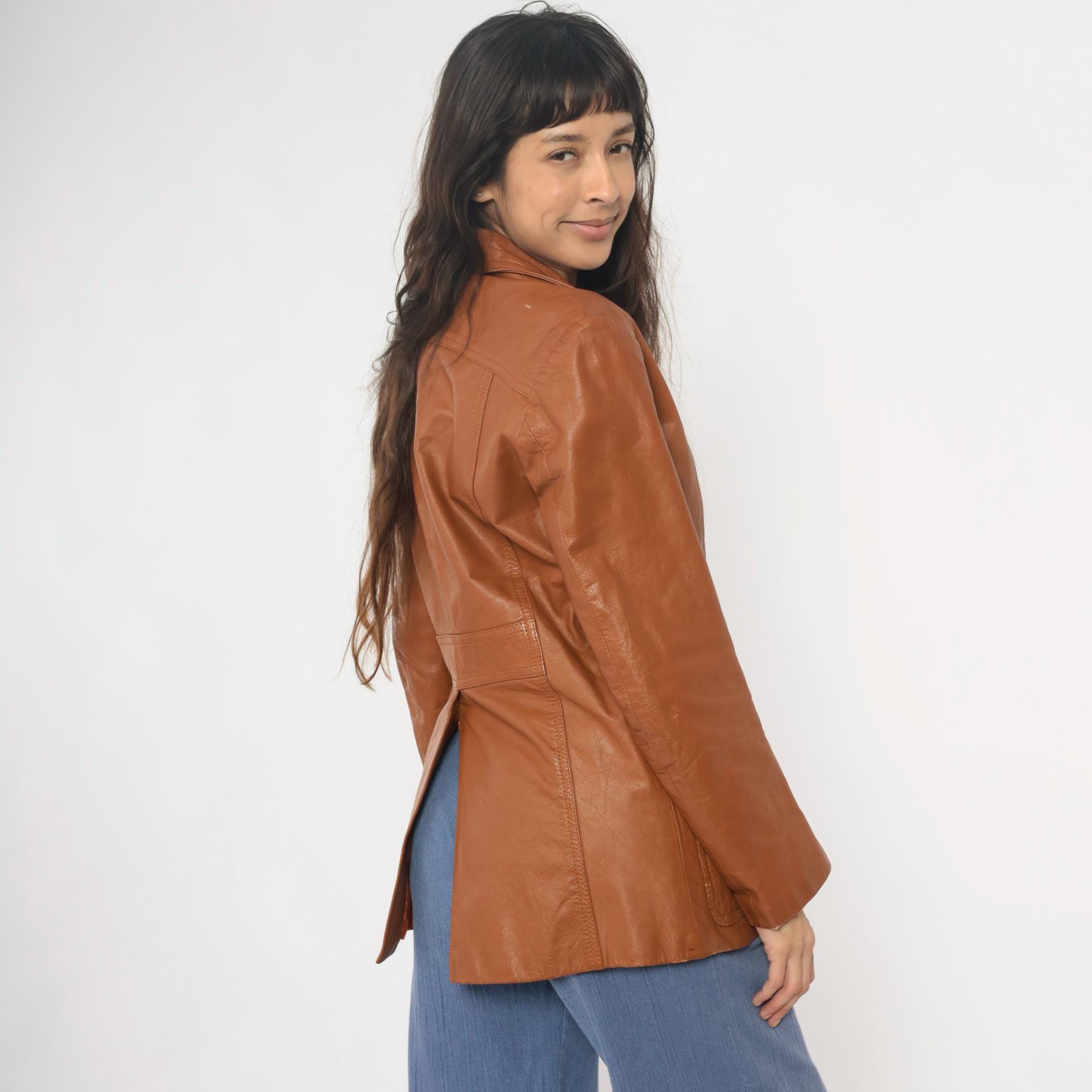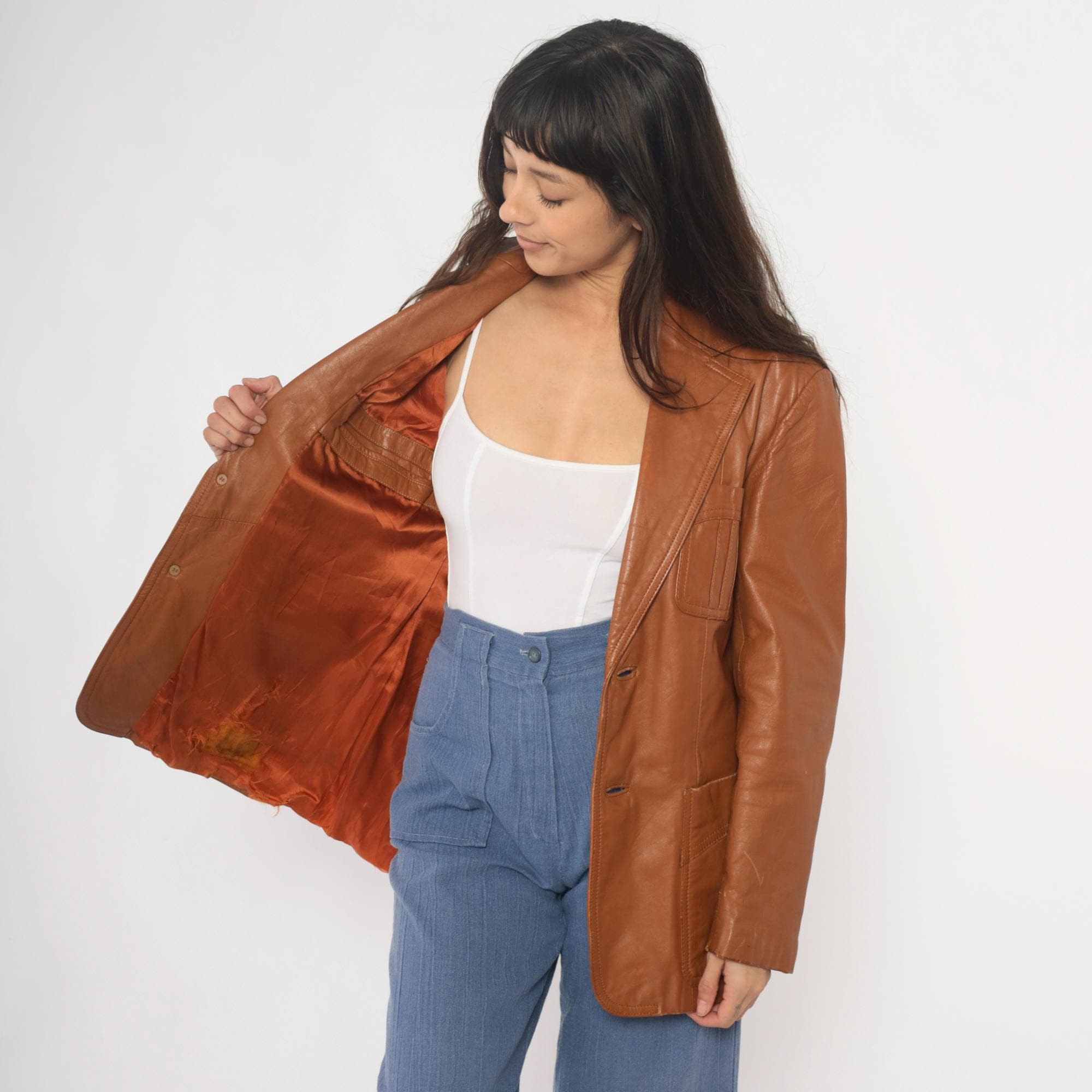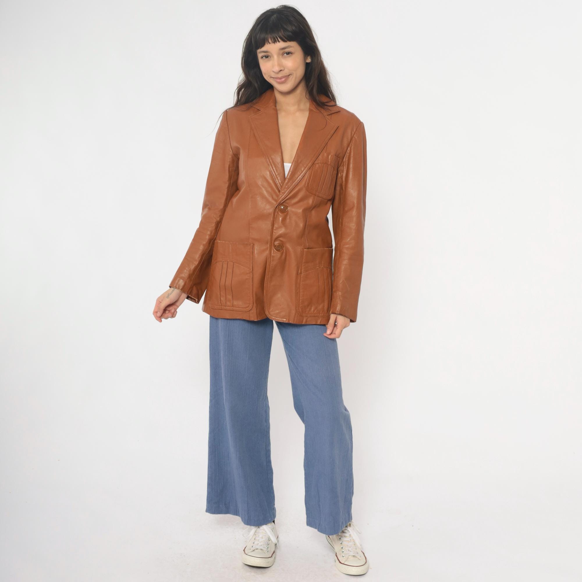 70s tan leather blazer from Leather of Distinction with notched collar, two-button front closure, and four patch pockets with topstitched detailing. Long sleeves with visible topstitching throughout seams and edges.