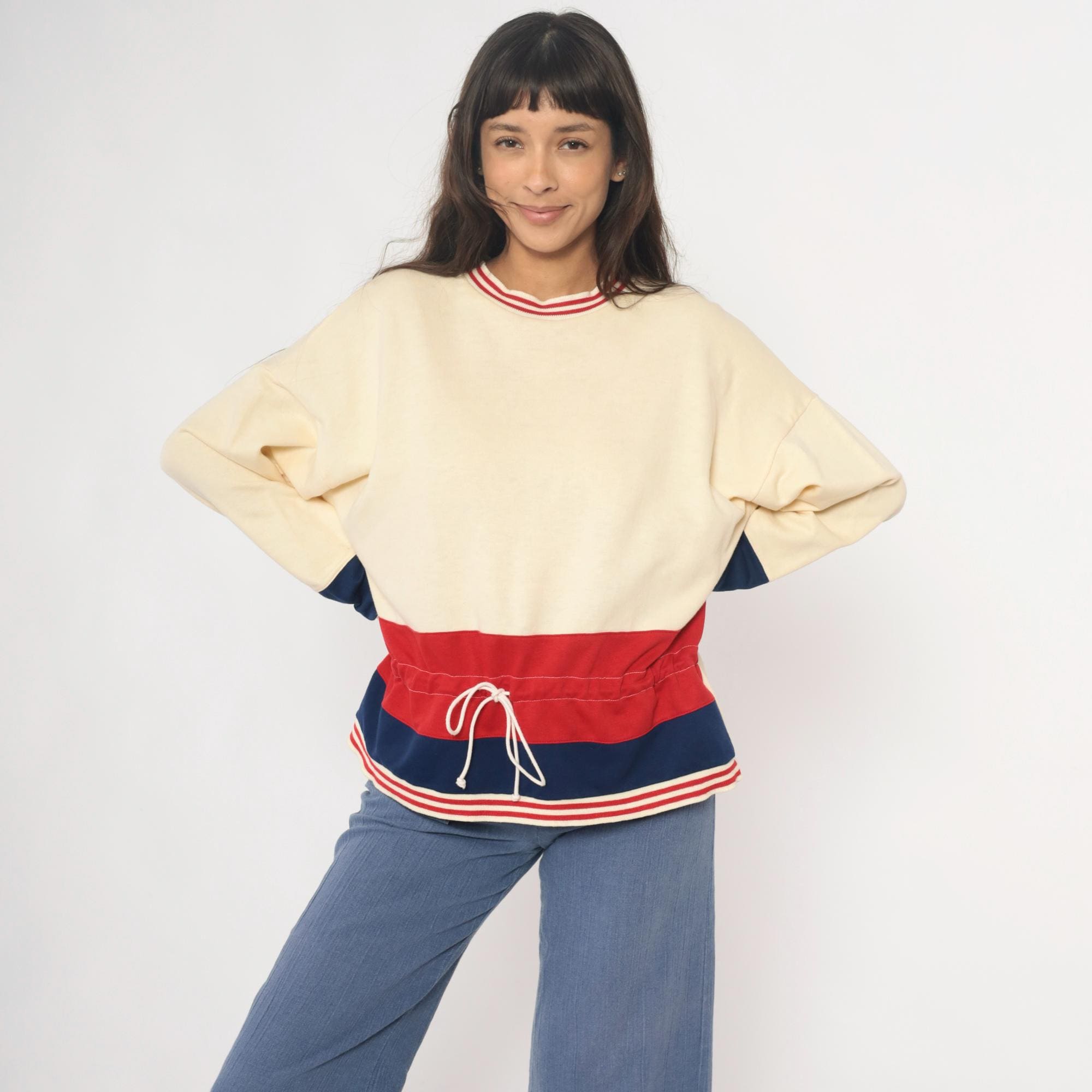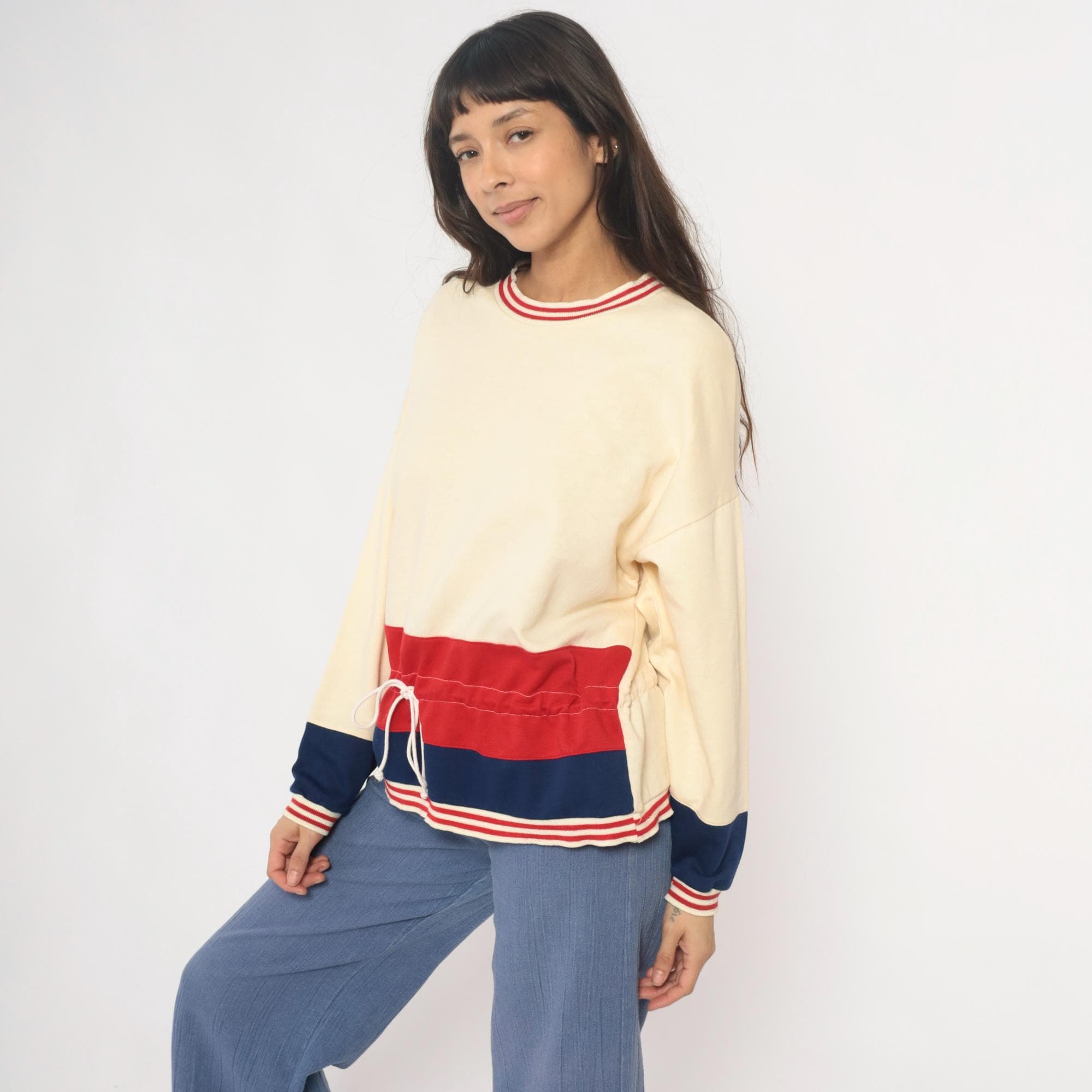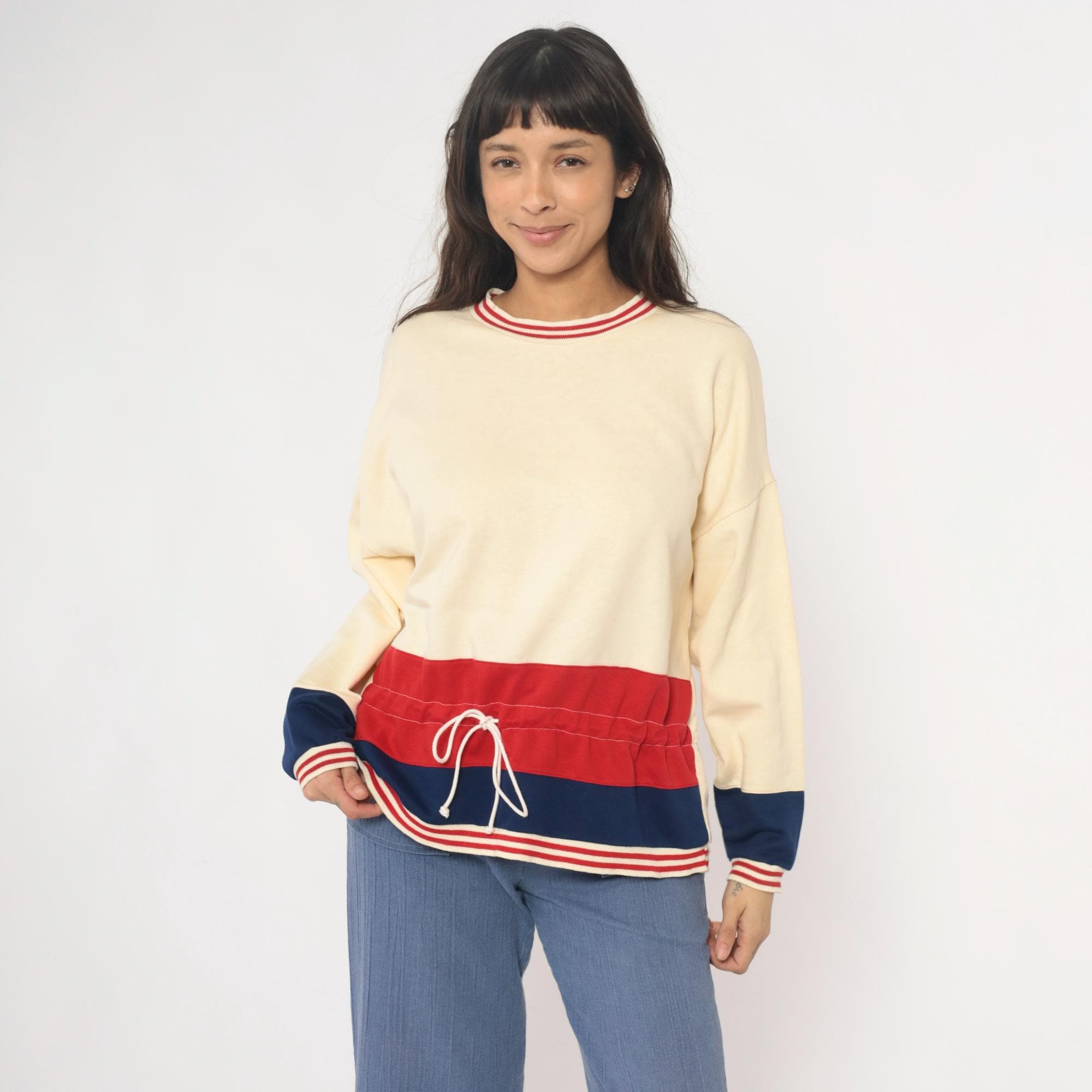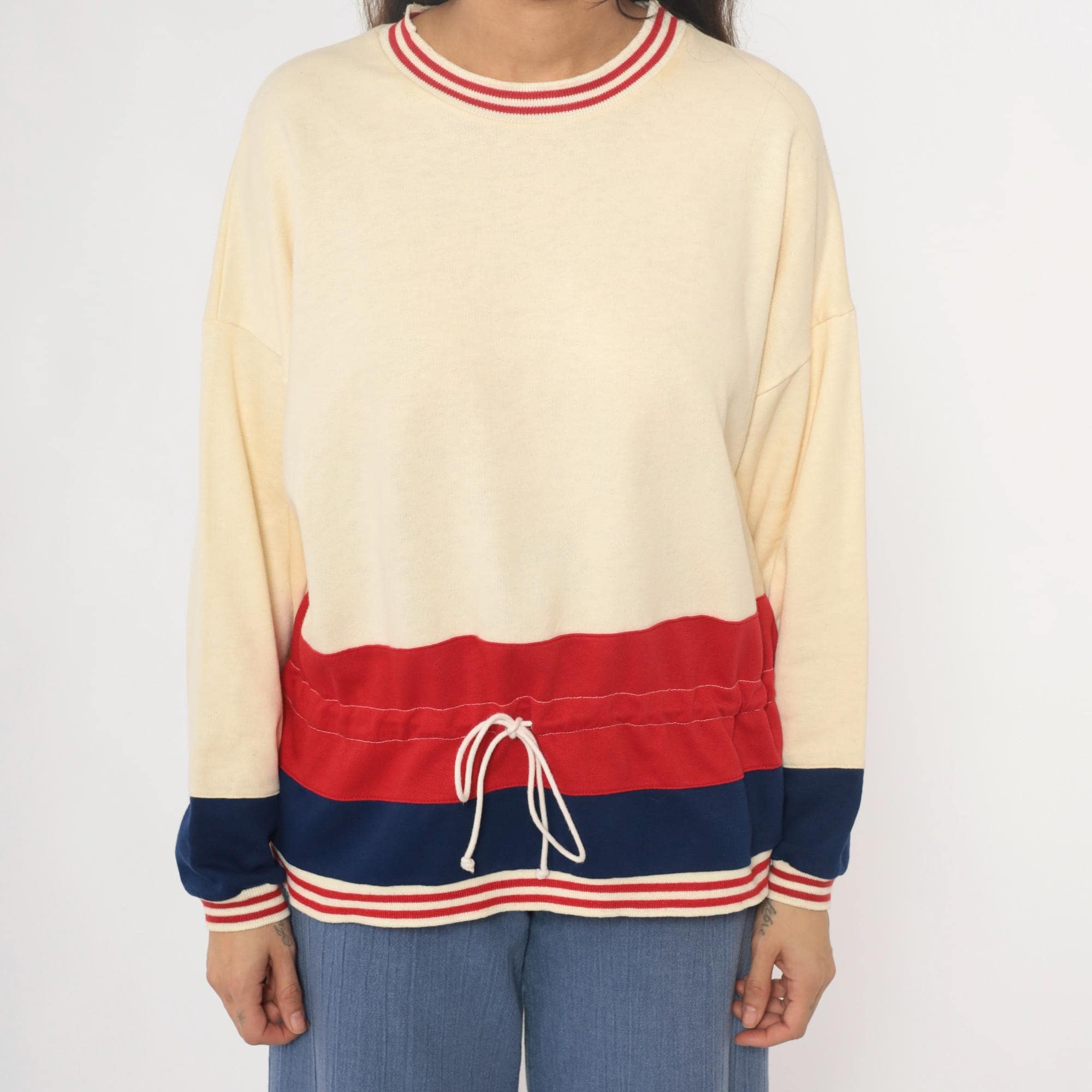 80s color block sweatshirt from Sears Bold Spirit in cream, red, and navy. Red and white striped ribbing at neckline, cuffs, and hem, with navy blue accents at sleeve cuffs and lower hem band. Drawstring detail at red middle band.