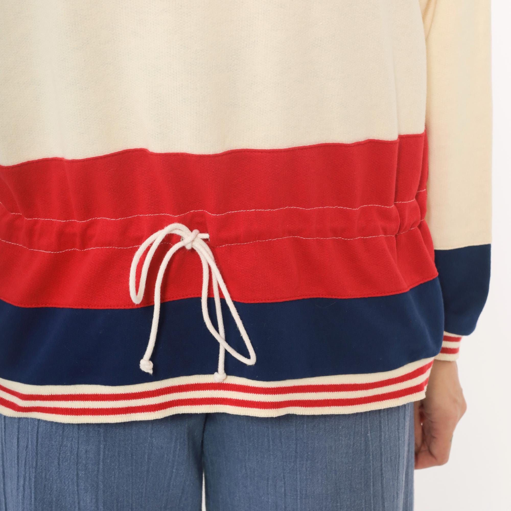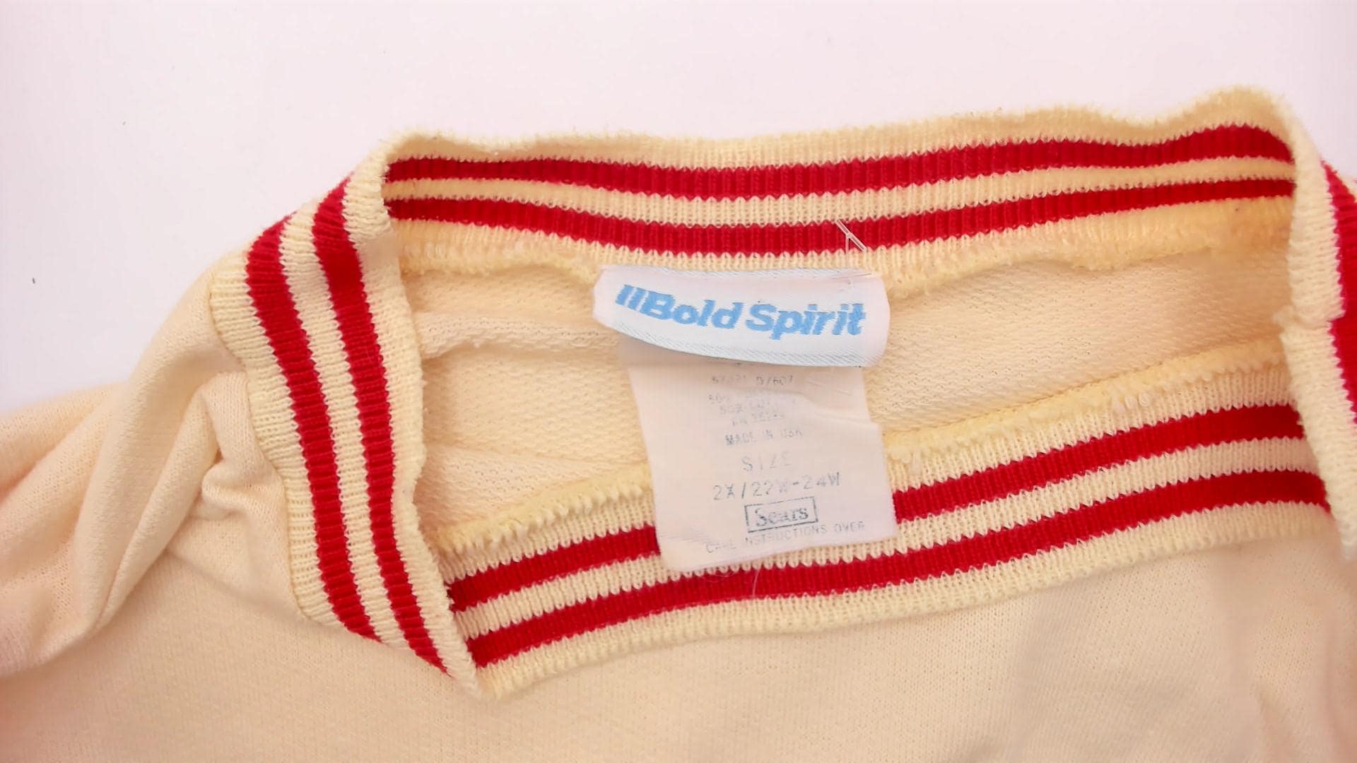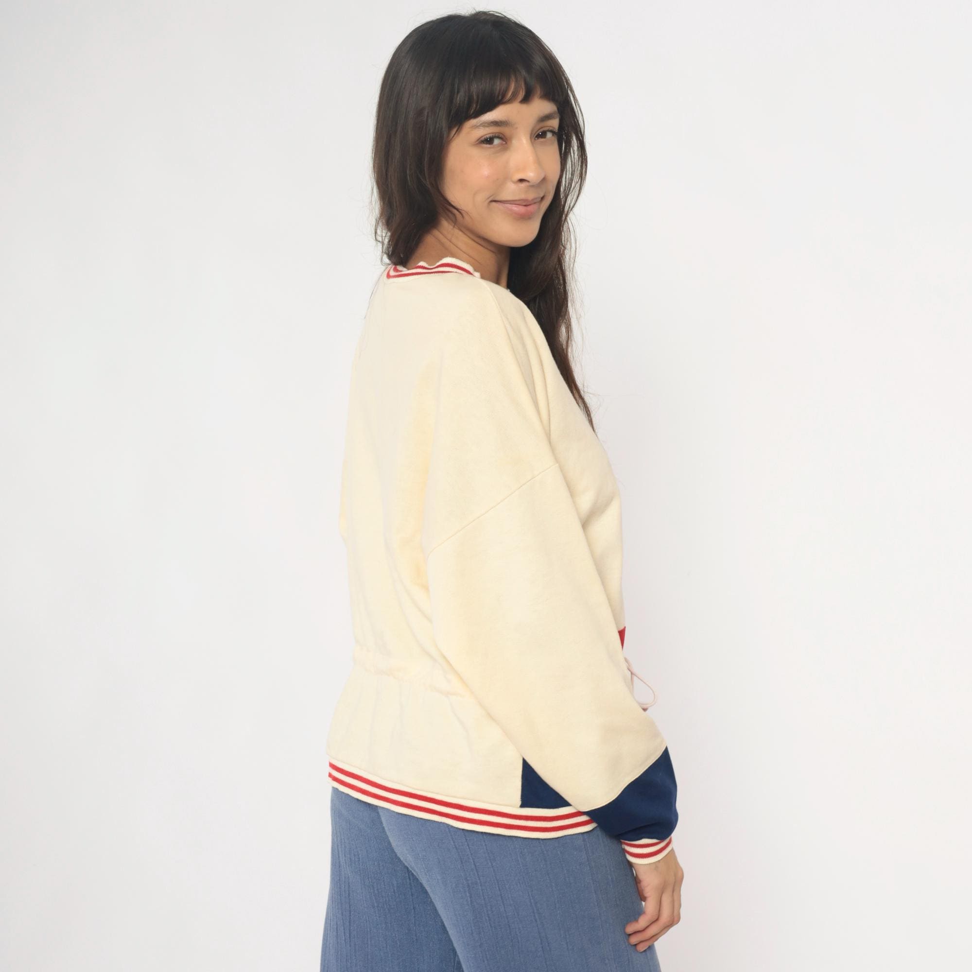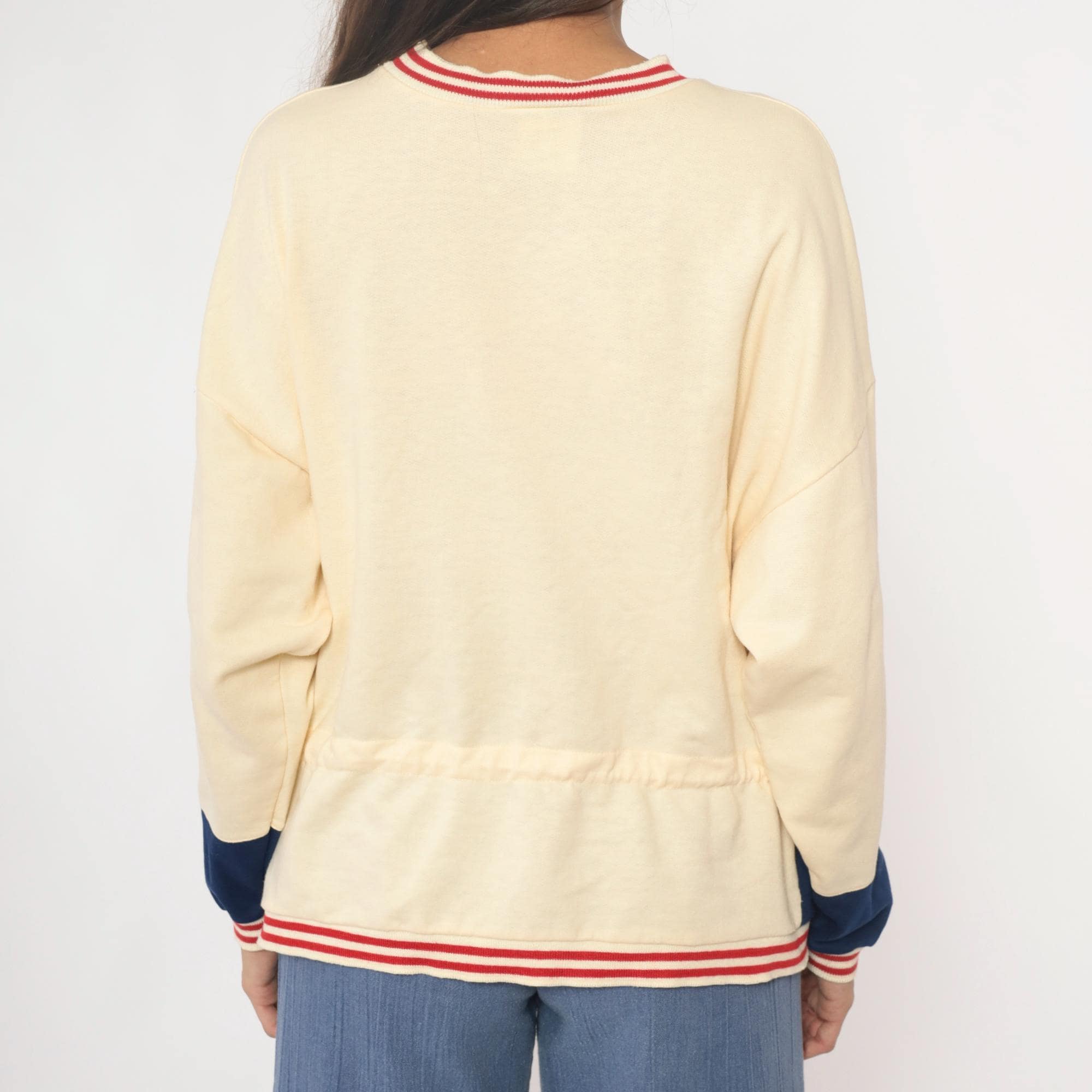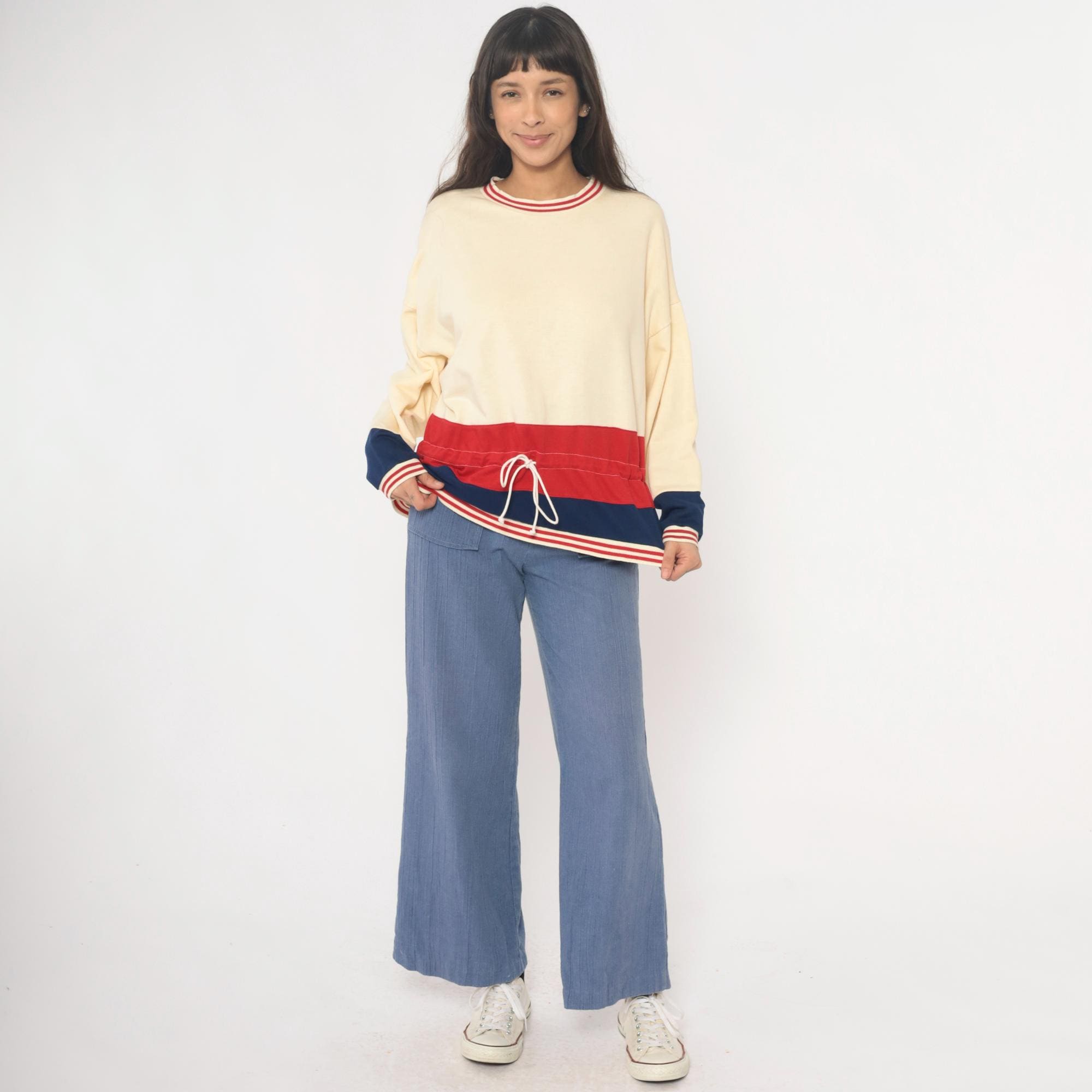 80s color block sweatshirt from Sears Bold Spirit in cream, red, and navy. Red and white striped ribbing at neckline, cuffs, and hem, with navy blue accents at sleeve cuffs and lower hem band. Drawstring detail at red middle band.