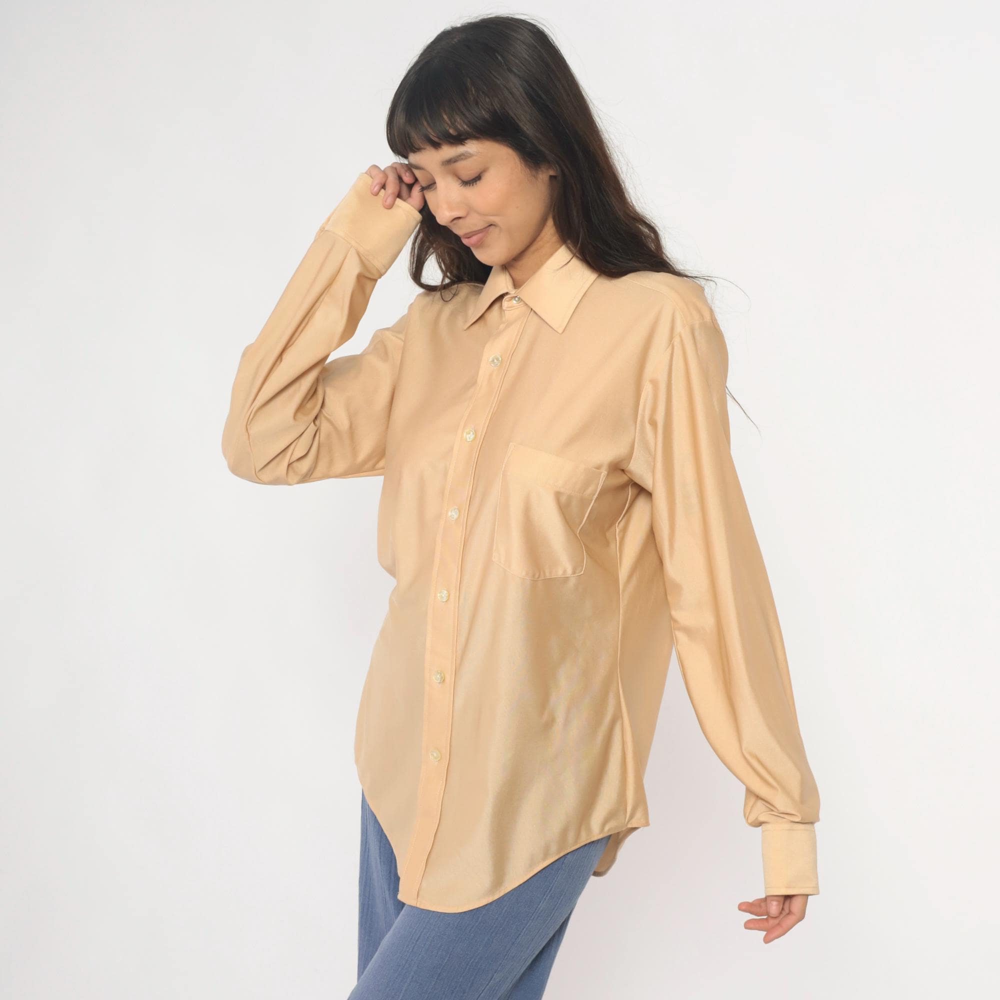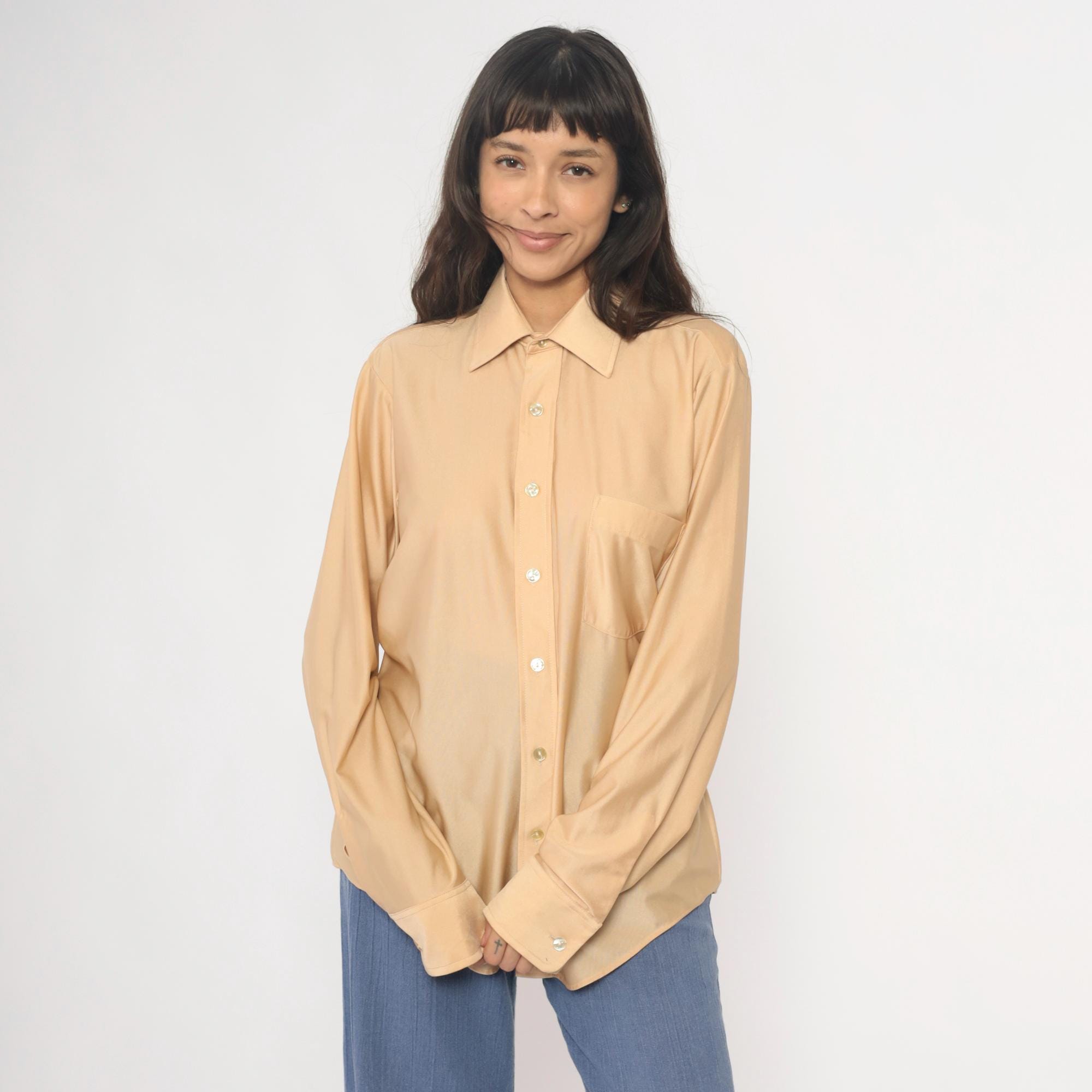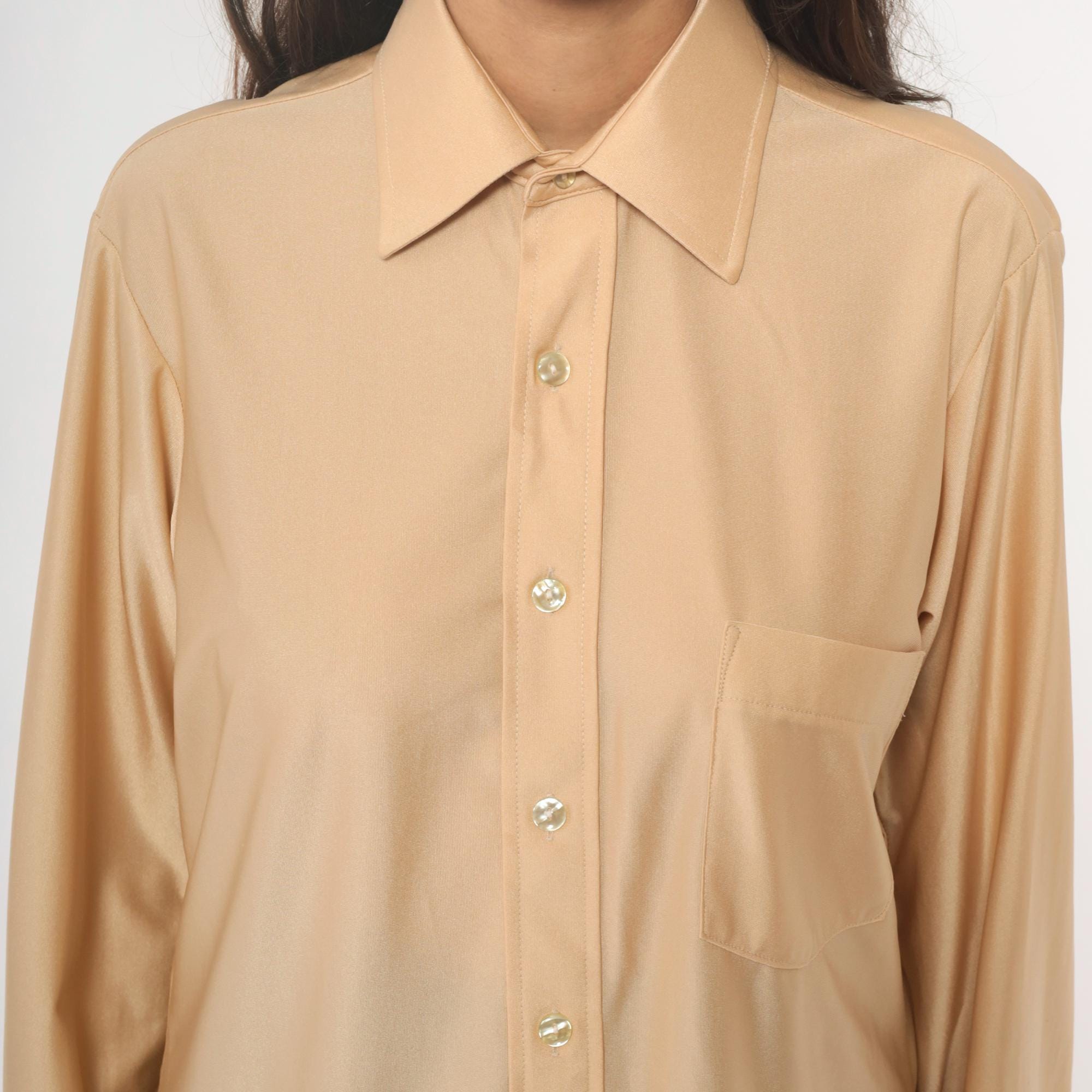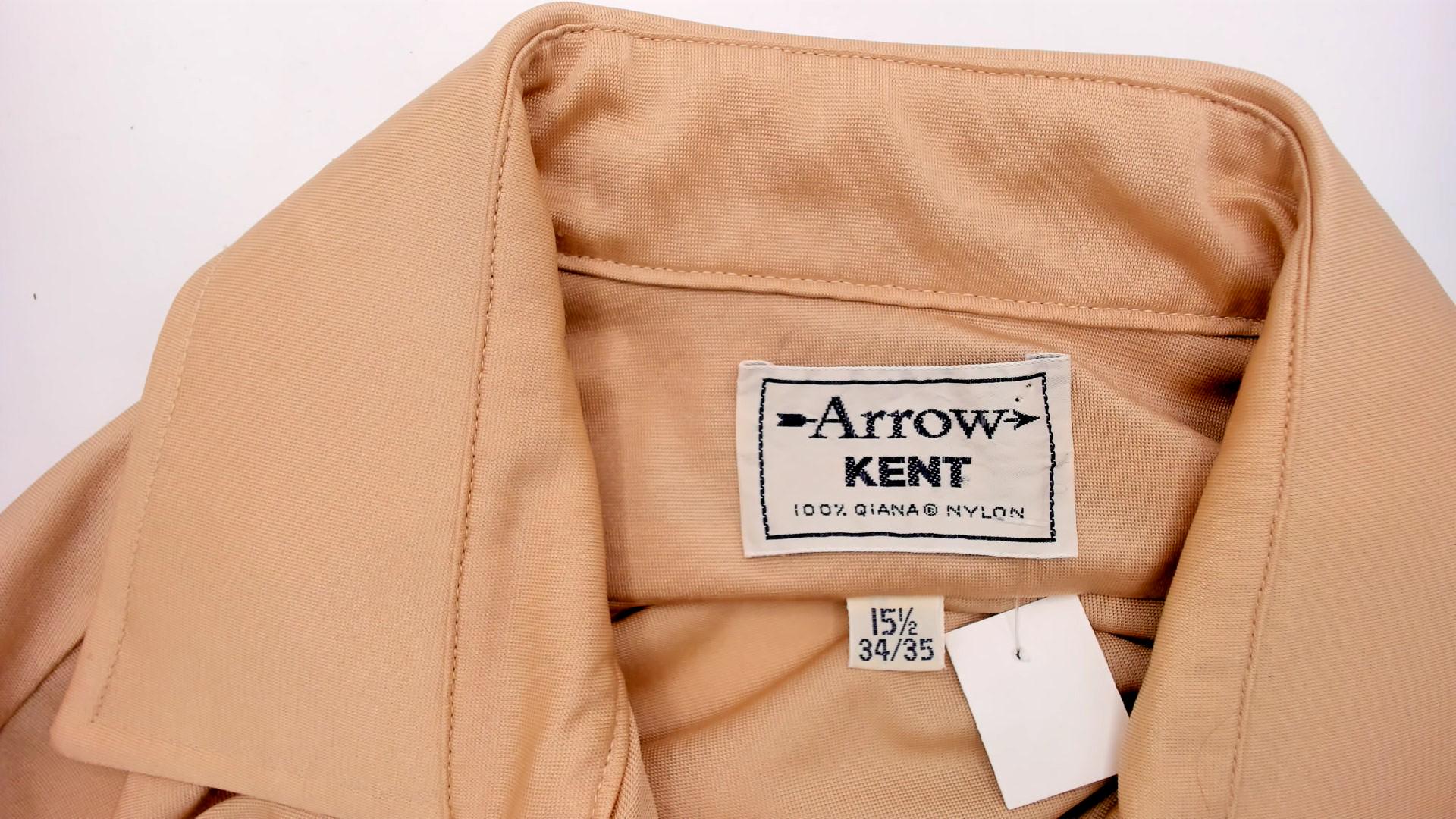 70s pale butter nylon shirt from Arrow Kent with pointed collar and button front closure. Long sleeves with button cuffs, single chest pocket, relaxed fit.