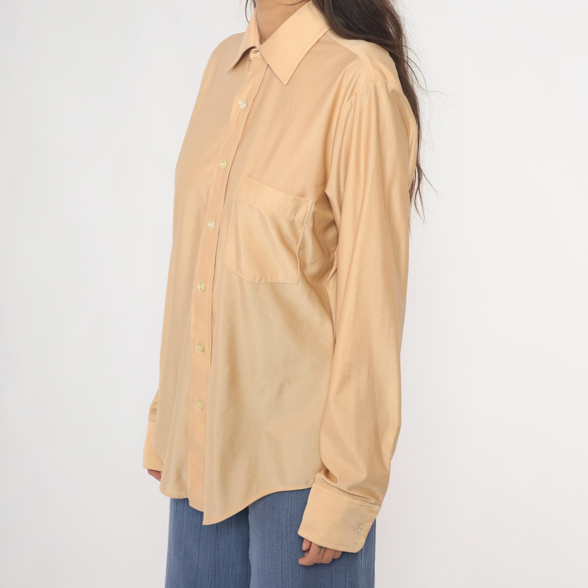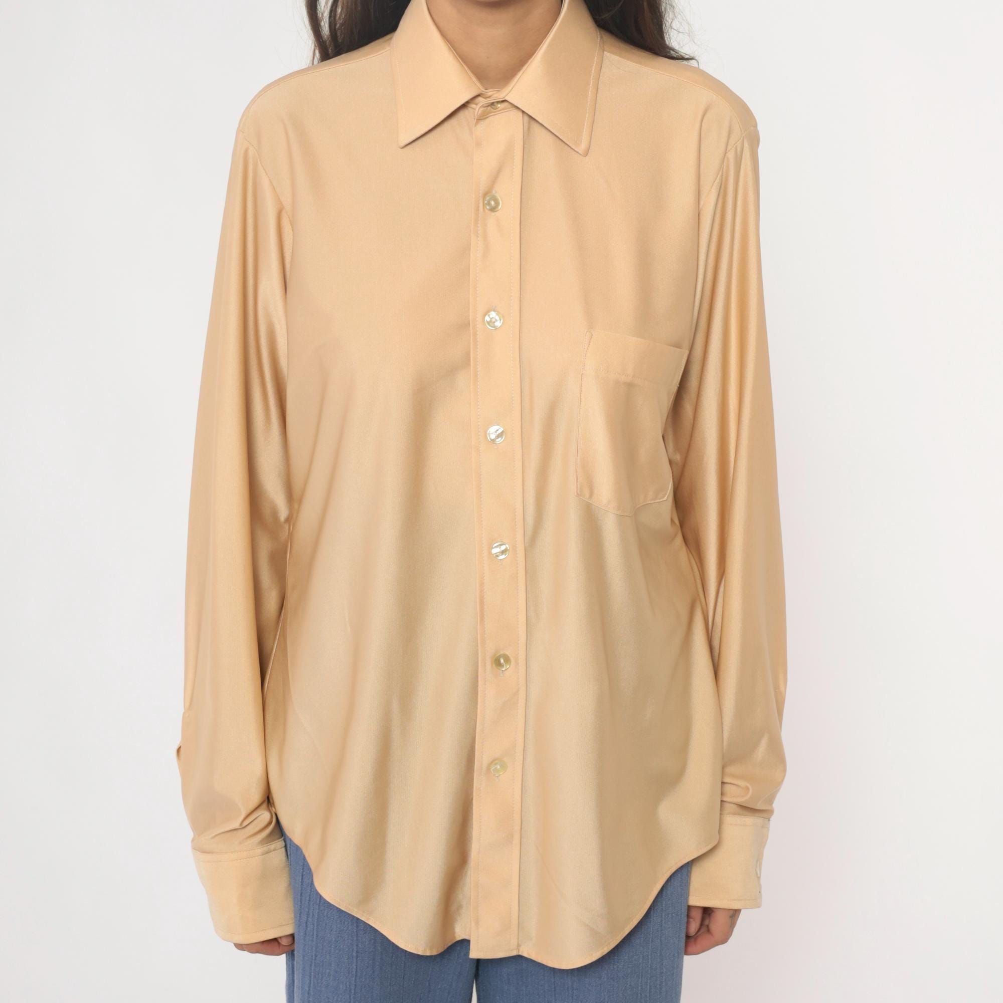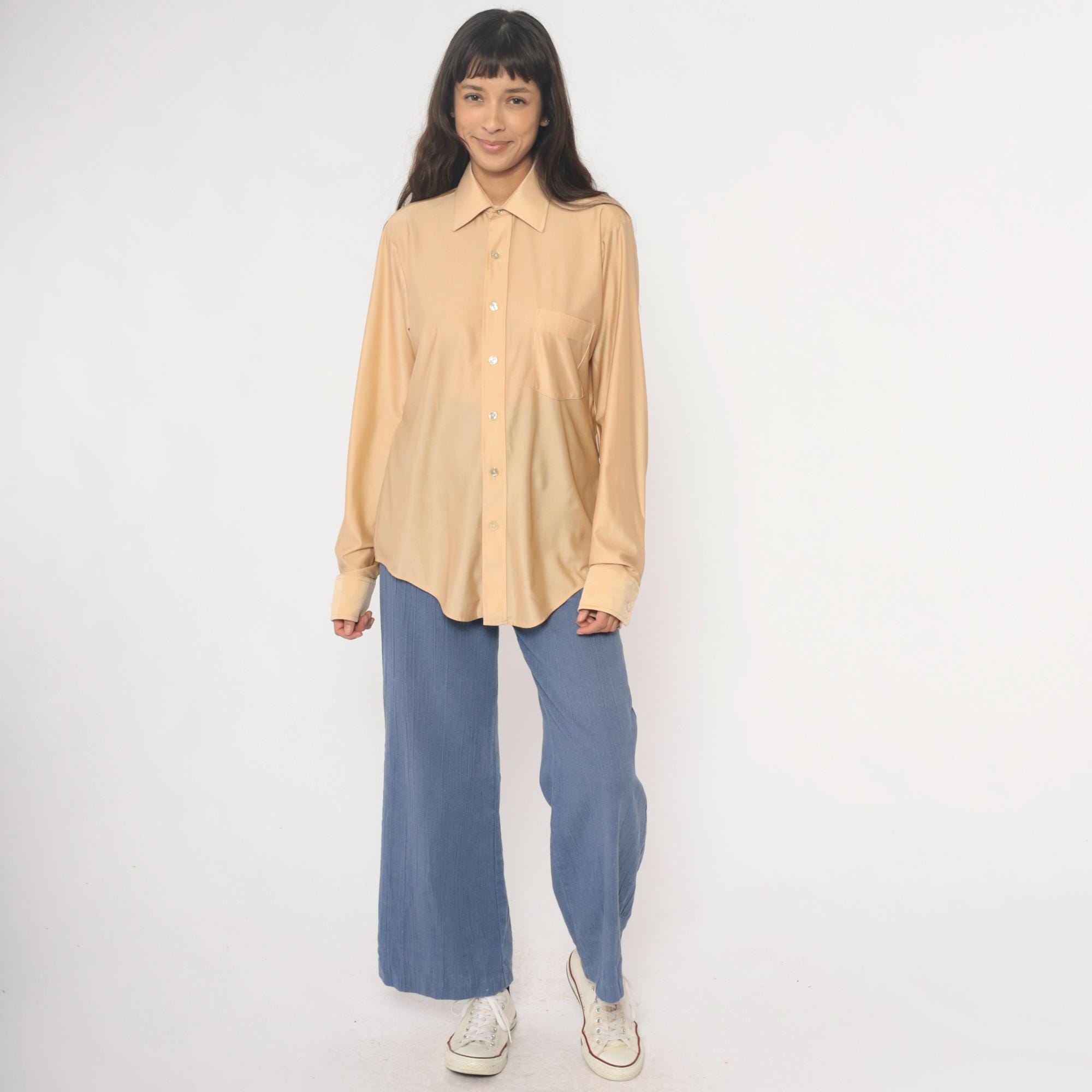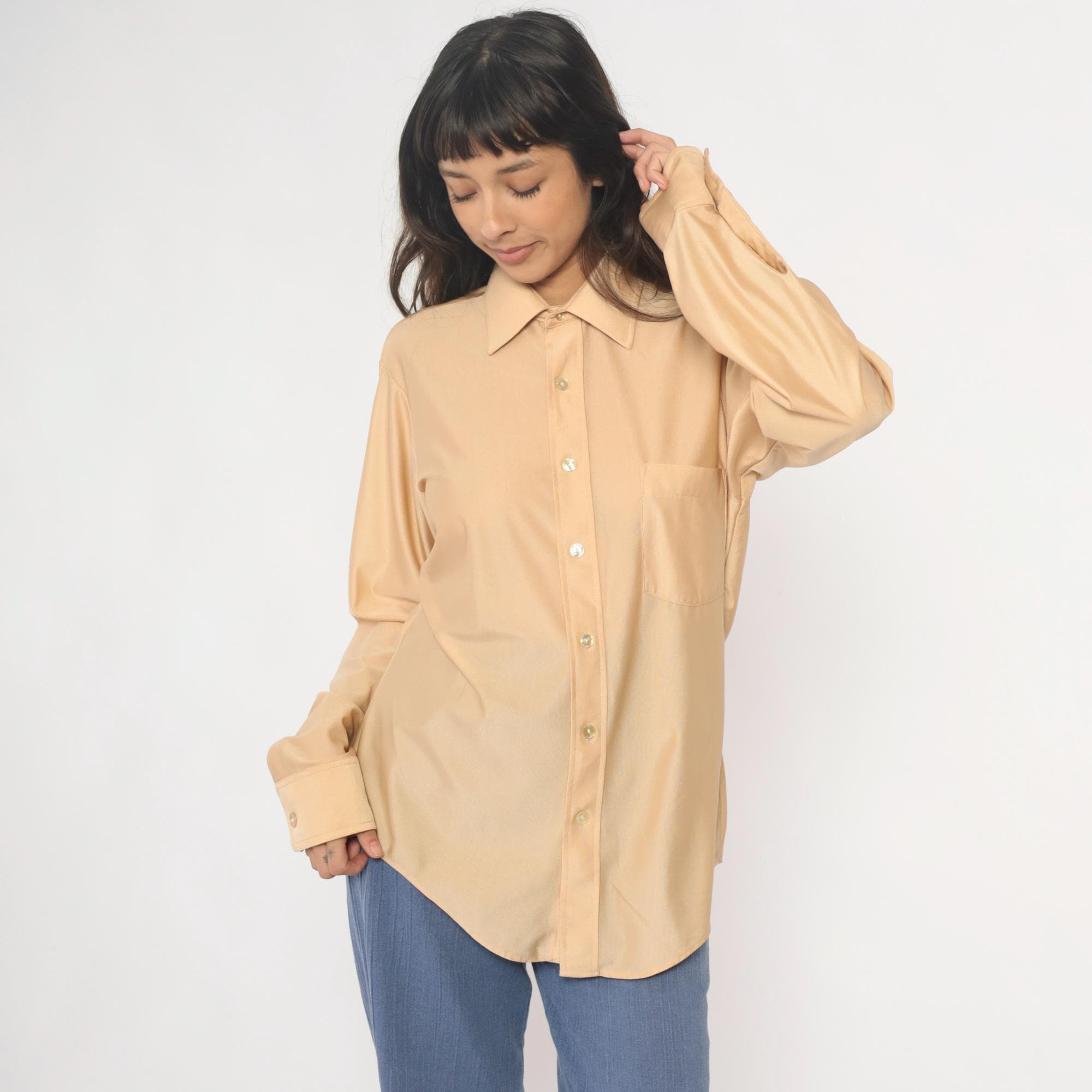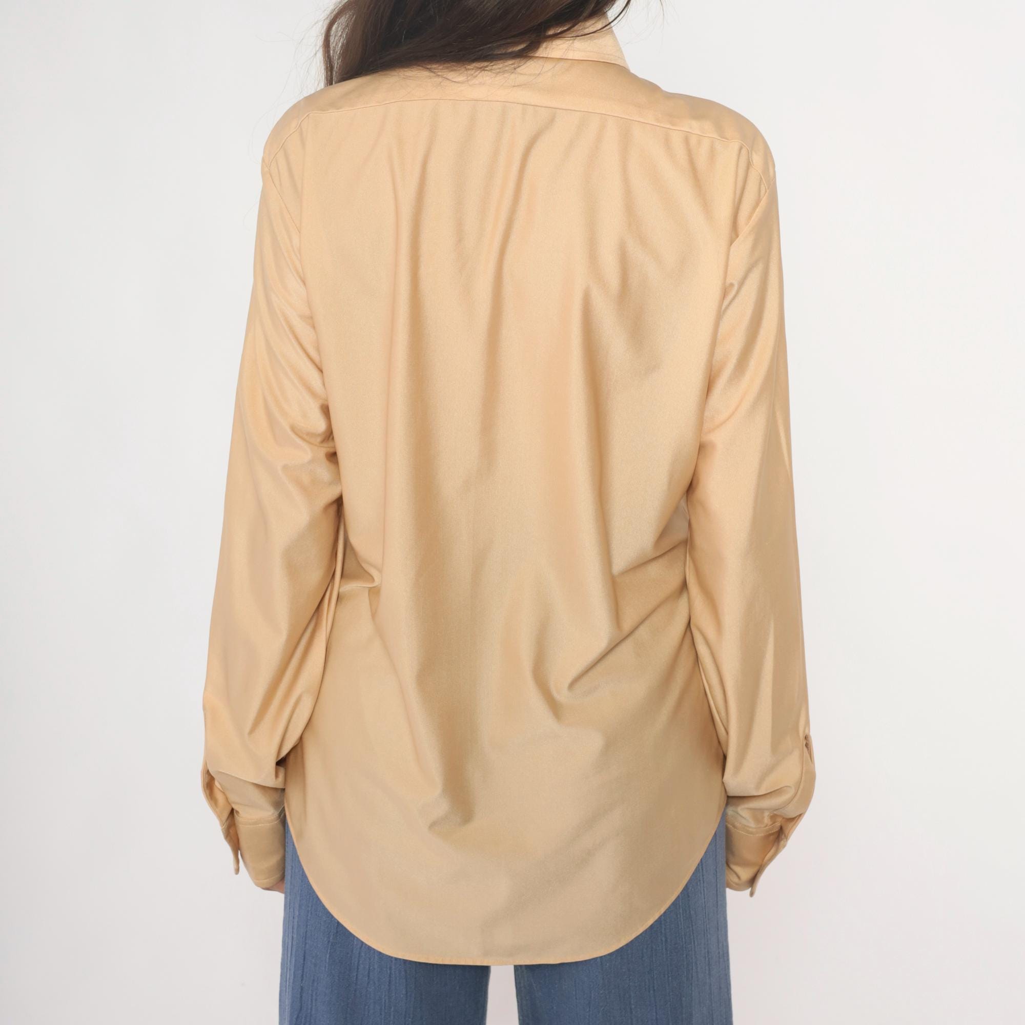 70s pale butter nylon shirt from Arrow Kent with pointed collar and button front closure. Long sleeves with button cuffs, single chest pocket, relaxed fit.