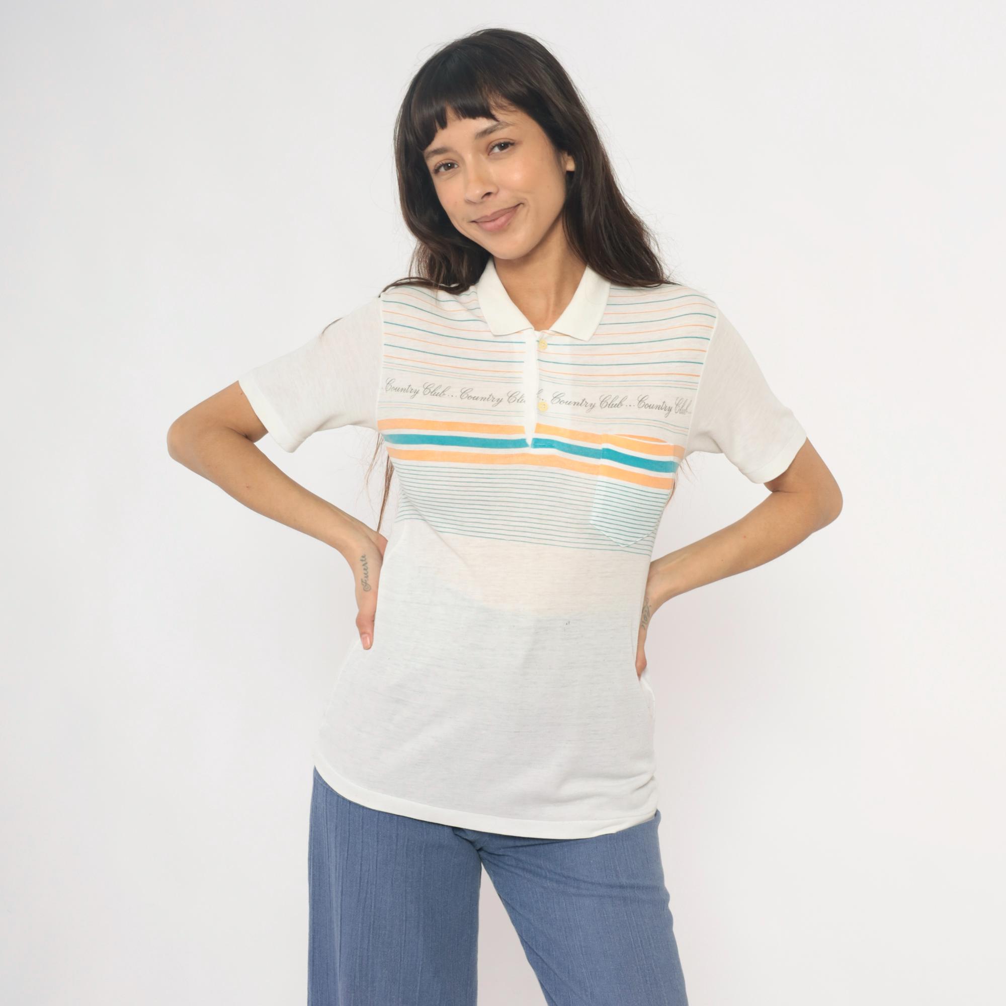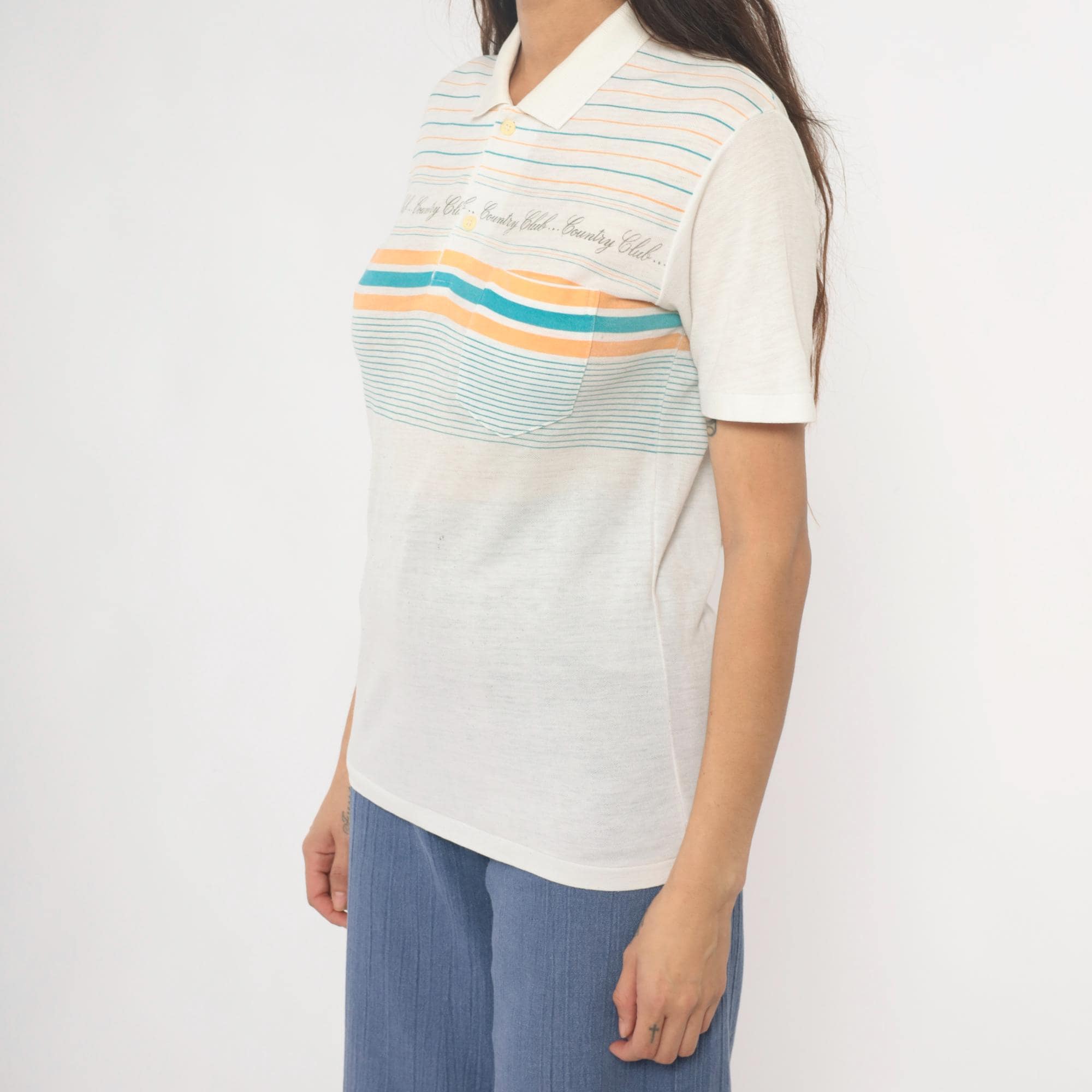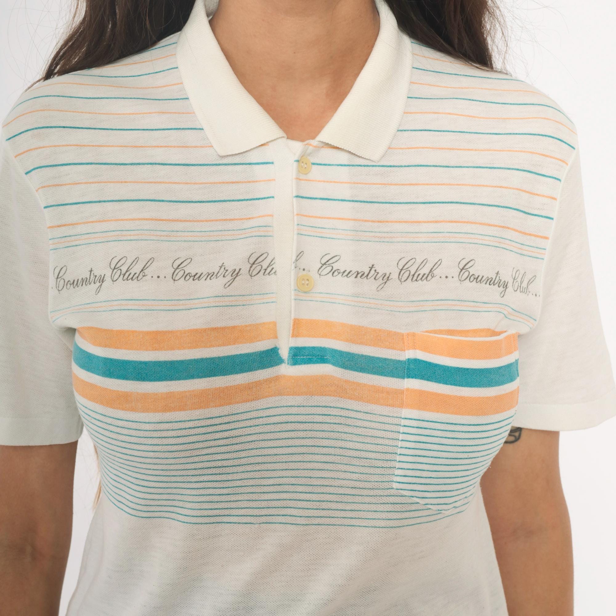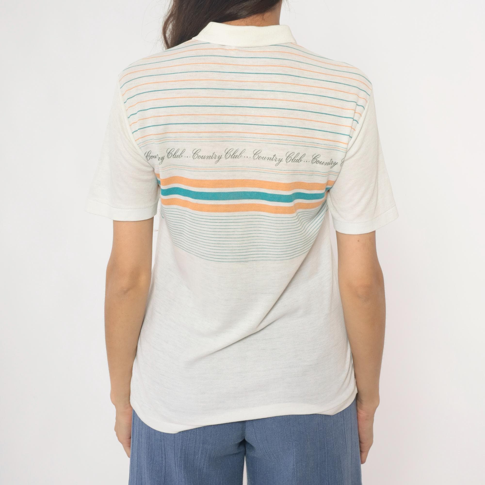 80s cream polo shirt with horizontal stripes in teal and peach and repeating "Country Club" text across the chest. Collared neckline with three-button placket and short sleeves.