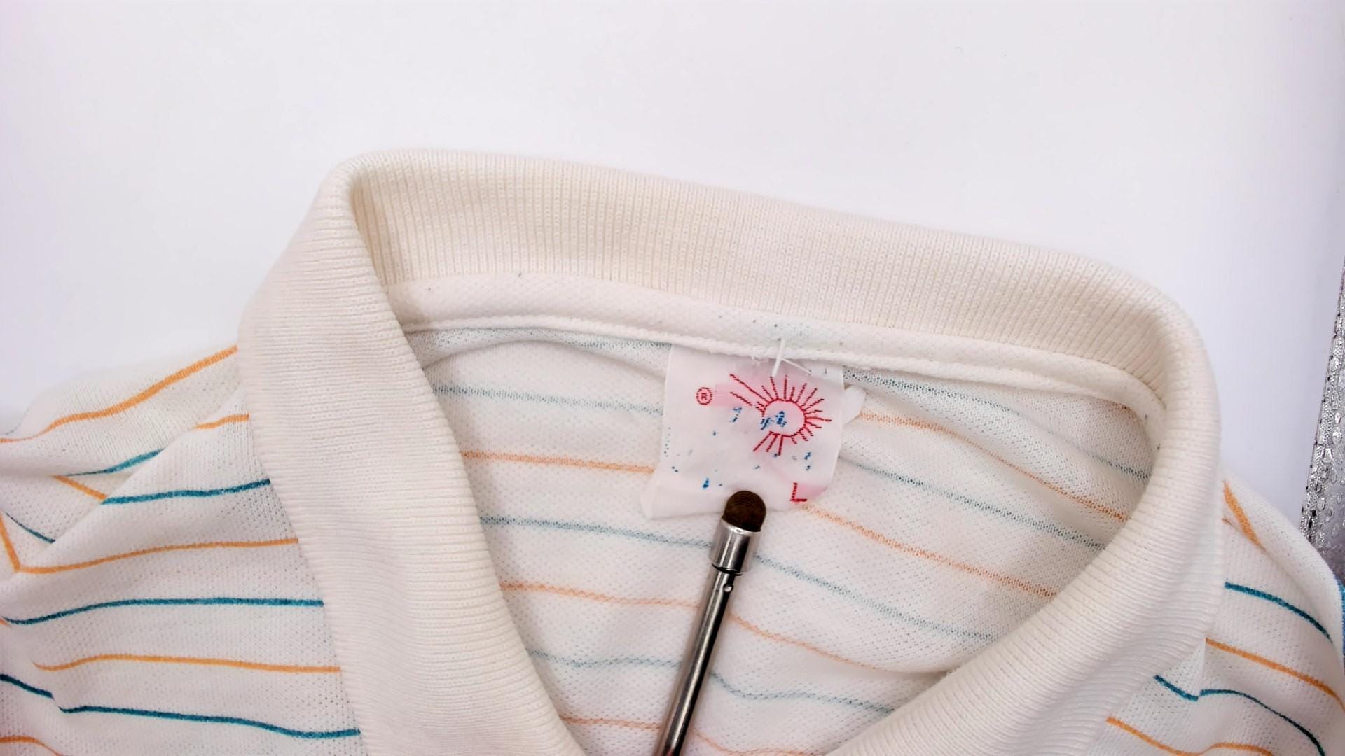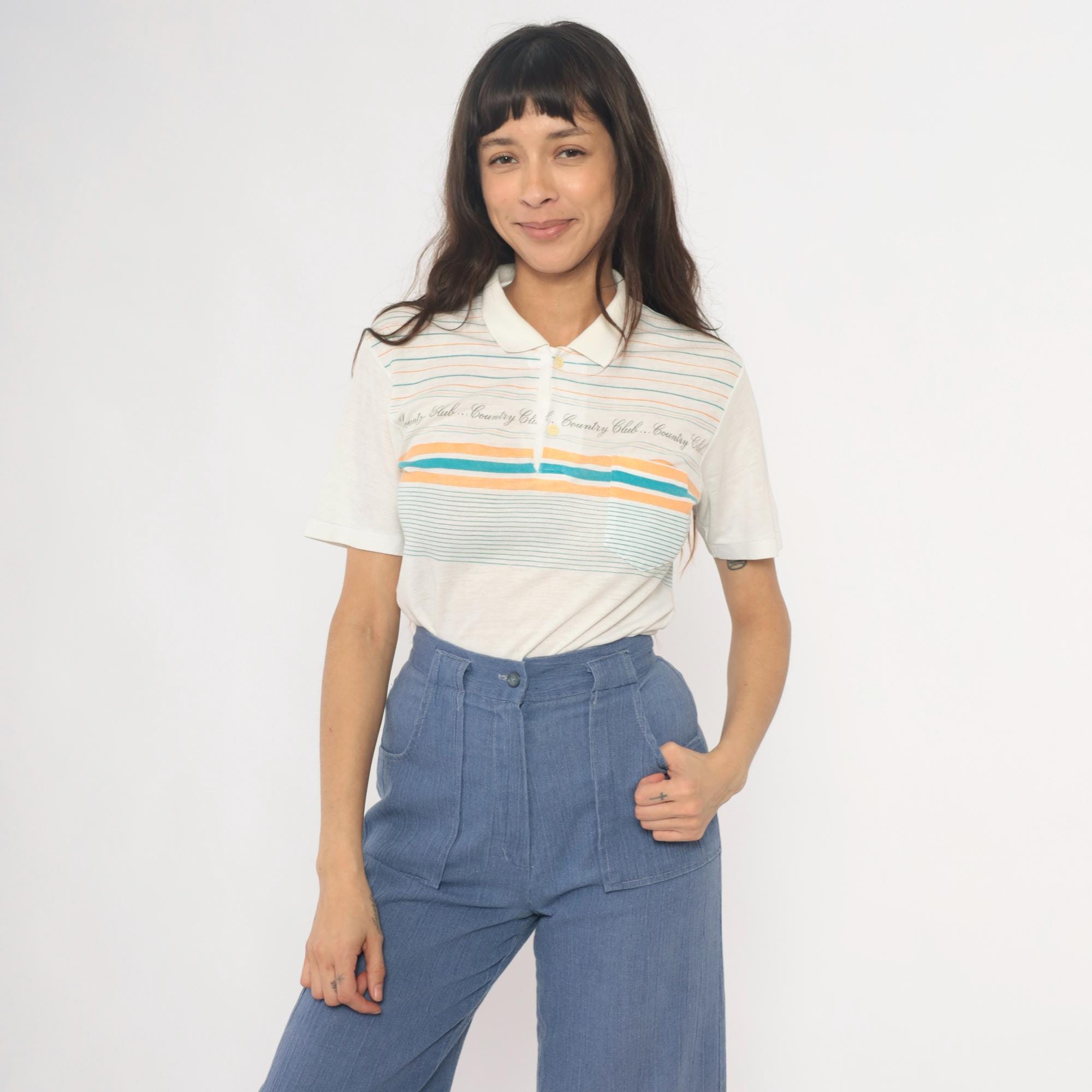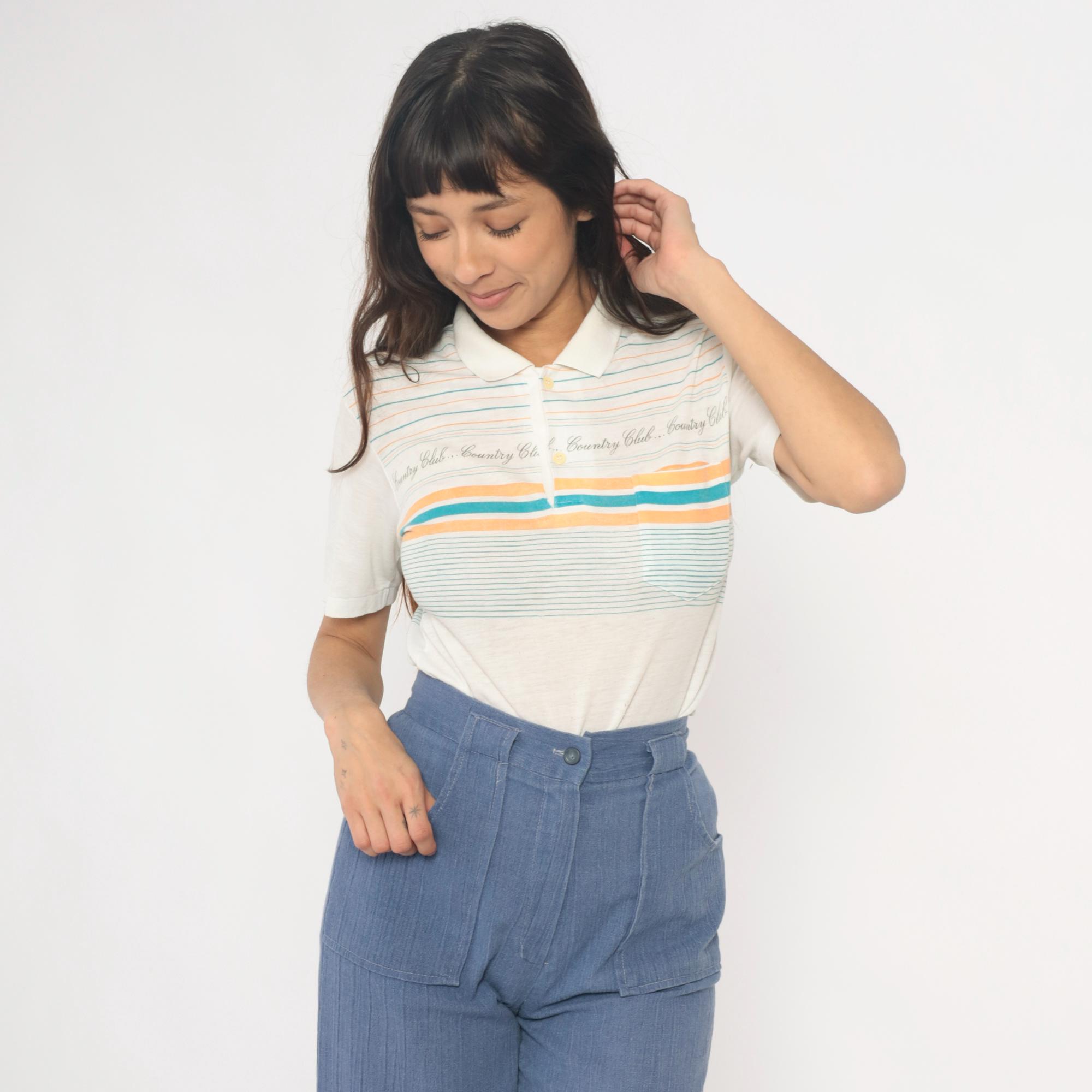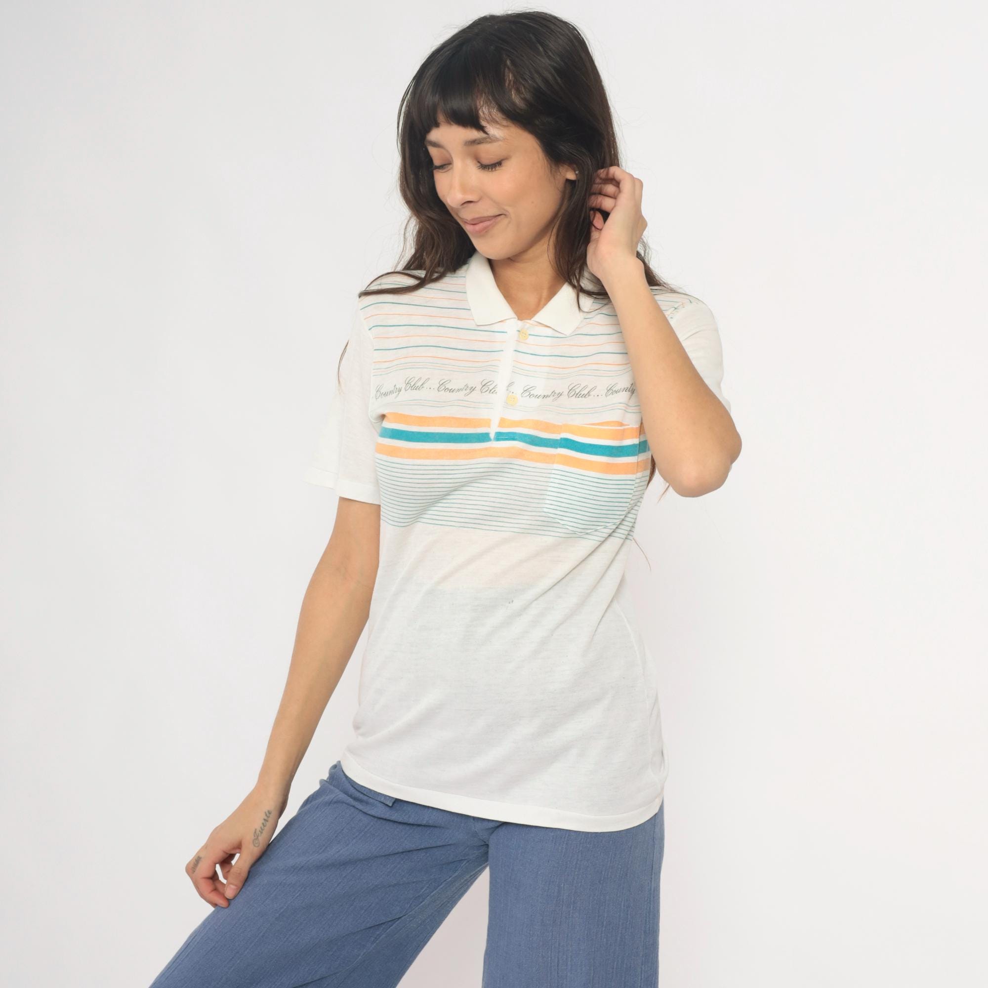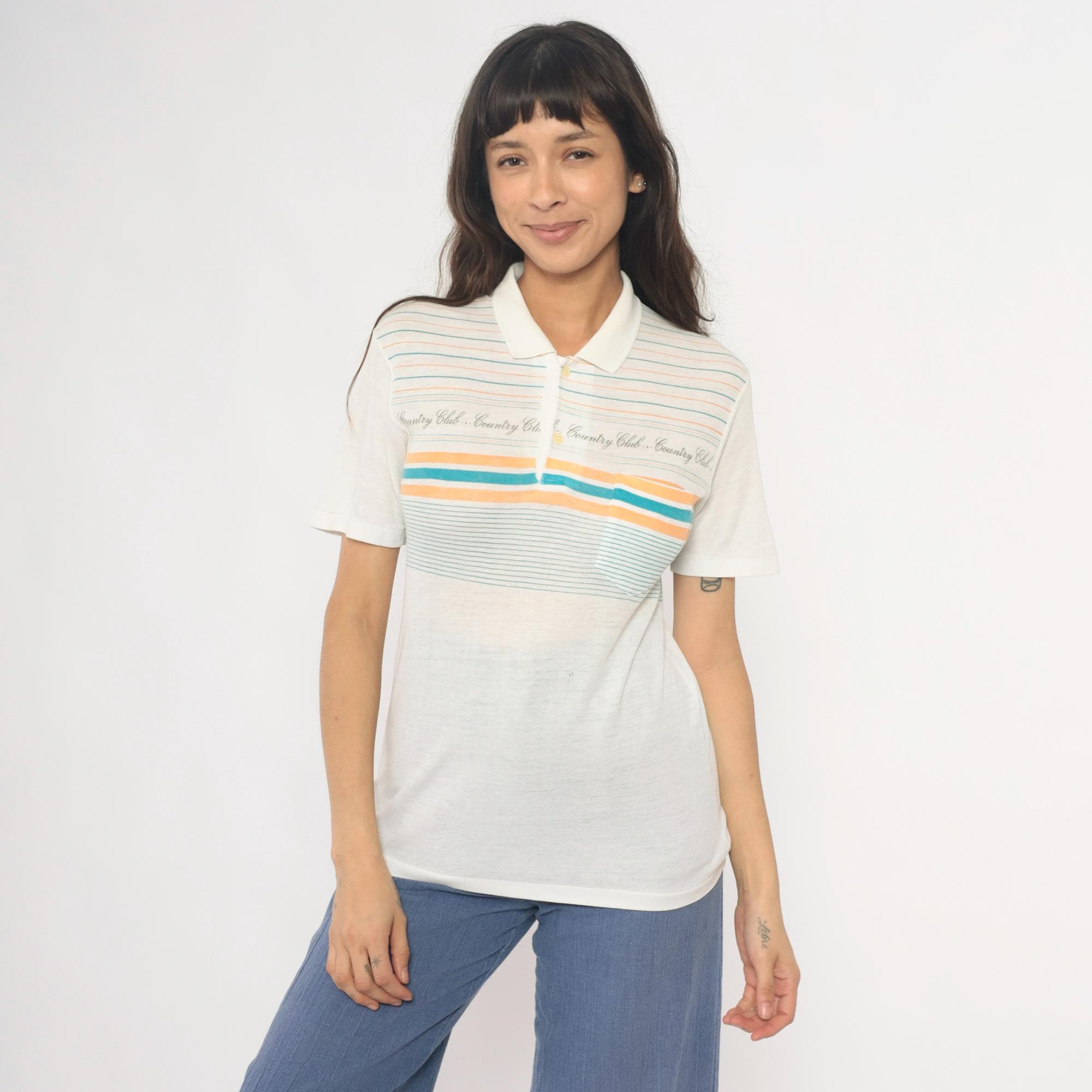 80s cream polo shirt with horizontal stripes in teal and peach and repeating "Country Club" text across the chest. Collared neckline with three-button placket and short sleeves.