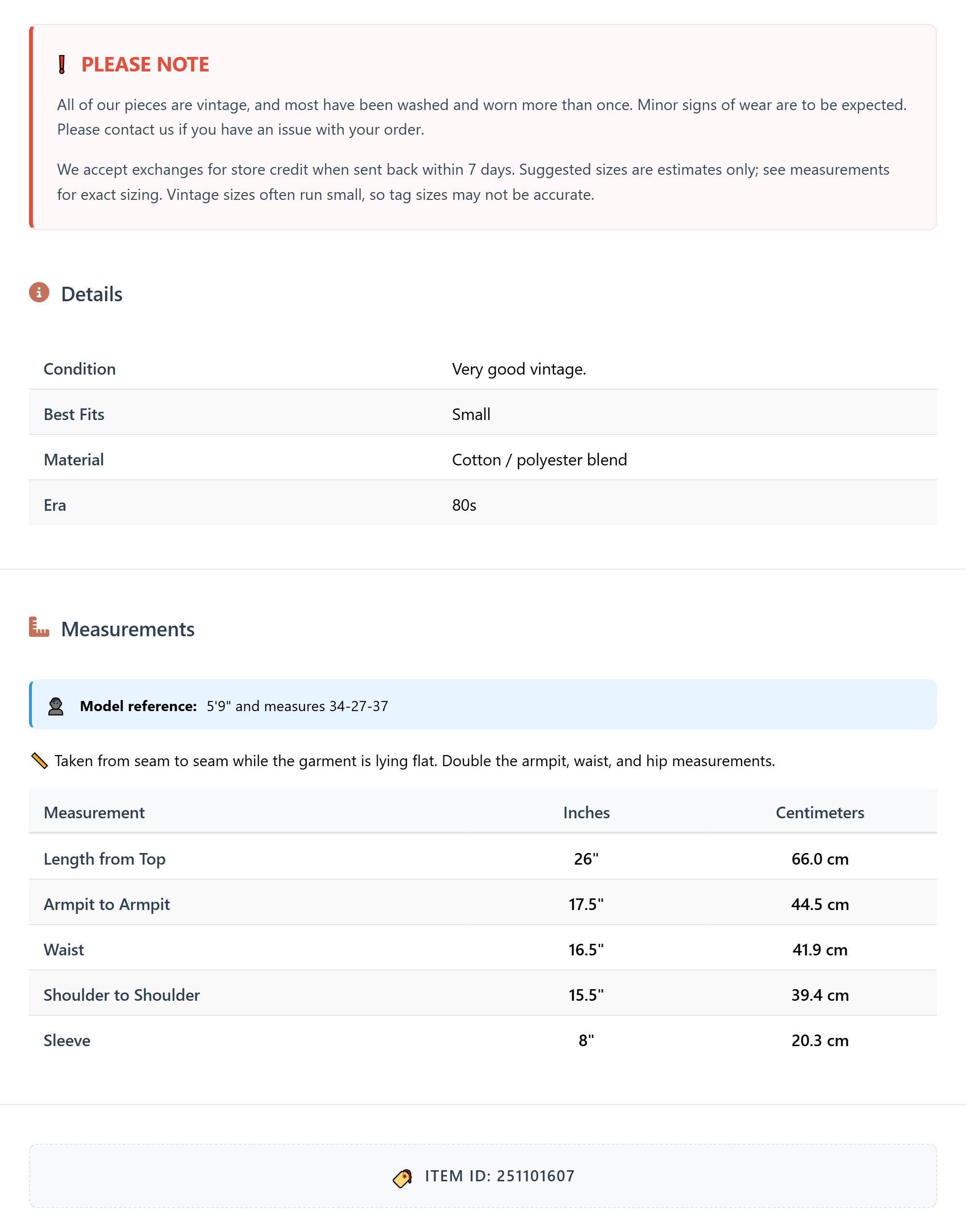 All of our pieces are vintage, and most have been washed and worn more than once. Minor signs of wear are to be expected. Please contact us if you have an issue with your order. We accept exchanges for store credit when sent back within 7 days.