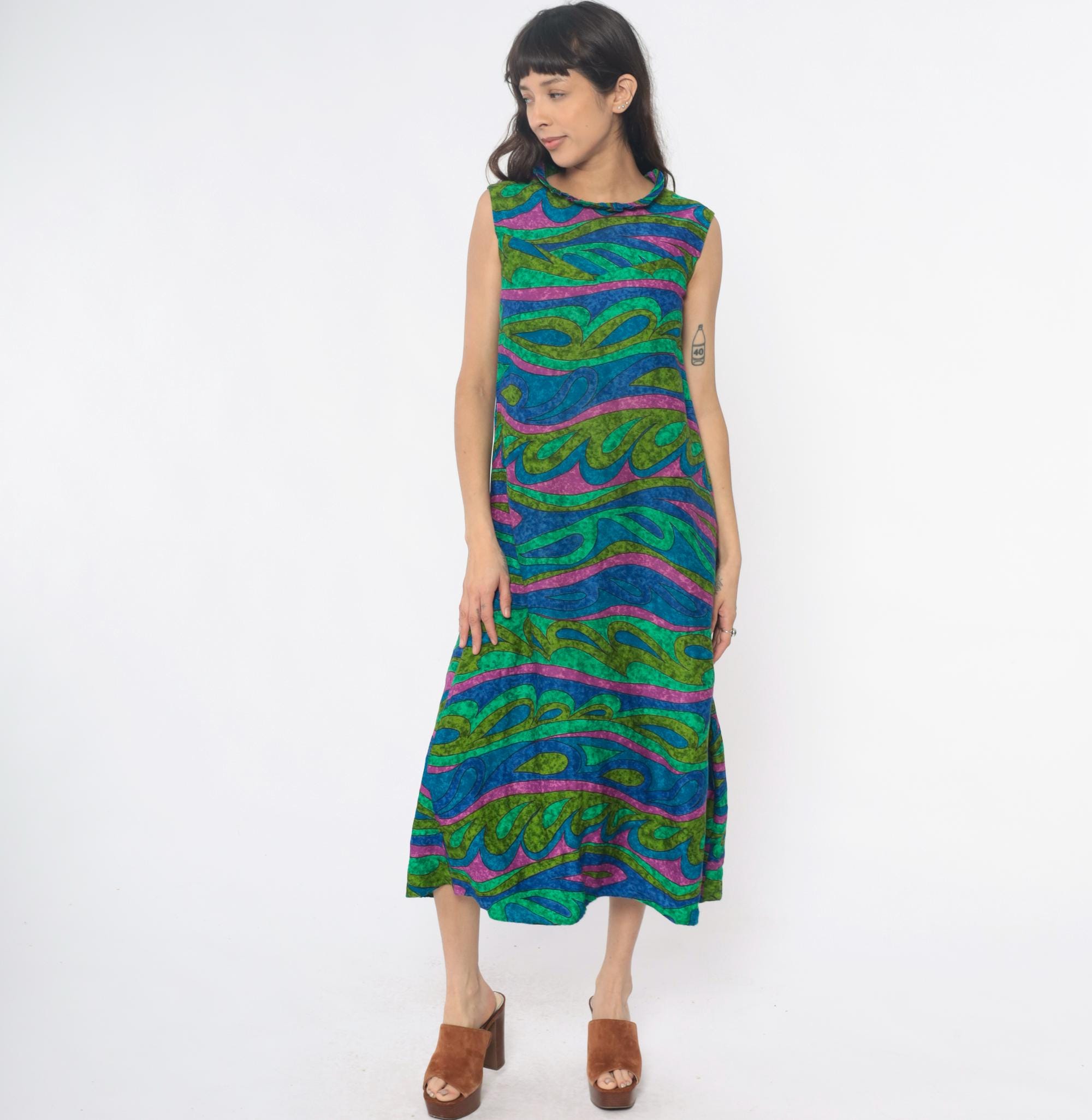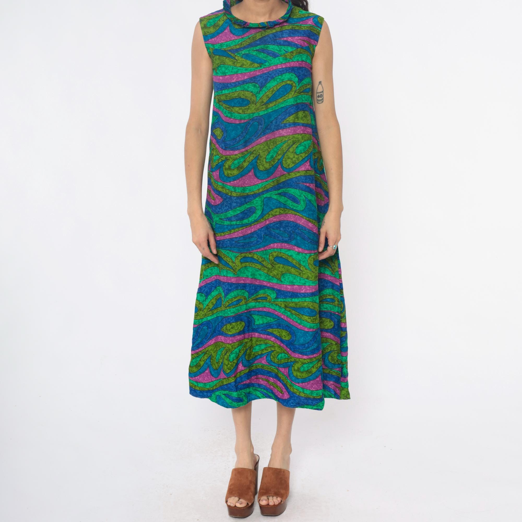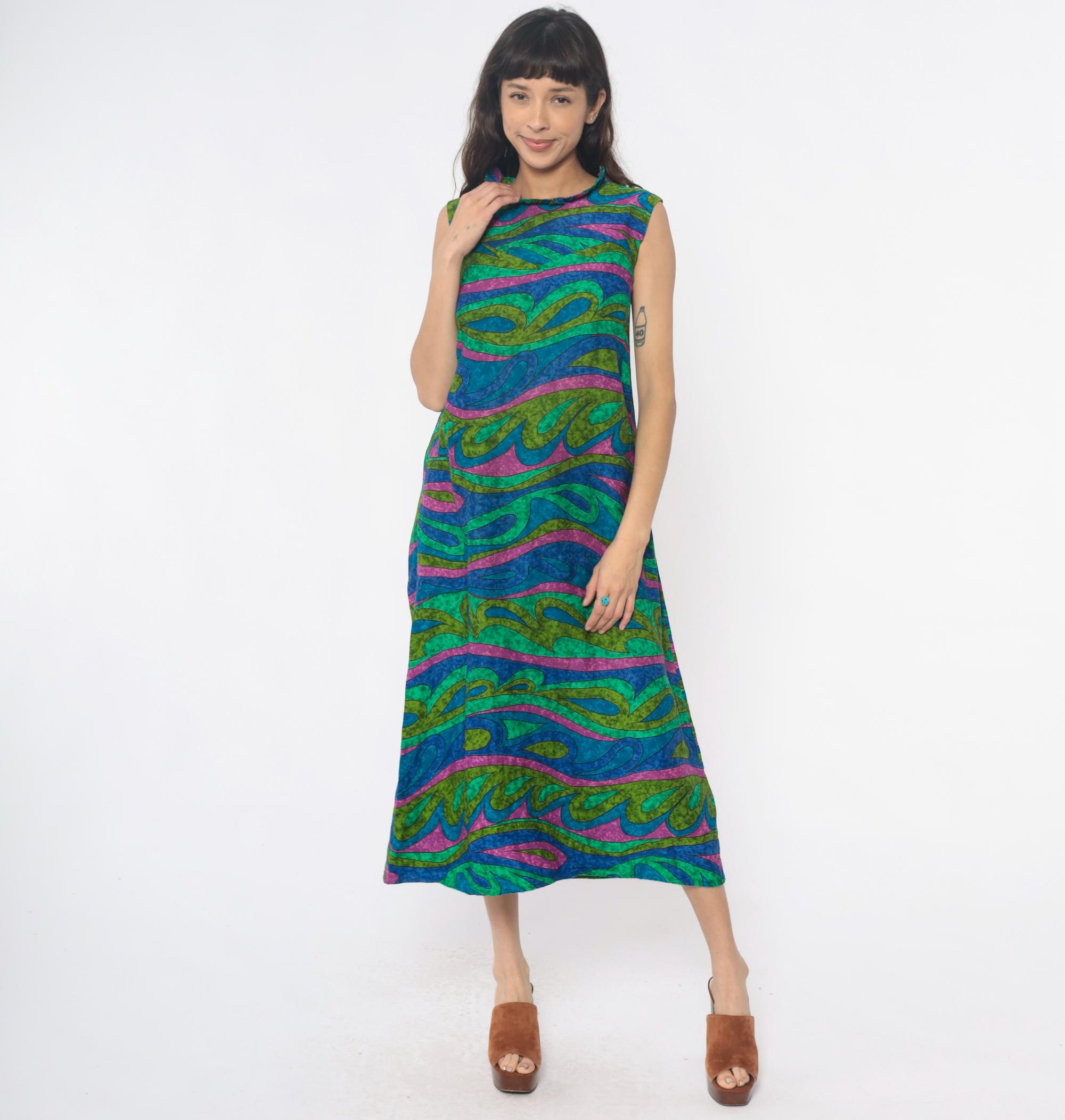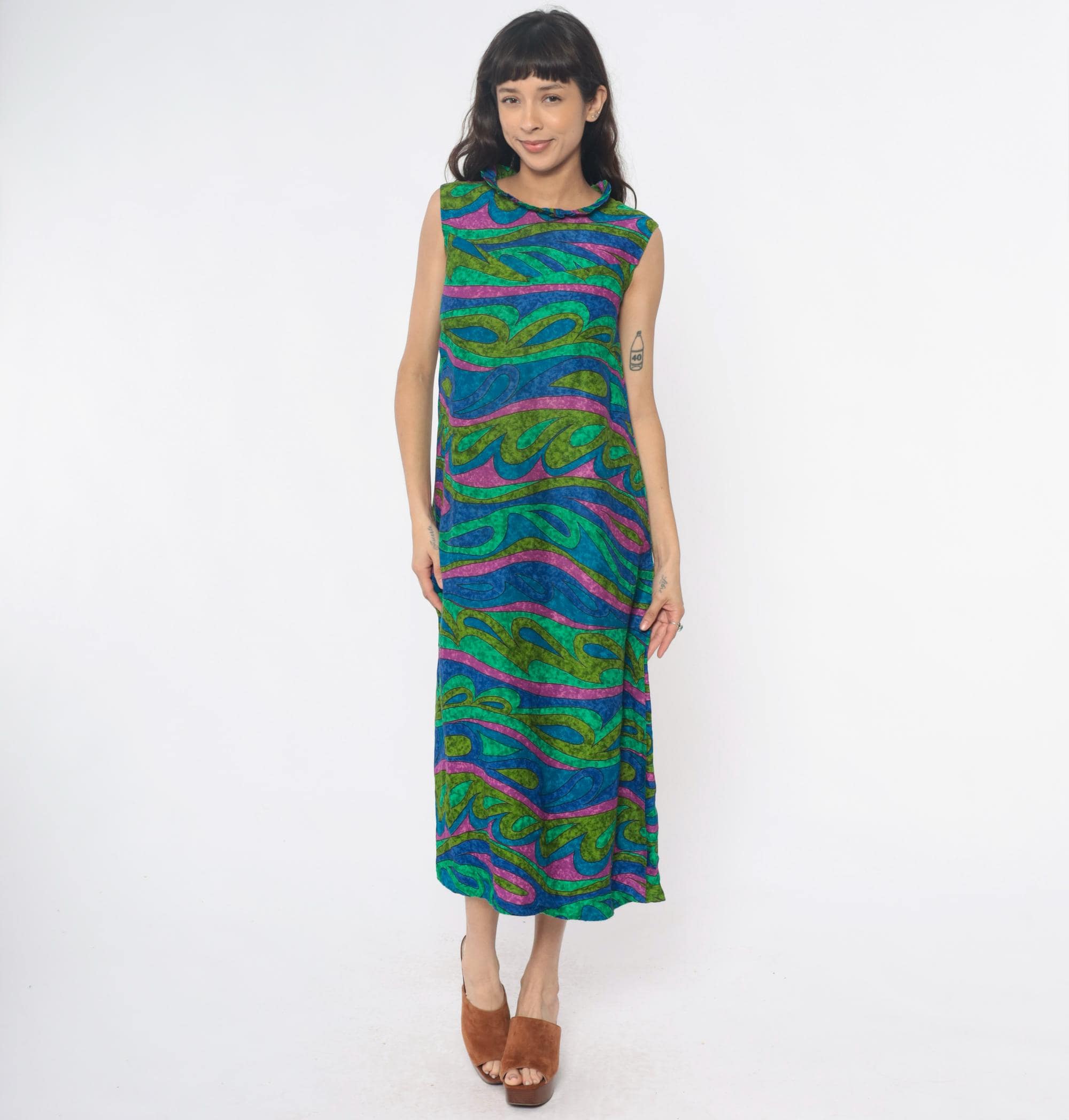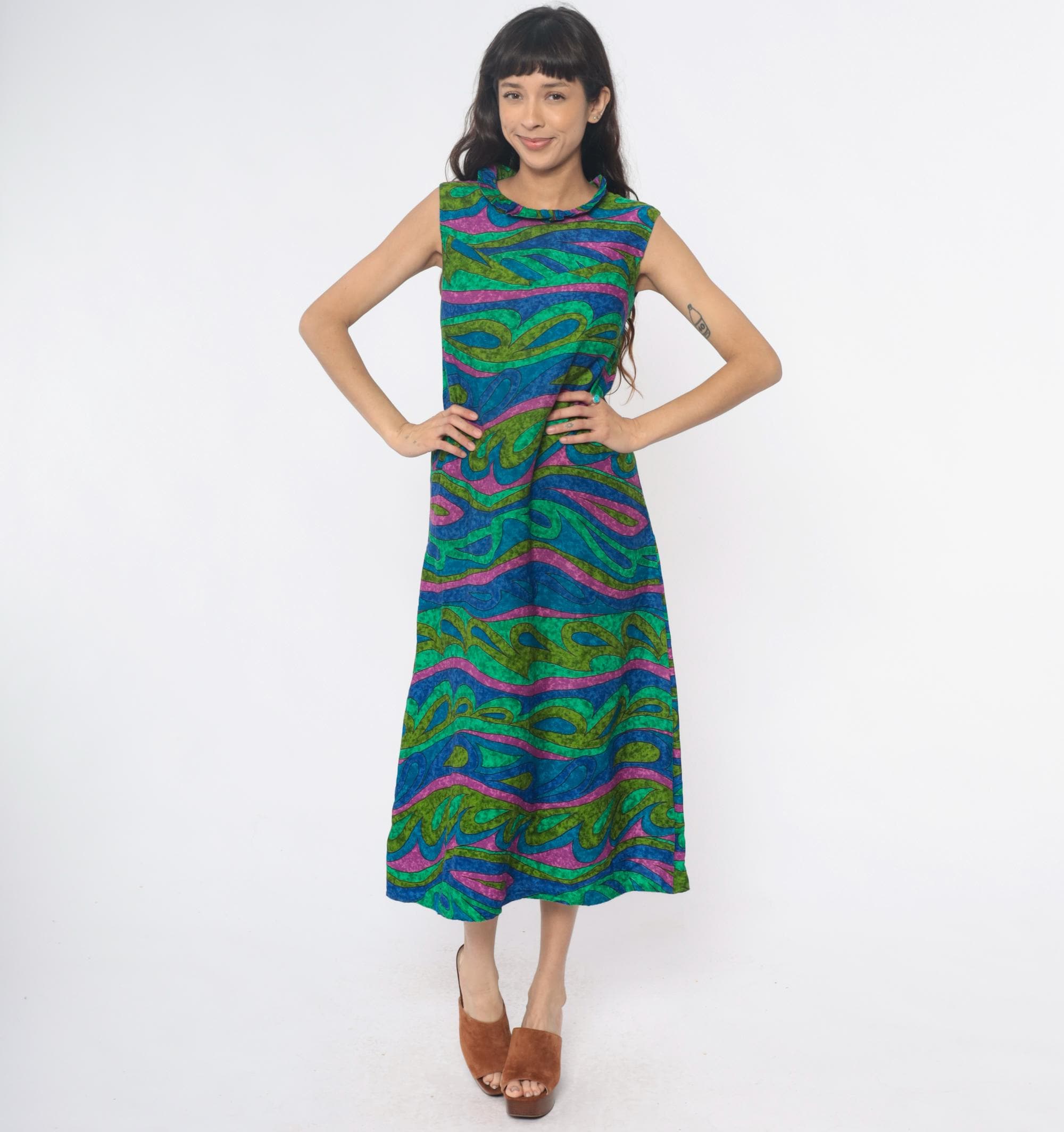 70s psychedelic paisley maxi dress in blue, green, pink, and turquoise with swirling wave patterns across the fabric. Sleeveless design with round neckline, back zipper closure, and A-line silhouette.