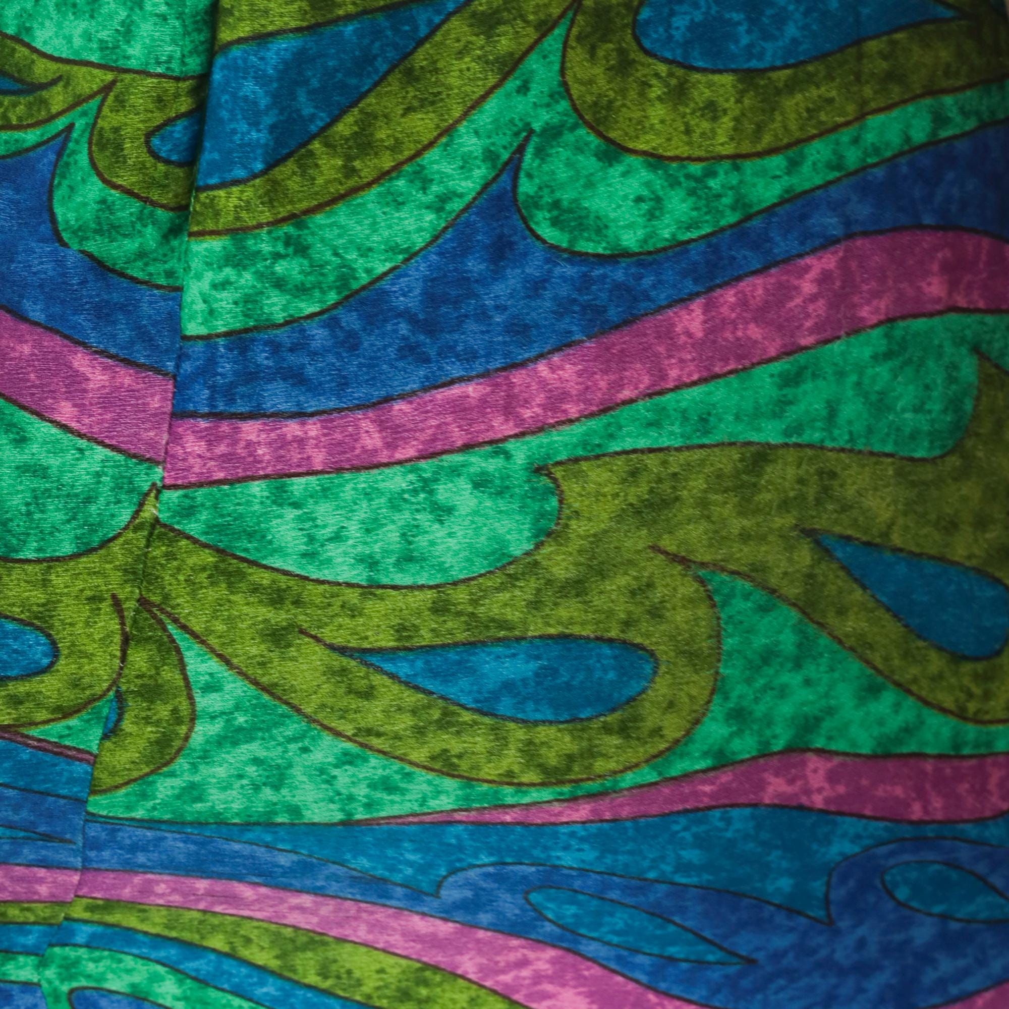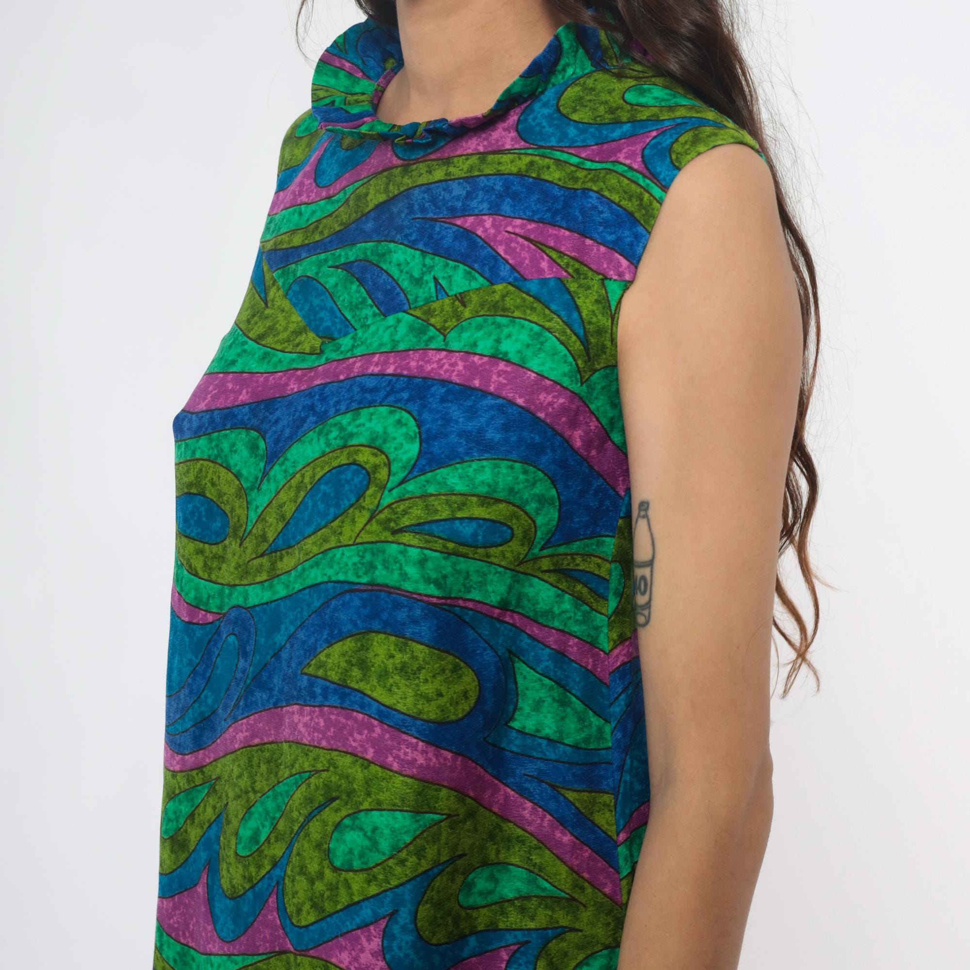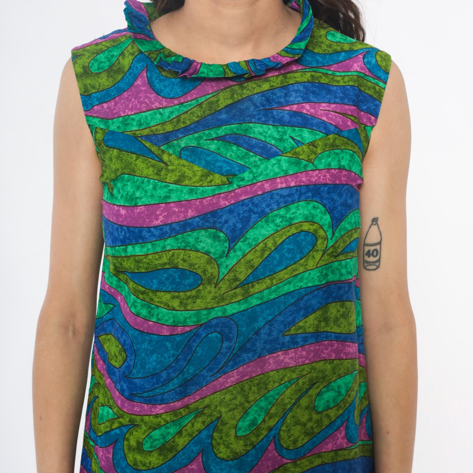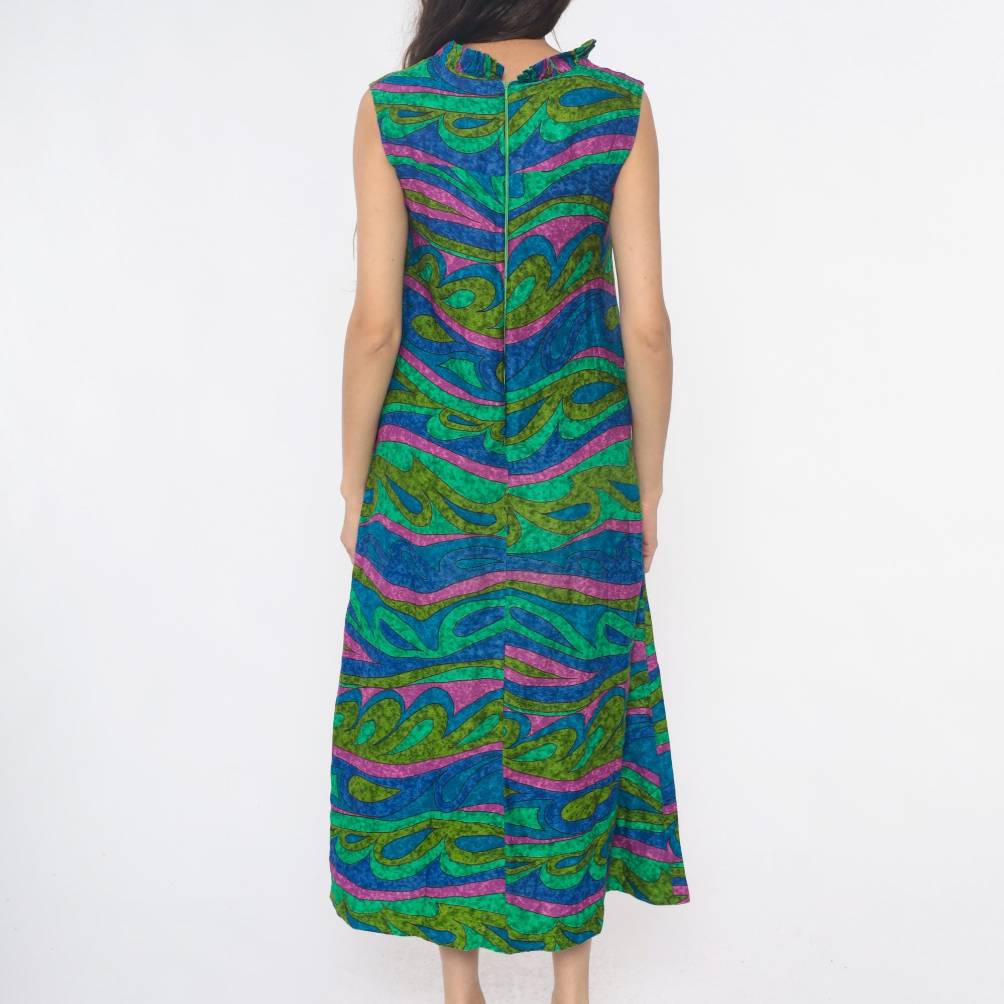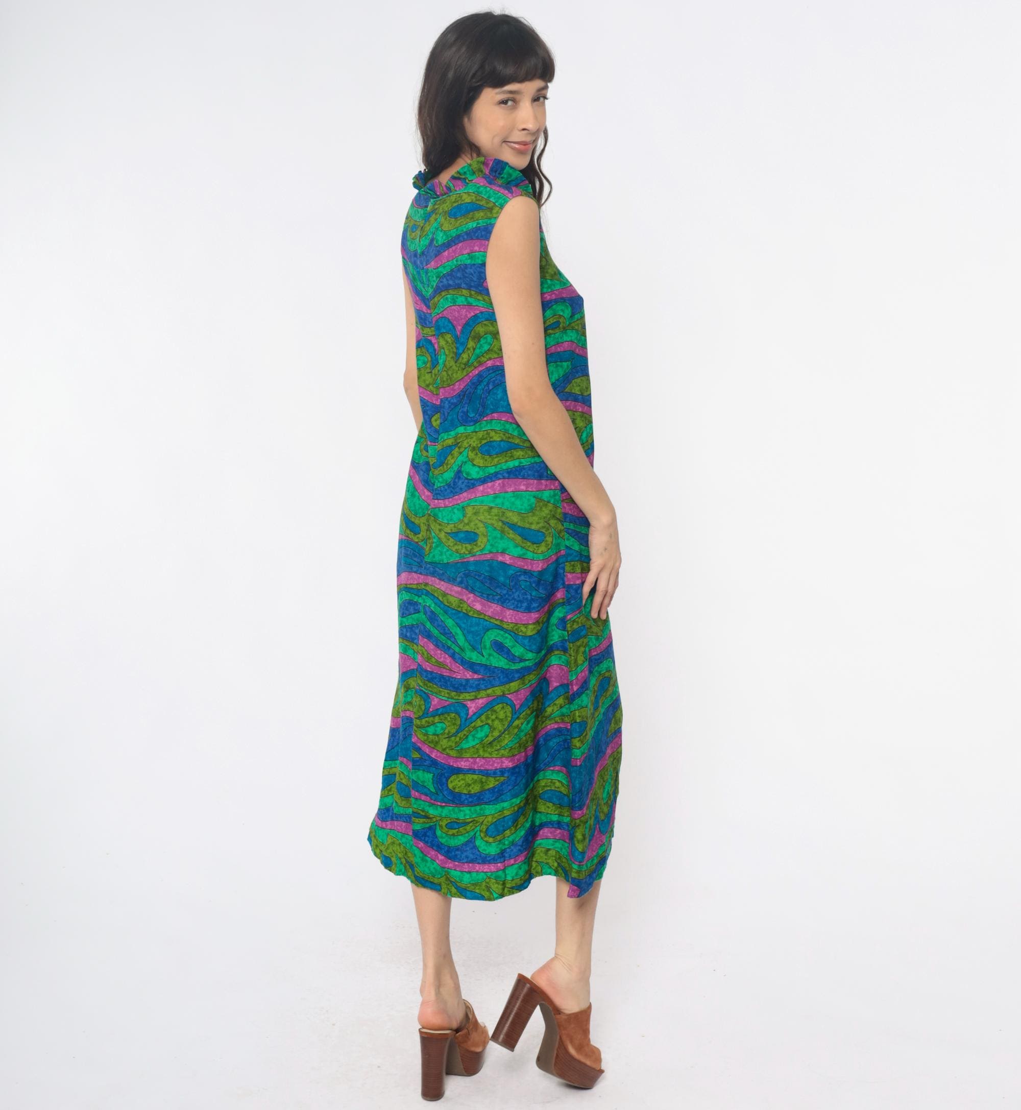 70s psychedelic paisley maxi dress in blue, green, pink, and turquoise with swirling wave patterns across the fabric. Sleeveless design with round neckline, back zipper closure, and A-line silhouette.