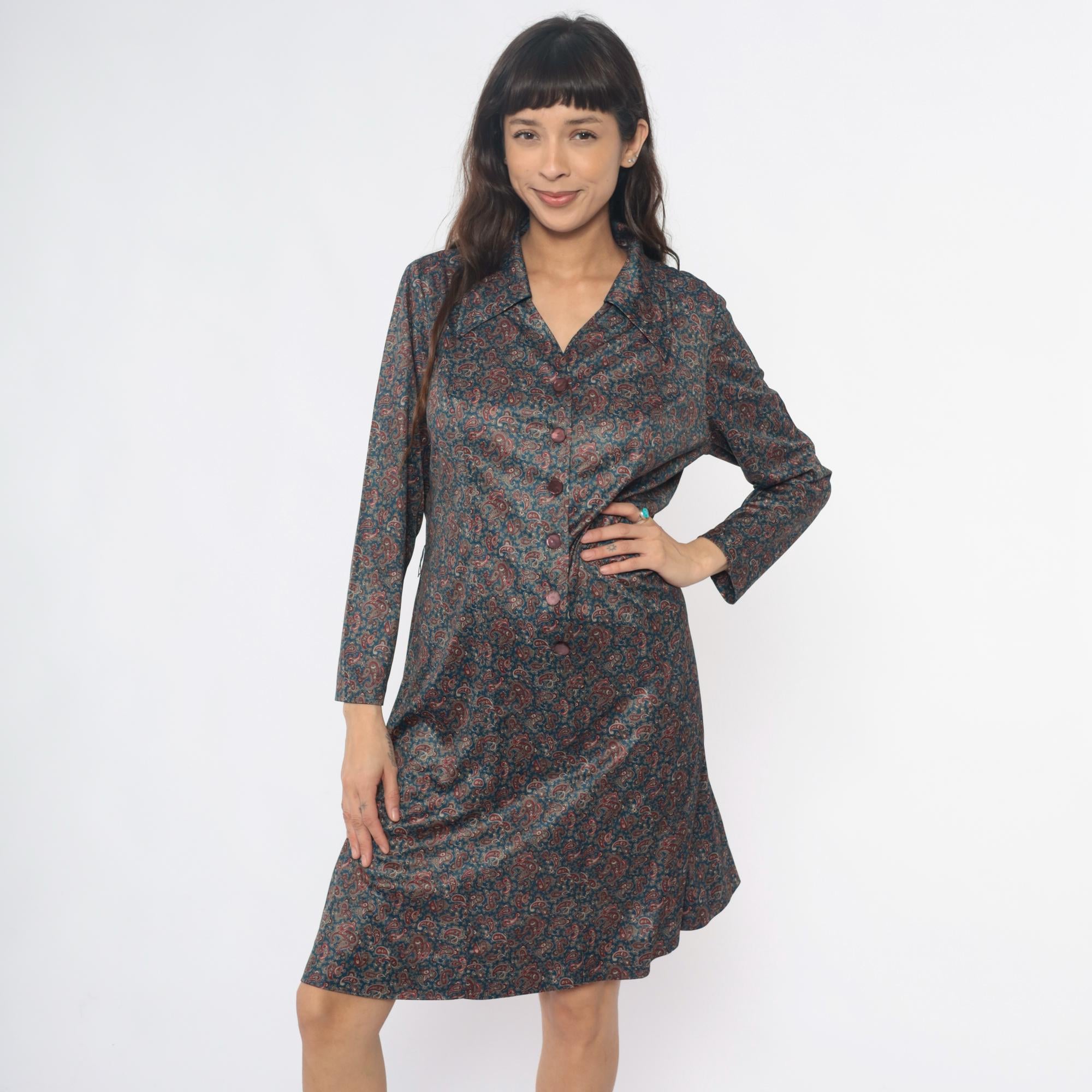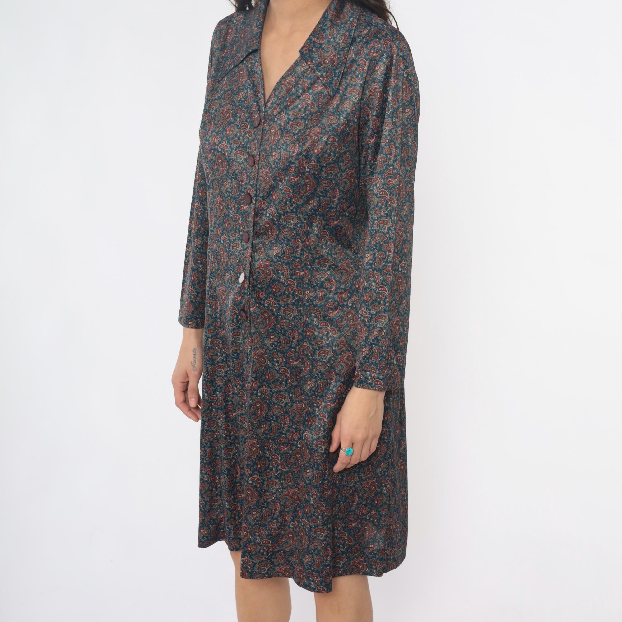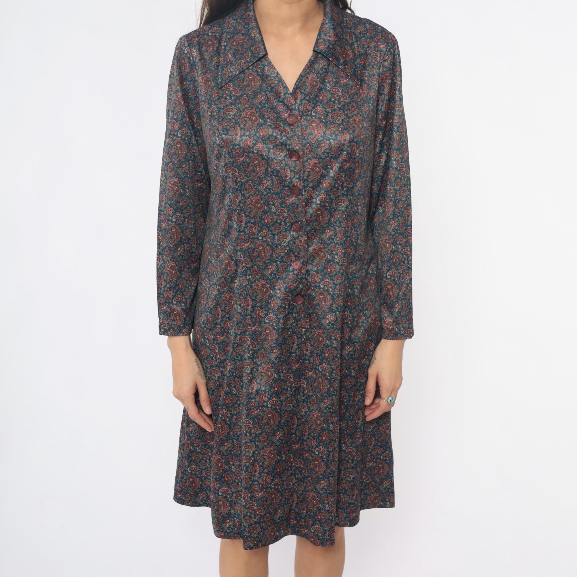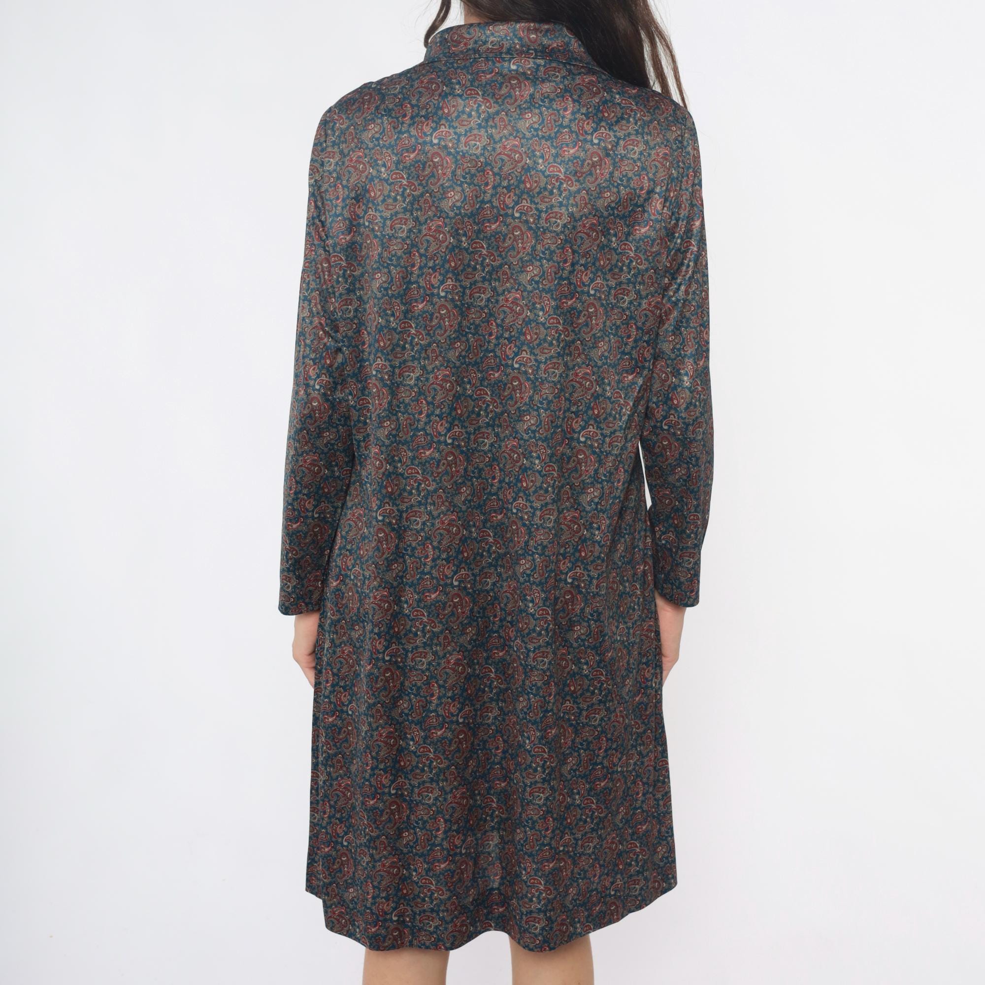 70s paisley print shirt dress in dark blue and rust red. Collared neckline with button front closure, long sleeves with button cuffs. All-over paisley pattern in burgundy, rust, tan, and cream across dark teal-blue fabric.