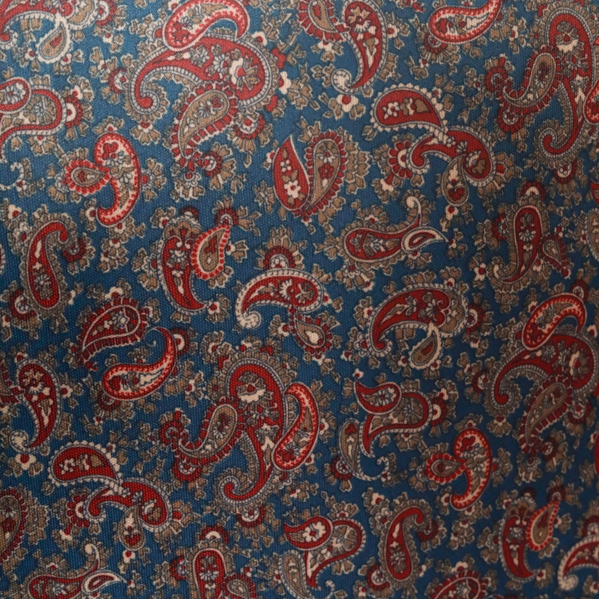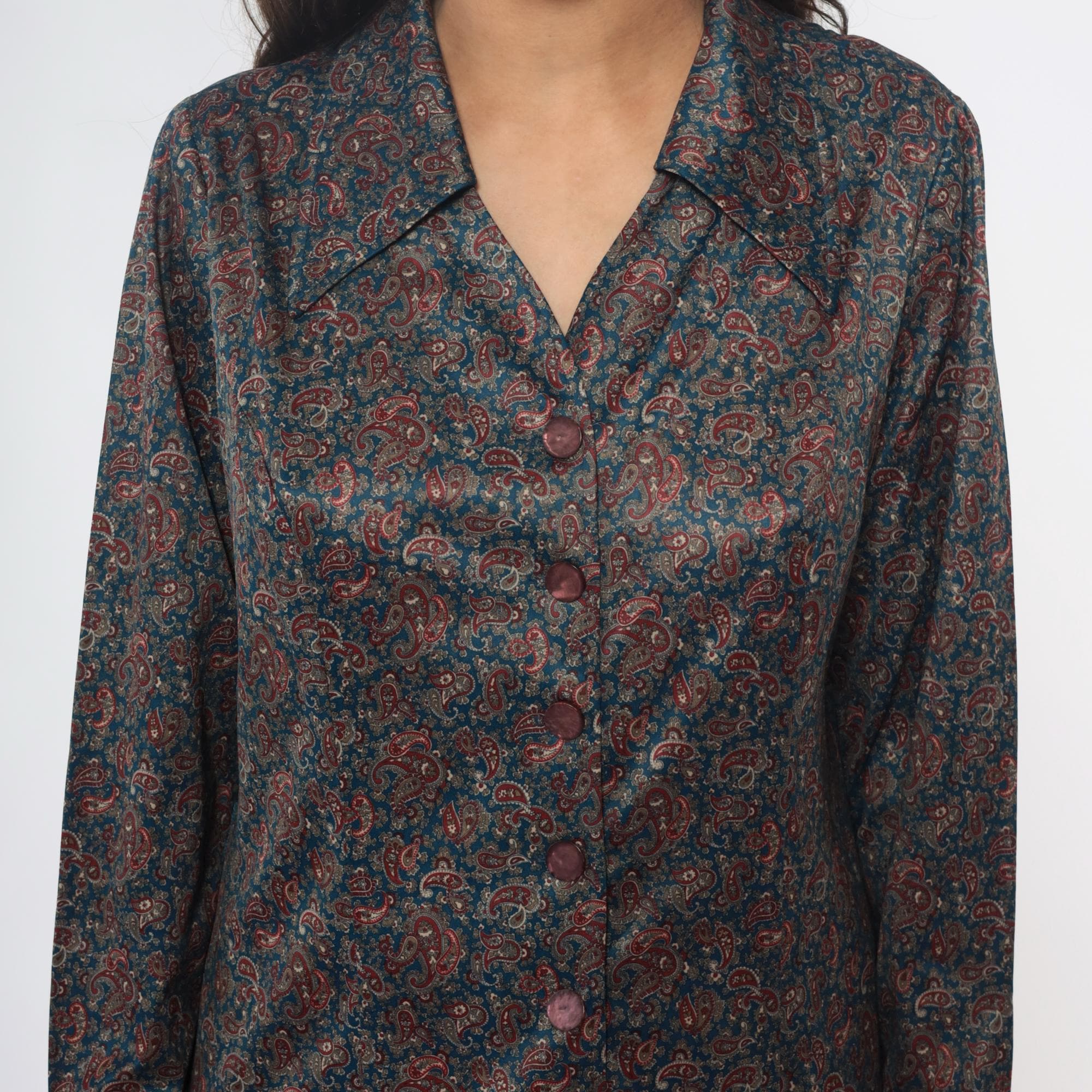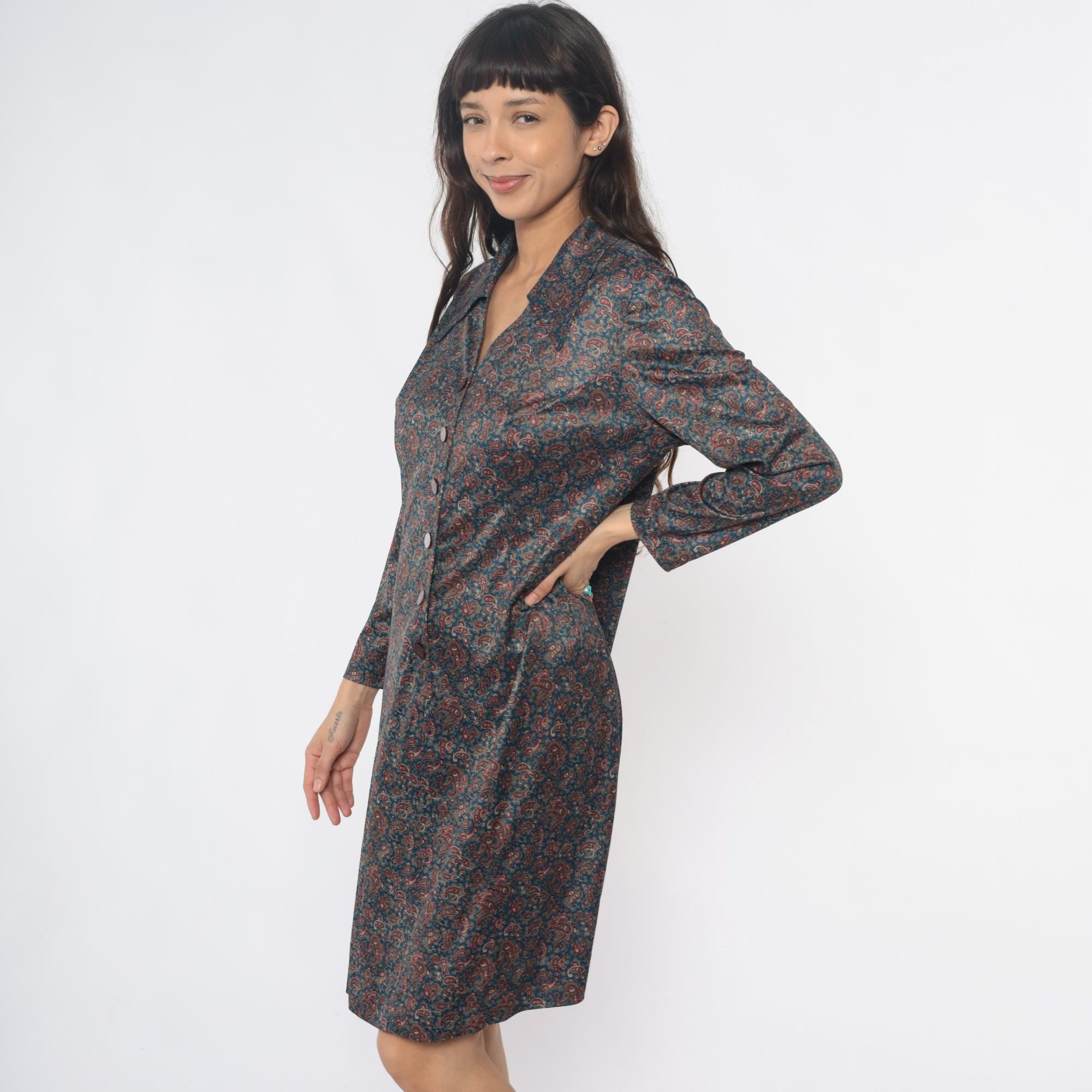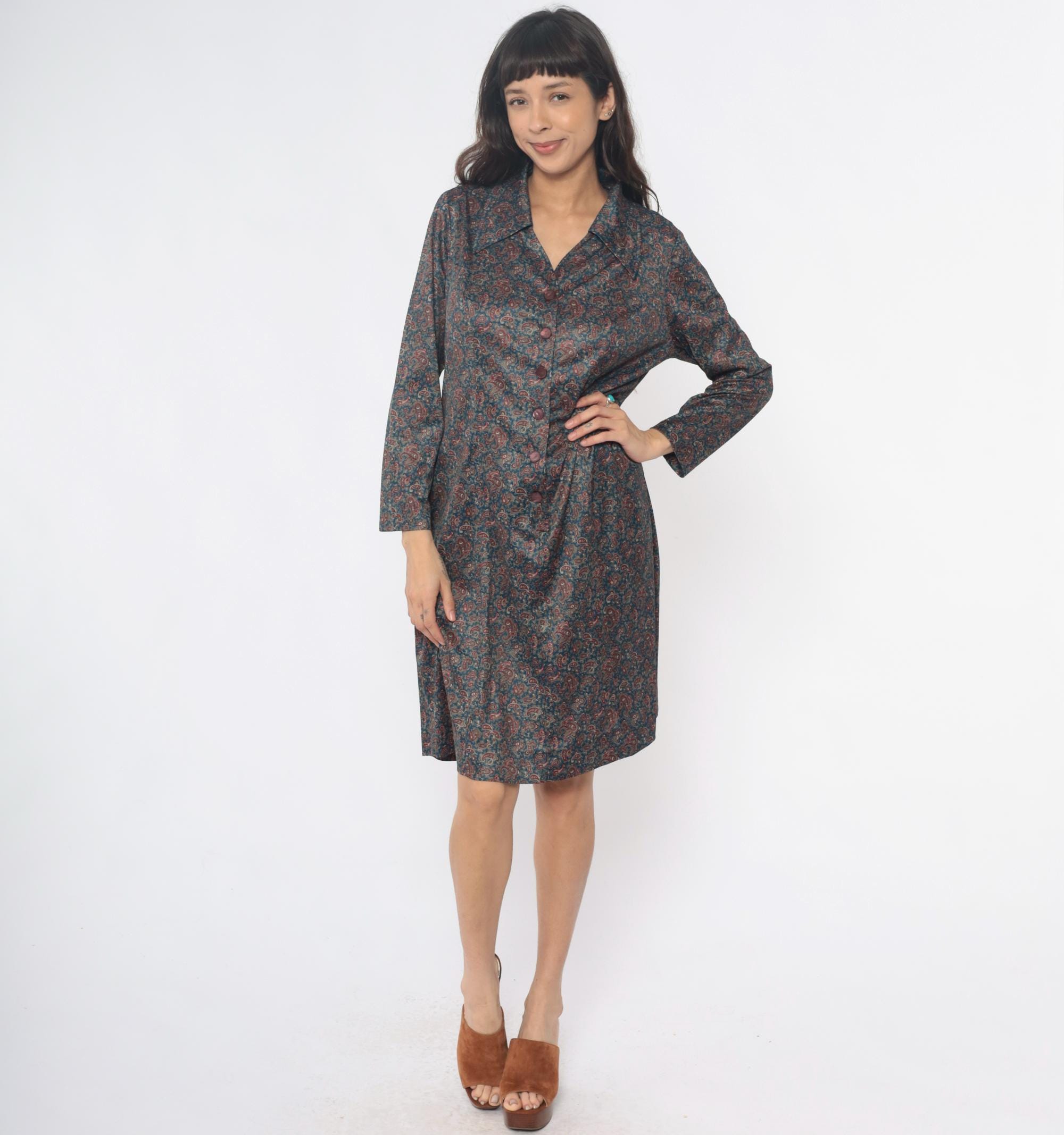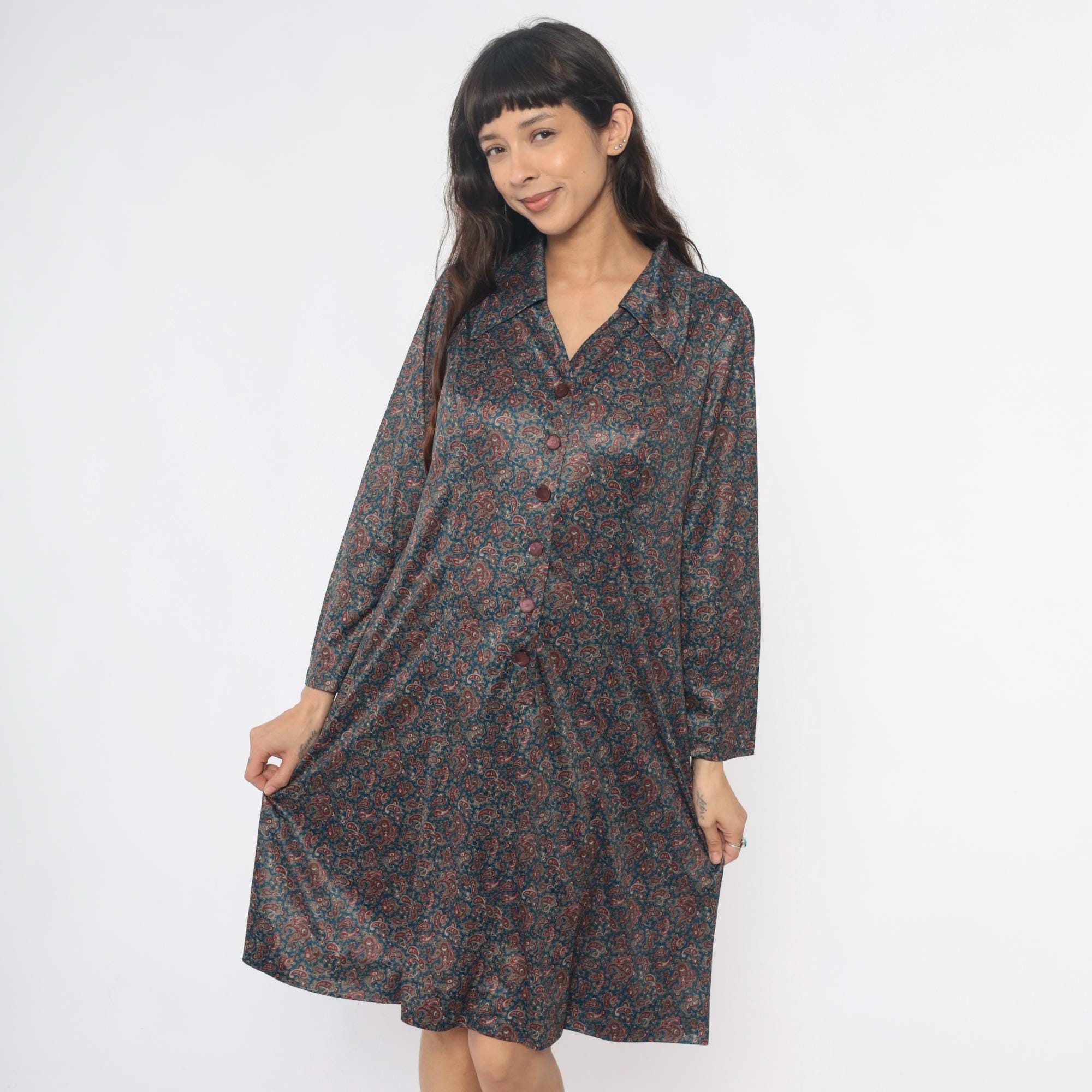 70s paisley print shirt dress in dark blue and rust red. Collared neckline with button front closure, long sleeves with button cuffs. All-over paisley pattern in burgundy, rust, tan, and cream across dark teal-blue fabric.