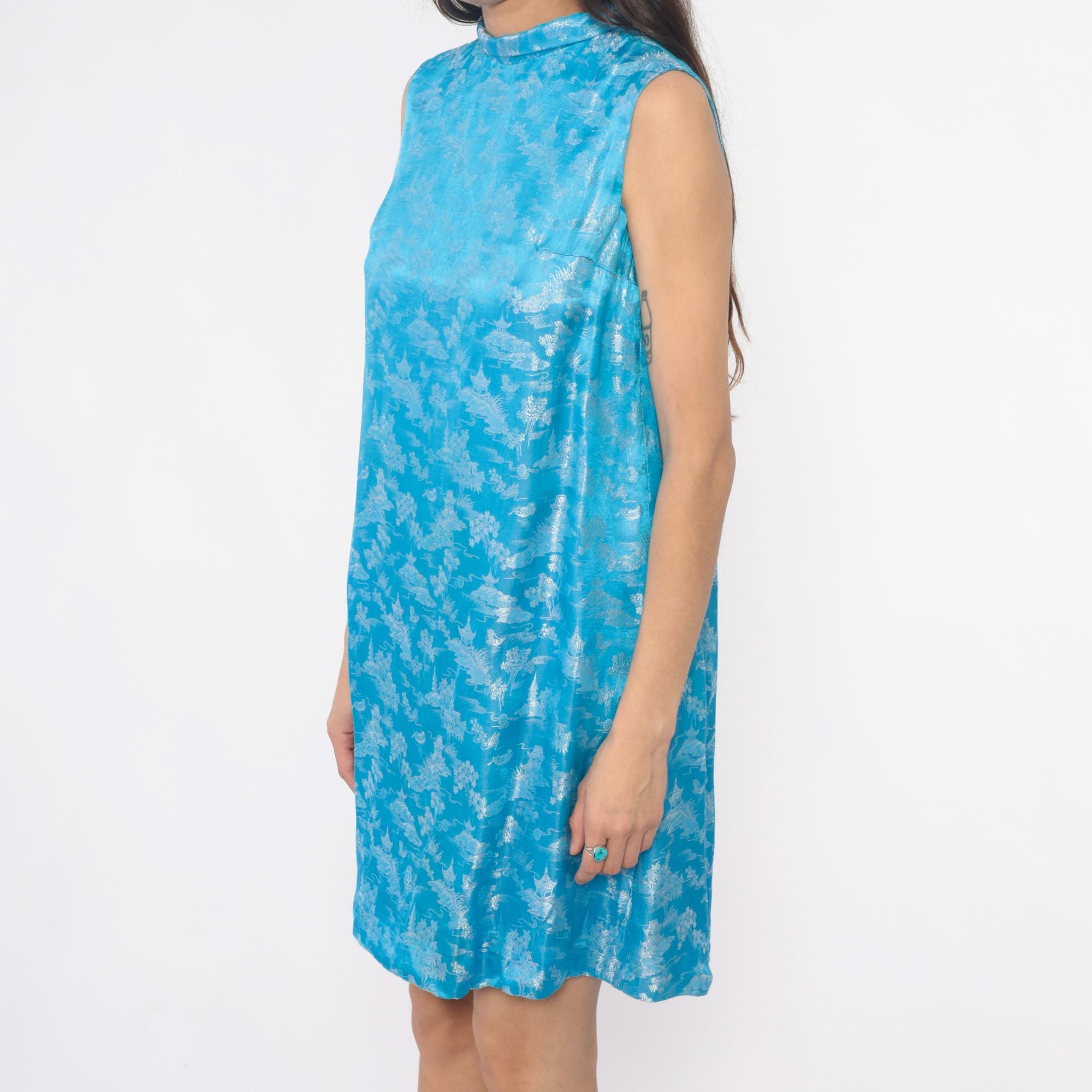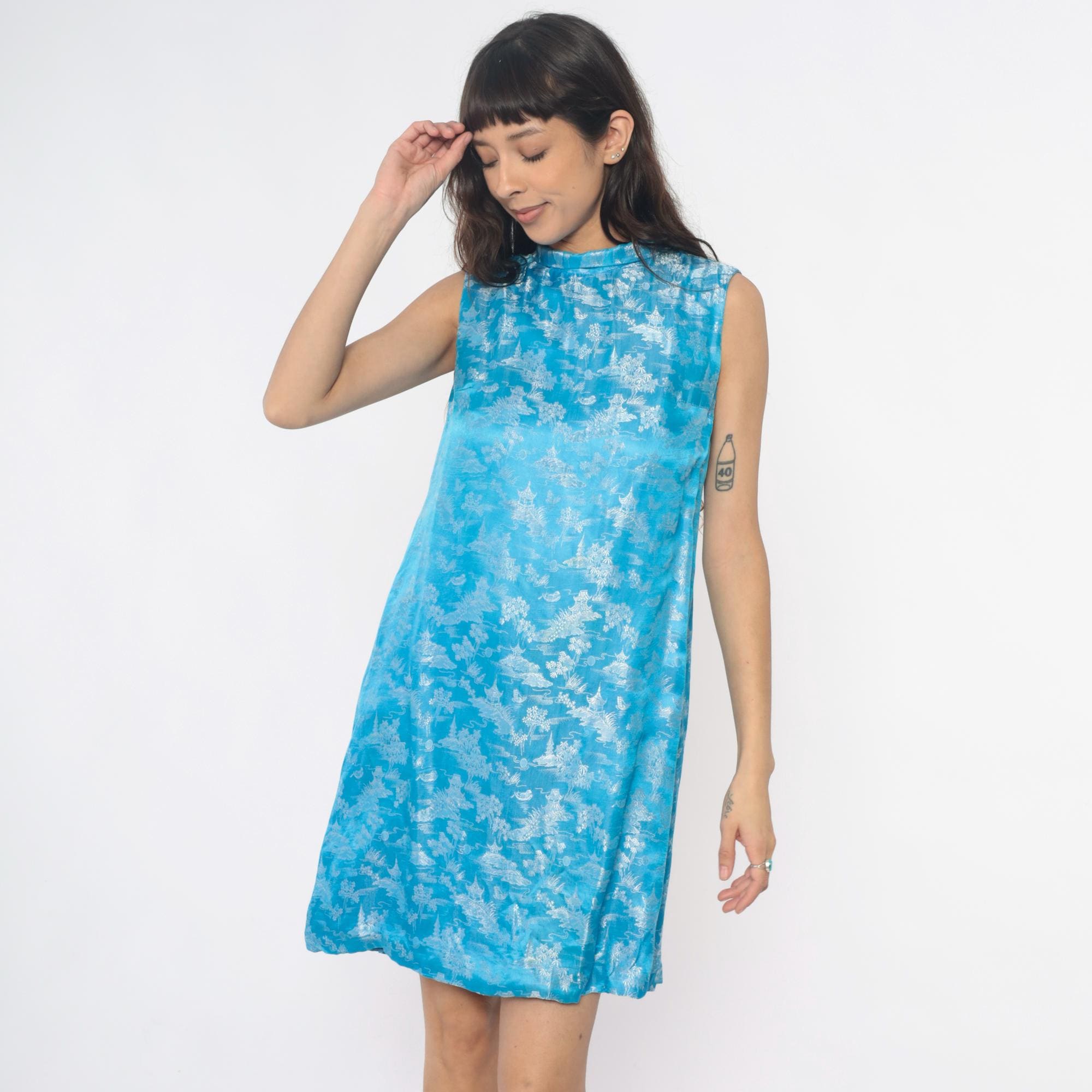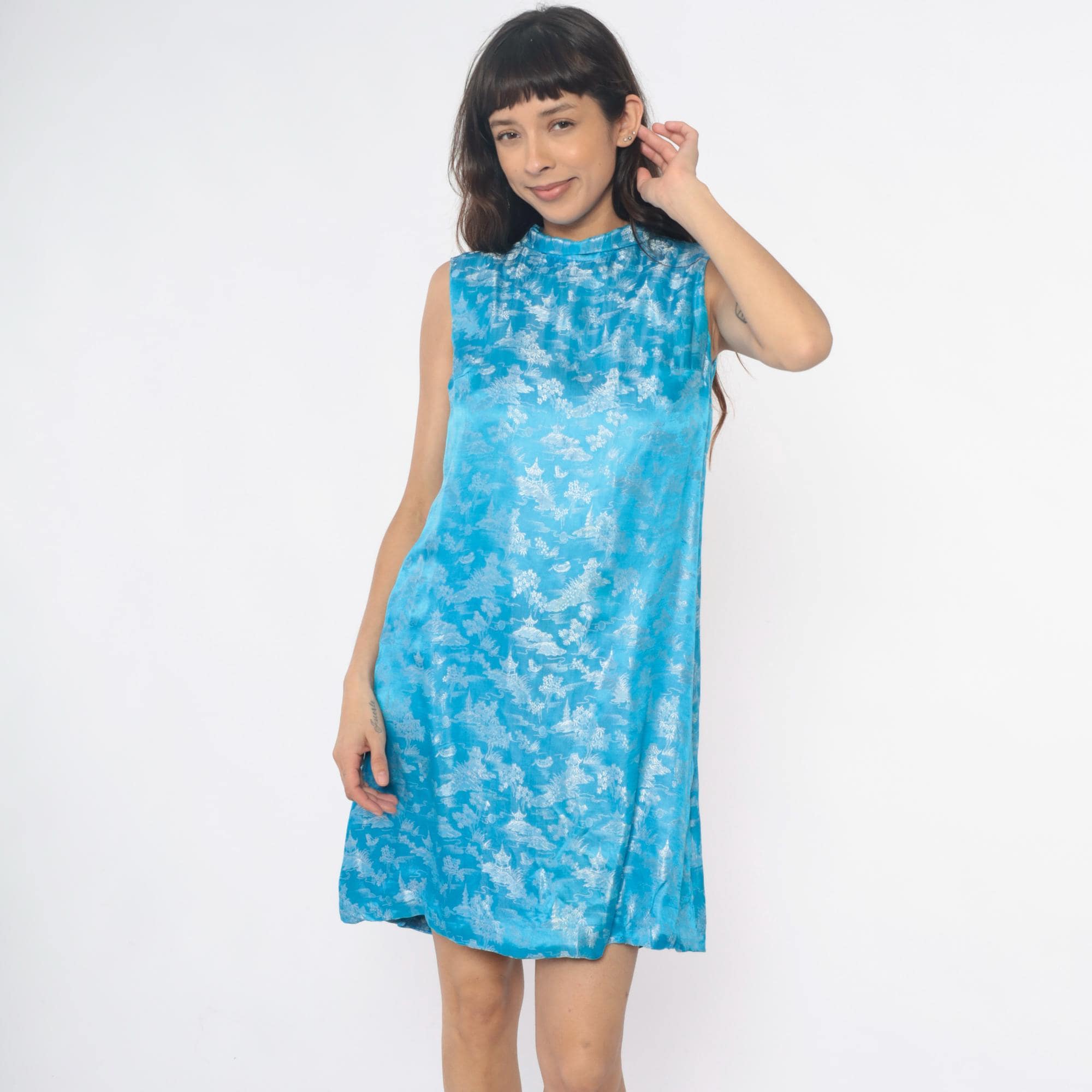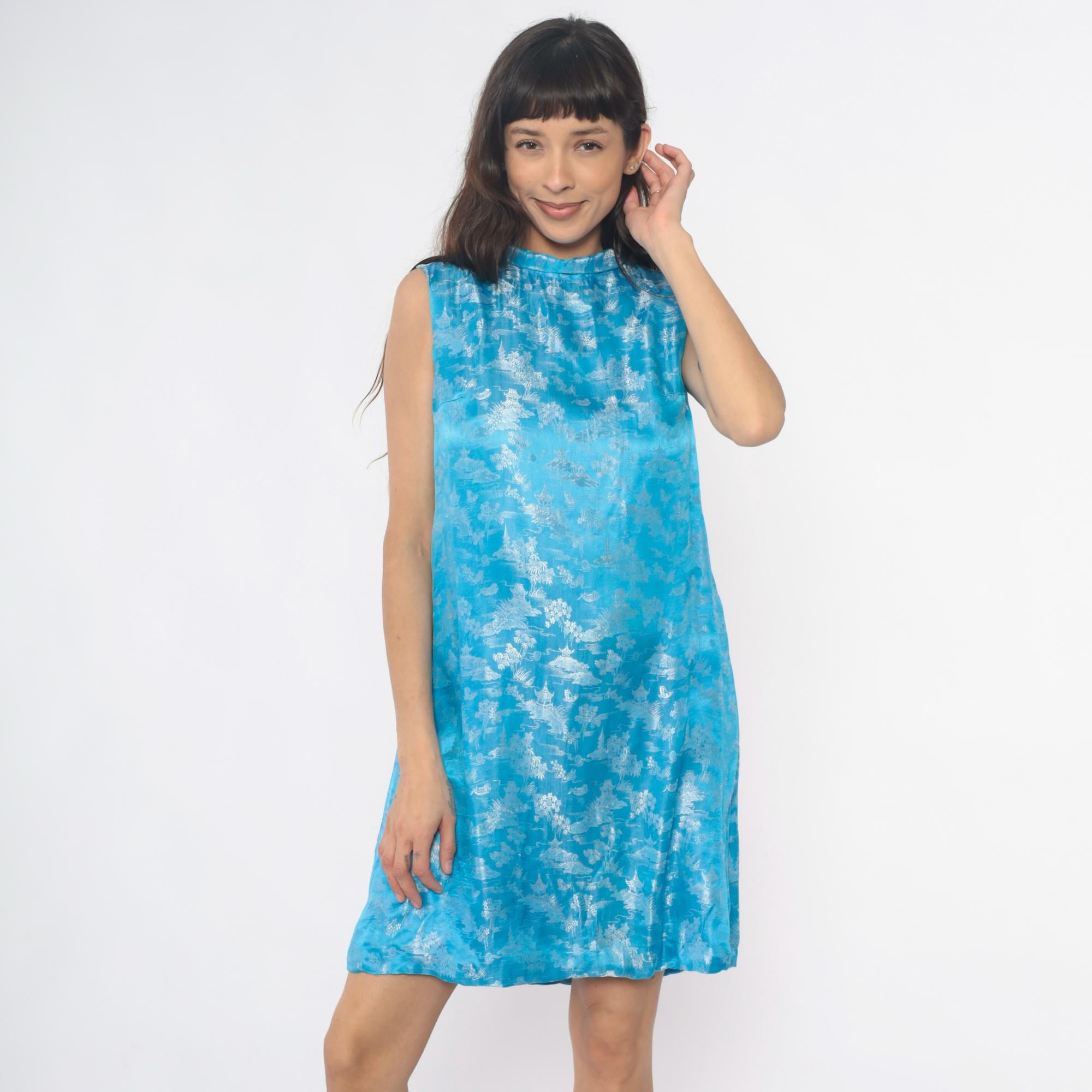60s blue shift dress with Asian-inspired scenic print in white showing pagodas, trees, and landscape motifs throughout. Mock neck collar, sleeveless, A-line silhouette with back zipper closure.