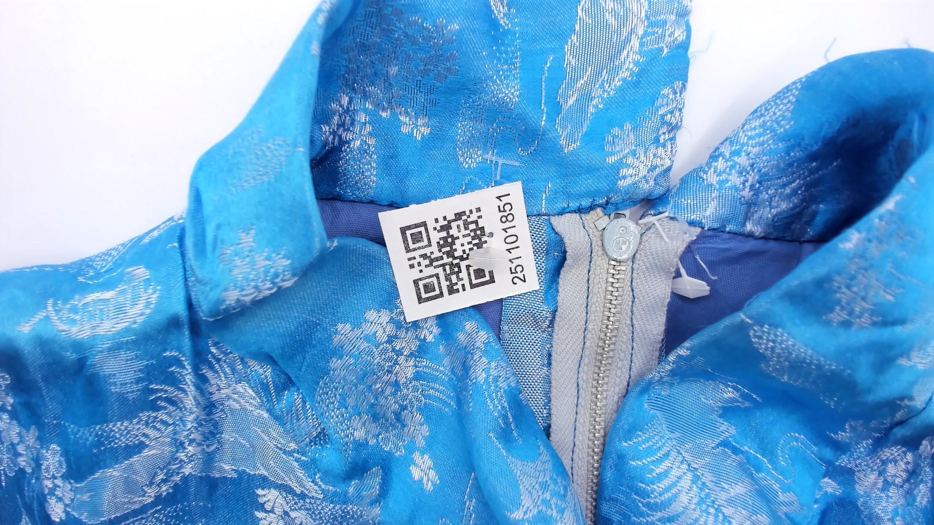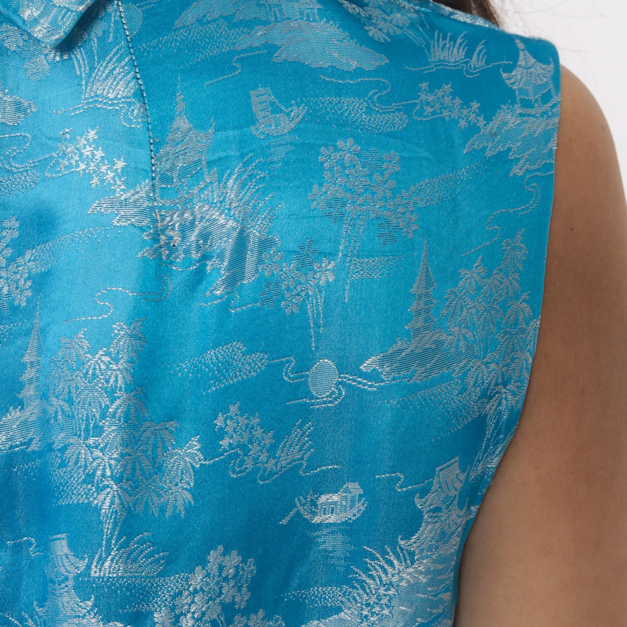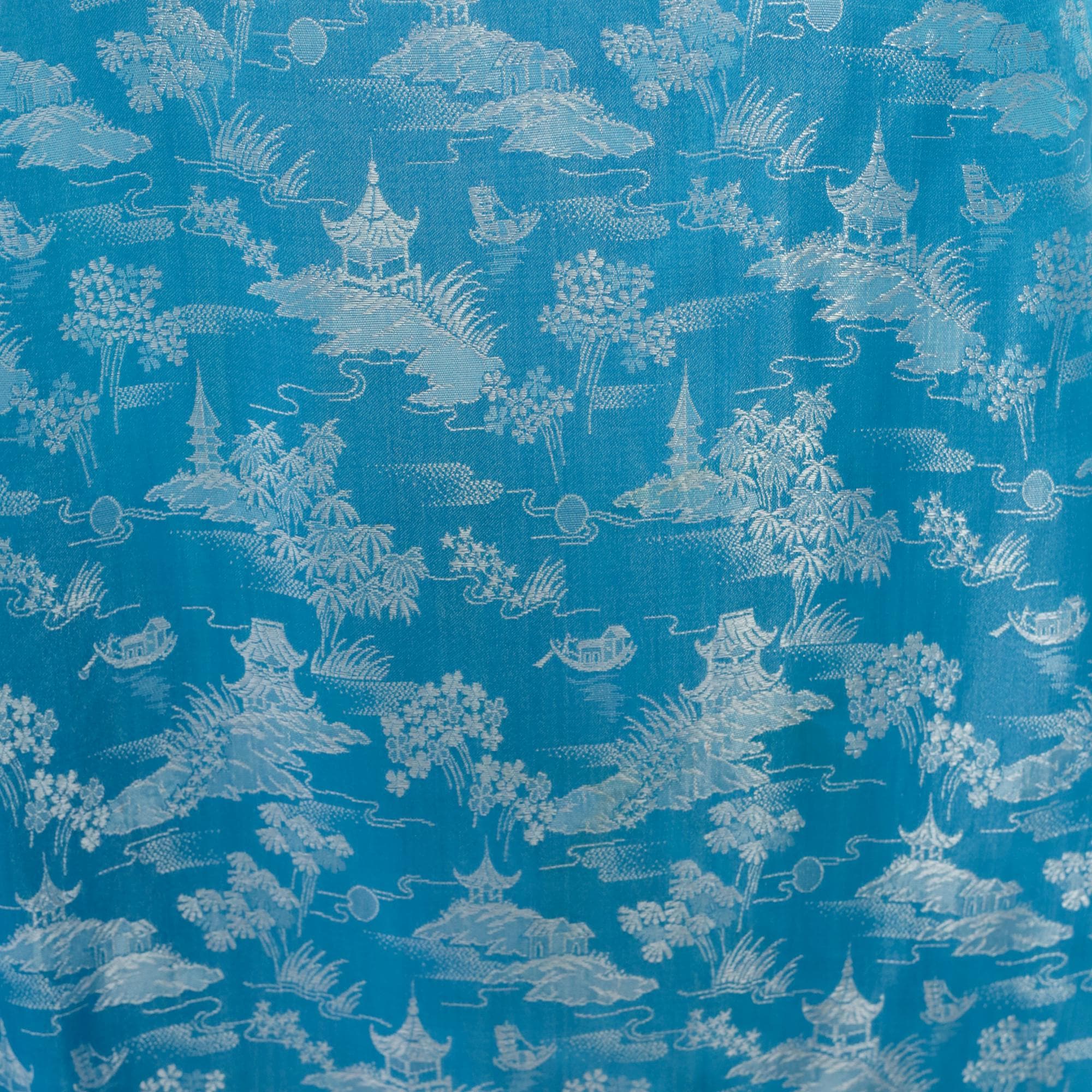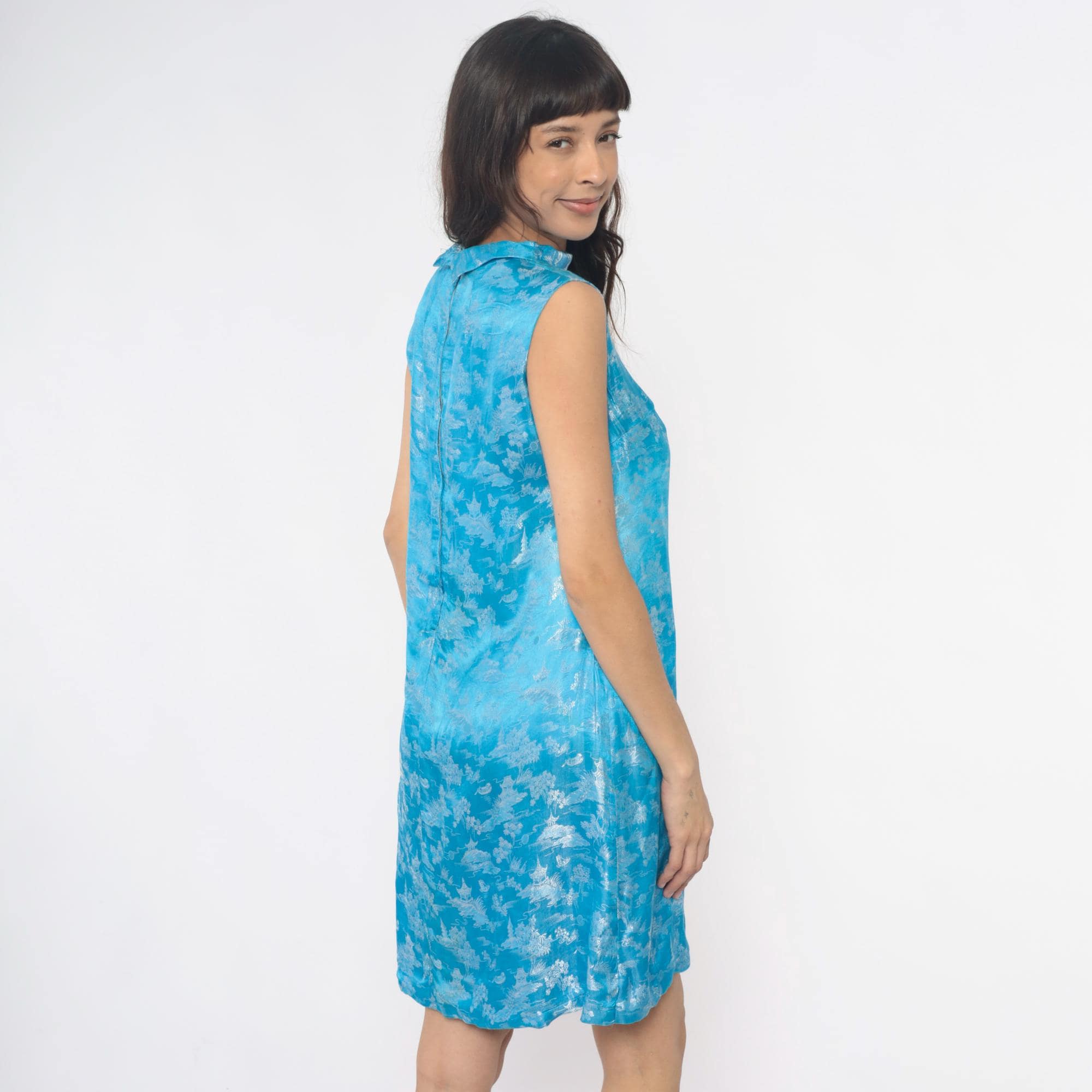 60s blue shift dress with Asian-inspired scenic print in white showing pagodas, trees, and landscape motifs throughout. Mock neck collar, sleeveless, A-line silhouette with back zipper closure.