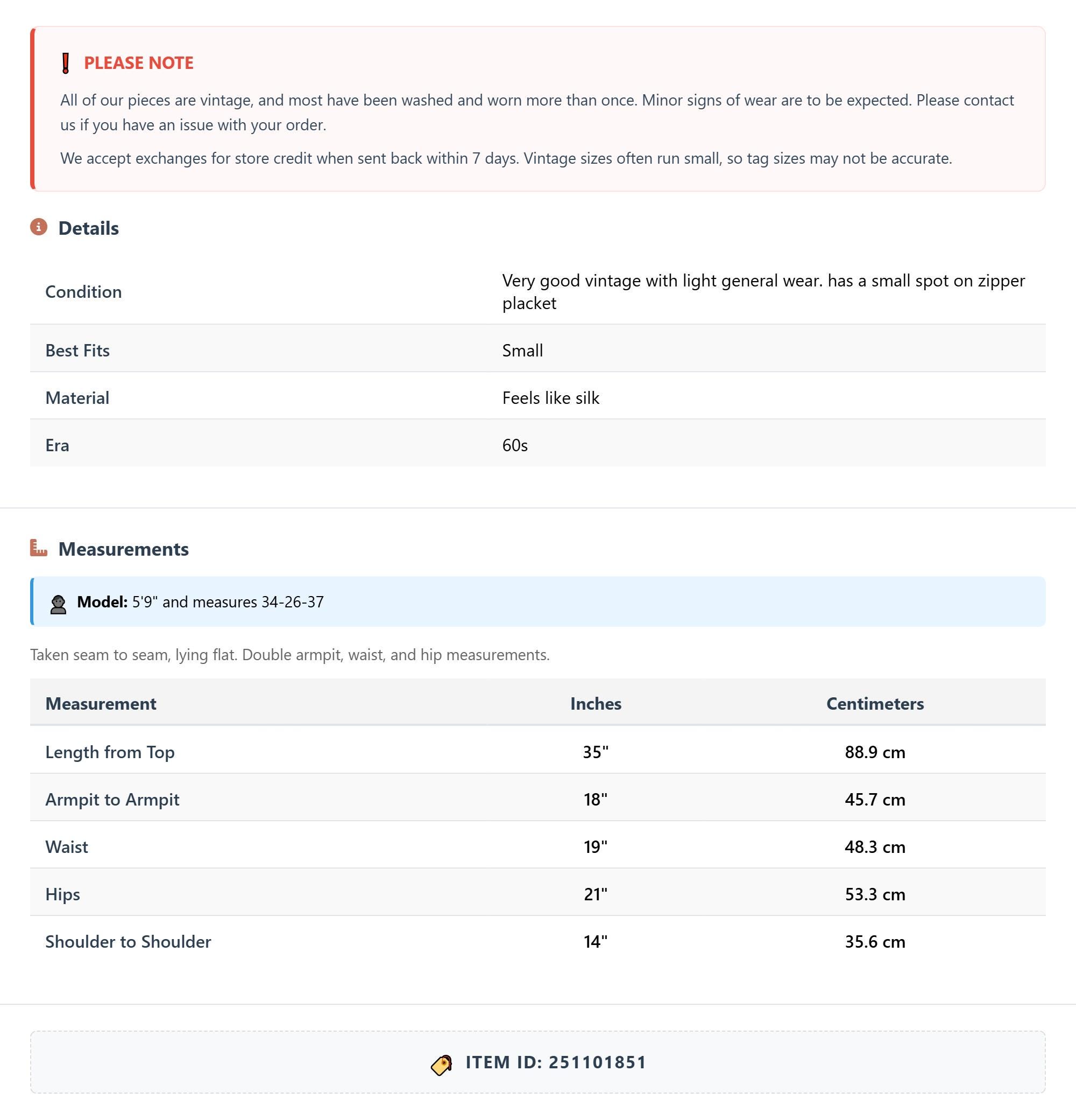 All of our pieces are vintage, and most have been washed and worn more than once. Minor signs of wear are to be expected. Please contact us if you have an issue with your order. We accept exchanges for store credit when sent back within 7 days.