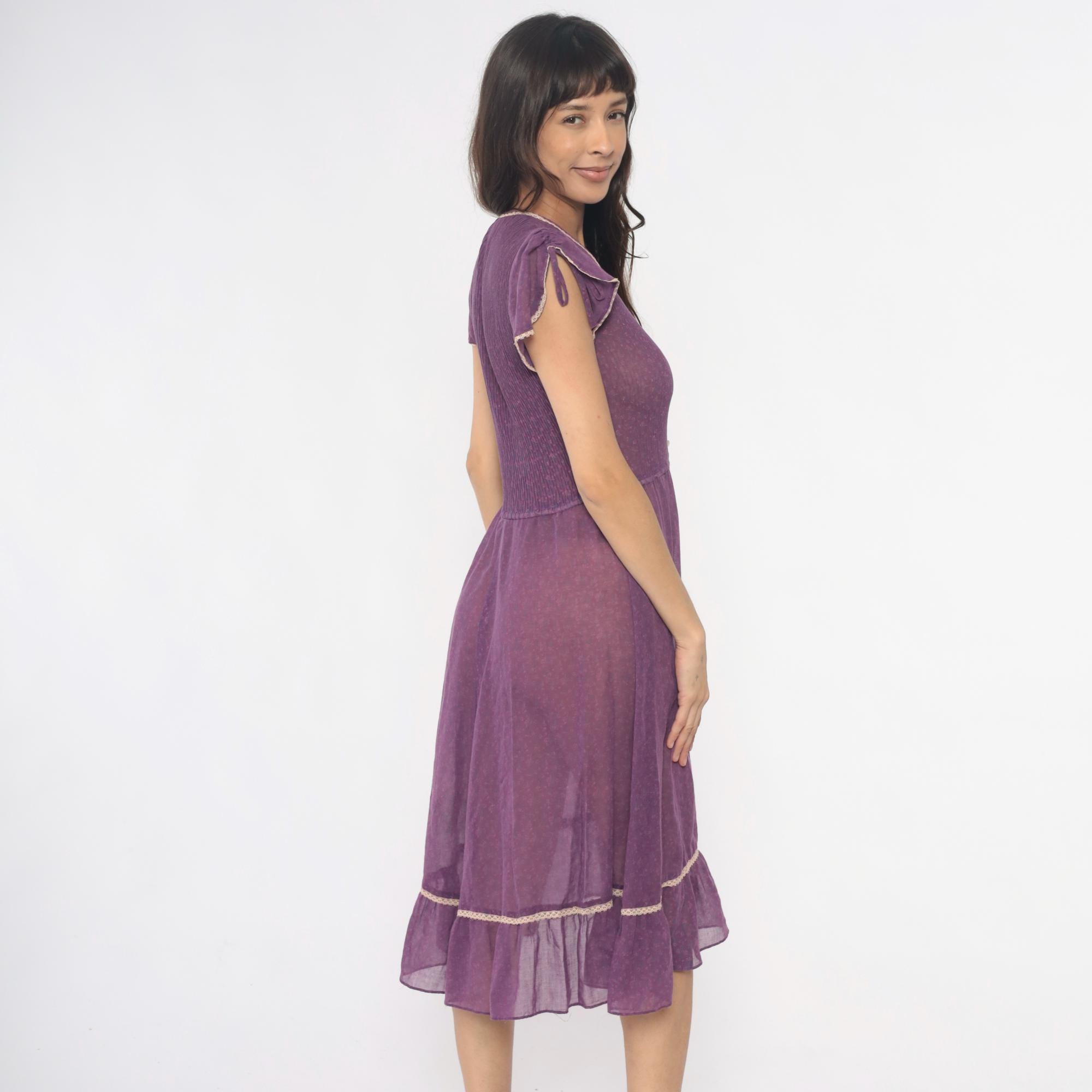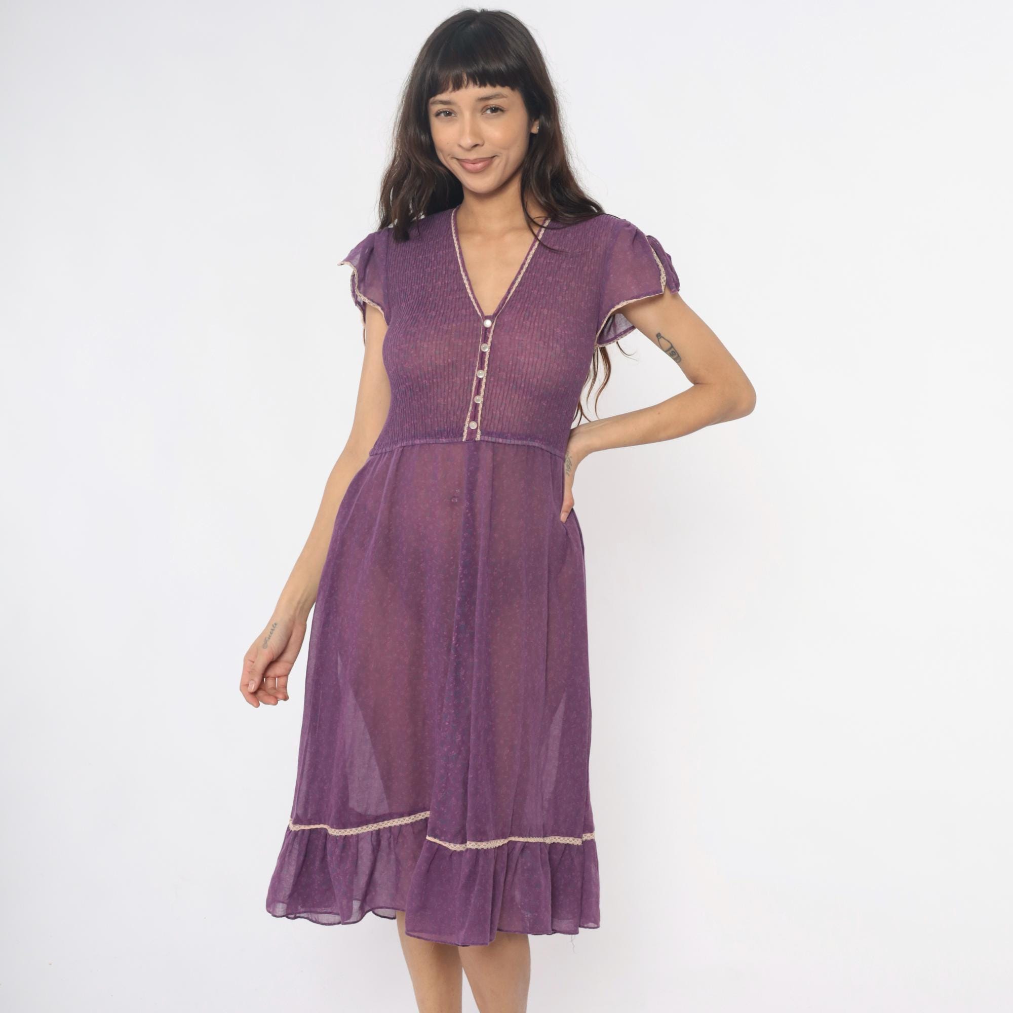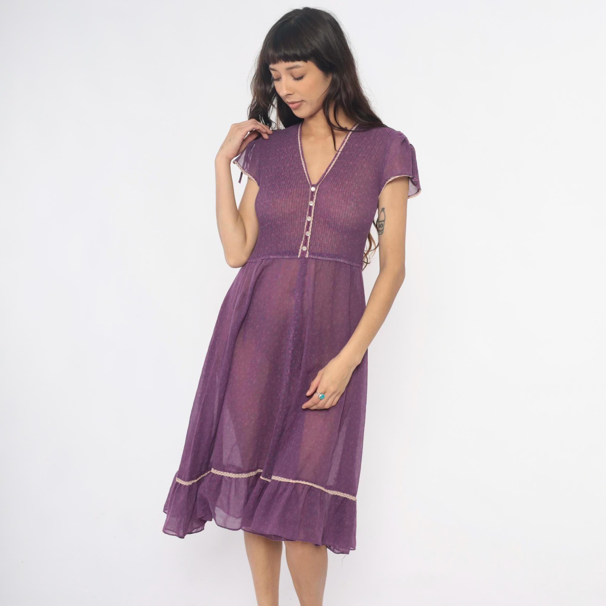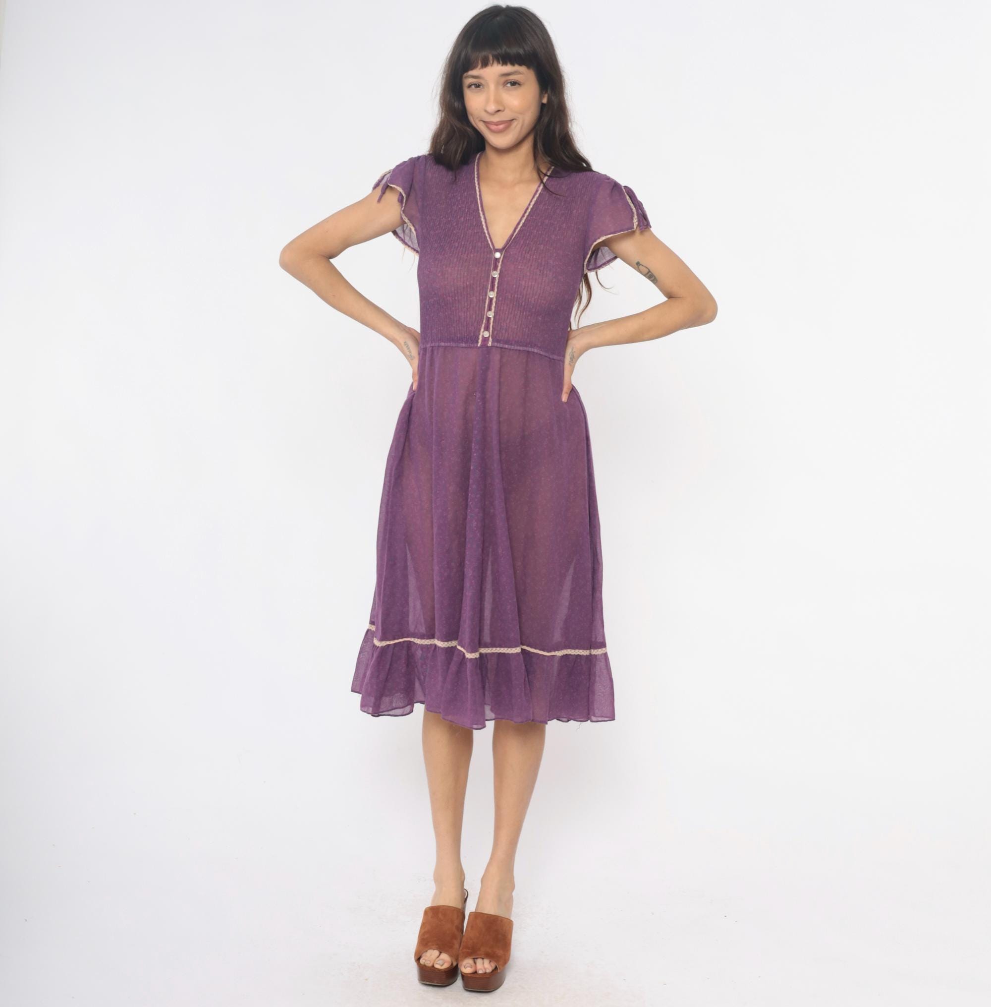 70s purple midi dress with ribbed knit bodice and sheer chiffon tiered skirt. V-neck with faux button front , decorative white trim along neckline and buttons, short cap sleeves with tie details at shoulders. Empire waist seam, gathered skirt with ruffle tier and matching white trim at hem.