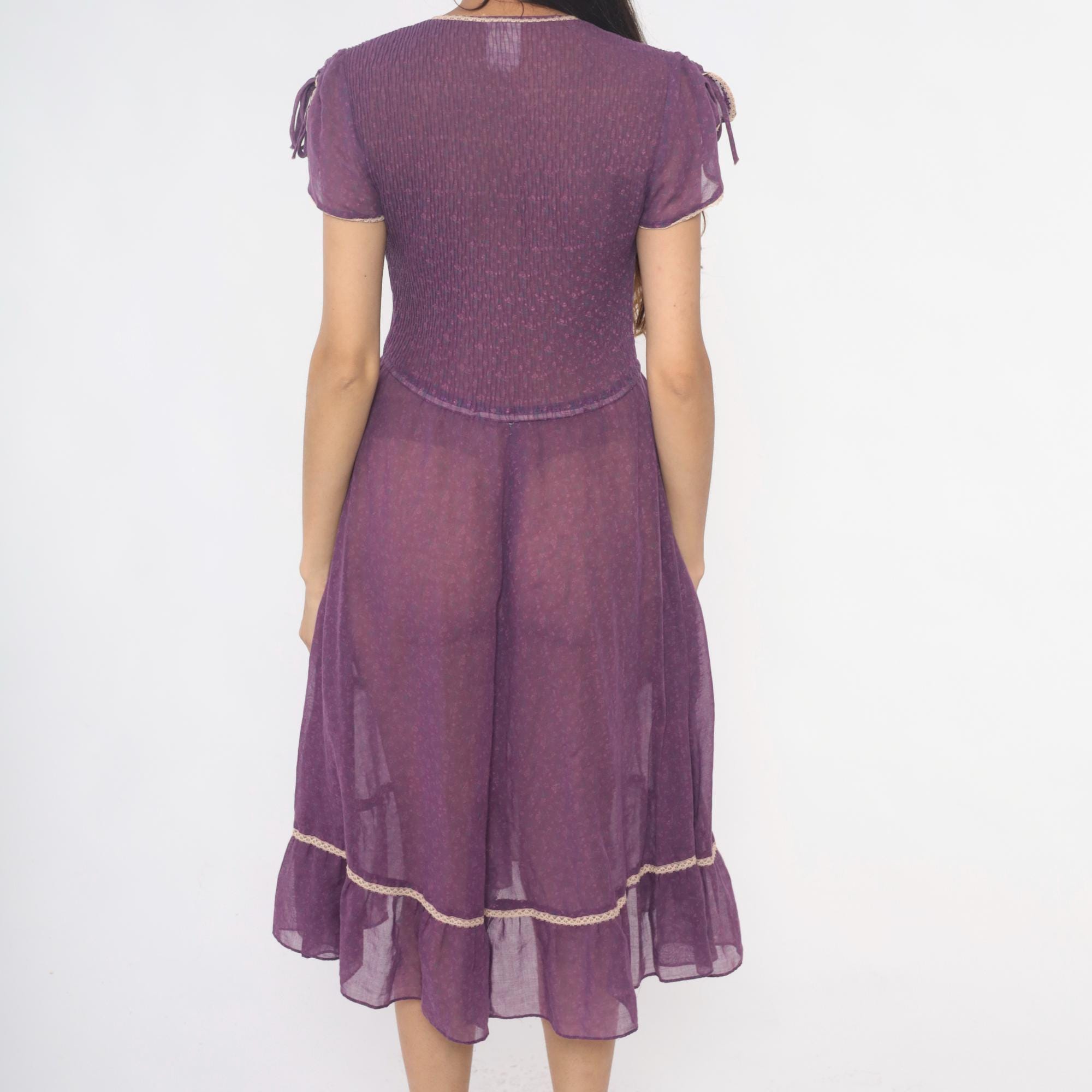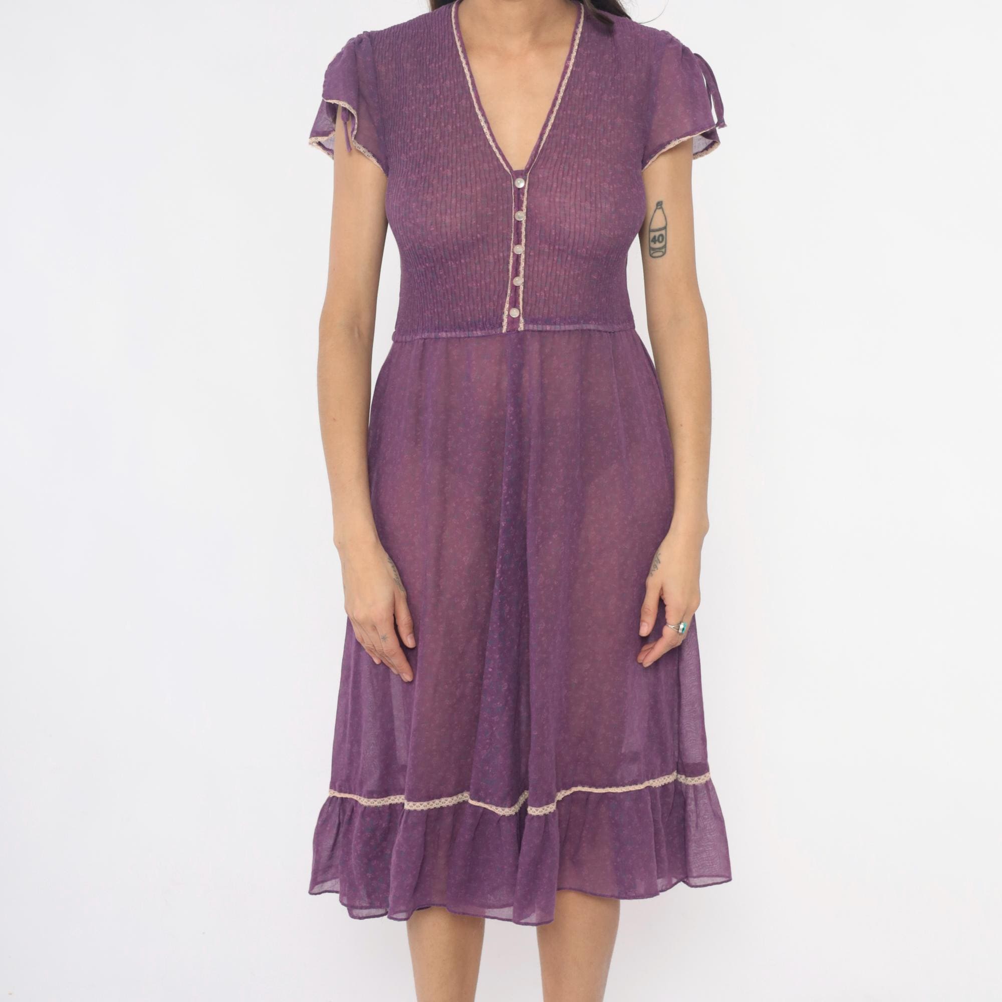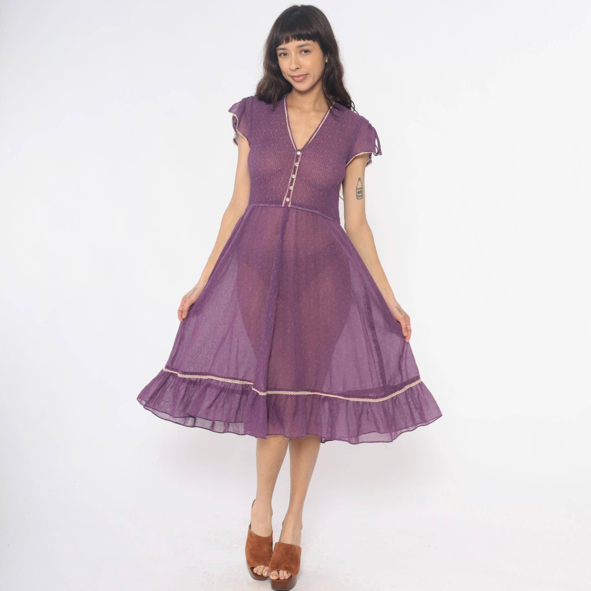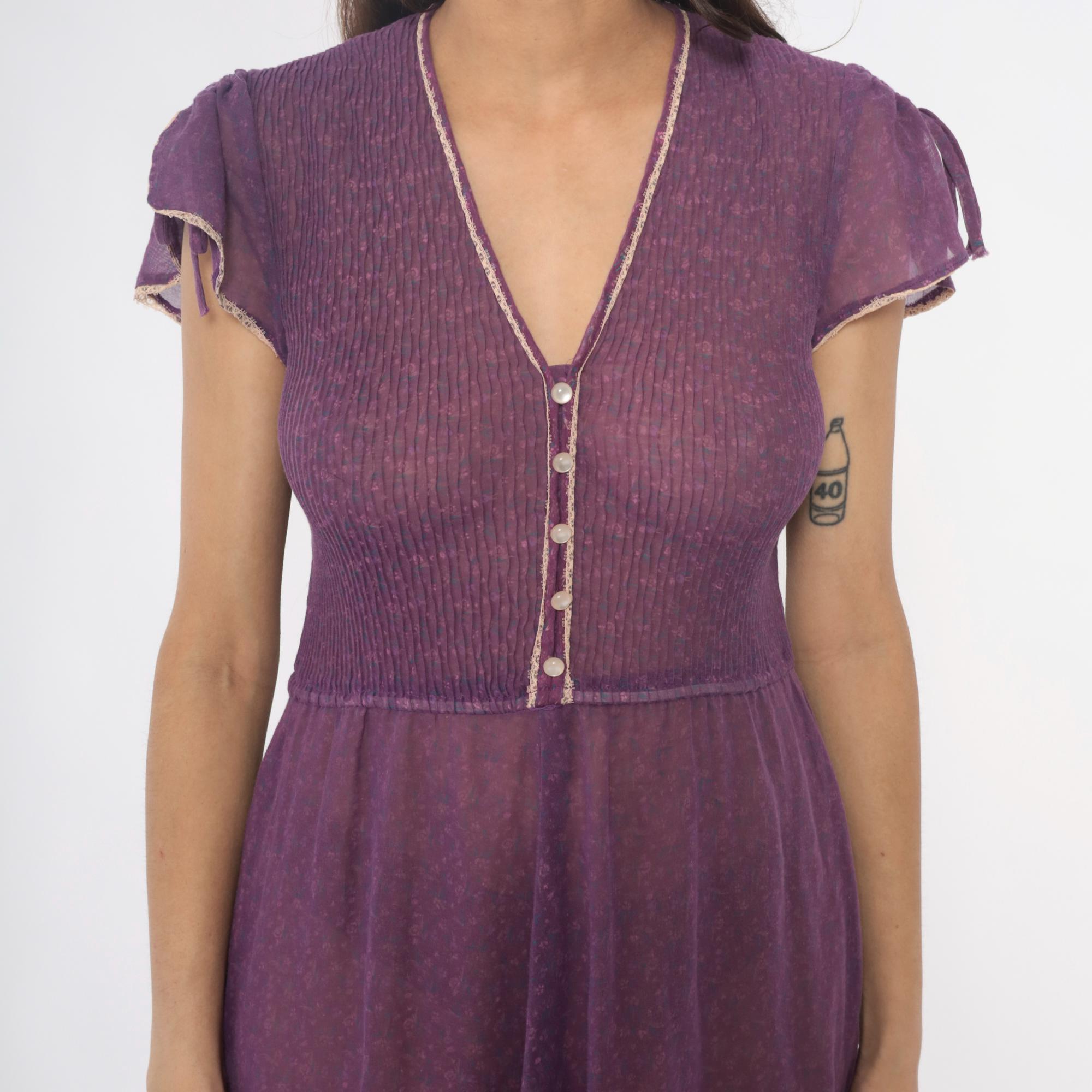 70s purple midi dress with ribbed knit bodice and sheer chiffon tiered skirt. V-neck with faux button front , decorative white trim along neckline and buttons, short cap sleeves with tie details at shoulders. Empire waist seam, gathered skirt with ruffle tier and matching white trim at hem.