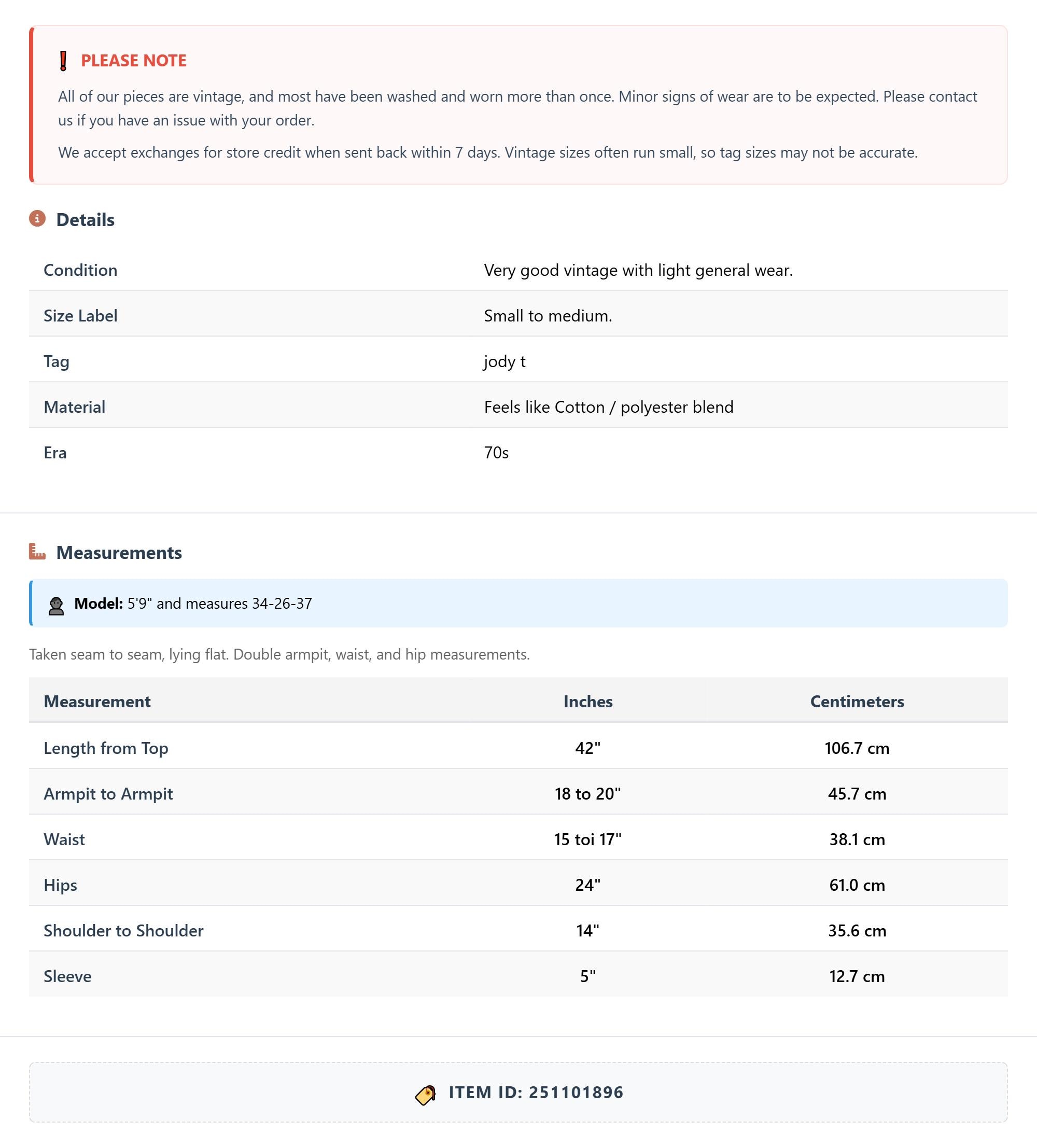 All of our pieces are vintage, and most have been washed and worn more than once. Minor signs of wear are to be expected. Please contact us if you have an issue with your order. We accept exchanges for store credit when sent back within 7 days.