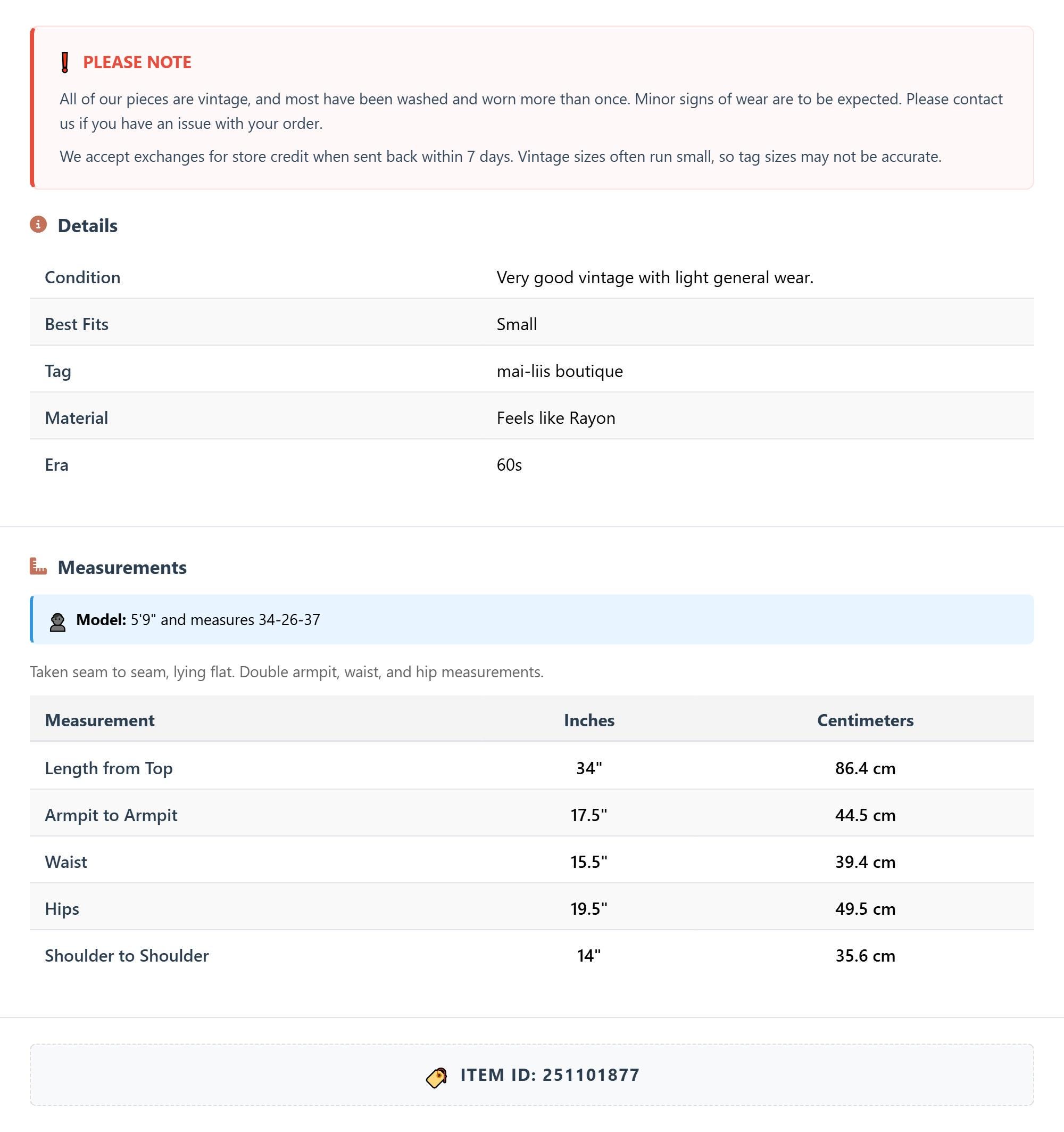 All of our pieces are vintage, and most have been washed and worn more than once. Minor signs of wear are to be expected. Please contact us if you have an issue with your order. We accept exchanges for store credit when sent back within 7 days.