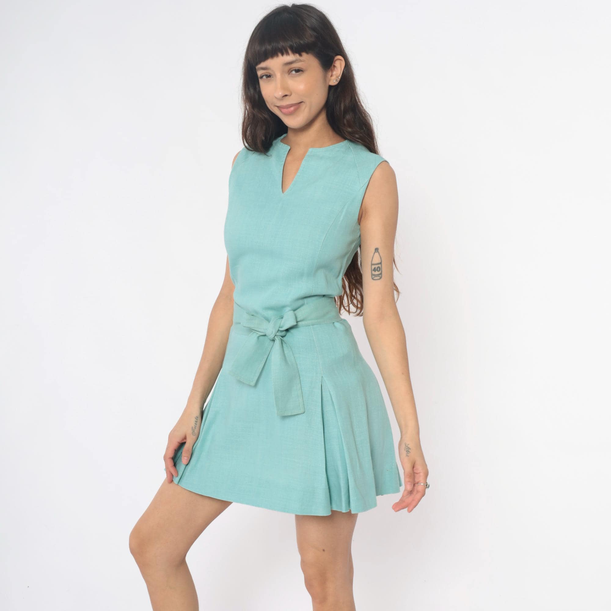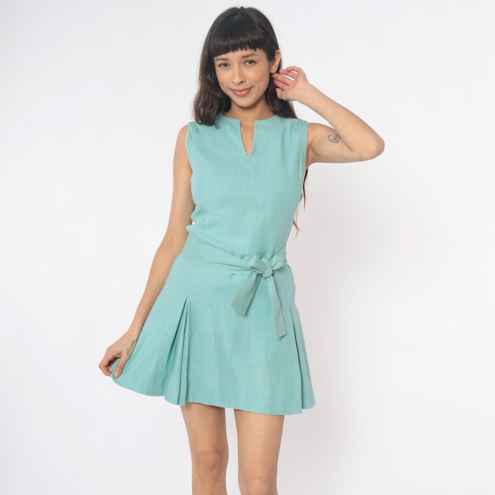 60s mint green mini dress from mai-liis boutique with sleeveless bodice, V-neck, and pointed collar detail. Self-tie belt at natural waist, pleated skirt.