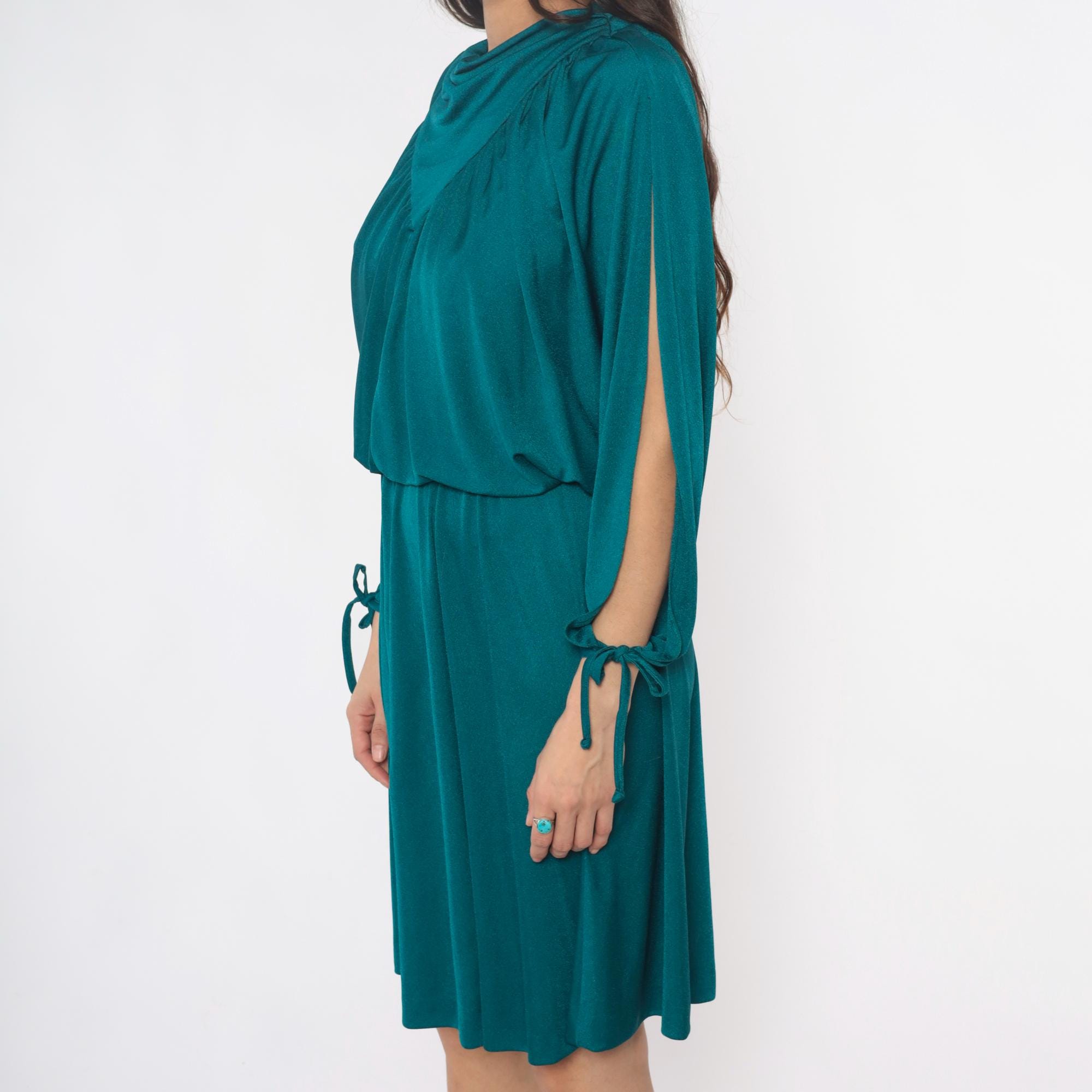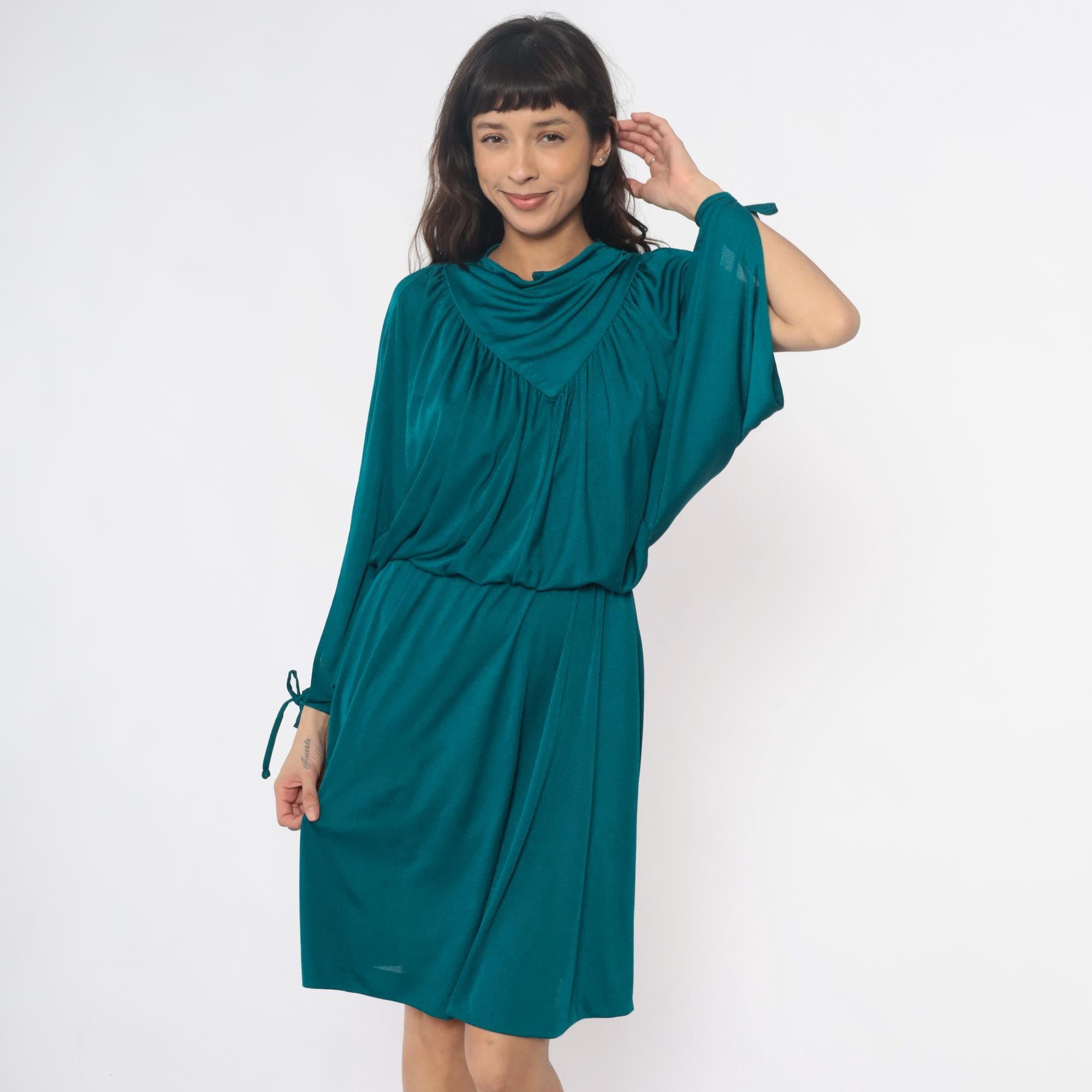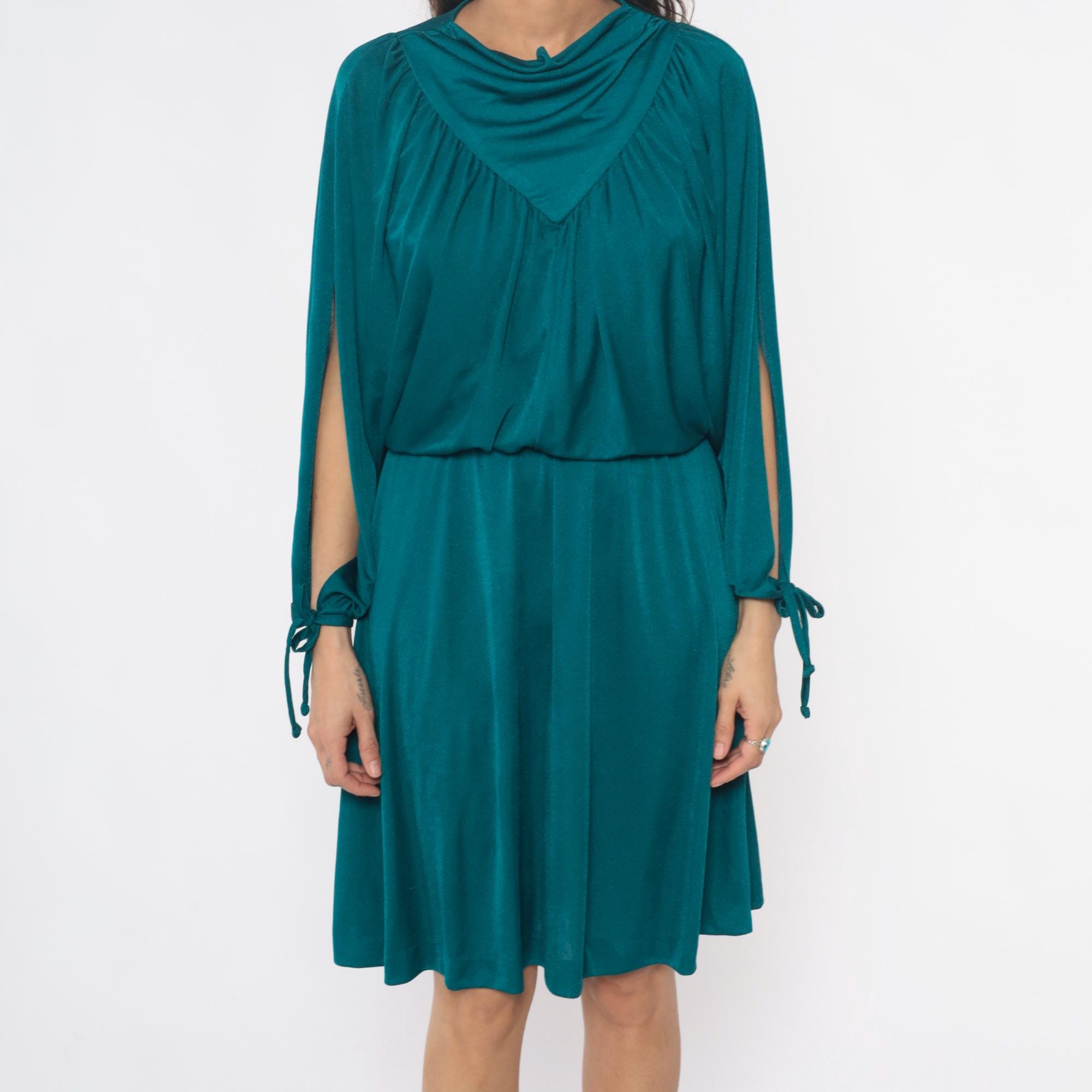 80s teal dress with draped cowl neckline and split sleeves with tie closures at the wrists. V-shaped yoke detail at front and back, gathered bodice with elastic waist, knee-length skirt. Back zipper closure.