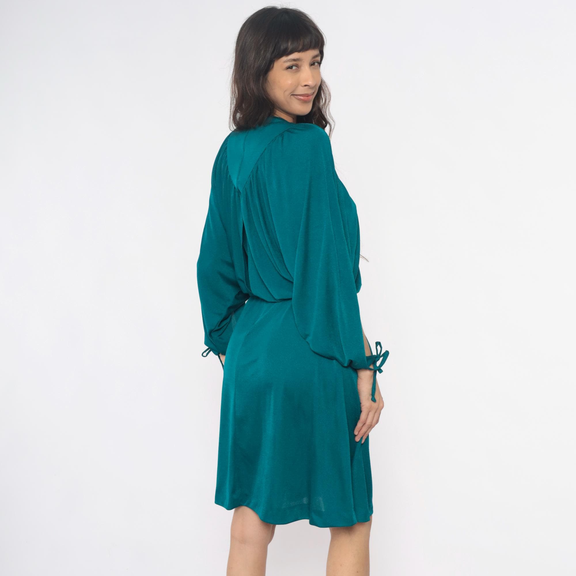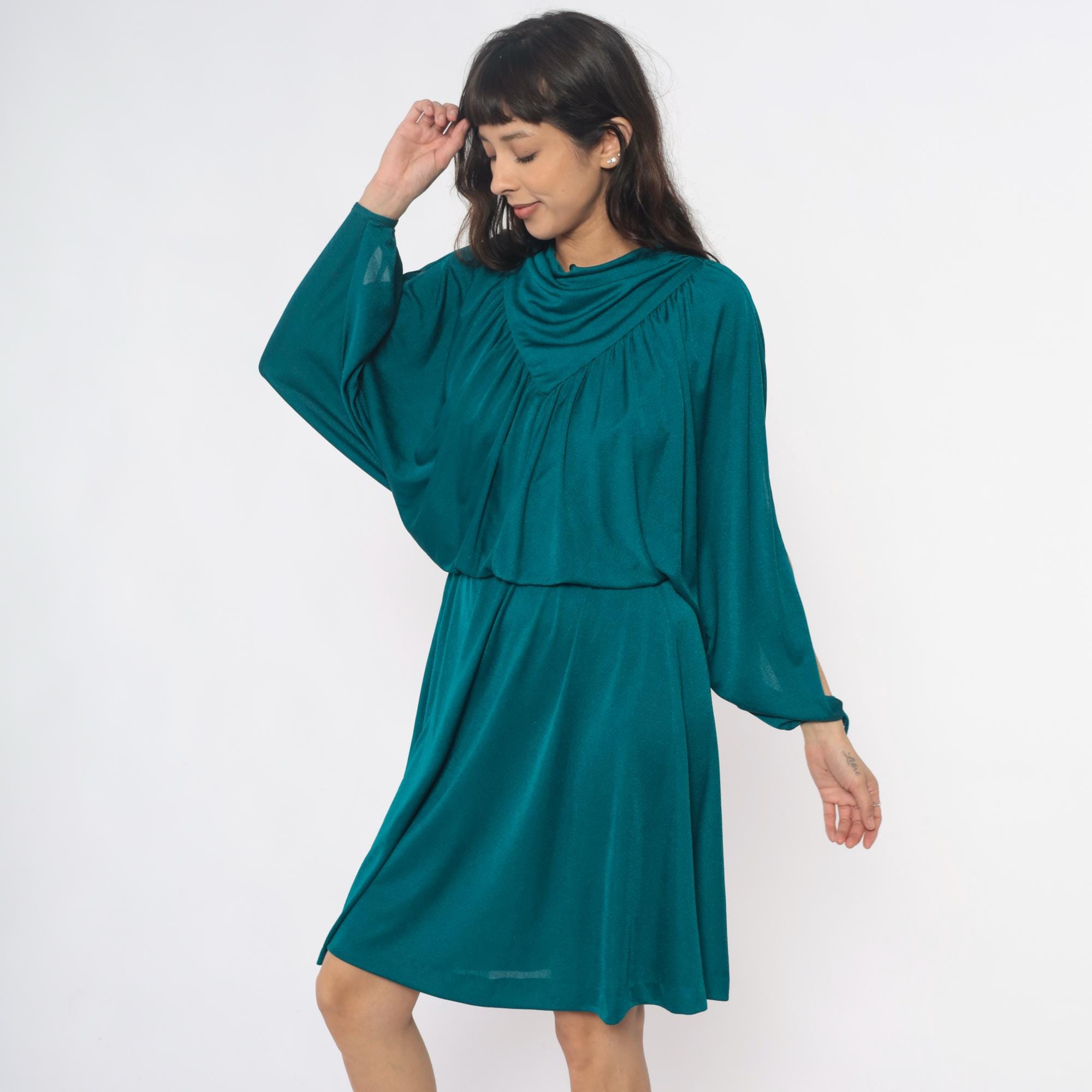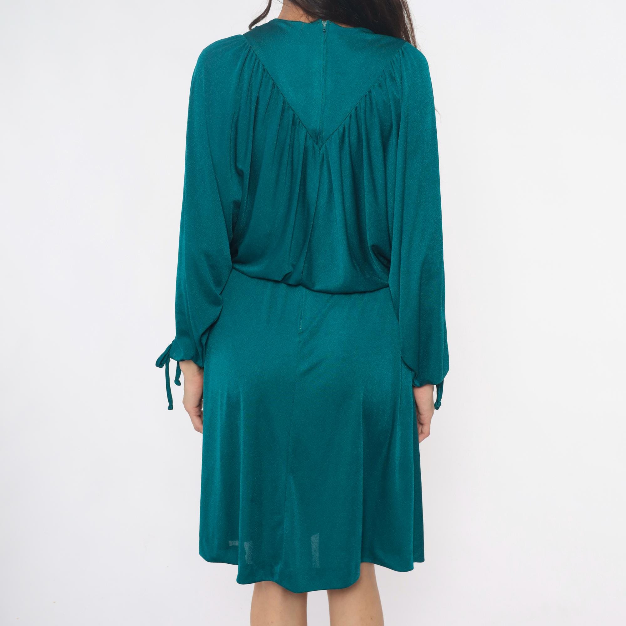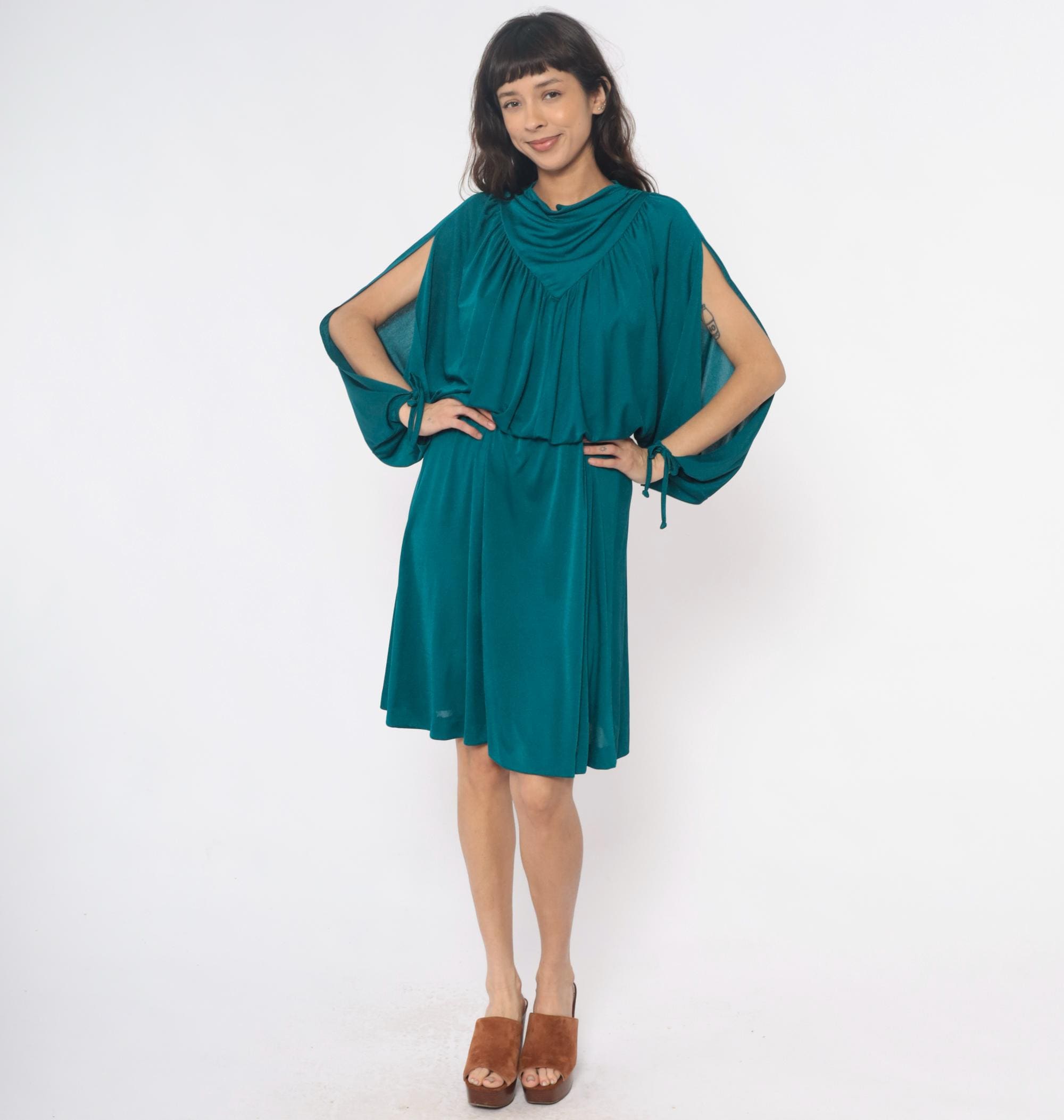 80s teal dress with draped cowl neckline and split sleeves with tie closures at the wrists. V-shaped yoke detail at front and back, gathered bodice with elastic waist, knee-length skirt. Back zipper closure.