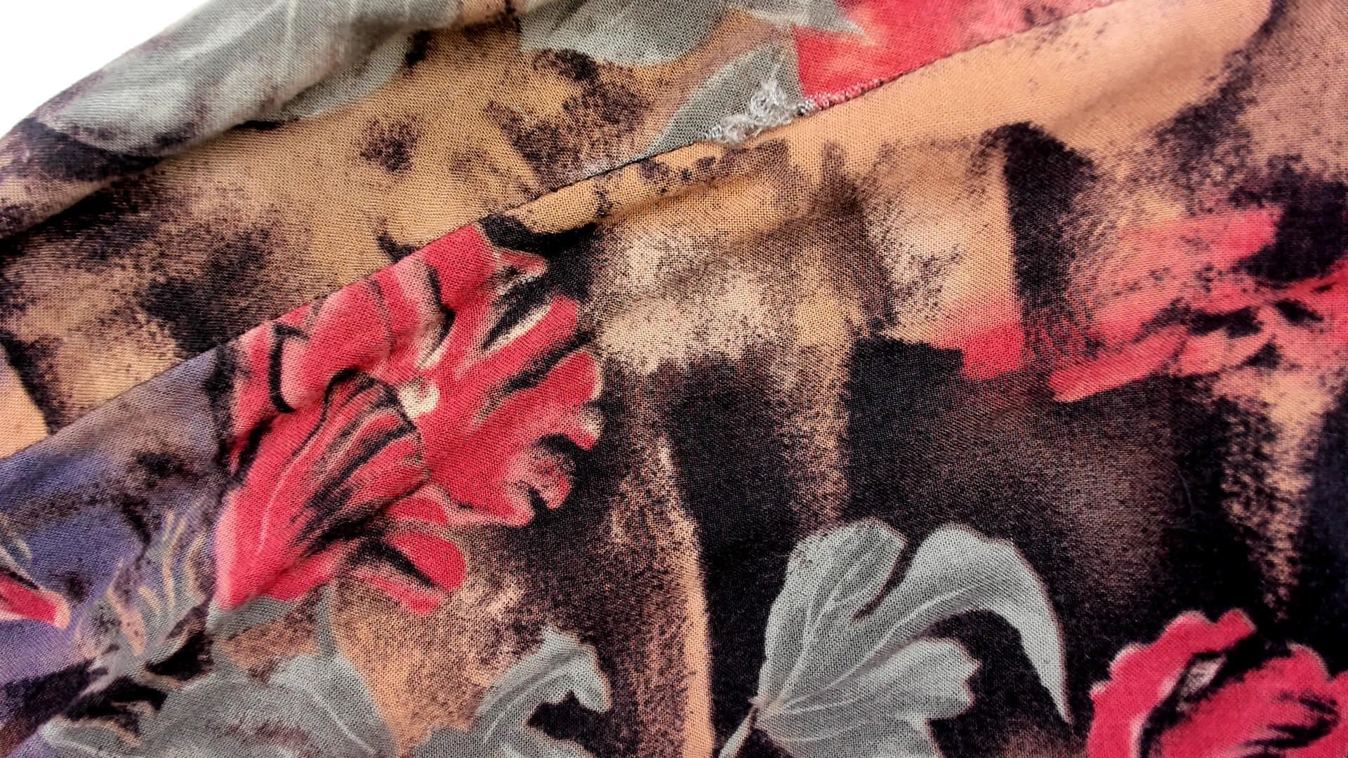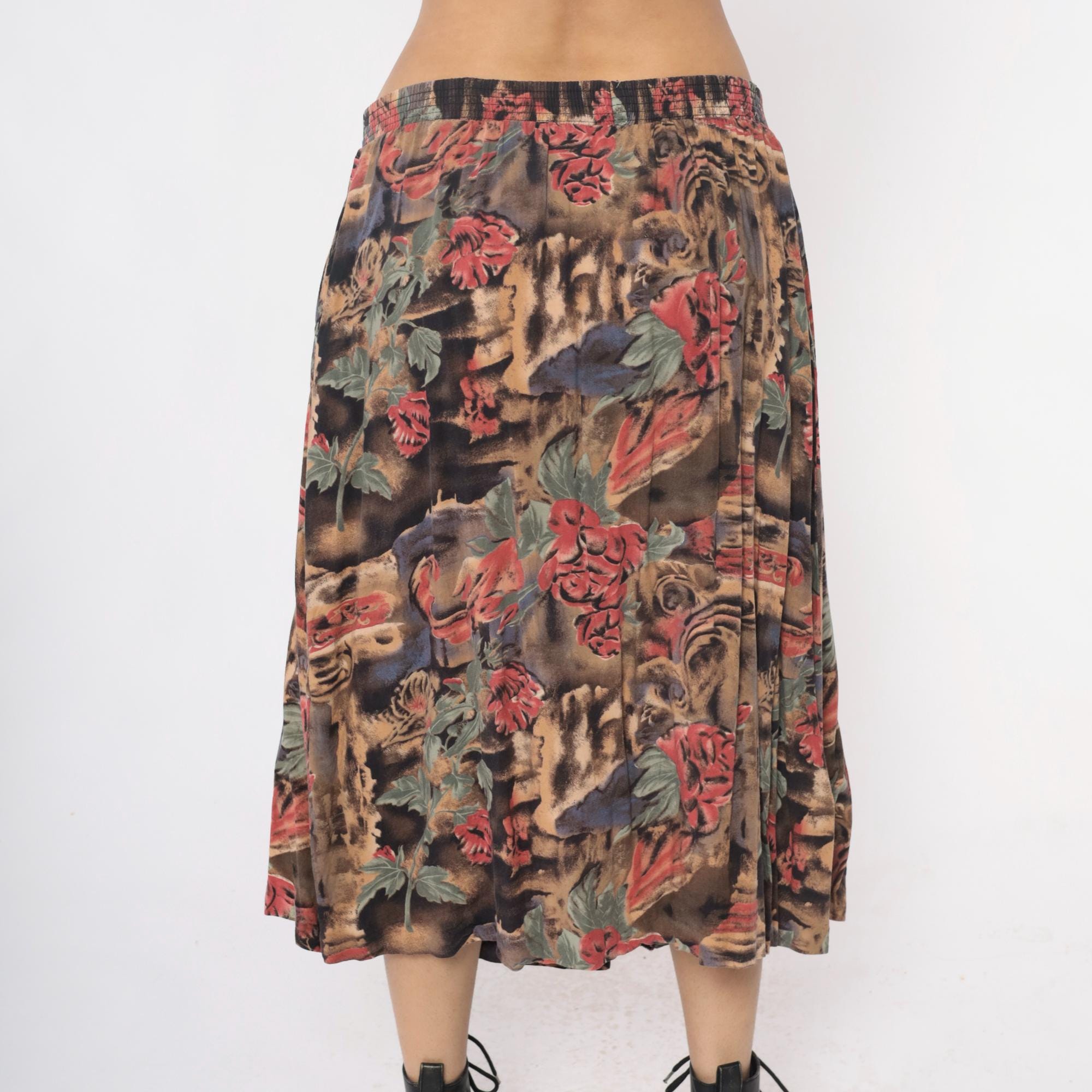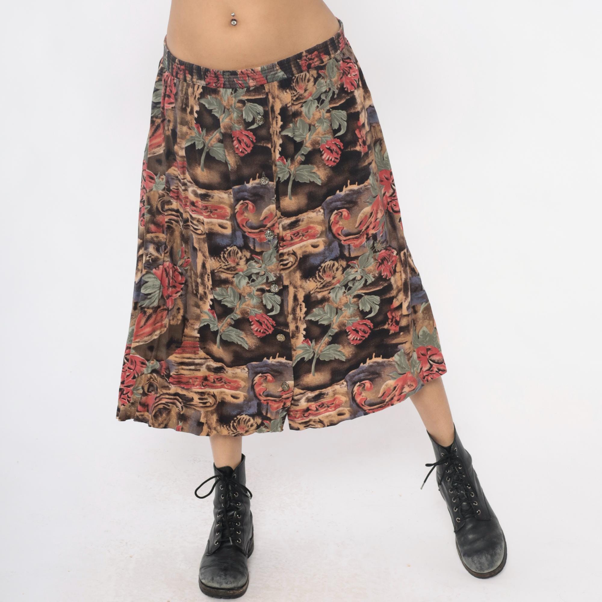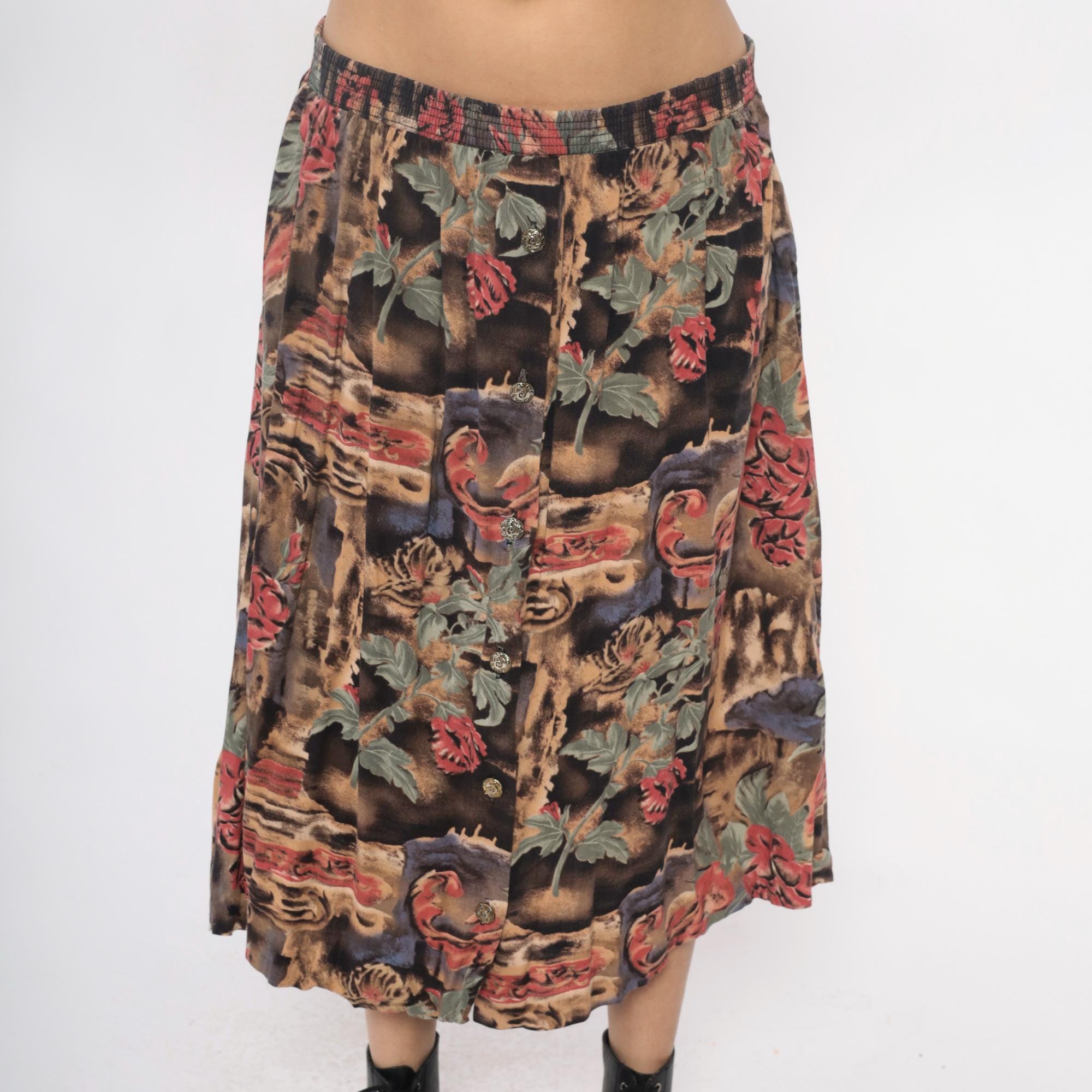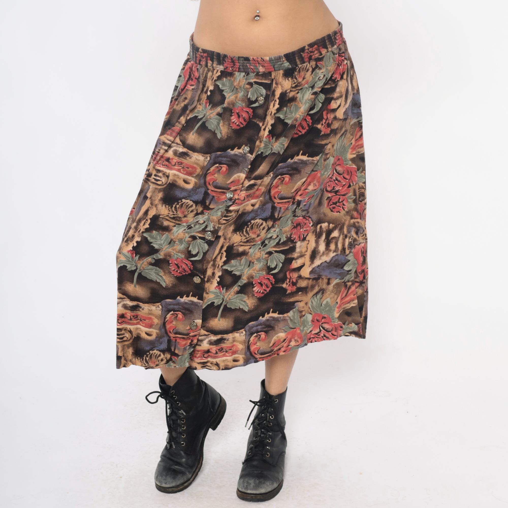 90s skirt with floral print in pink and coral flowers with sage green leaves across a dark brown and black watercolor-style background. Button front closure with decorative buttons, elastic waistband, flared A-line silhouette.