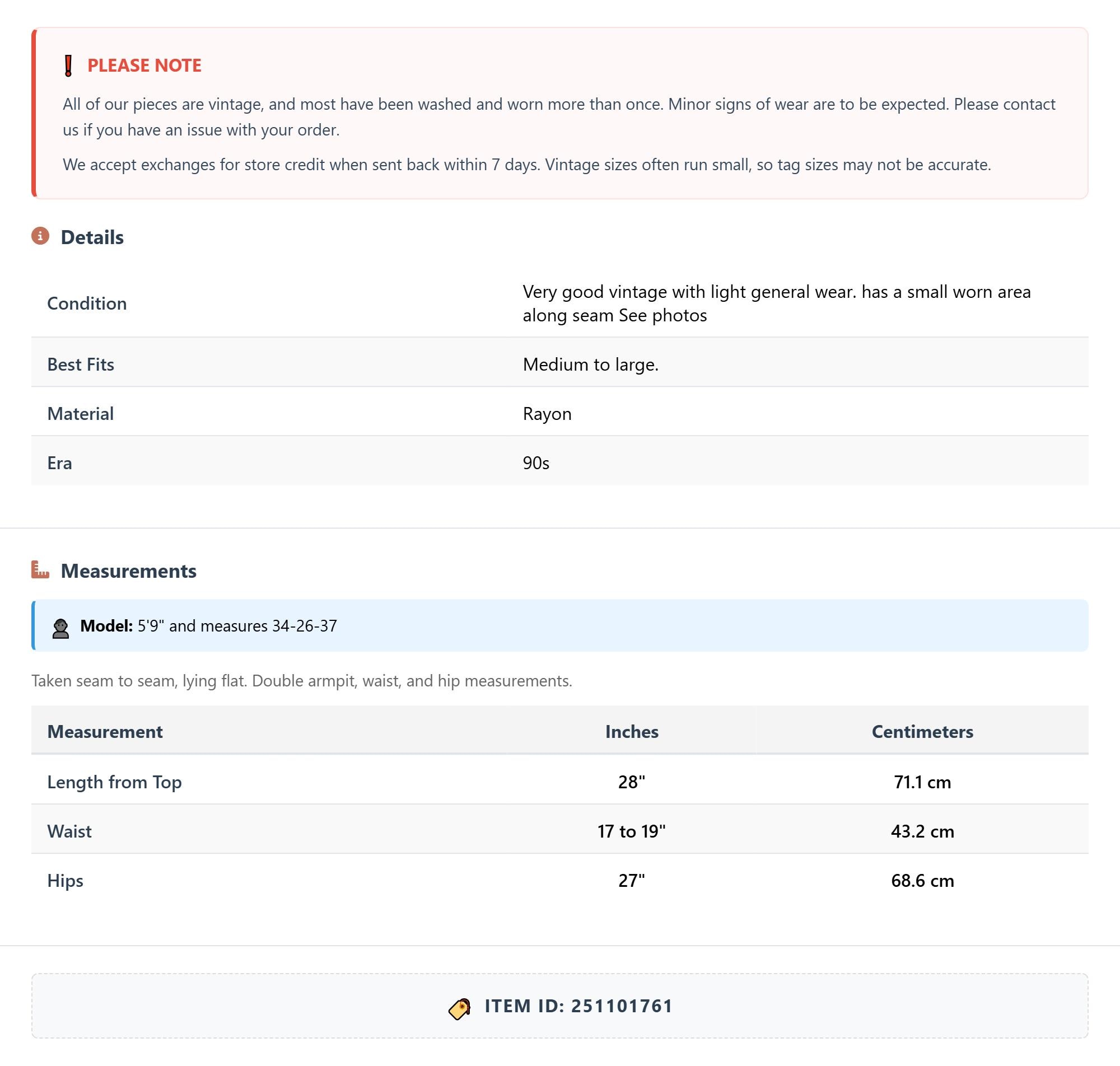 All of our pieces are vintage, and most have been washed and worn more than once. Minor signs of wear are to be expected. Please contact us if you have an issue with your order. We accept exchanges for store credit when sent back within 7 days.