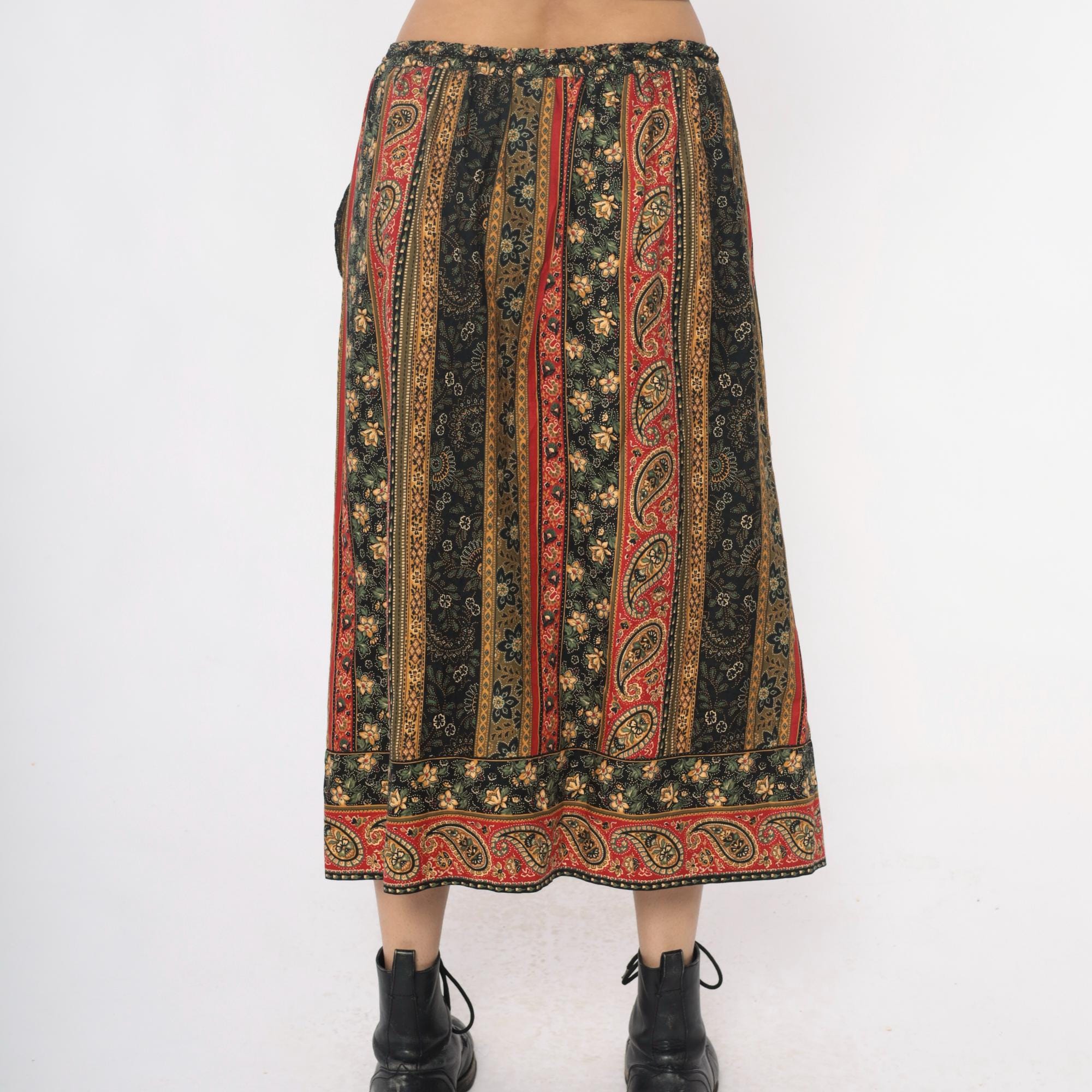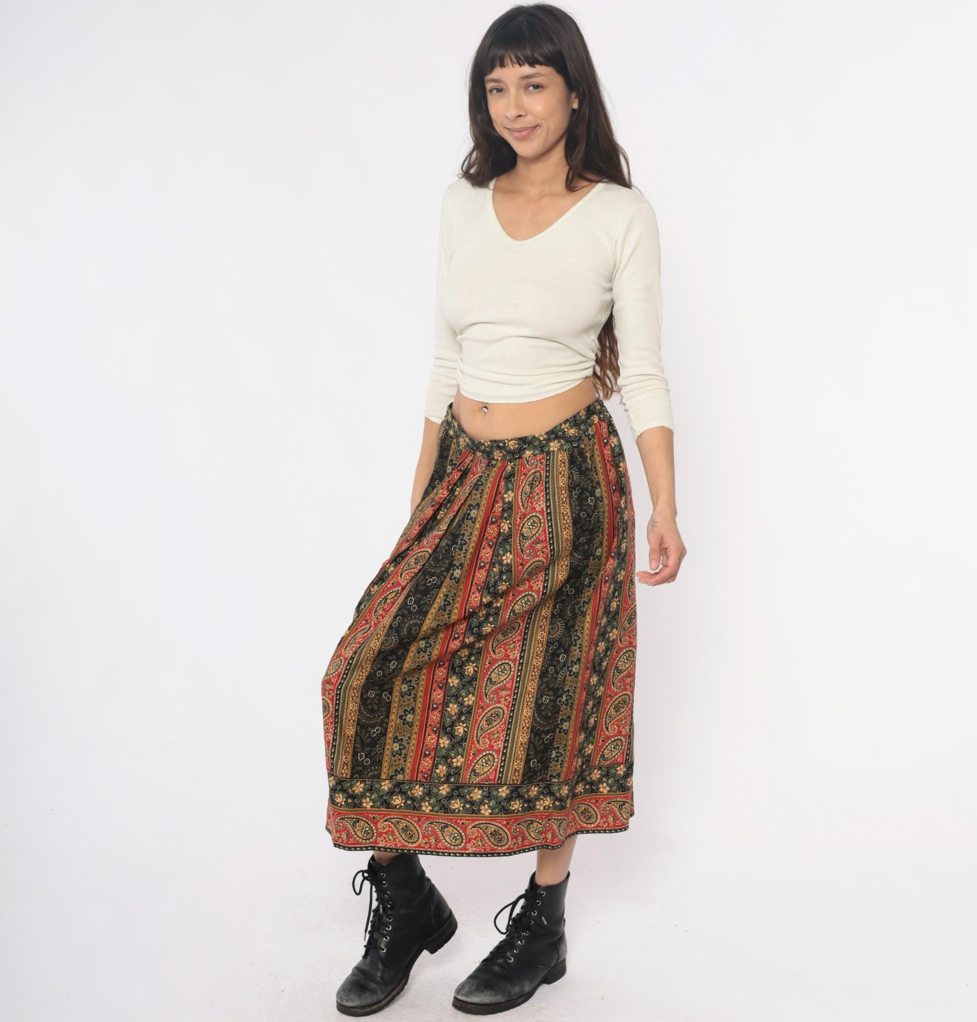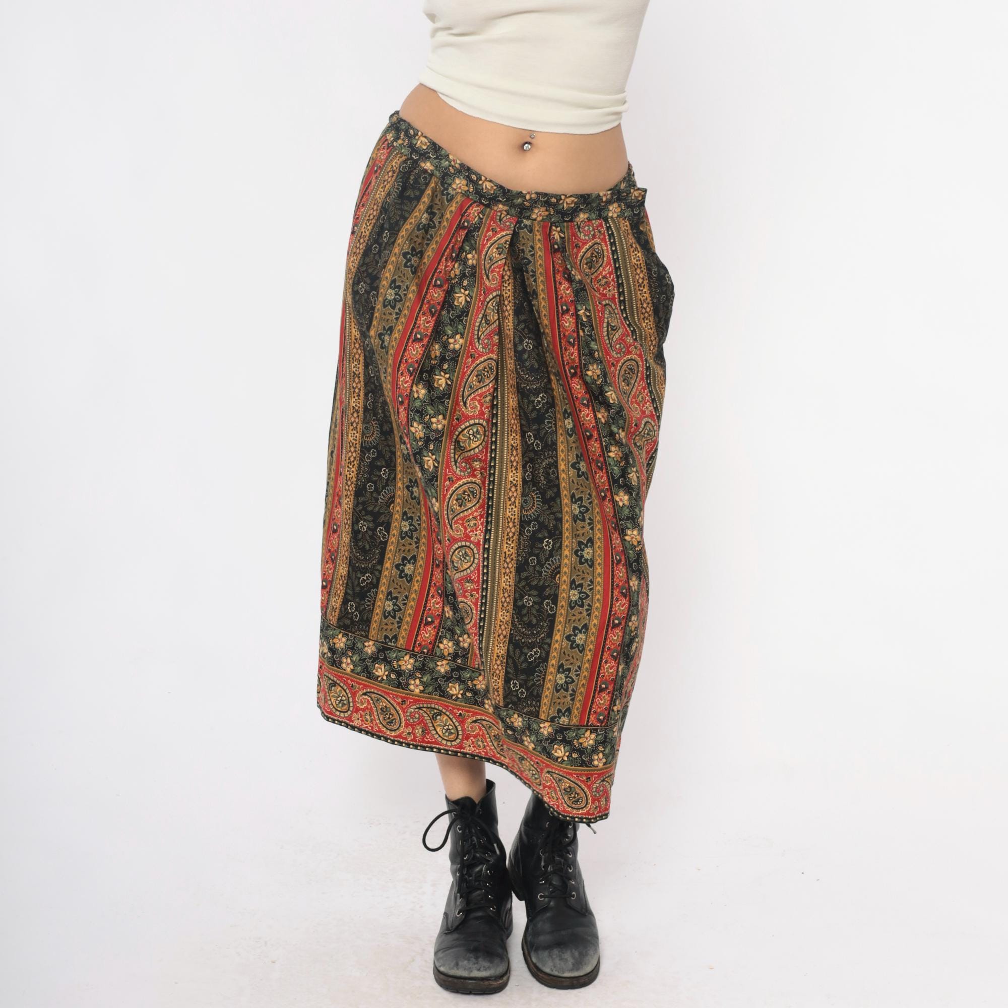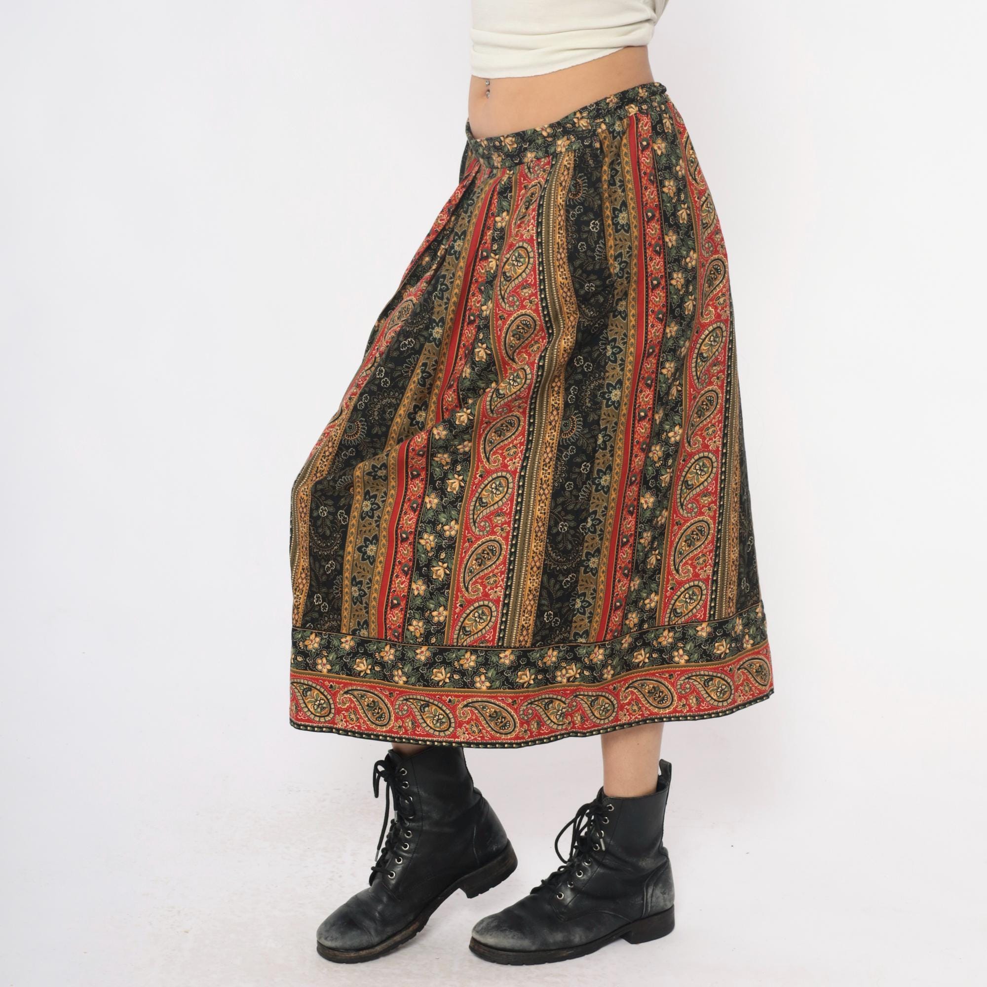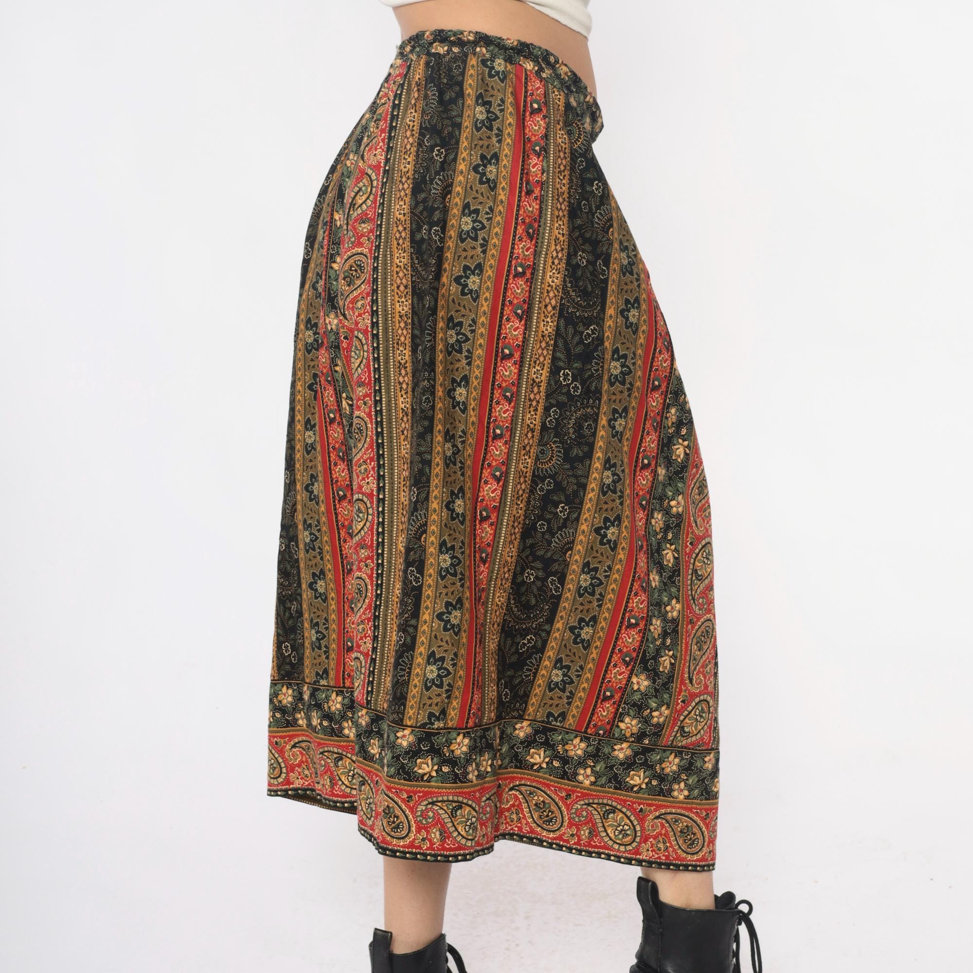 90s midi skirt from suttles an seawinds with vertical paisley and floral striped pattern in black, dark green, red, rust, tan, and cream. Elastic gathered waistband, decorative paisley border print at hem.