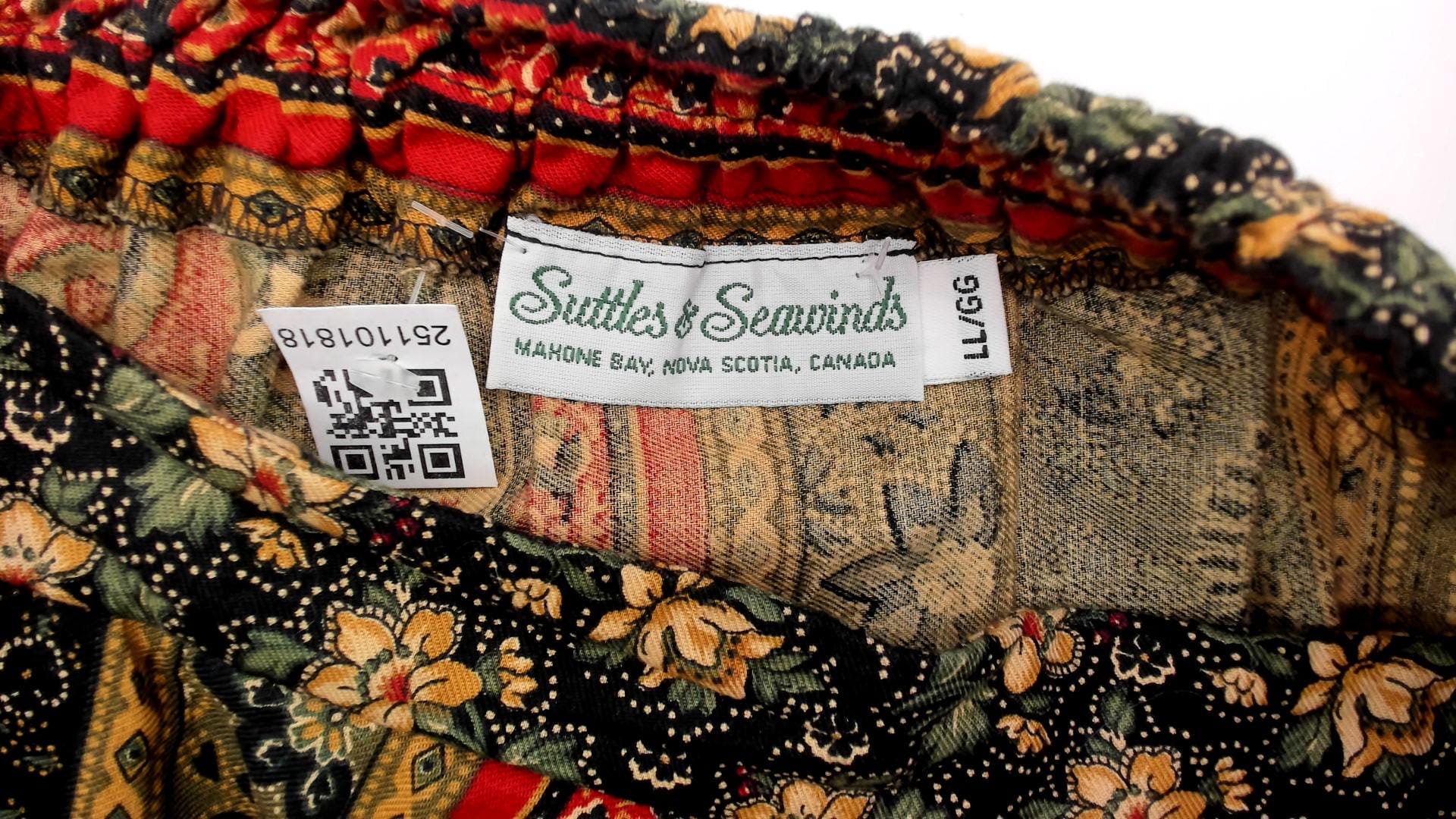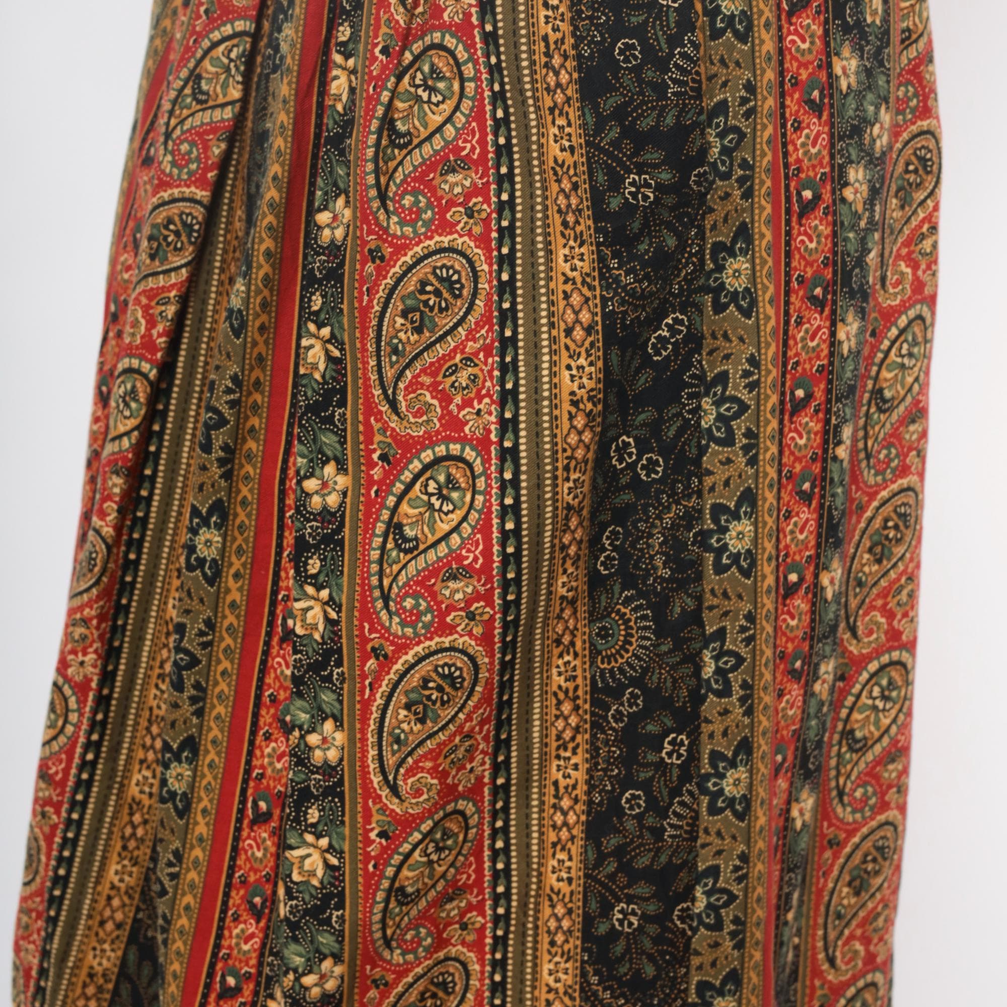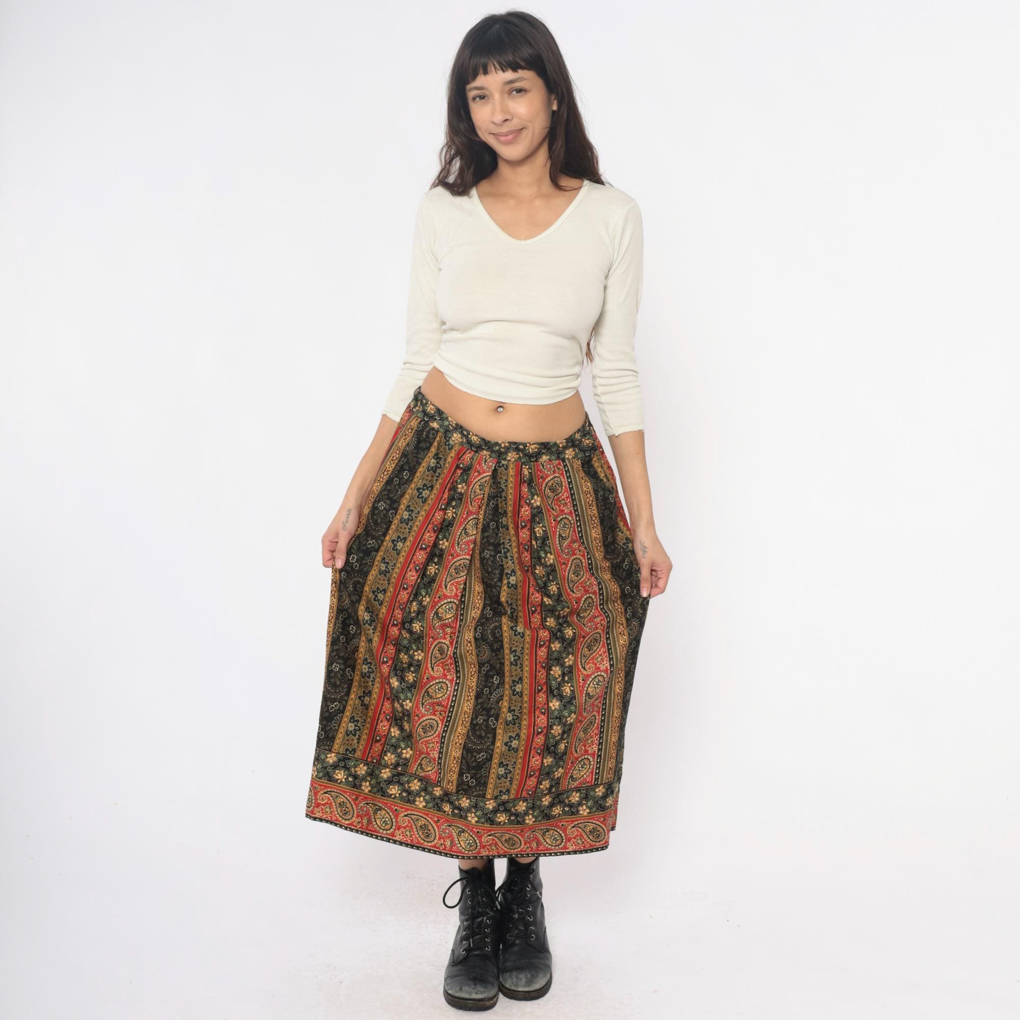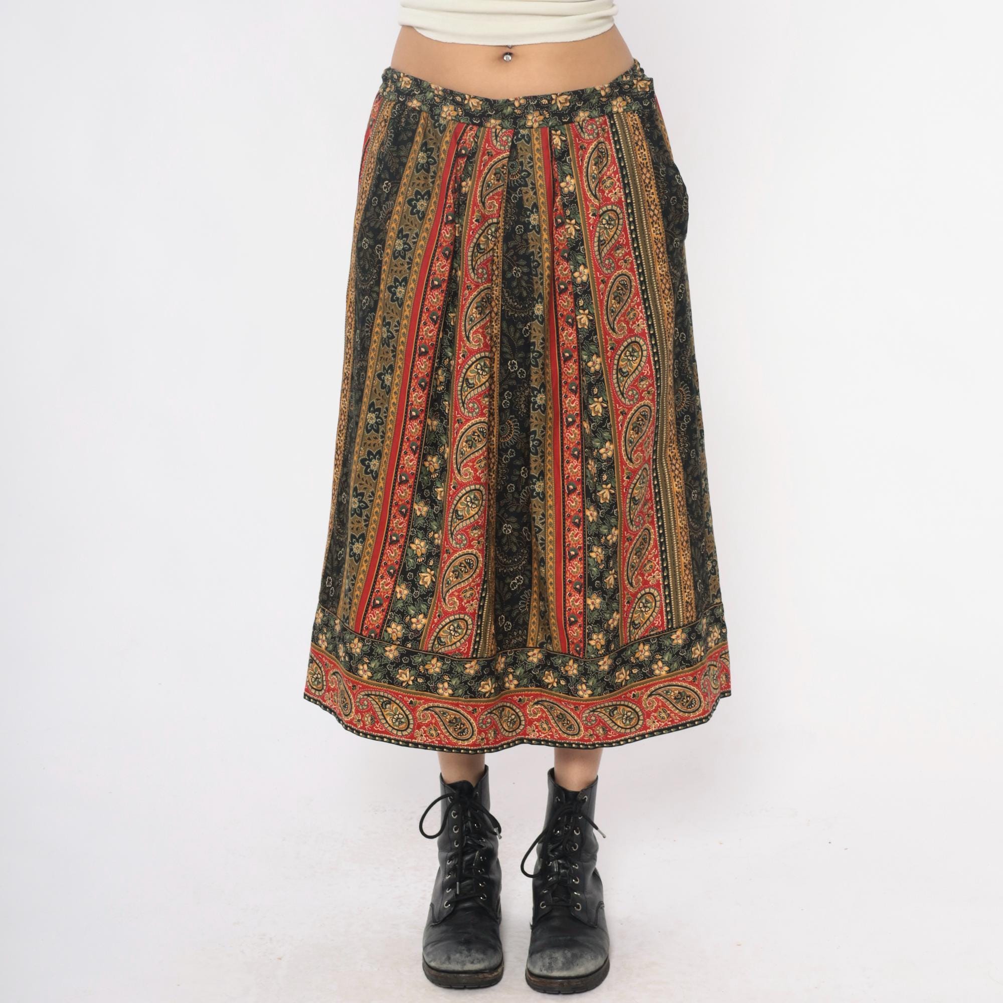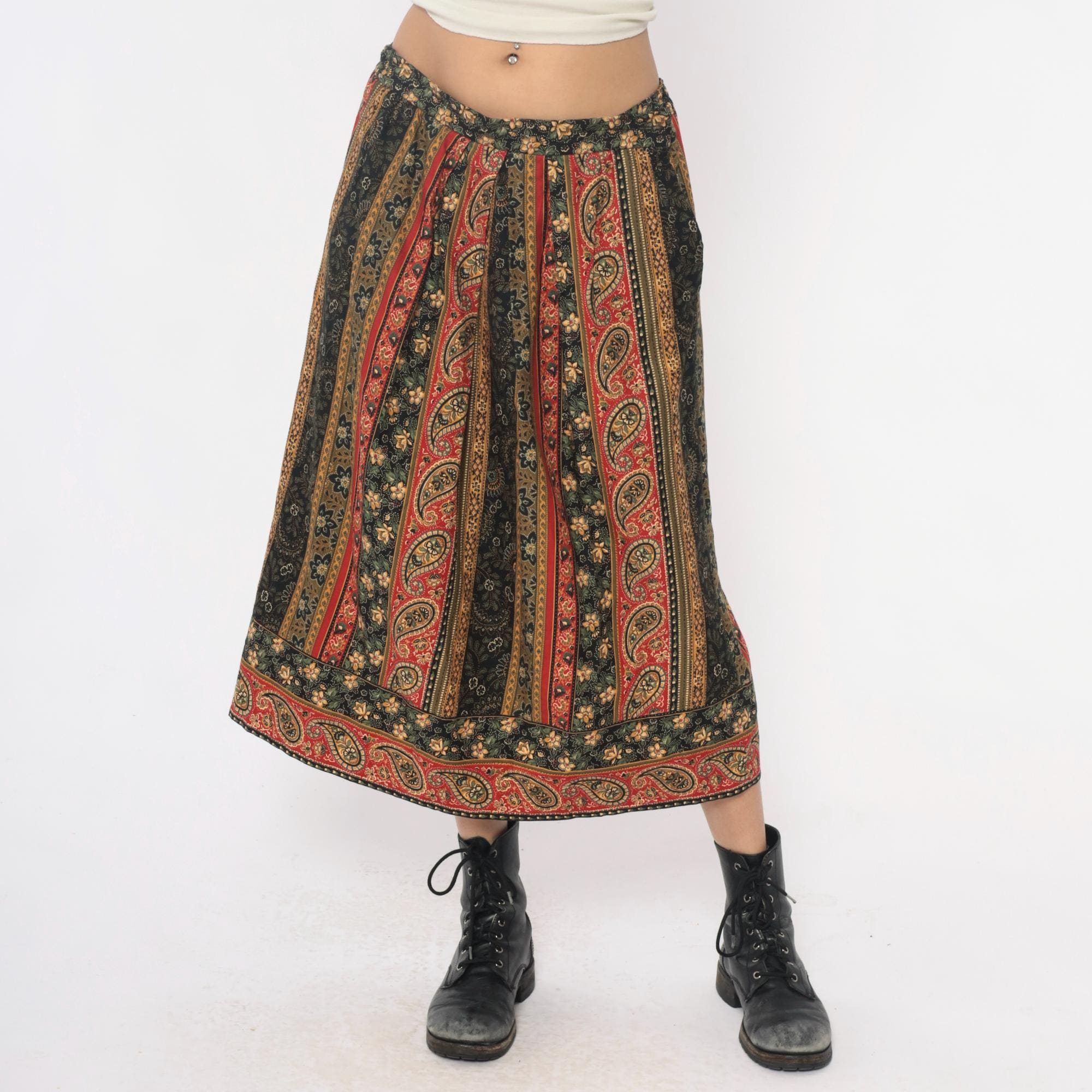 90s midi skirt from suttles an seawinds with vertical paisley and floral striped pattern in black, dark green, red, rust, tan, and cream. Elastic gathered waistband, decorative paisley border print at hem.