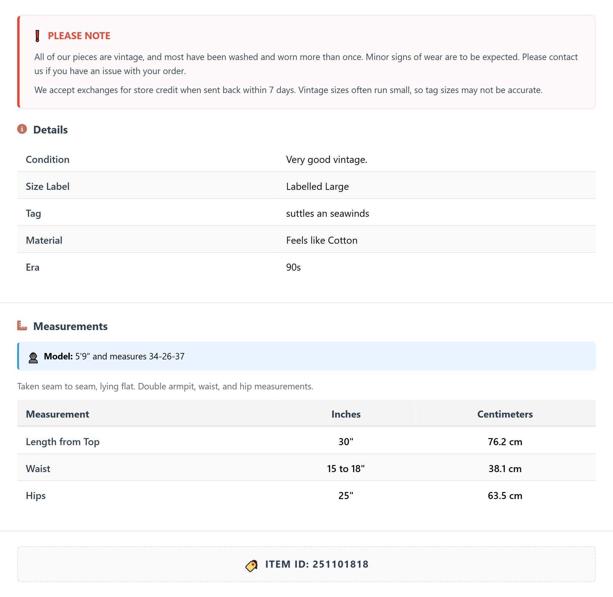 All of our pieces are vintage, and most have been washed and worn more than once. Minor signs of wear are to be expected. Please contact us if you have an issue with your order. We accept exchanges for store credit when sent back within 7 days.