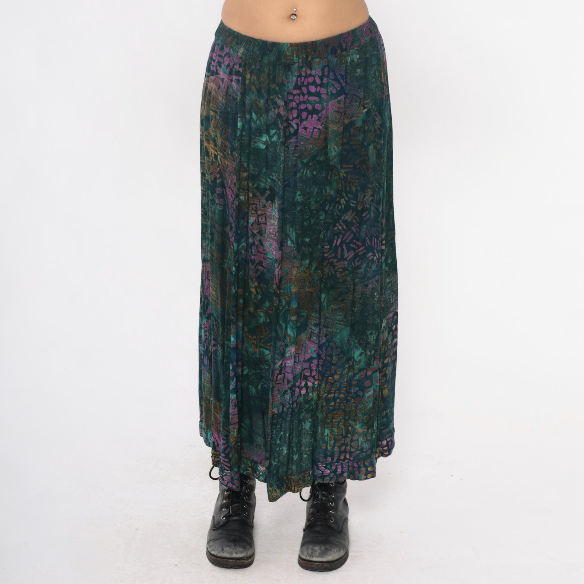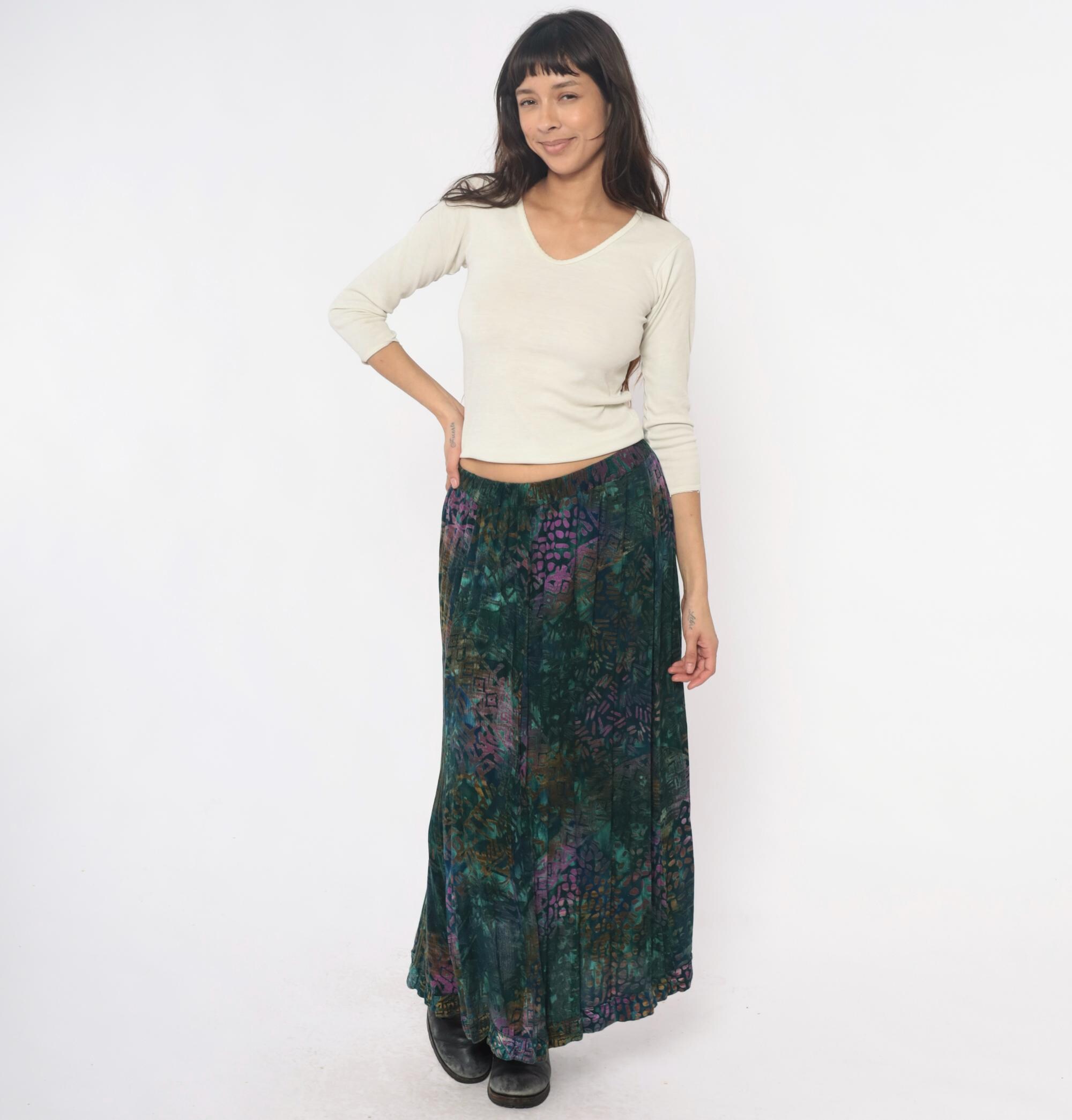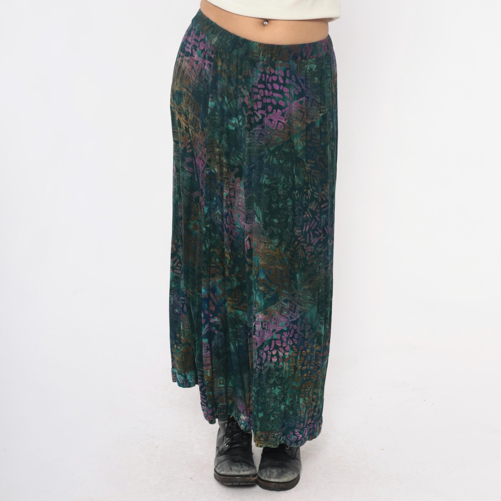 90s dark green maxi skirt from Lost River Clothing Co with abstract geometric print in teal, purple, navy, and gold. Elastic waistband, full A-line silhouette.